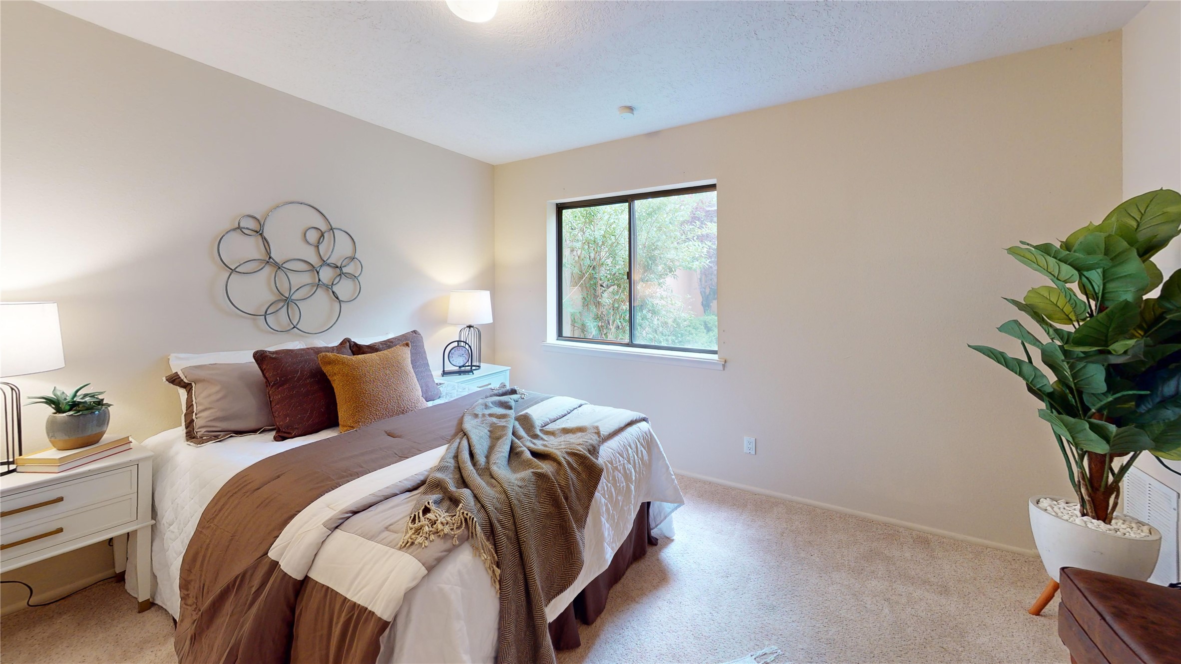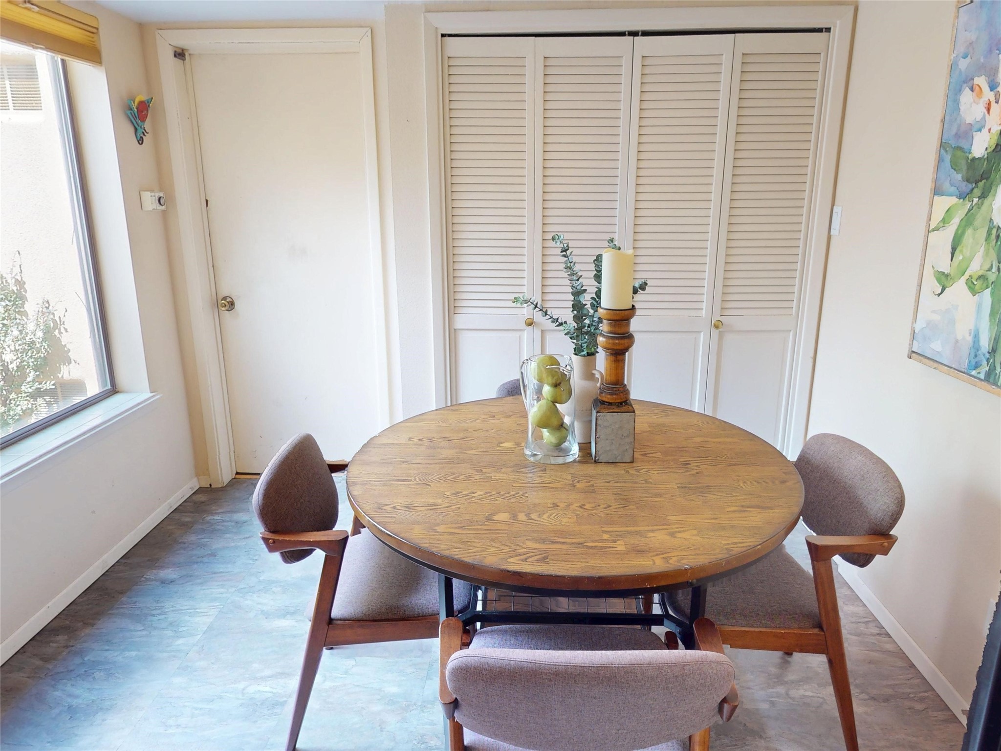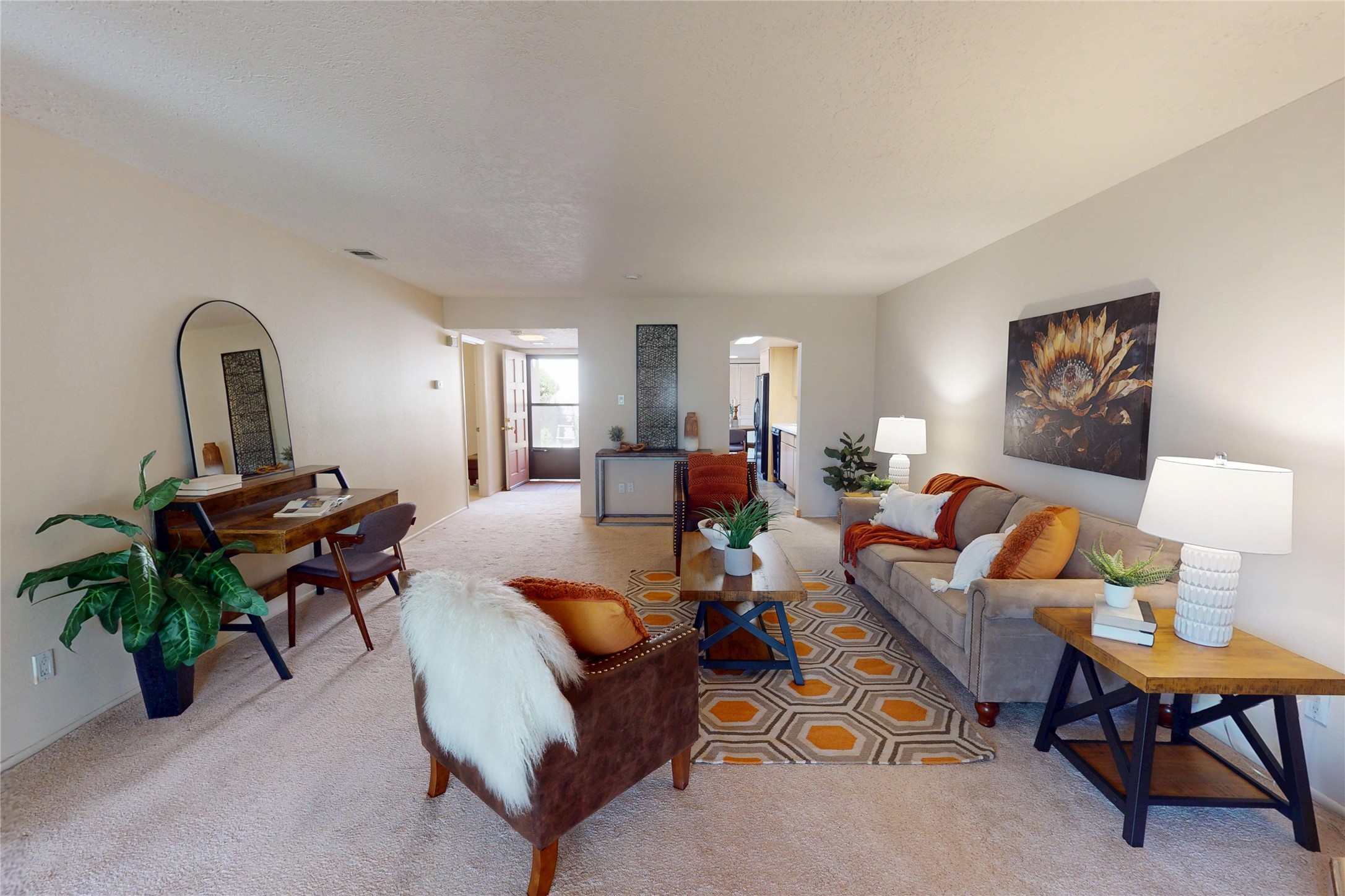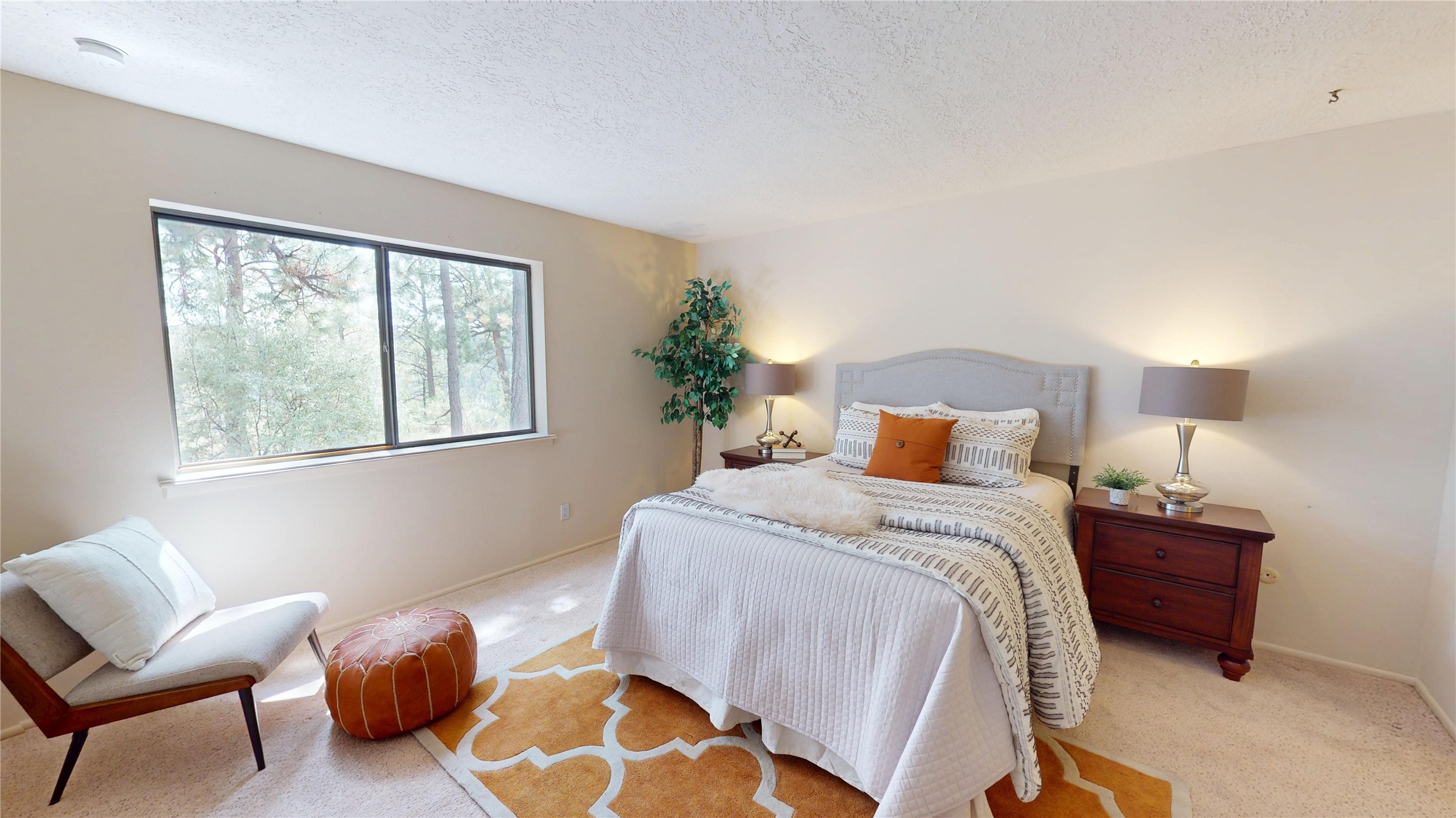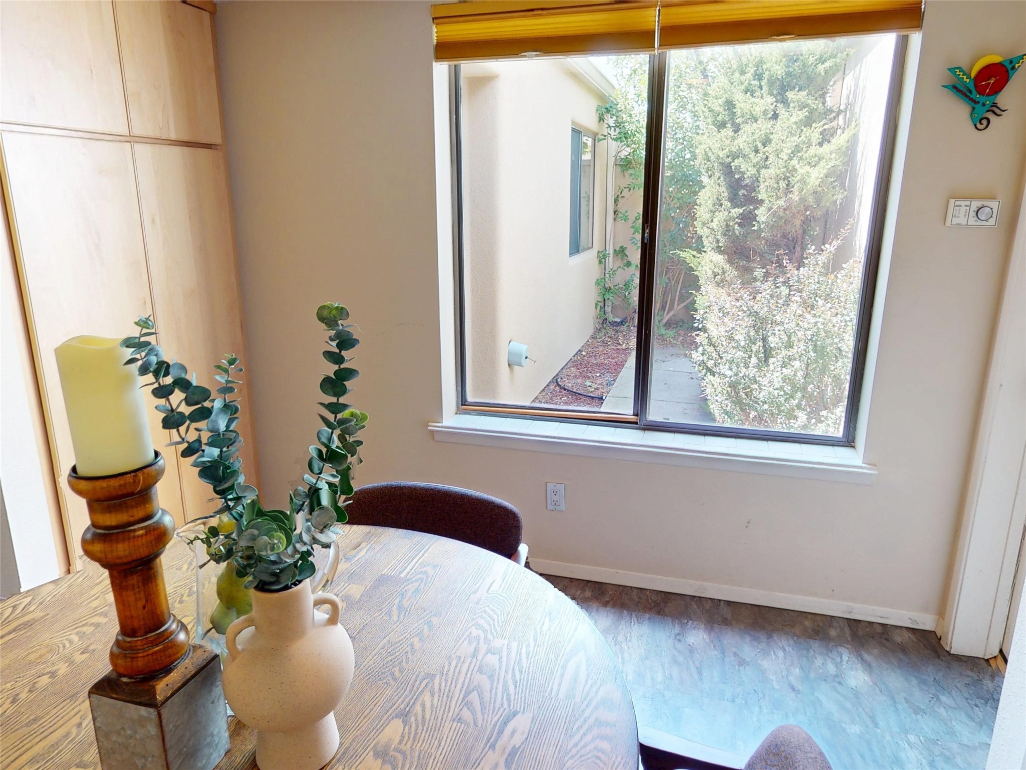 Tucked into a beautifully landscaped, tree-filled neighborhood, this 2-bedroom, 2-bathroom townhome offers comfort, convenience, and the relaxed charm of Los Alamos living. Mature pines and manicured grounds create an oasis-like setting that feels both connected and serene.A private walkway leads you to the welcoming entryway and into the spacious living room, where a wood-burning fireplace provides warmth and comfort. Large windows frame sweeping mountain and canyon views, the perfect backdrop for enjoying a cozy evening or watching birds and wildlife from the comfort of home.The updated kitchen features solid-surface countertops and warm maple cabinetry, combining timeless style with everyday function. Just off the kitchen, the inviting dining nook overlooks the private garden entryway--a cheerful spot for morning coffee. Nearby, a conveniently placed laundry closet and direct access to the spacious 2-car garage add everyday ease.Outdoor living is a highlight, with a private patio that invites you to dine al fresco or simply relax beneath the pines while enjoying the peaceful canyon views.Both generously sized bedrooms include en suite bathrooms, offering privacy and flexibility for guests, a home office, or hobbies. The primary suite is at the back of the home and enjoys south facing windows looking to the canyon.With its canyon setting, functional layout, and neighborhood that feels like a retreat, this home presents a rare opportunity to enjoy downtown Los Alamos living in a peaceful, low-maintenance setting.