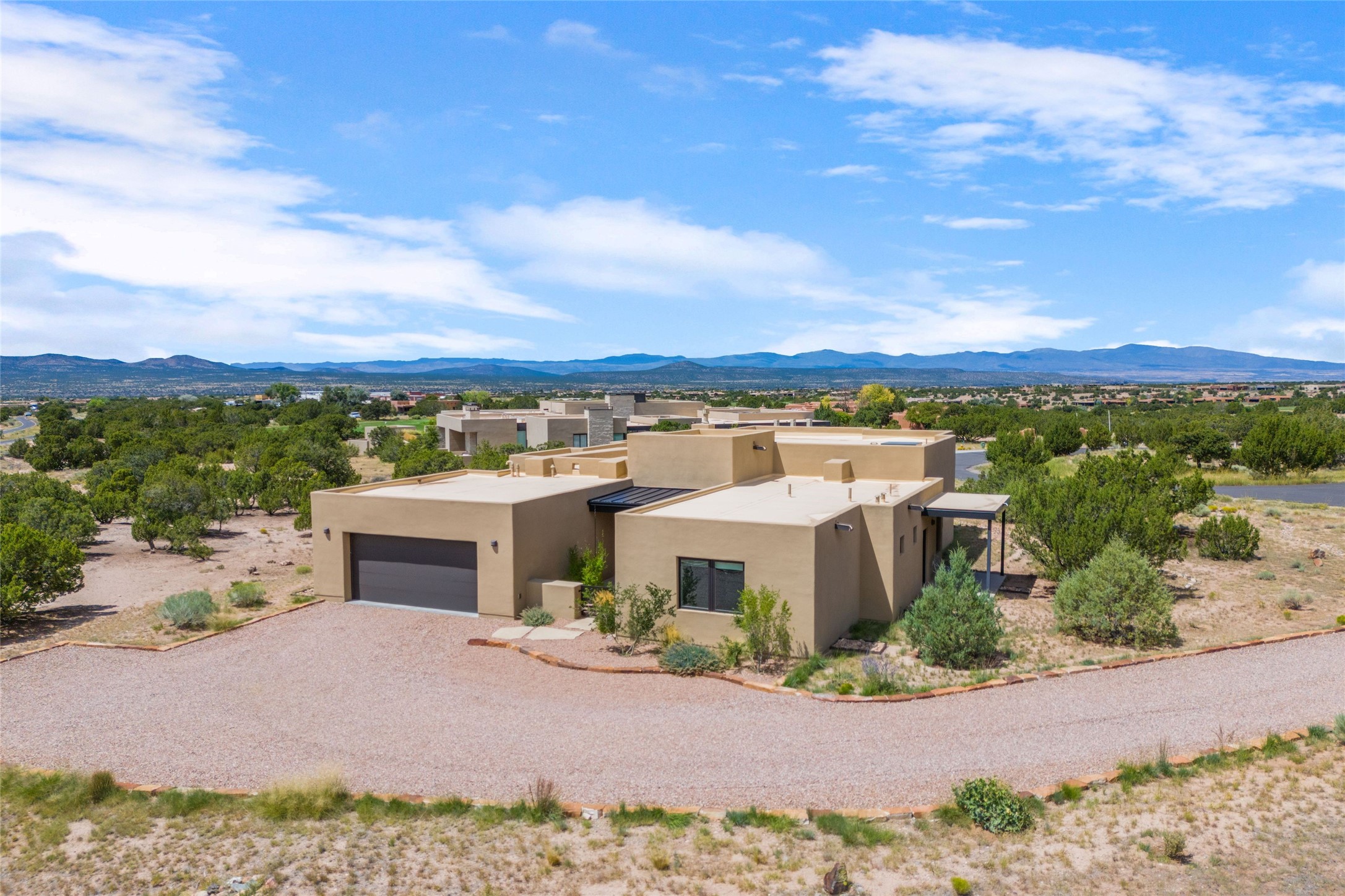 Boss Builders (2021) Santa Fe contemporary 3-bedroom 3 bath home with panoramic mountain views in Las Campanas. Single level, no interior steps. Excellent location, close to the Club at Las Campanas. The open-concept great room invites you to unwind while enjoying Jemez Mountain sunset views. The gas fireplace adds warmth and ambiance, while sliding glass doors effortlessly connect indoor and outdoor living. Chef's kitchen is appointed with an expansive island complete with breakfast bar, high-end appliances, and extended quartz countertops that offer ample workspace. Primary suite features a spa-like walk-in shower and a generous walk-in closet. Thoughtfully separated from the public areas, the guest wing includes a private en-suite bedroom and a secondary guest bedroom with its own entrance offering flex space as an office or studio. The outdoor portal comes equipped with a built-in BBQ, creating an ideal setting for entertaining or simply savoring the serene surroundings. This home is equipped with a rainwater system connected to the irrigation system, promoting sustainability while maintaining the beauty of your outdoor space with its 6 newly planted pin and juniper trees. Hunter Douglas solar shades throughout the home ensure comfort and energy efficiency year-round. Membership in The Club at Las Campanas is available upon approval and an extra fee.