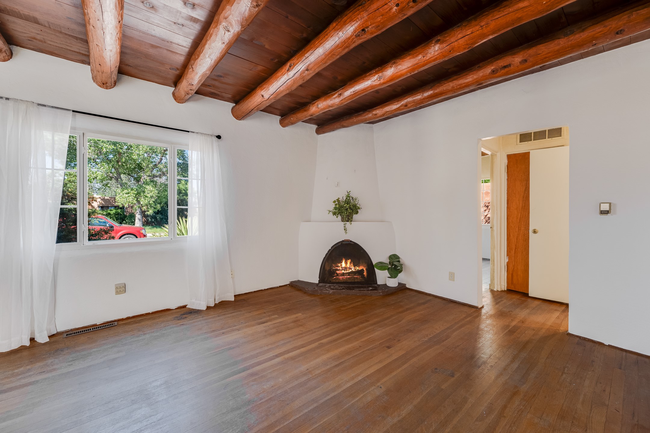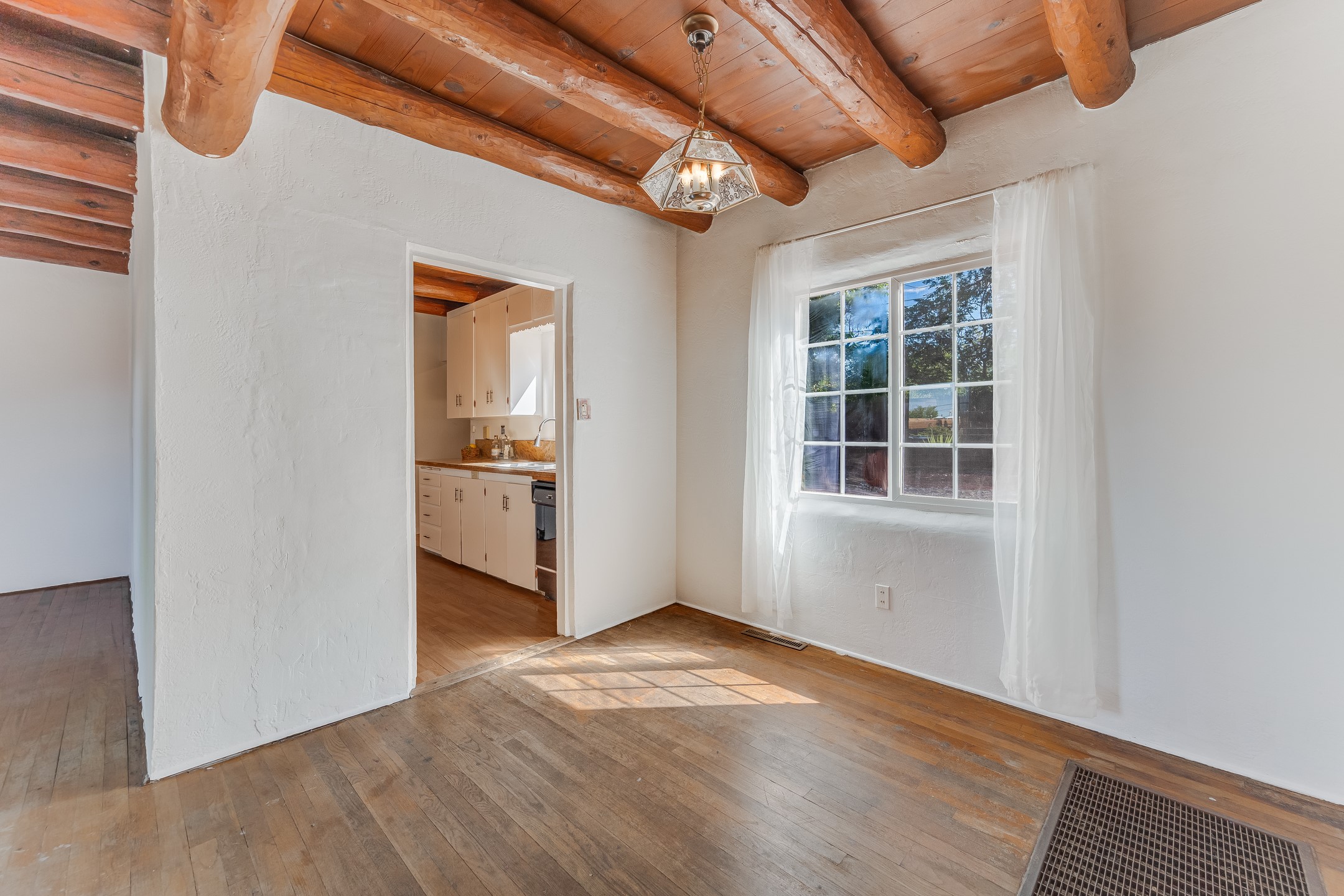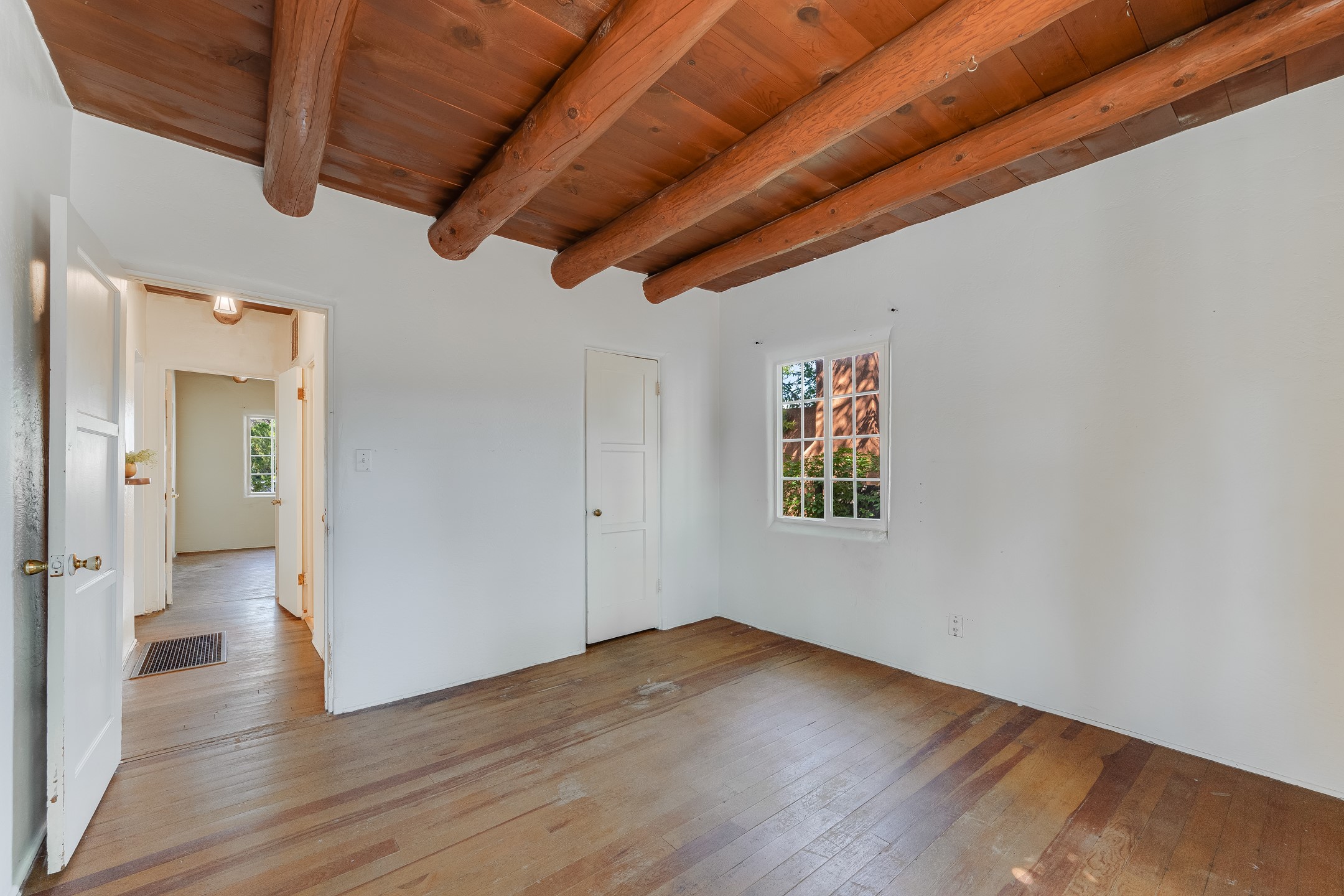 This charming three-bedroom single-level home is located a stone's throw from downtown Santa Fe. The original Stamm design features vigas, wood floors, a corner kiva fireplace, and a converted garage centered, on a generous 1/8 acre lot. The 1,334+/- square foot floor plan offers excellent bones to build upon. The primary bedroom and two additional rooms benefit from large newer windows for plenty of natural light. Some other updates include granite countertops, a partially renovated hallway bathroom, roof work in 2024 and stucco around 2022. Whether you're looking to build equity, generate passive income, or settle into a friendly area with character, this home's value, location, and potential combine for a compelling opportunity.