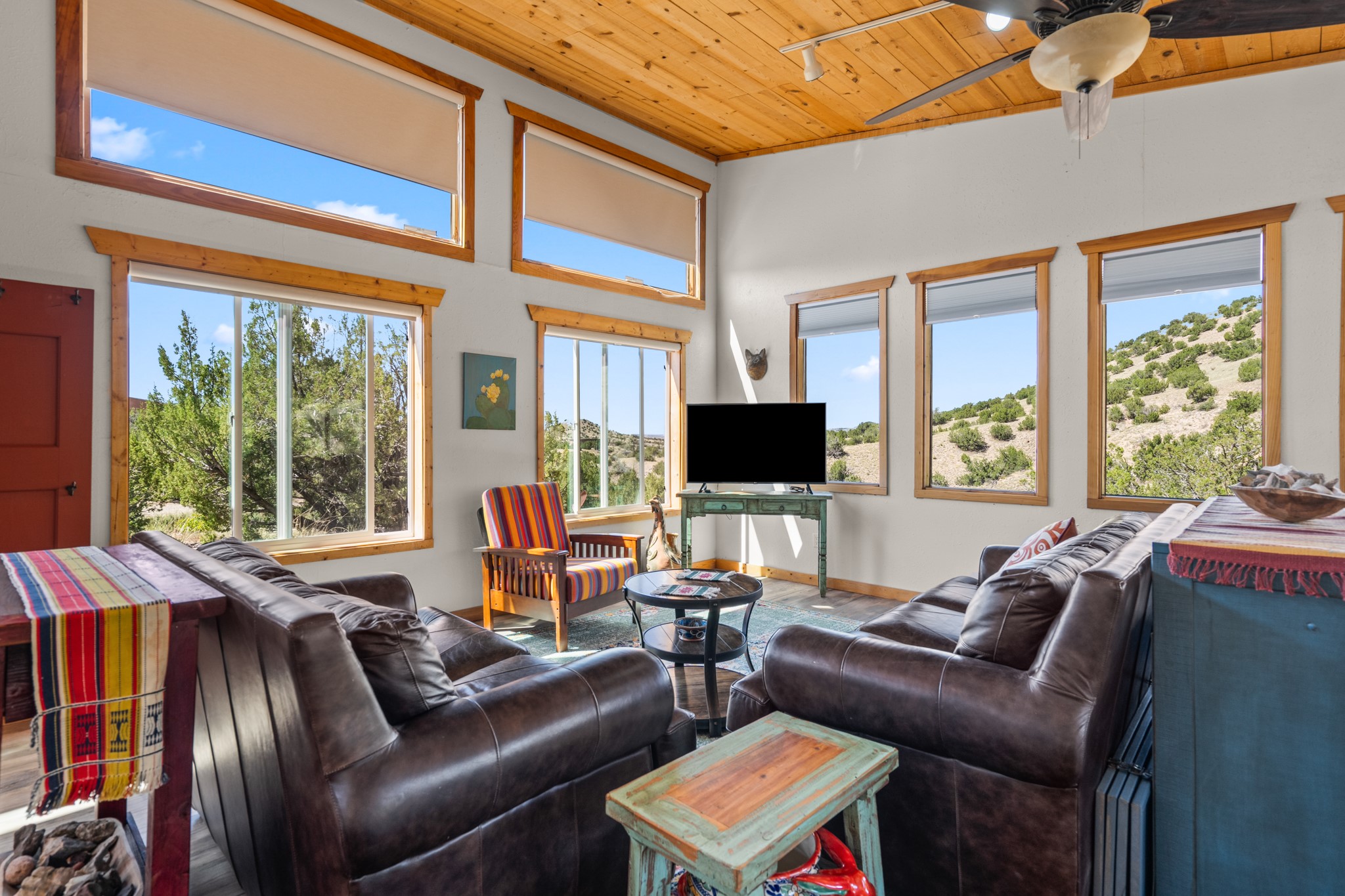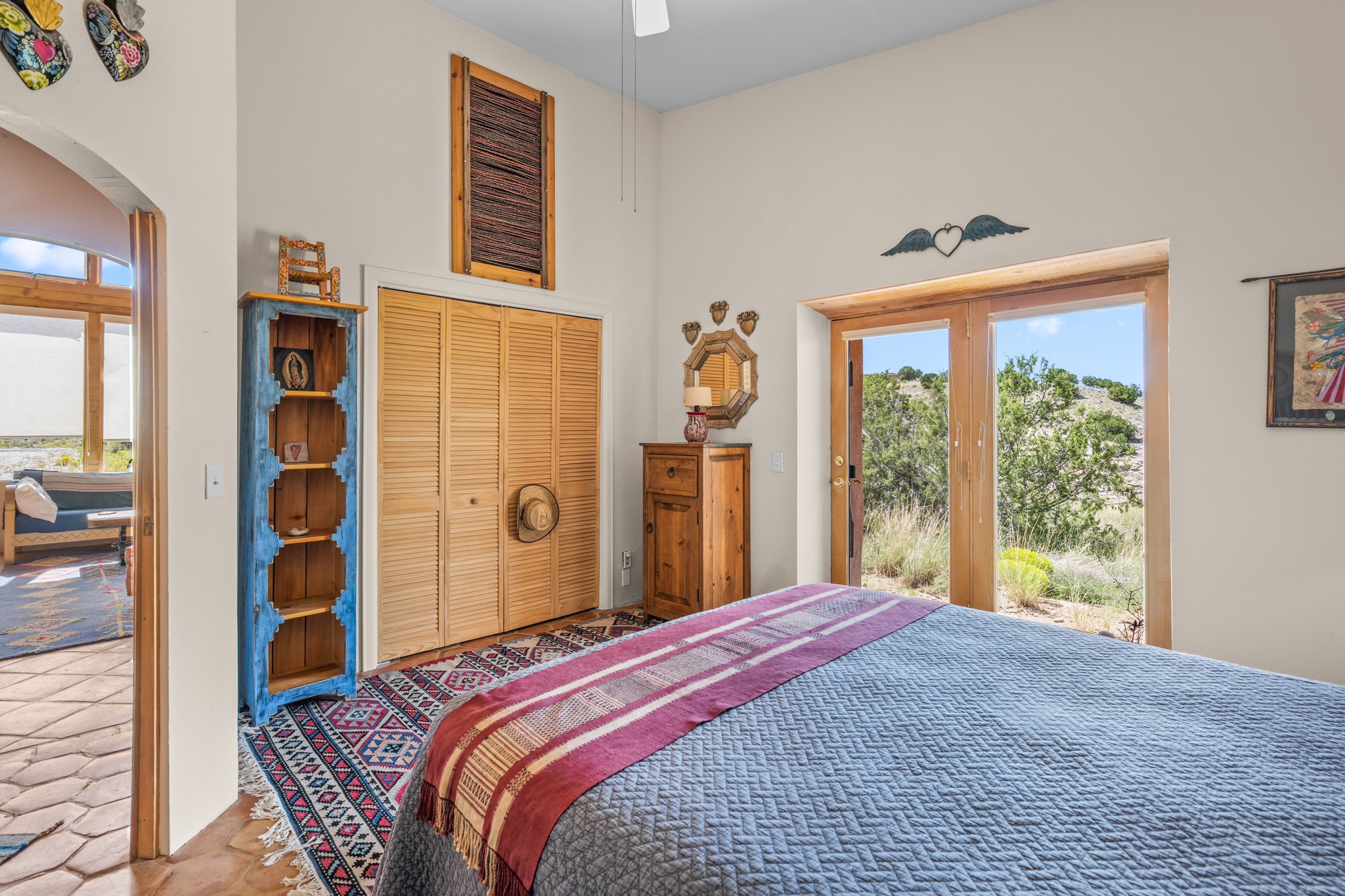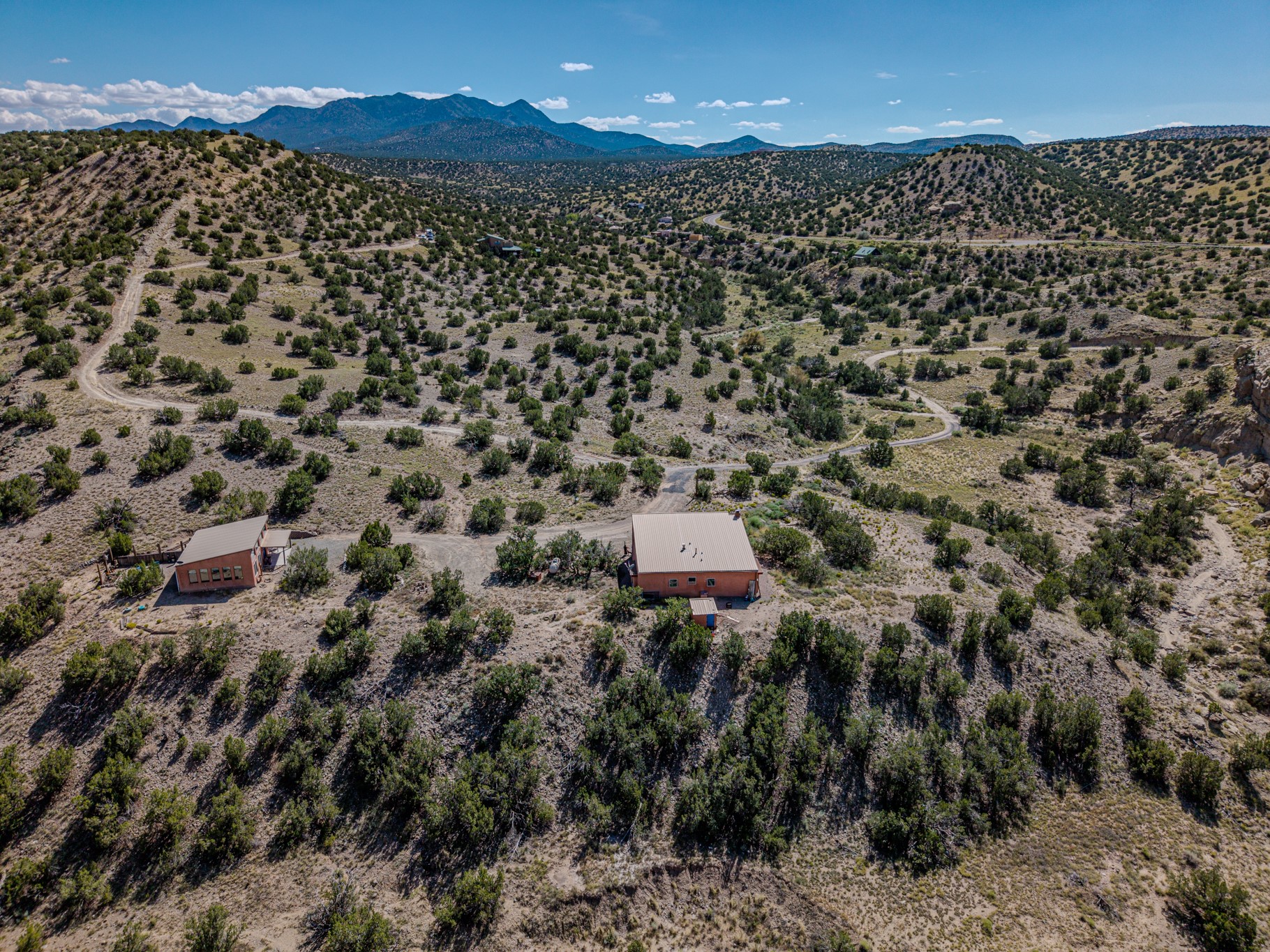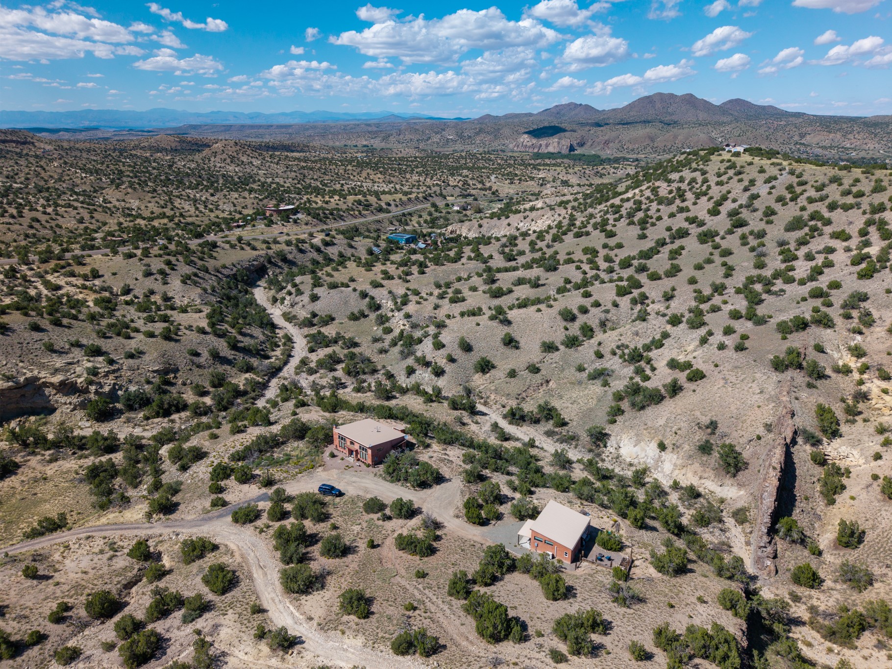 Welcome to this amazing straw-bale home and guest house / studio on 10.47 of the most serene acres with tremendous mountain and rolling hill views. Take morning and afternoon hikes on your own property and enjoy the tranquil sun rays while making new tracks on the well-preserved and undisturbed land that runs abound. The main home features an open floor plan with an ensuite primary bedroom and a large guest bedroom with fantastic views. The kitchen has been totally updated with a newer appliance package and gorgeous tile work. The main home has radiant in-floor heating. The detached 768 square foot casita has a 3/4 bath and full kitchen, a mini split system that heats and cools, and plenty of large windows which provide an abundance of interior natural light and stupendous, panoramic views-- perfect for family, friends or as a substantial income provider. Both buildings are positioned well as they face the surrounding mountains while taking in the afternoon, south-facing sun which provides optimum solar gain. New Septic installed 5 years ago and a new well installed 8 years ago. This property also includes a fantastic and unique rock outcropping feature that really makes it just a little more special than the rest. This is one of the most unique and beautiful properties in the Cerrillos area .... Please come and take a look!!