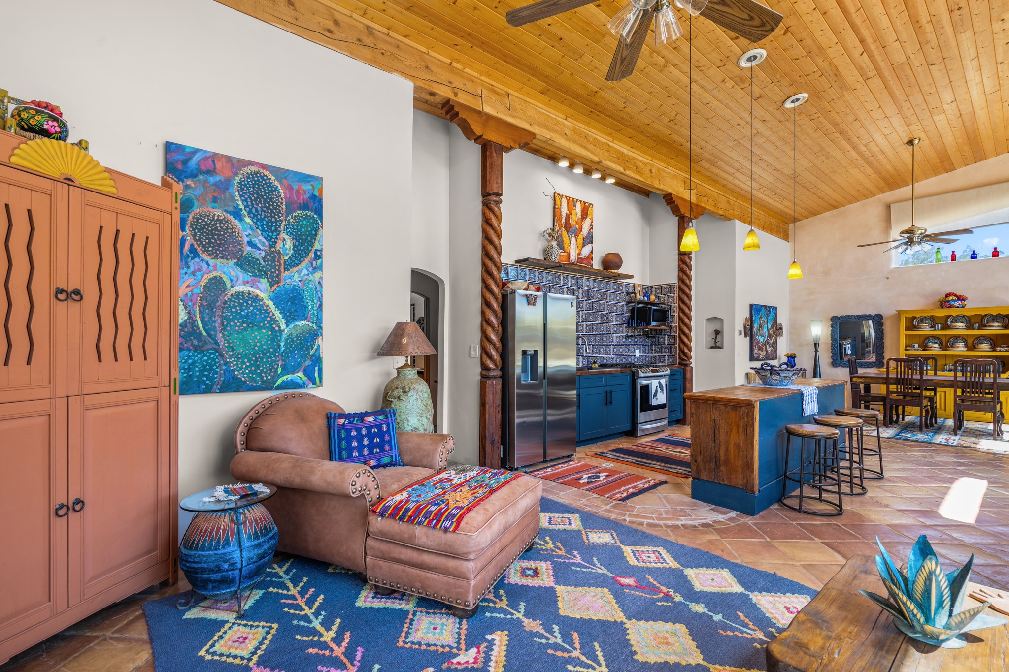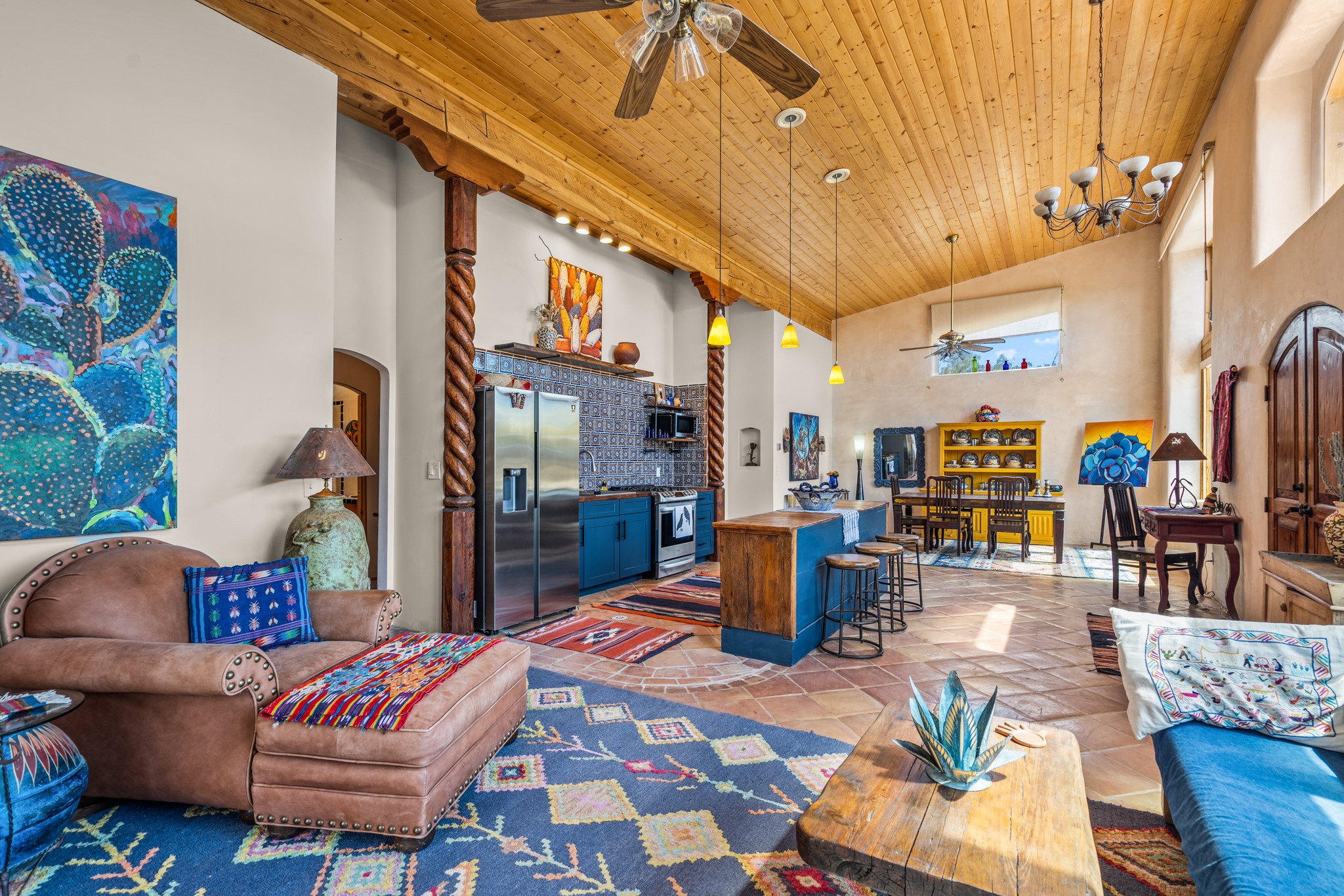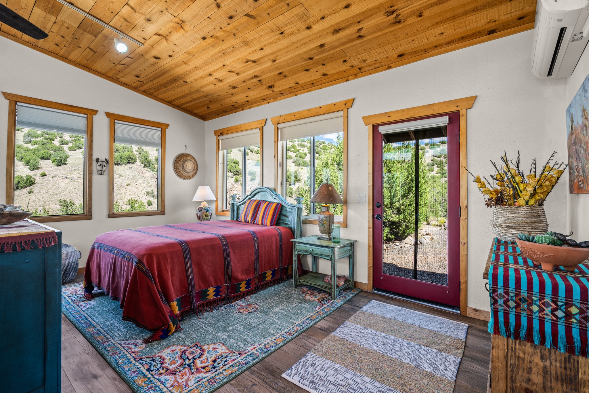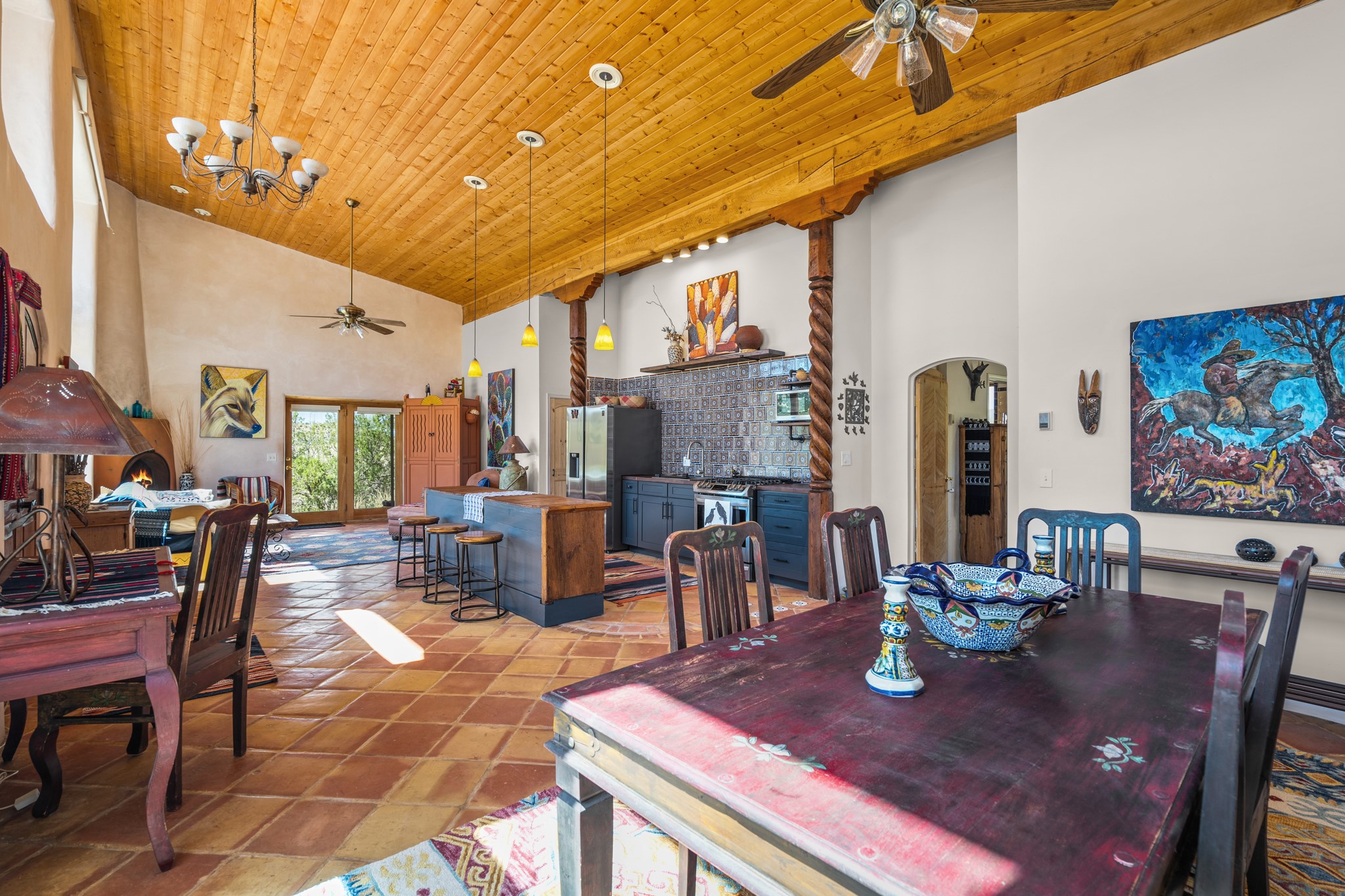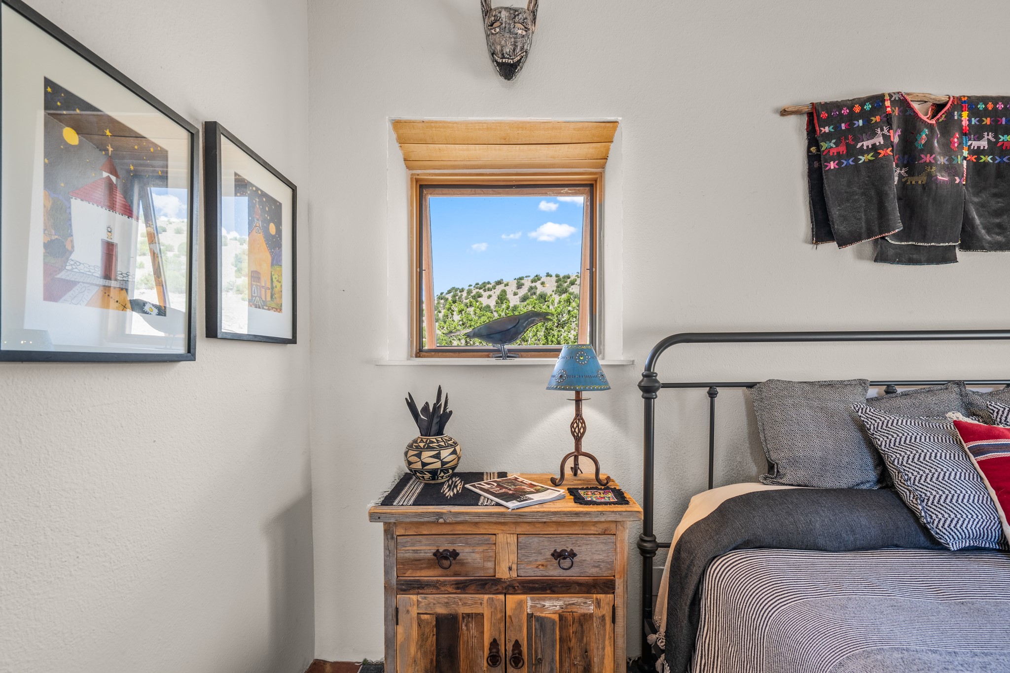 Welcome to this amazing straw-bale home and guest house / studio on 10.47 of the most serene acres with tremendous mountain and rolling hill views. Take morning and afternoon hikes on your own property and enjoy the tranquil sun rays while making new tracks on the well-preserved and undisturbed land that runs abound. The main home features an open floor plan with an ensuite primary bedroom and a large guest bedroom with fantastic views. The kitchen has been totally updated with a newer appliance package and gorgeous tile work. The main home has radiant in-floor heating. The detached 768 square foot casita has a 3/4 bath and full kitchen, a mini split system that heats and cools, and plenty of large windows which provide an abundance of interior natural light and stupendous, panoramic views-- perfect for family, friends or as a substantial income provider. Both buildings are positioned well as they face the surrounding mountains while taking in the afternoon, south-facing sun which provides optimum solar gain. New Septic installed 5 years ago and a new well installed 8 years ago. This property also includes a fantastic and unique rock outcropping feature that really makes it just a little more special than the rest. This is one of the most unique and beautiful properties in the Cerrillos area .... Please come and take a look!!