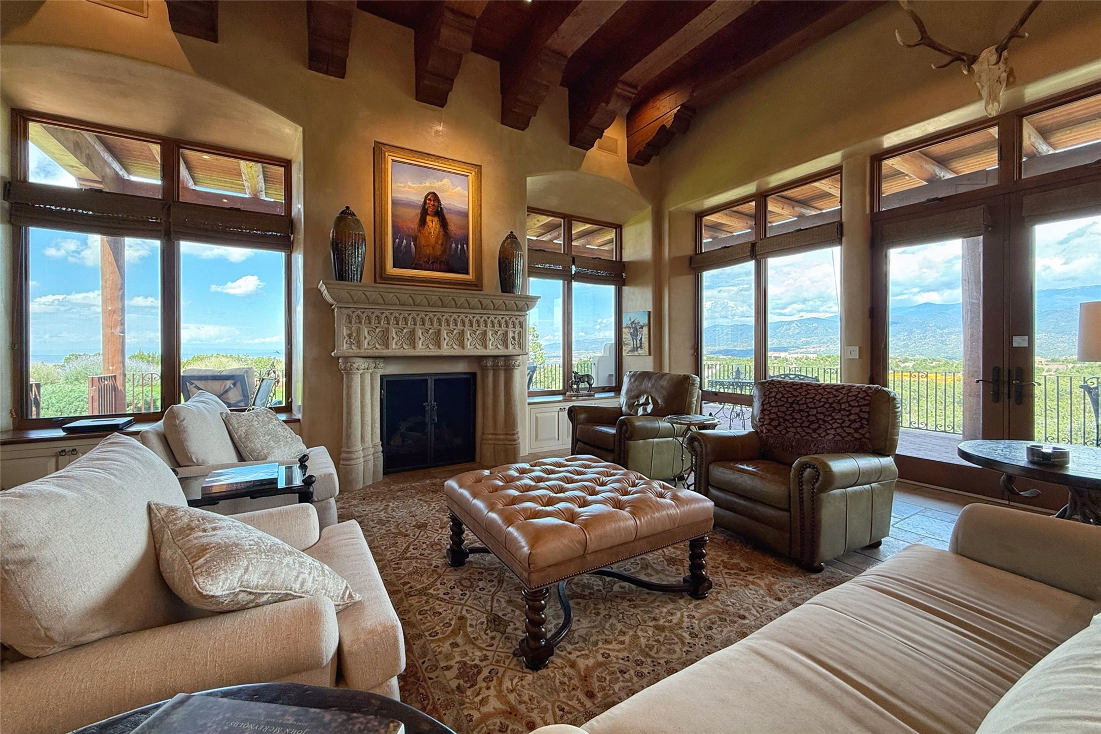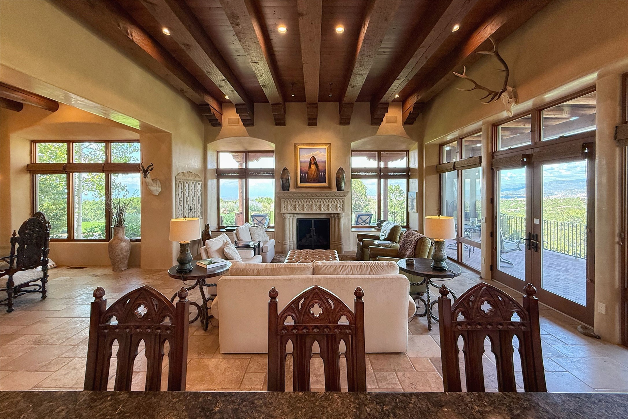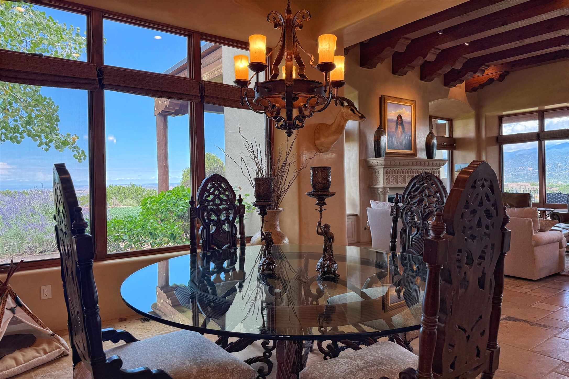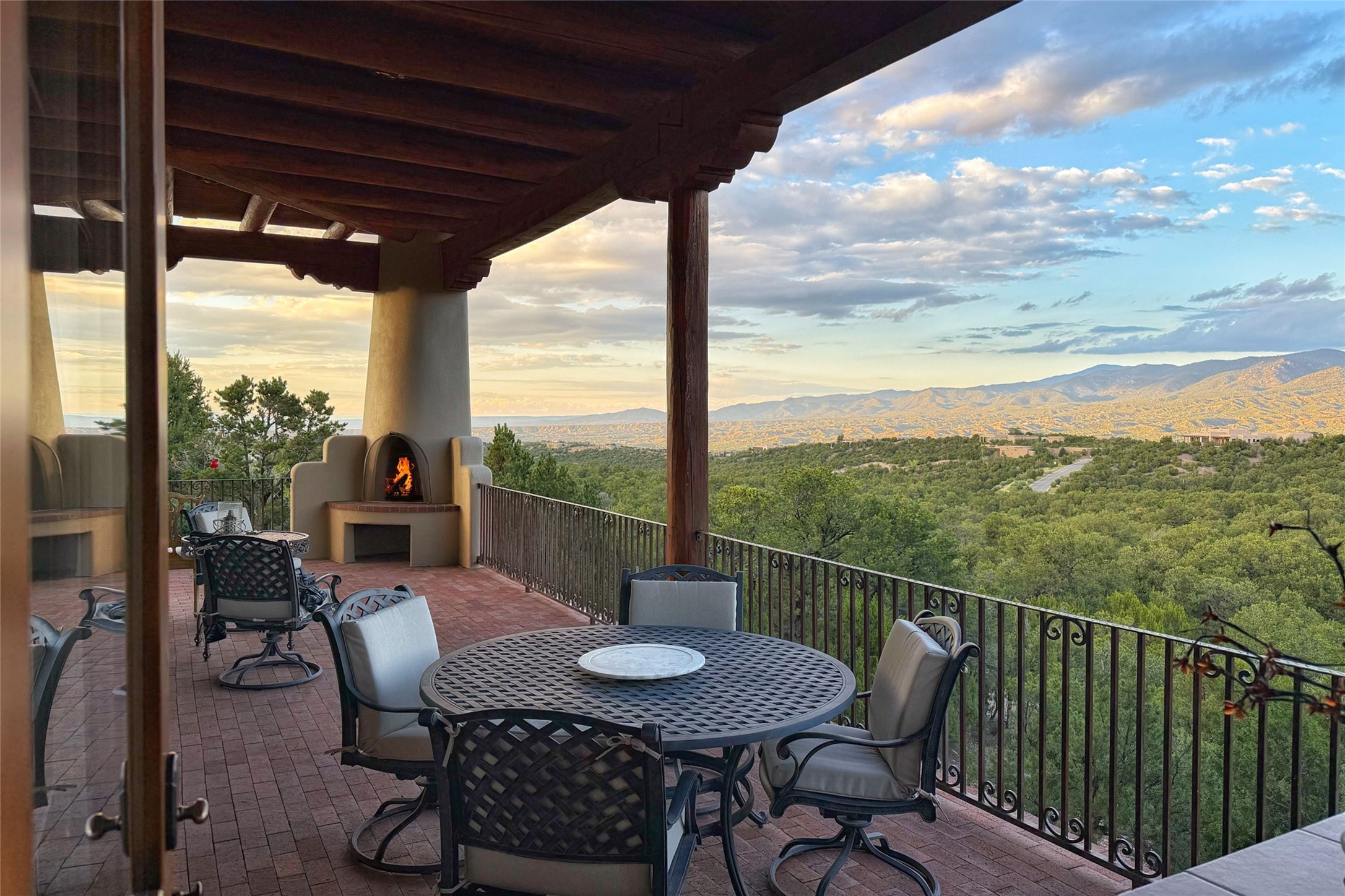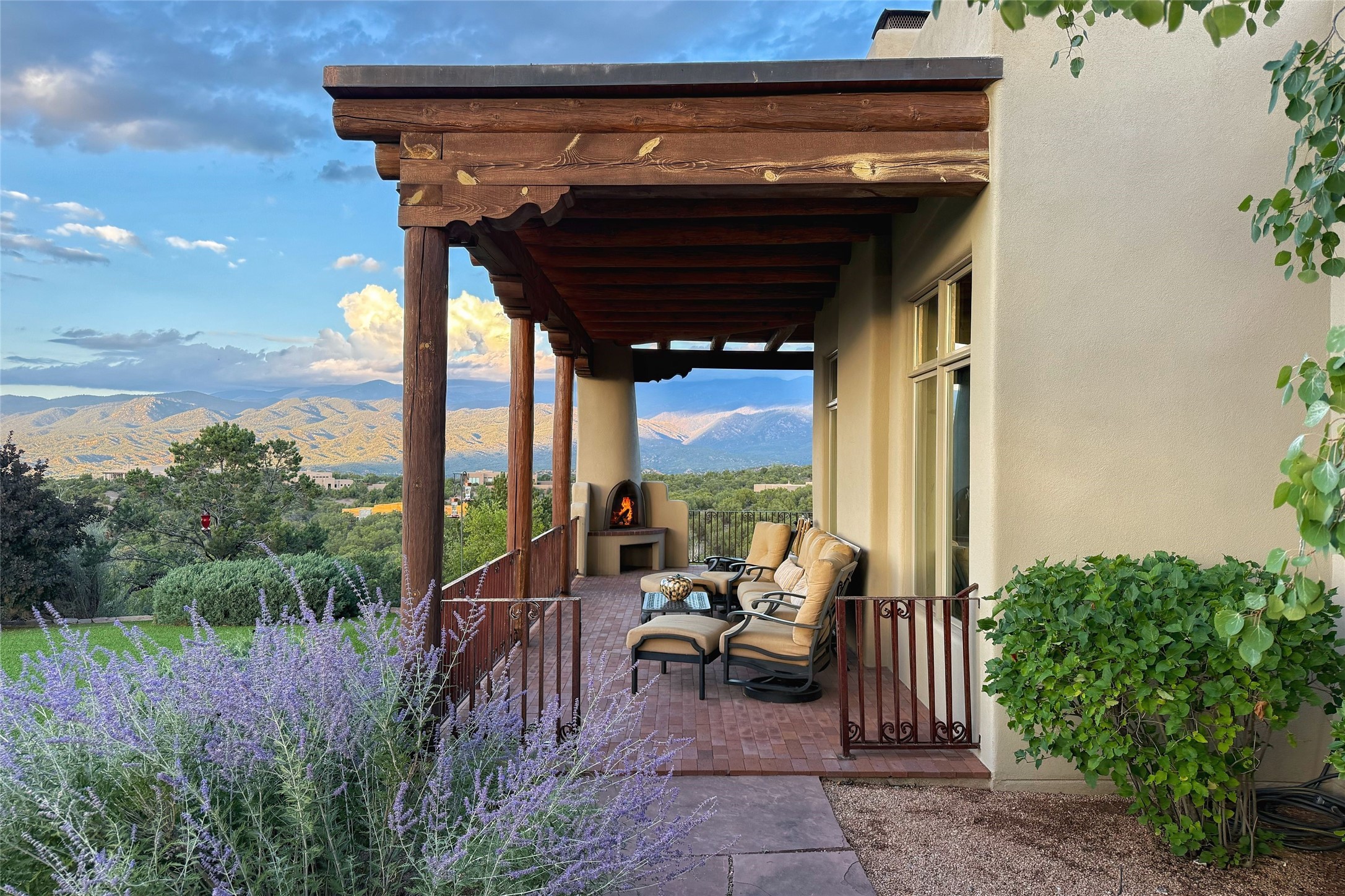 Welcome to Casa de Vistas Infinitas, a stunning home that beautifully blends rustic elegance with timeless Santa Fe charm. Set in a peaceful location with full sweeping views covering the Jemez mountains to the west, the badlands to the north, and Sangre de Cristo mountains to the east, this residence by Sharron Woods captures the absolute best of Northern New Mexico living. With diamond plaster finishes, and Italian travertine floors, every detail speaks to quality and enduring craftsmanship. Enter through double wood carved doors by Seret and Son into a foyer that sets the tone with views of the back garden and mountain ranges that stretch for miles. The living room is a showcase of light and views, with large windows framing Sangre mountain sunrise vistas, a carved stone fireplace, and adjoining eastern-facing portal featuring an outdoor wood burning kiva and a built-in grill.The spacious kitchen is both functional and inspiring, featuring custom cabinetry, leather finish "Cosmos" granite countertops, Wolf appliances and clerestory windows. The gas fireplace in adjoining breakfast-nook creates a warm and inviting gathering space. The primary suite is a true retreat. Enter through another set of beautifully carved wood doors, into a cozy space with a gas fireplace, and more breathtaking Sangre mountain views. The luxurious primary bath is finished in travertine, with more views from the soaking tub. A private office provides front courtyard access, while the guest suites offer tranquil back garden views and luxurious Michelangelo marble bathrooms. Outdoor living is designed for year-round enjoyment. From the serene courtyard entry to the wrap around portal and back garden dotted with Aspens that overlooks endless mountain rangesThoughtfully designed and impeccably finished, this home is more than a residence--it is a sanctuary offering privacy, beauty, and elegance just minutes from the heart of Santa Fe.