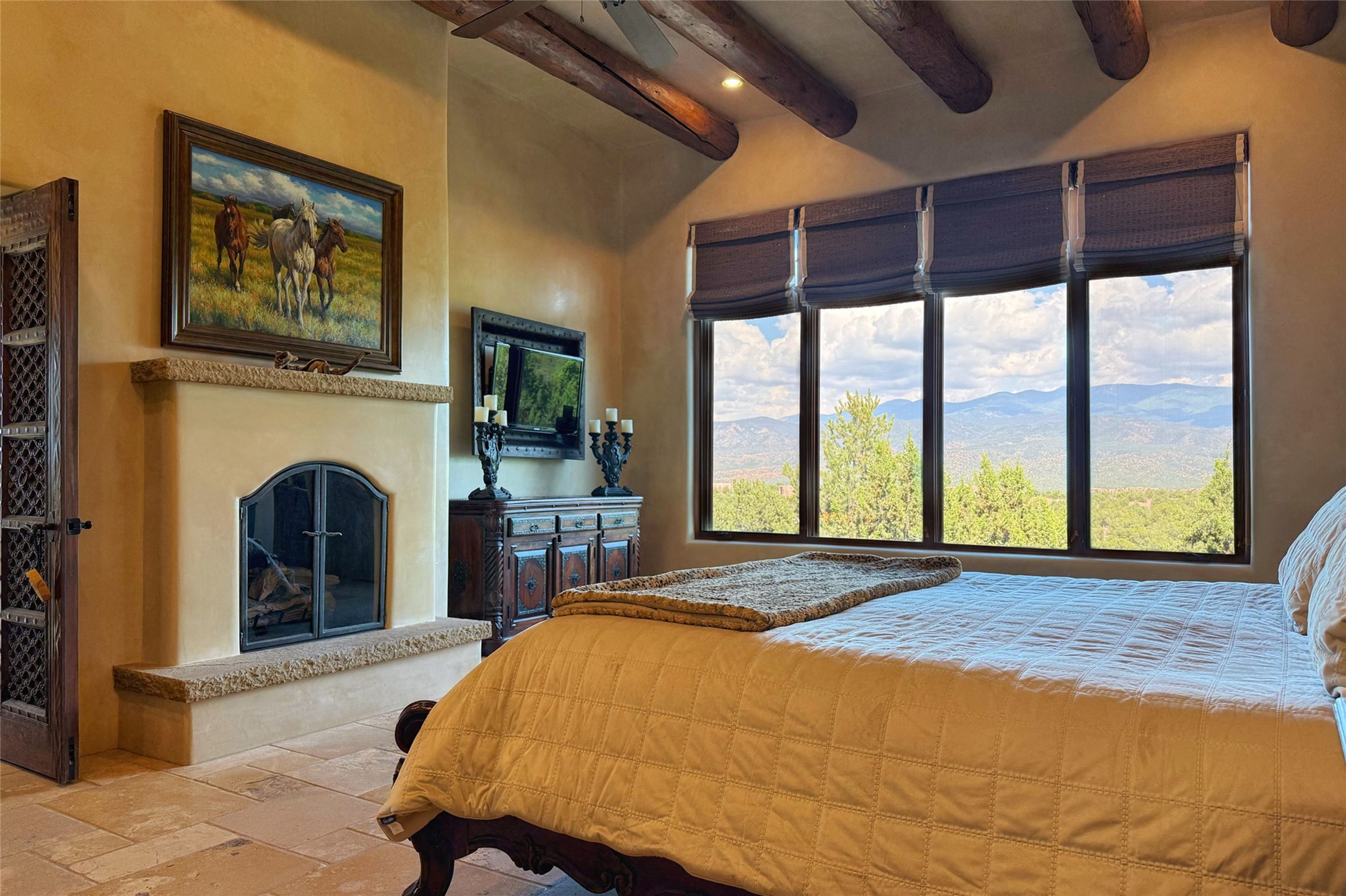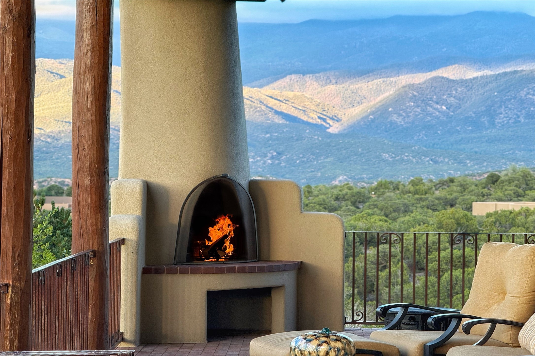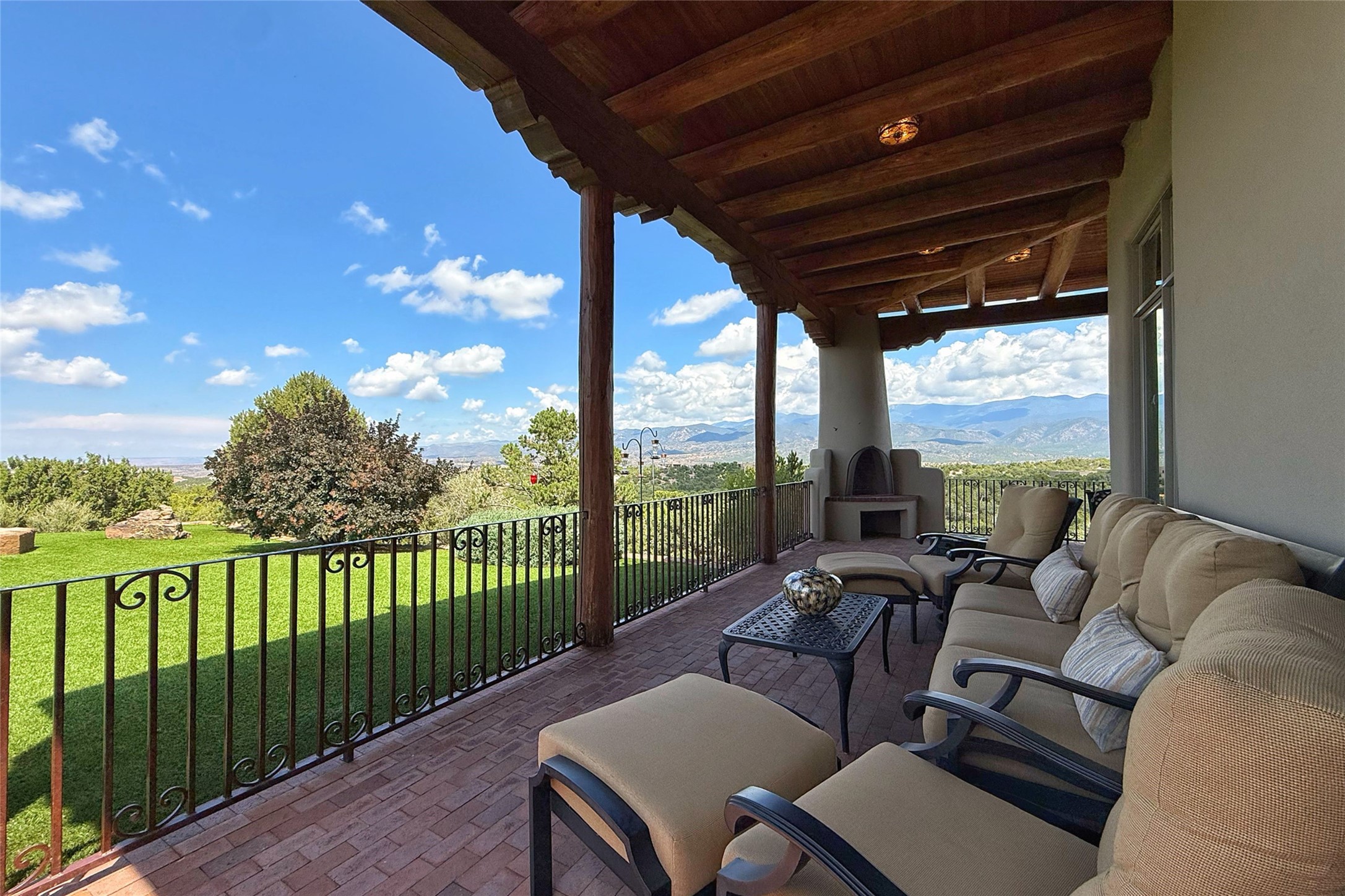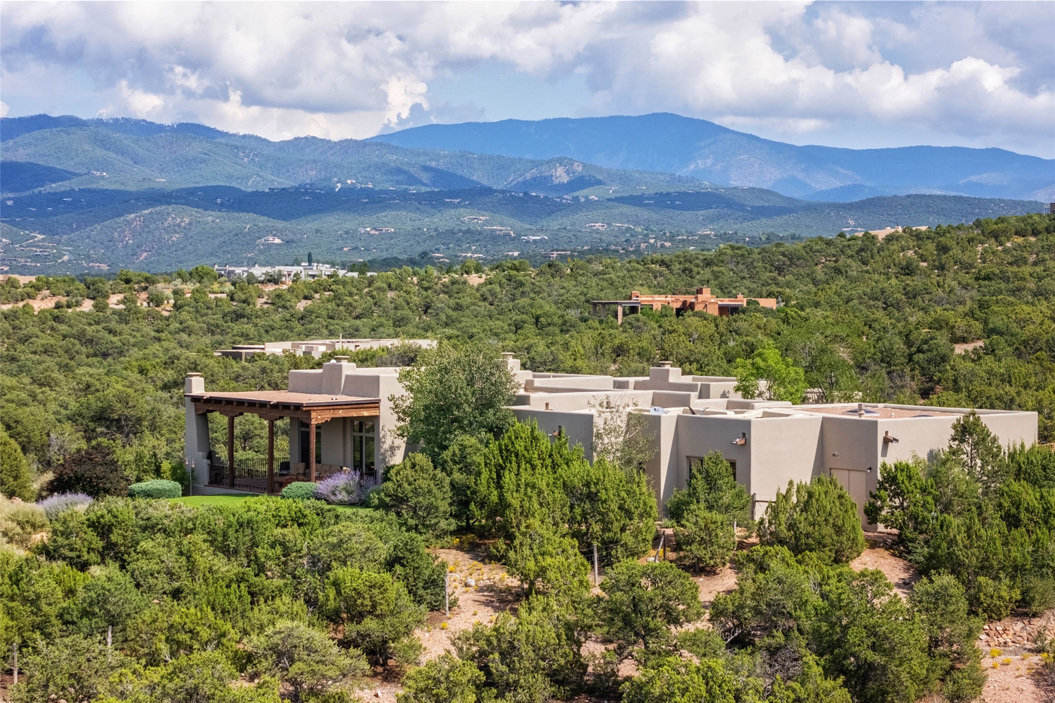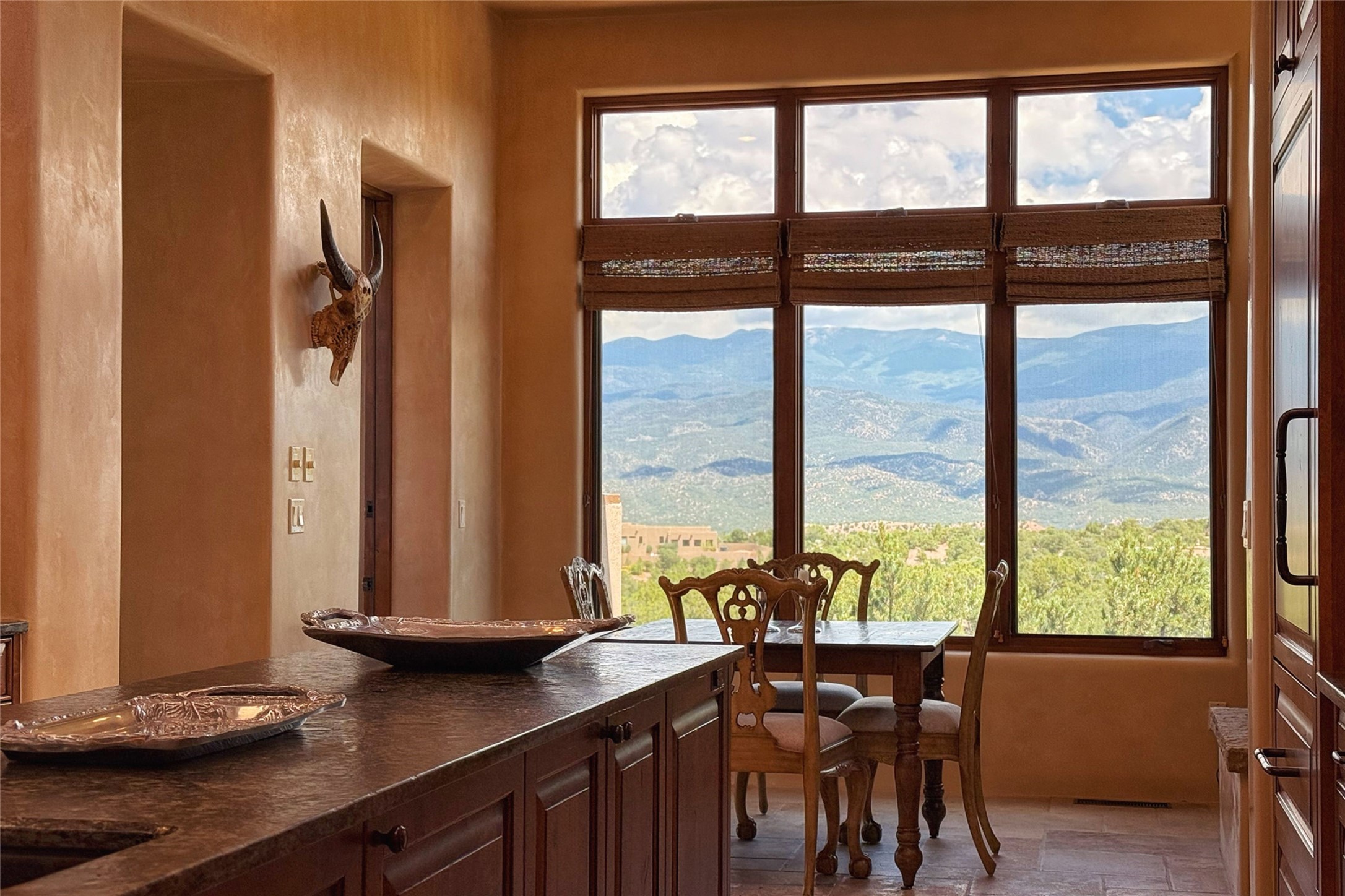 Welcome to Casa de Vistas Infinitas, a stunning home that beautifully blends rustic elegance with timeless Santa Fe charm. Set in a peaceful location with full sweeping views covering the Jemez mountains to the west, the badlands to the north, and Sangre de Cristo mountains to the east, this residence by Sharron Woods captures the absolute best of Northern New Mexico living. With diamond plaster finishes, and Italian travertine floors, every detail speaks to quality and enduring craftsmanship. Enter through double wood carved doors by Seret and Son into a foyer that sets the tone with views of the back garden and mountain ranges that stretch for miles. The living room is a showcase of light and views, with large windows framing Sangre mountain sunrise vistas, a carved stone fireplace, and adjoining eastern-facing portal featuring an outdoor wood burning kiva and a built-in grill.The spacious kitchen is both functional and inspiring, featuring custom cabinetry, leather finish "Cosmos" granite countertops, Wolf appliances and clerestory windows. The gas fireplace in adjoining breakfast-nook creates a warm and inviting gathering space. The primary suite is a true retreat. Enter through another set of beautifully carved wood doors, into a cozy space with a gas fireplace, and more breathtaking Sangre mountain views. The luxurious primary bath is finished in travertine, with more views from the soaking tub. A private office provides front courtyard access, while the guest suites offer tranquil back garden views and luxurious Michelangelo marble bathrooms. Outdoor living is designed for year-round enjoyment. From the serene courtyard entry to the wrap around portal and back garden dotted with Aspens that overlooks endless mountain rangesThoughtfully designed and impeccably finished, this home is more than a residence--it is a sanctuary offering privacy, beauty, and elegance just minutes from the heart of Santa Fe.