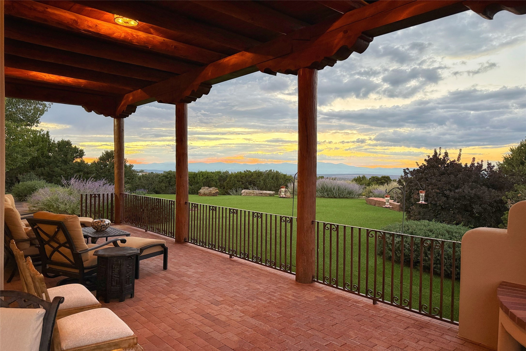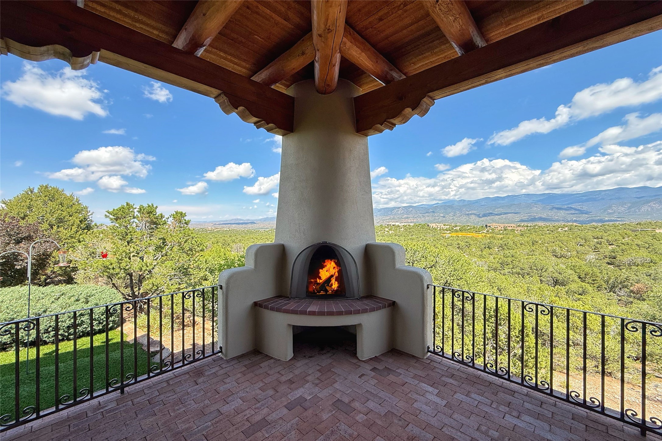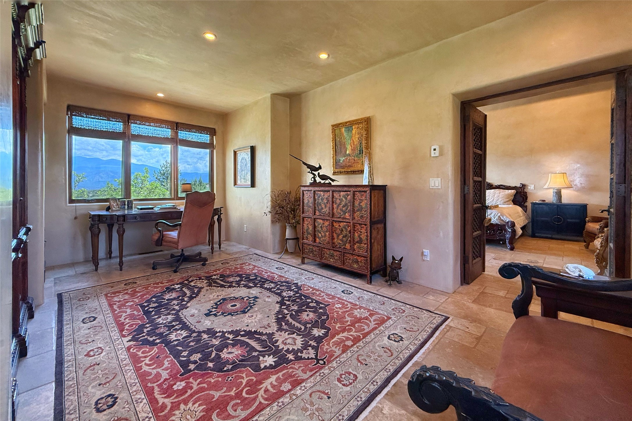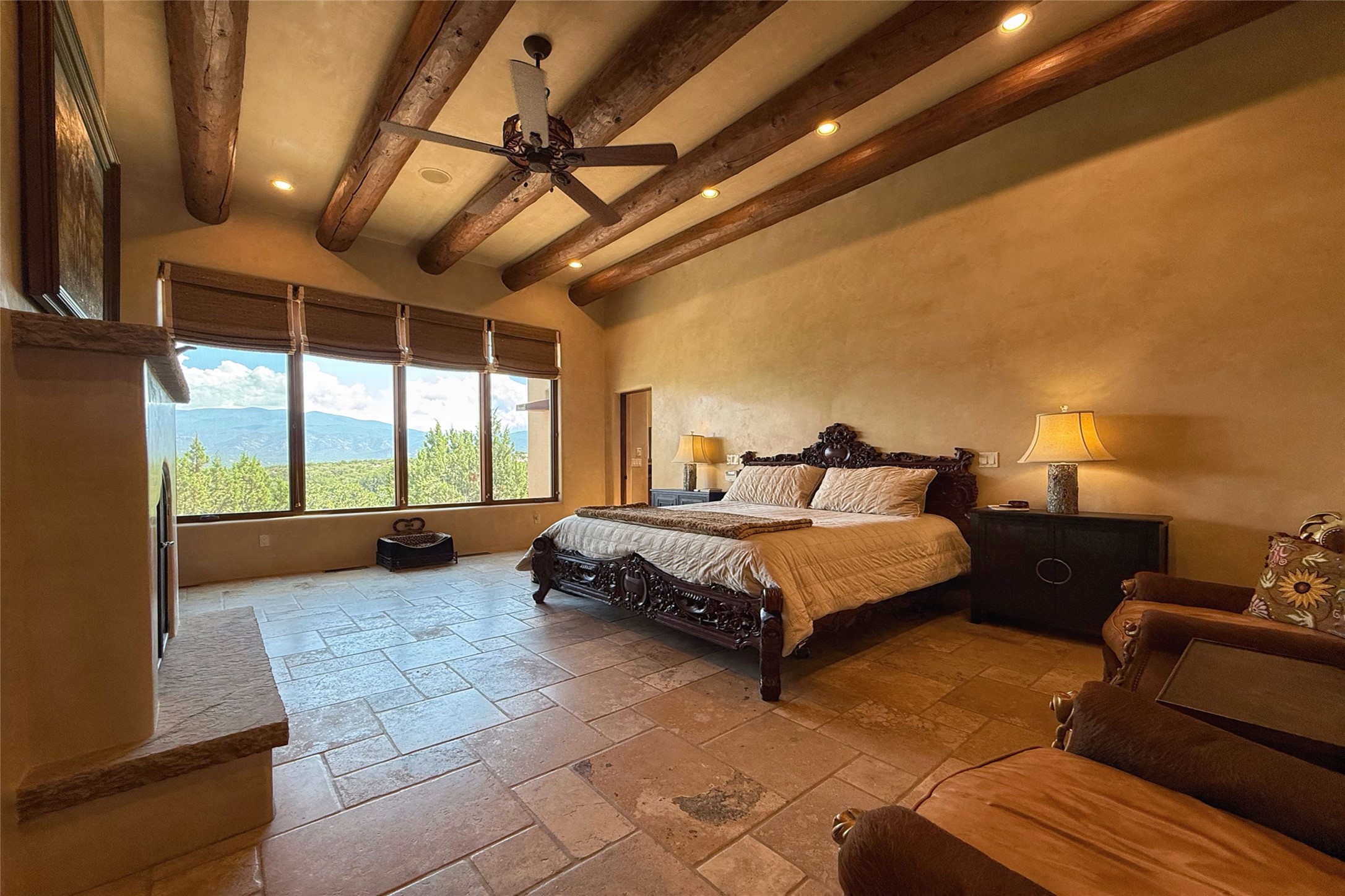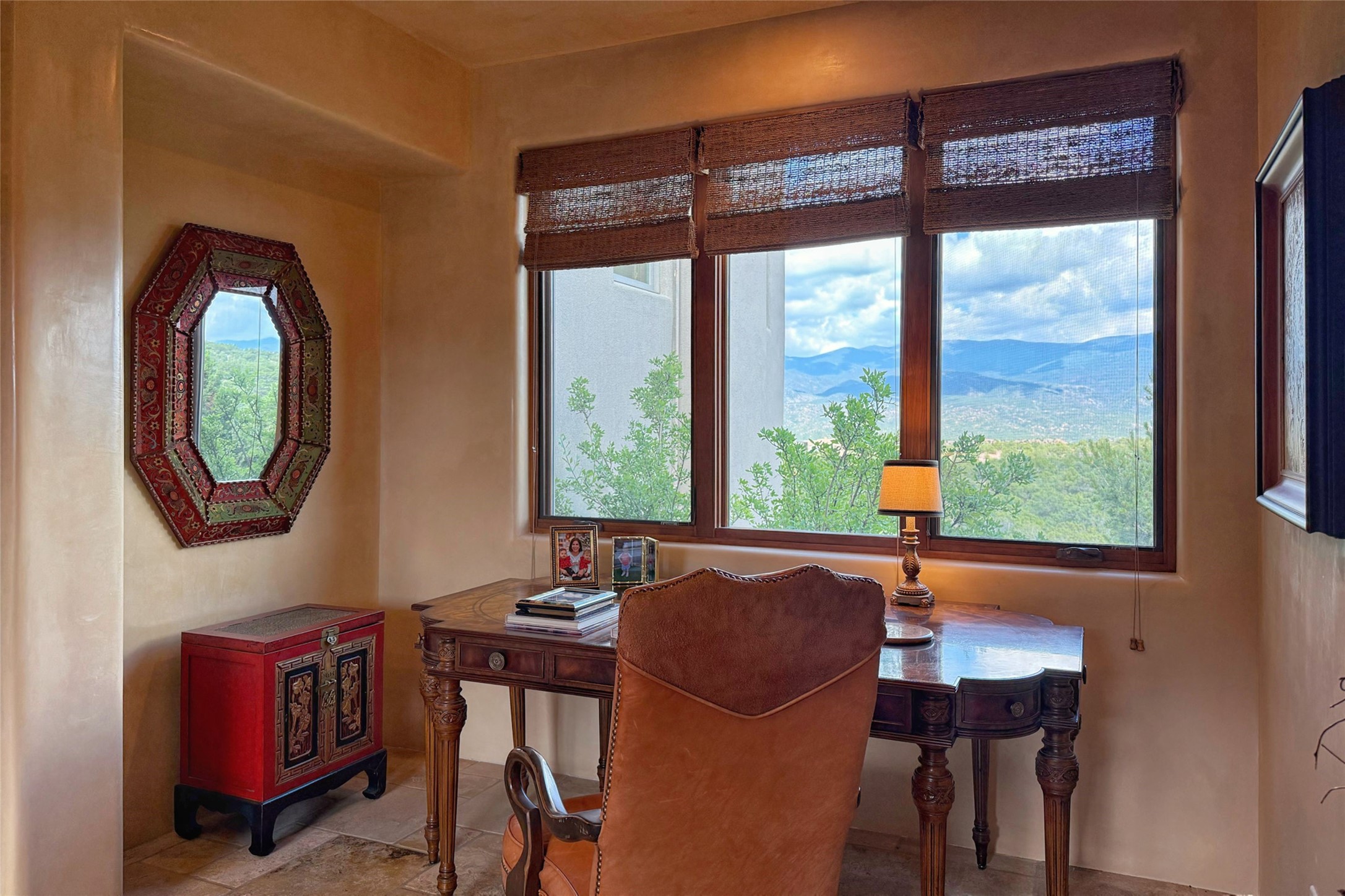 Welcome to Casa de Vistas Infinitas, a stunning home that beautifully blends rustic elegance with timeless Santa Fe charm. Set in a peaceful location with full sweeping views covering the Jemez mountains to the west, the badlands to the north, and Sangre de Cristo mountains to the east, this residence by Sharron Woods captures the absolute best of Northern New Mexico living. With diamond plaster finishes, and Italian travertine floors, every detail speaks to quality and enduring craftsmanship. Enter through double wood carved doors by Seret and Son into a foyer that sets the tone with views of the back garden and mountain ranges that stretch for miles. The living room is a showcase of light and views, with large windows framing Sangre mountain sunrise vistas, a carved stone fireplace, and adjoining eastern-facing portal featuring an outdoor wood burning kiva and a built-in grill.The spacious kitchen is both functional and inspiring, featuring custom cabinetry, leather finish "Cosmos" granite countertops, Wolf appliances and clerestory windows. The gas fireplace in adjoining breakfast-nook creates a warm and inviting gathering space. The primary suite is a true retreat. Enter through another set of beautifully carved wood doors, into a cozy space with a gas fireplace, and more breathtaking Sangre mountain views. The luxurious primary bath is finished in travertine, with more views from the soaking tub. A private office provides front courtyard access, while the guest suites offer tranquil back garden views and luxurious Michelangelo marble bathrooms. Outdoor living is designed for year-round enjoyment. From the serene courtyard entry to the wrap around portal and back garden dotted with Aspens that overlooks endless mountain rangesThoughtfully designed and impeccably finished, this home is more than a residence--it is a sanctuary offering privacy, beauty, and elegance just minutes from the heart of Santa Fe.