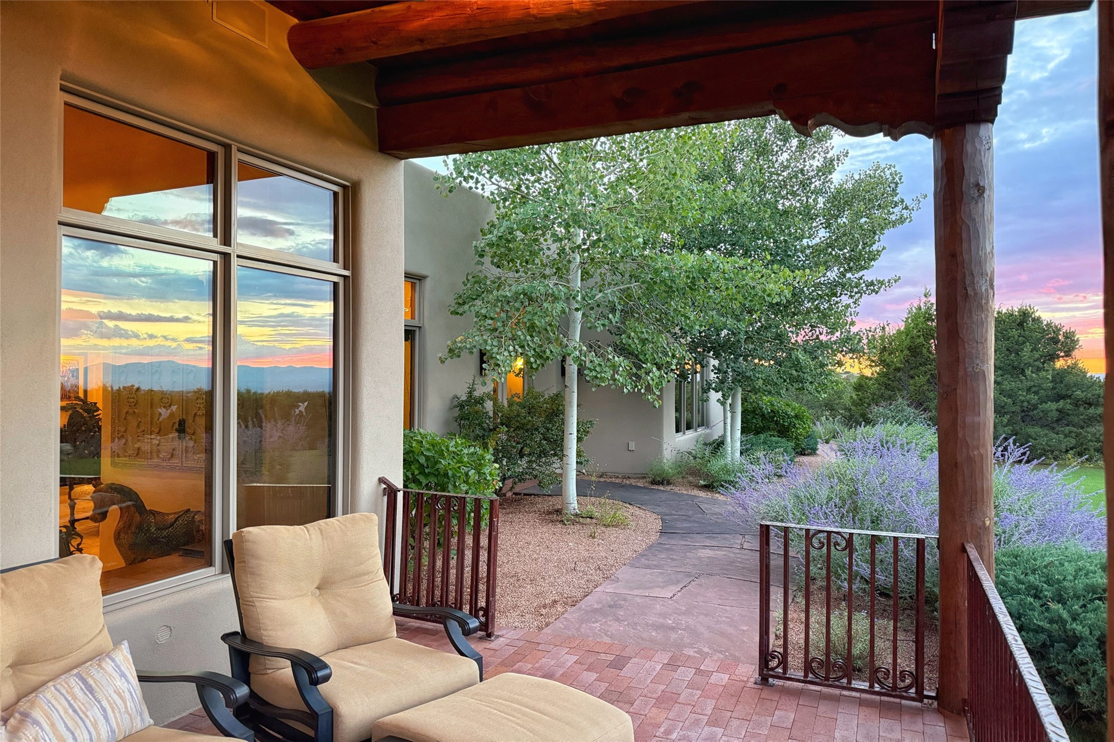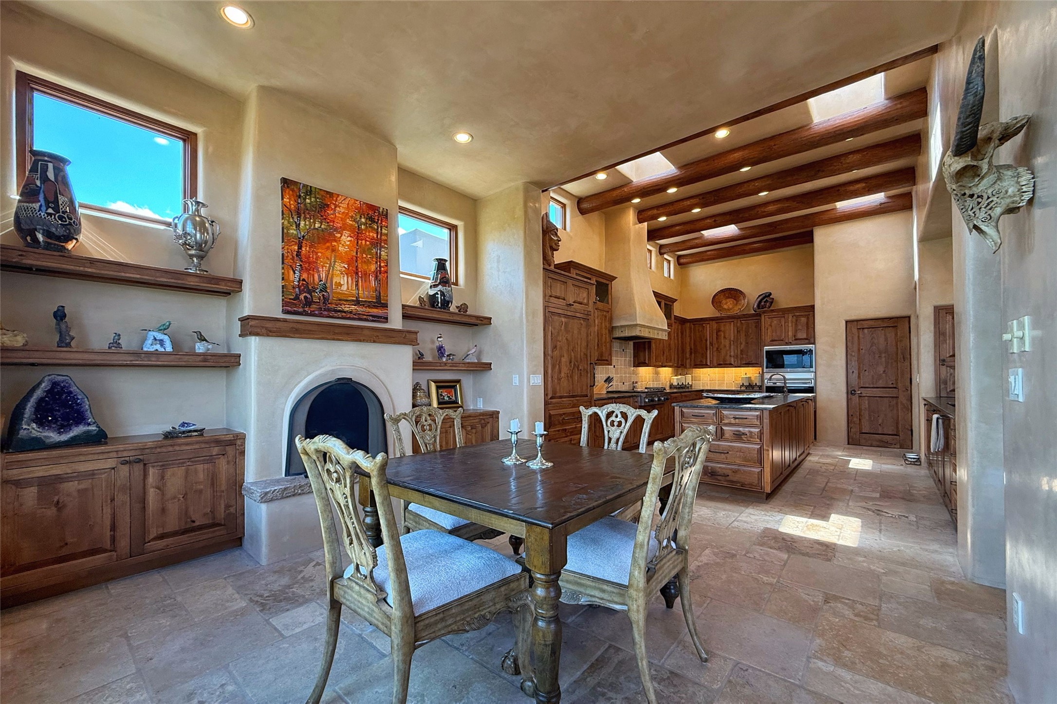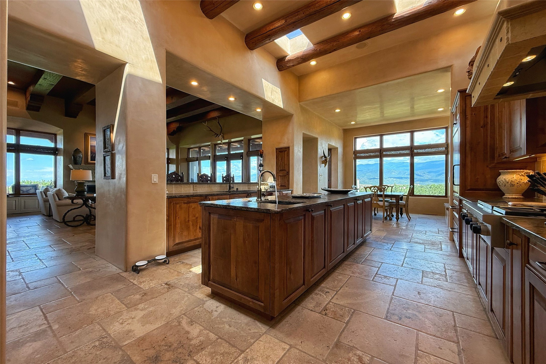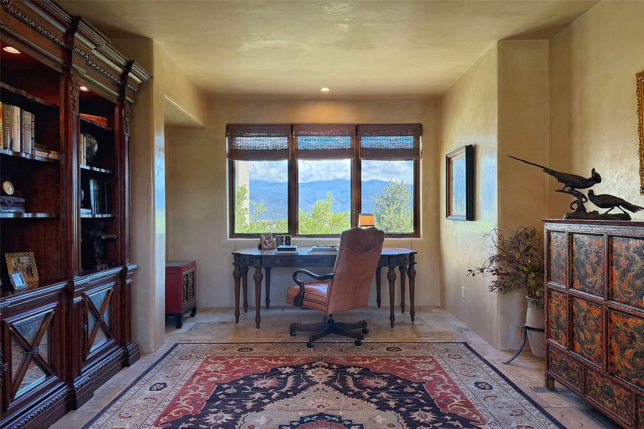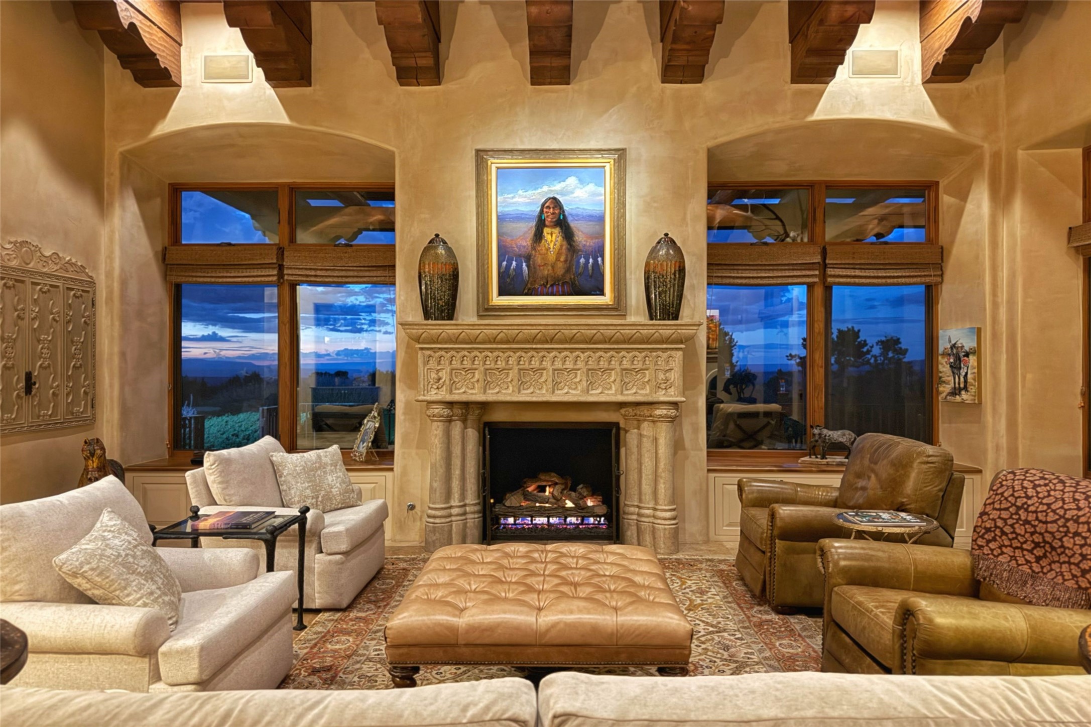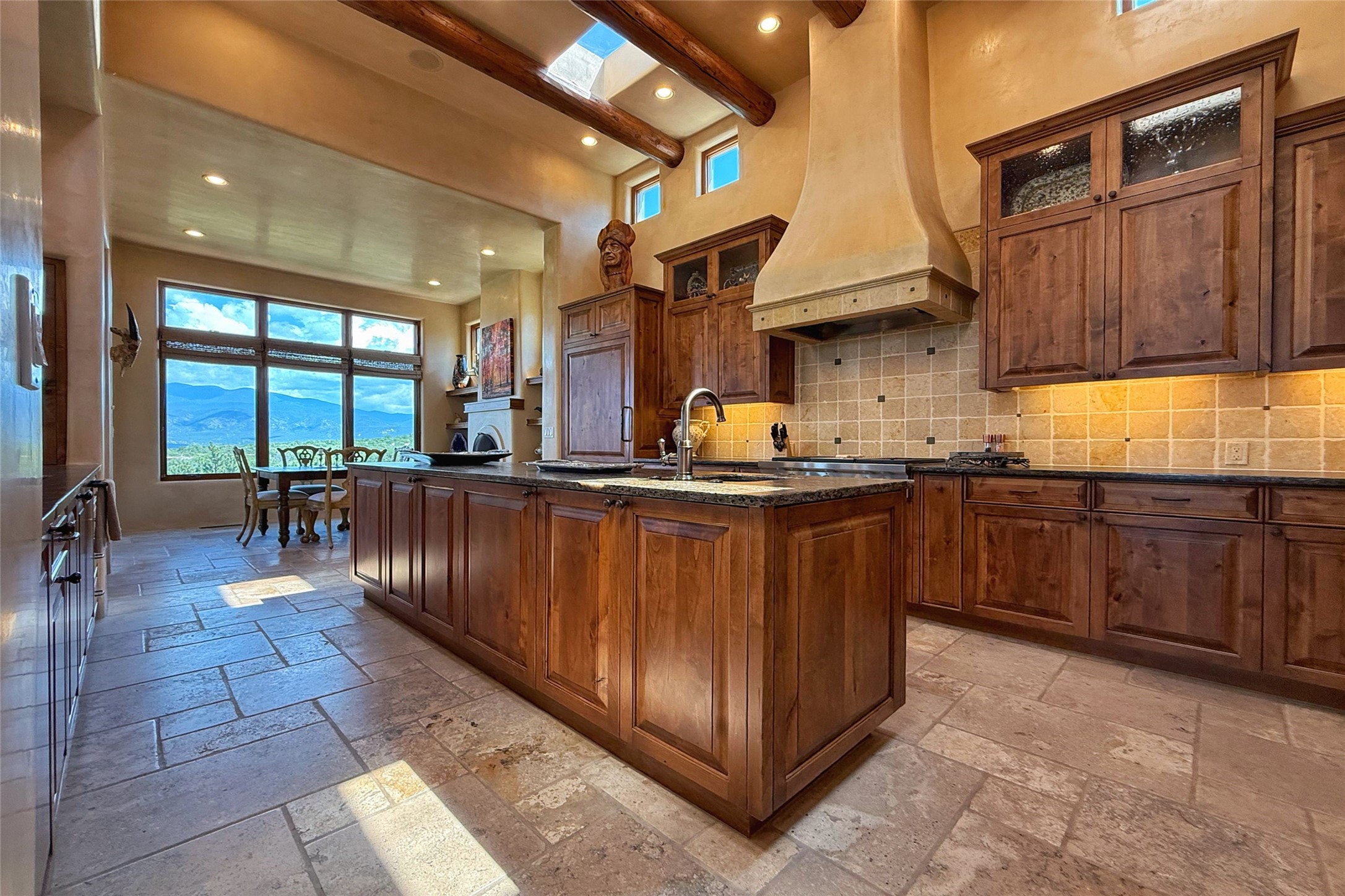 Welcome to Casa de Vistas Infinitas, a stunning home that beautifully blends rustic elegance with timeless Santa Fe charm. Set in a peaceful location with full sweeping views covering the Jemez mountains to the west, the badlands to the north, and Sangre de Cristo mountains to the east, this residence by Sharron Woods captures the absolute best of Northern New Mexico living. With diamond plaster finishes, and Italian travertine floors, every detail speaks to quality and enduring craftsmanship. Enter through double wood carved doors by Seret and Son into a foyer that sets the tone with views of the back garden and mountain ranges that stretch for miles. The living room is a showcase of light and views, with large windows framing Sangre mountain sunrise vistas, a carved stone fireplace, and adjoining eastern-facing portal featuring an outdoor wood burning kiva and a built-in grill.The spacious kitchen is both functional and inspiring, featuring custom cabinetry, leather finish "Cosmos" granite countertops, Wolf appliances and clerestory windows. The gas fireplace in adjoining breakfast-nook creates a warm and inviting gathering space. The primary suite is a true retreat. Enter through another set of beautifully carved wood doors, into a cozy space with a gas fireplace, and more breathtaking Sangre mountain views. The luxurious primary bath is finished in travertine, with more views from the soaking tub. A private office provides front courtyard access, while the guest suites offer tranquil back garden views and luxurious Michelangelo marble bathrooms. Outdoor living is designed for year-round enjoyment. From the serene courtyard entry to the wrap around portal and back garden dotted with Aspens that overlooks endless mountain rangesThoughtfully designed and impeccably finished, this home is more than a residence--it is a sanctuary offering privacy, beauty, and elegance just minutes from the heart of Santa Fe.
