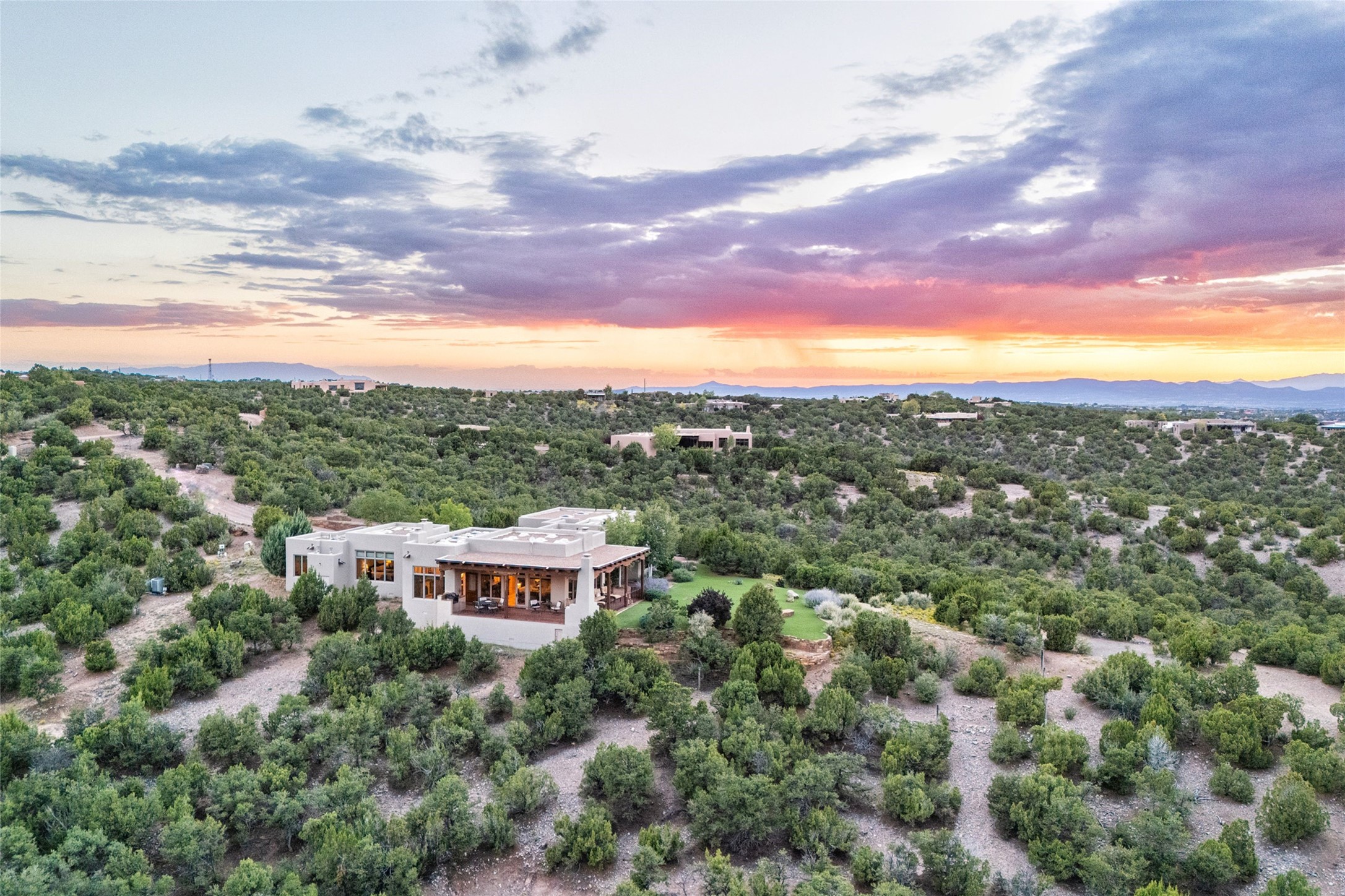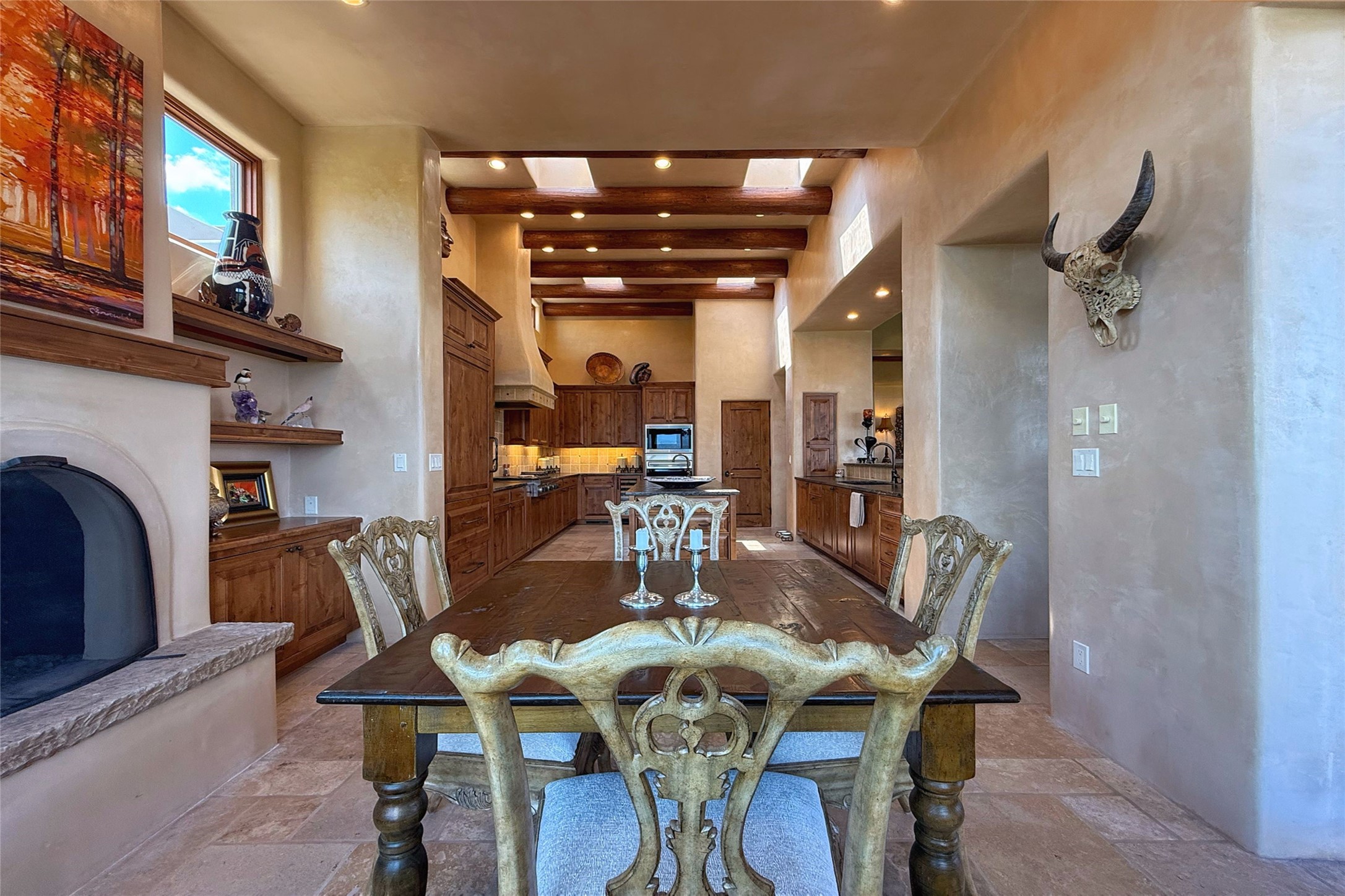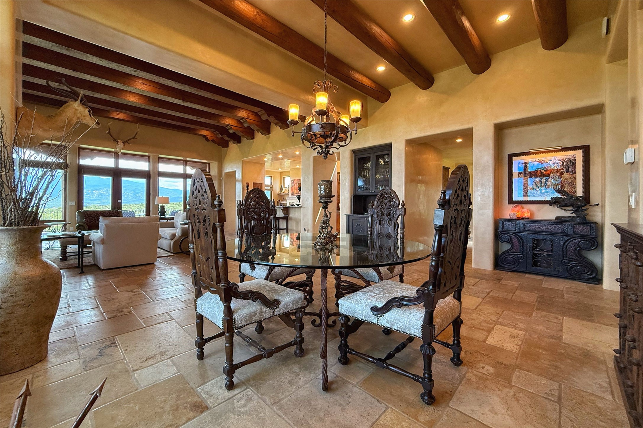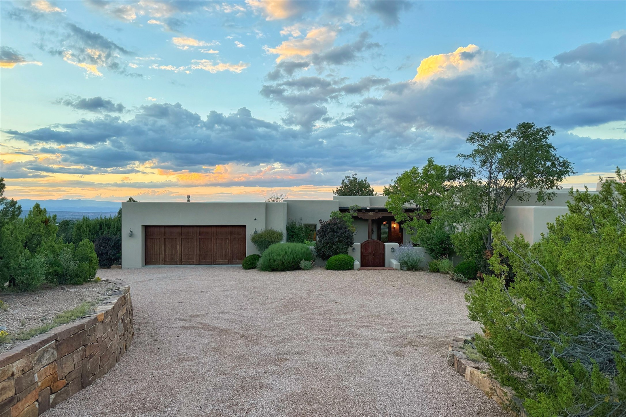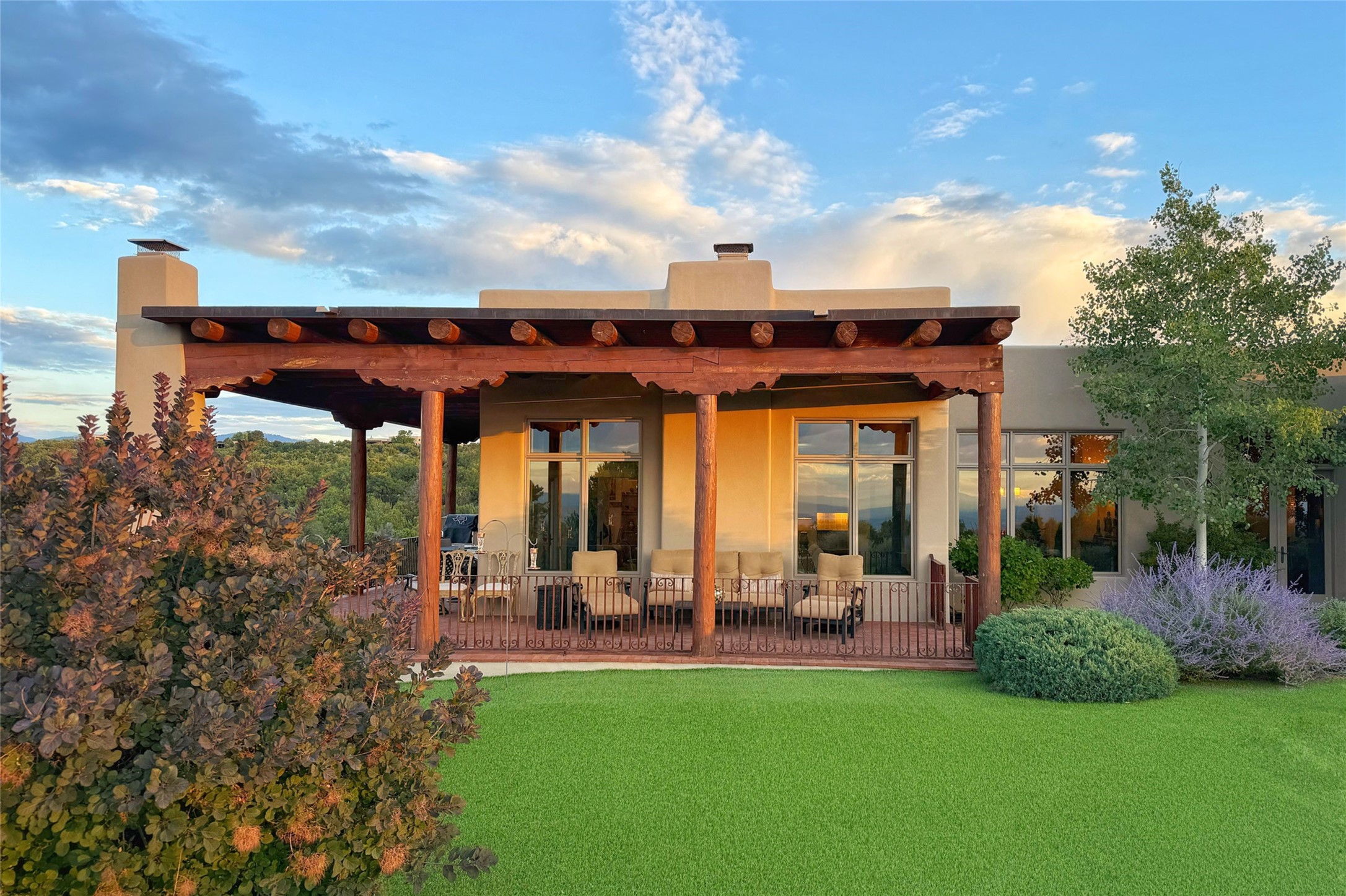 Welcome to Casa de Vistas Infinitas, a stunning home that beautifully blends rustic elegance with timeless Santa Fe charm. Set in a peaceful location with full sweeping views covering the Jemez mountains to the west, the badlands to the north, and Sangre de Cristo mountains to the east, this residence by Sharron Woods captures the absolute best of Northern New Mexico living. With diamond plaster finishes, and Italian travertine floors, every detail speaks to quality and enduring craftsmanship. Enter through double wood carved doors by Seret and Son into a foyer that sets the tone with views of the back garden and mountain ranges that stretch for miles. The living room is a showcase of light and views, with large windows framing Sangre mountain sunrise vistas, a carved stone fireplace, and adjoining eastern-facing portal featuring an outdoor wood burning kiva and a built-in grill.The spacious kitchen is both functional and inspiring, featuring custom cabinetry, leather finish "Cosmos" granite countertops, Wolf appliances and clerestory windows. The gas fireplace in adjoining breakfast-nook creates a warm and inviting gathering space. The primary suite is a true retreat. Enter through another set of beautifully carved wood doors, into a cozy space with a gas fireplace, and more breathtaking Sangre mountain views. The luxurious primary bath is finished in travertine, with more views from the soaking tub. A private office provides front courtyard access, while the guest suites offer tranquil back garden views and luxurious Michelangelo marble bathrooms. Outdoor living is designed for year-round enjoyment. From the serene courtyard entry to the wrap around portal and back garden dotted with Aspens that overlooks endless mountain rangesThoughtfully designed and impeccably finished, this home is more than a residence--it is a sanctuary offering privacy, beauty, and elegance just minutes from the heart of Santa Fe.