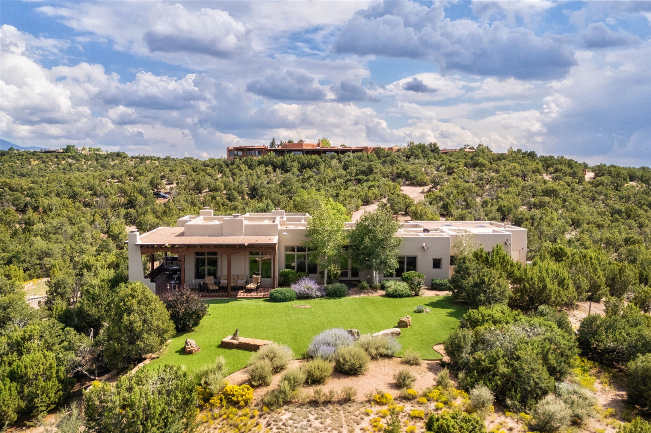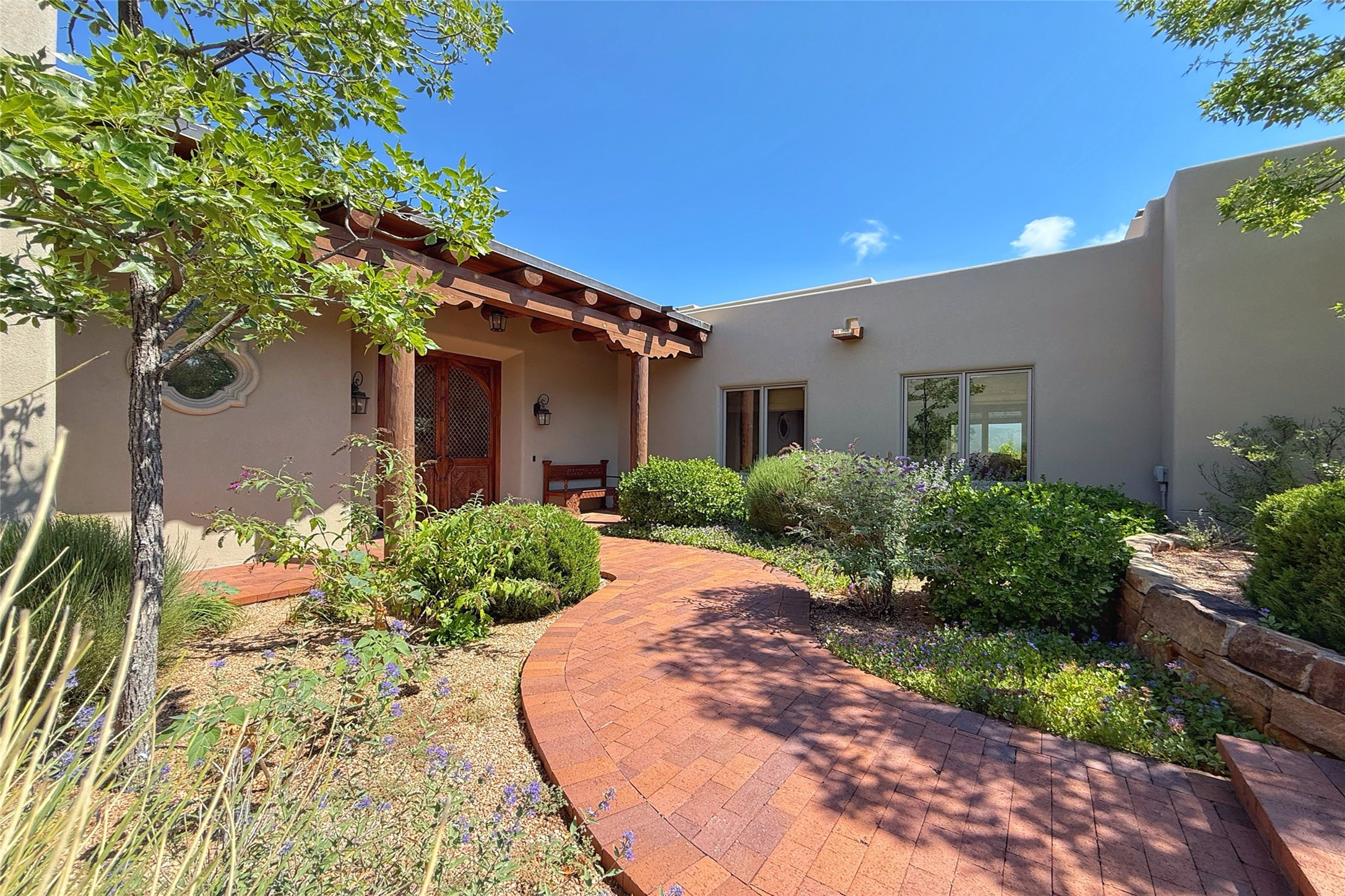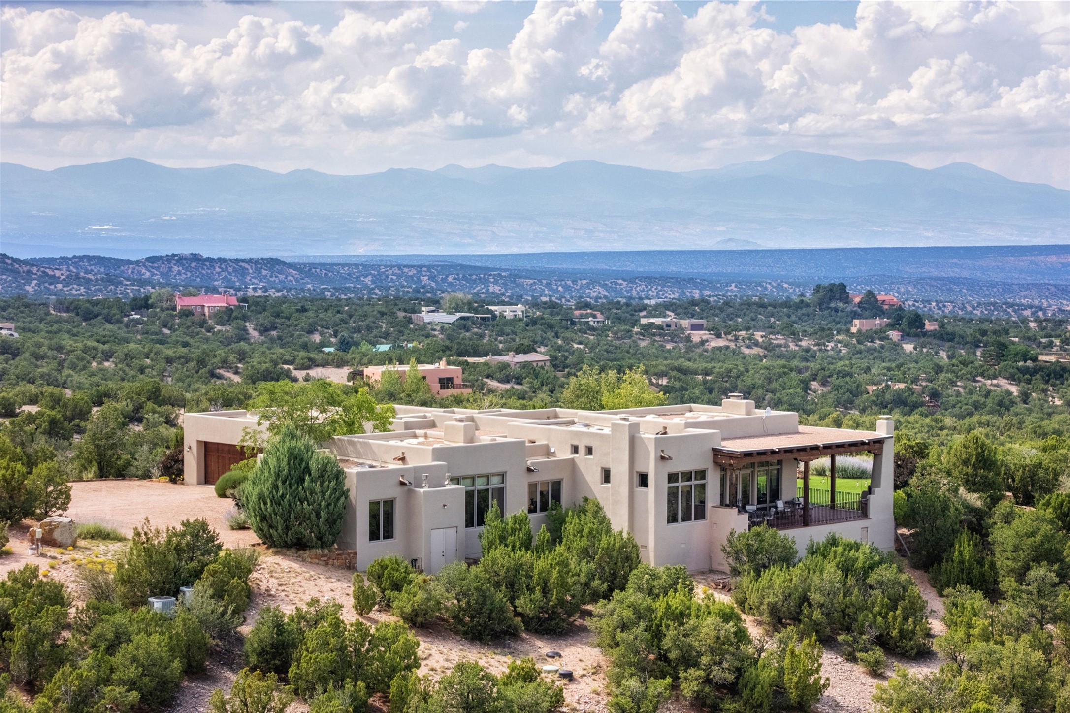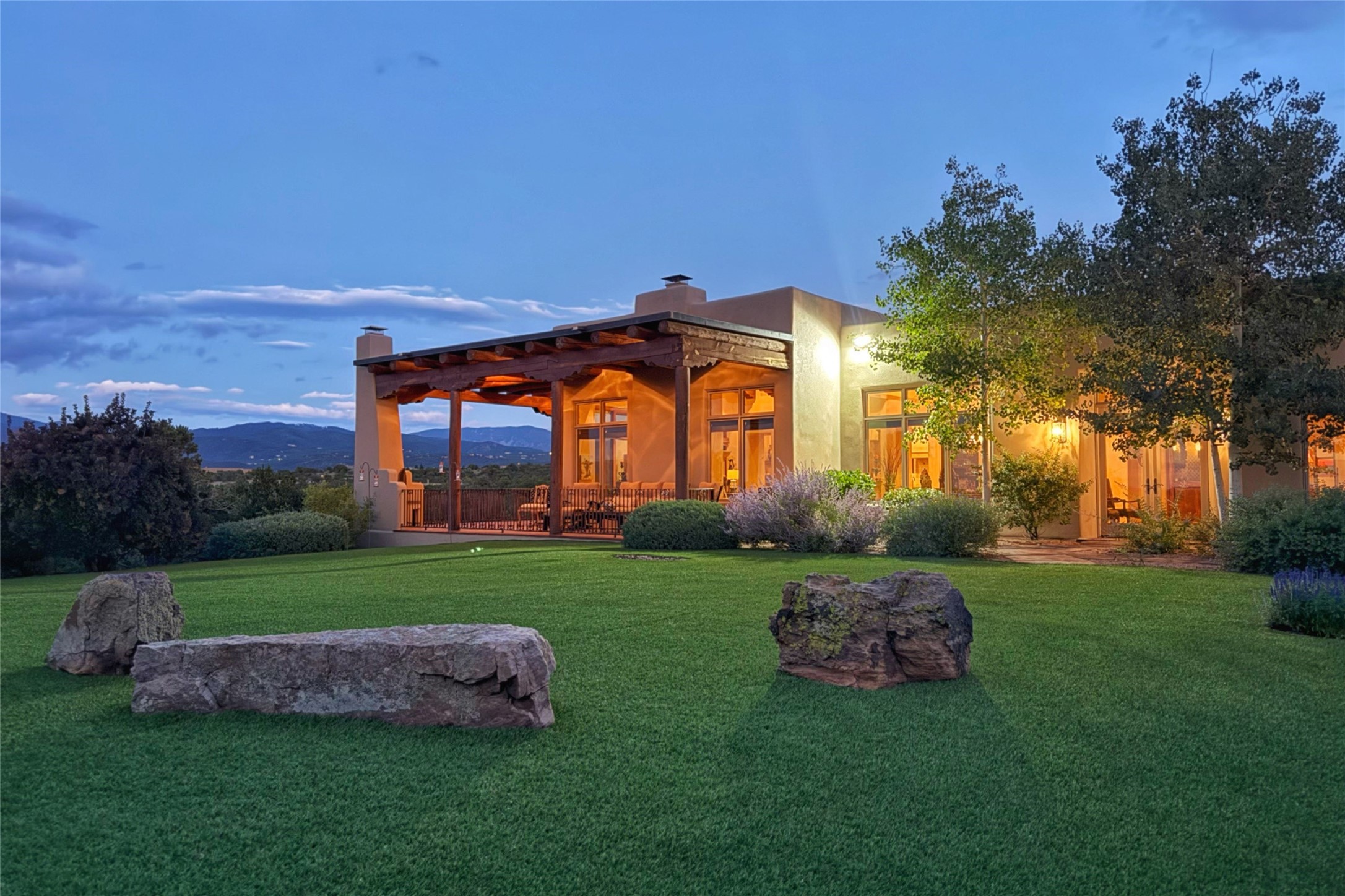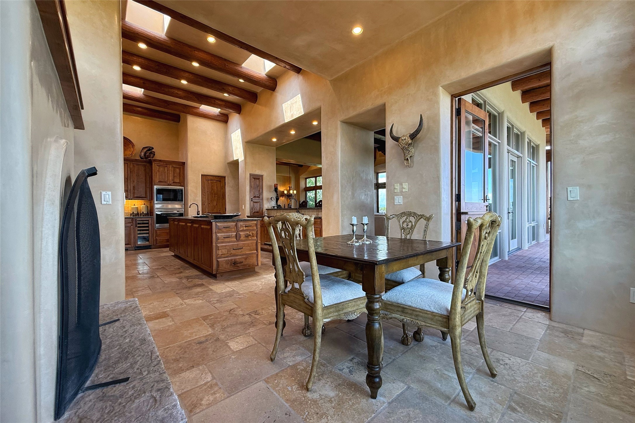 Welcome to Casa de Vistas Infinitas, a stunning home that beautifully blends rustic elegance with timeless Santa Fe charm. Set in a peaceful location with full sweeping views covering the Jemez mountains to the west, the badlands to the north, and Sangre de Cristo mountains to the east, this residence by Sharron Woods captures the absolute best of Northern New Mexico living. With diamond plaster finishes, and Italian travertine floors, every detail speaks to quality and enduring craftsmanship. Enter through double wood carved doors by Seret and Son into a foyer that sets the tone with views of the back garden and mountain ranges that stretch for miles. The living room is a showcase of light and views, with large windows framing Sangre mountain sunrise vistas, a carved stone fireplace, and adjoining eastern-facing portal featuring an outdoor wood burning kiva and a built-in grill.The spacious kitchen is both functional and inspiring, featuring custom cabinetry, leather finish "Cosmos" granite countertops, Wolf appliances and clerestory windows. The gas fireplace in adjoining breakfast-nook creates a warm and inviting gathering space. The primary suite is a true retreat. Enter through another set of beautifully carved wood doors, into a cozy space with a gas fireplace, and more breathtaking Sangre mountain views. The luxurious primary bath is finished in travertine, with more views from the soaking tub. A private office provides front courtyard access, while the guest suites offer tranquil back garden views and luxurious Michelangelo marble bathrooms. Outdoor living is designed for year-round enjoyment. From the serene courtyard entry to the wrap around portal and back garden dotted with Aspens that overlooks endless mountain rangesThoughtfully designed and impeccably finished, this home is more than a residence--it is a sanctuary offering privacy, beauty, and elegance just minutes from the heart of Santa Fe.