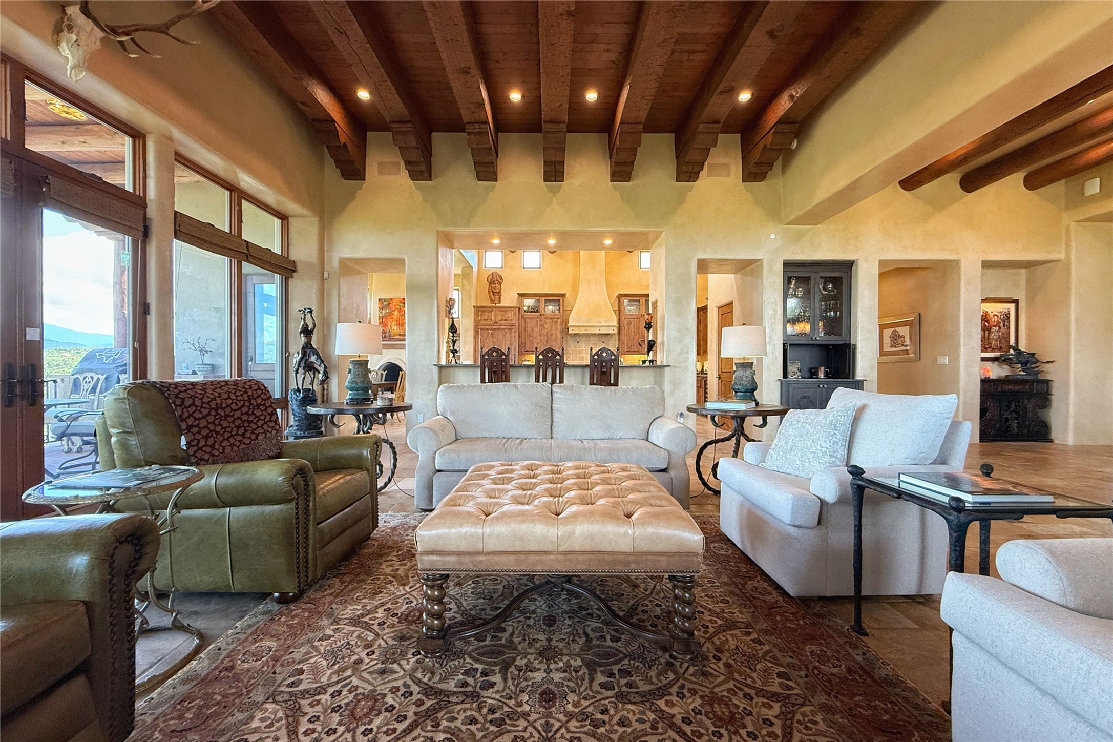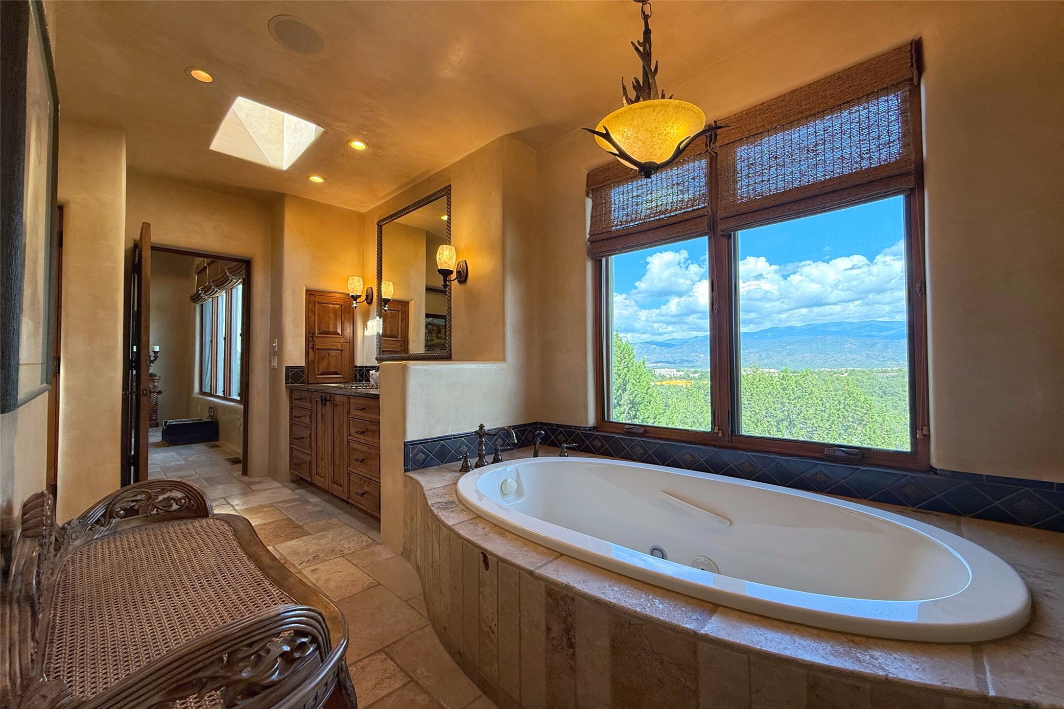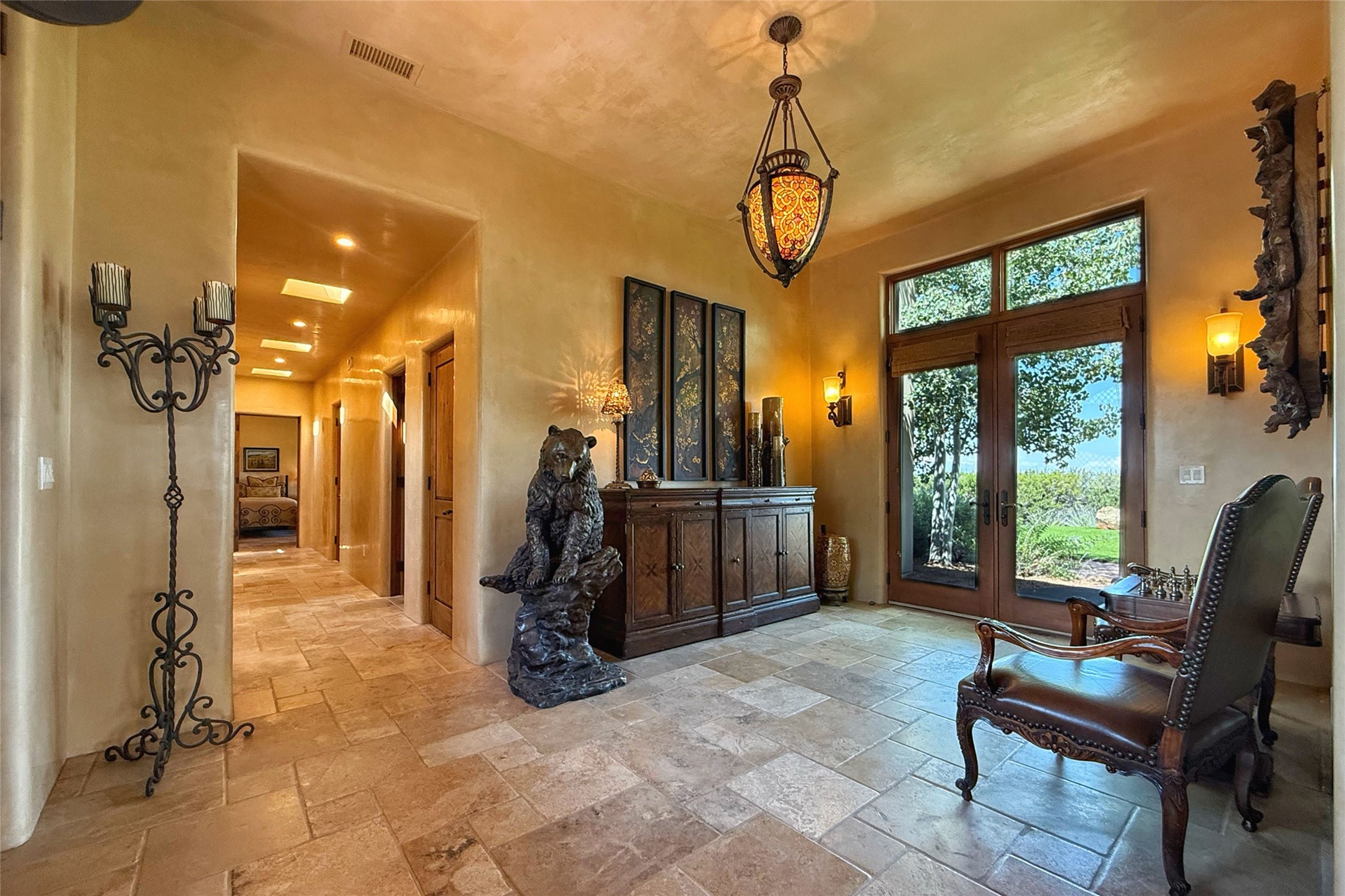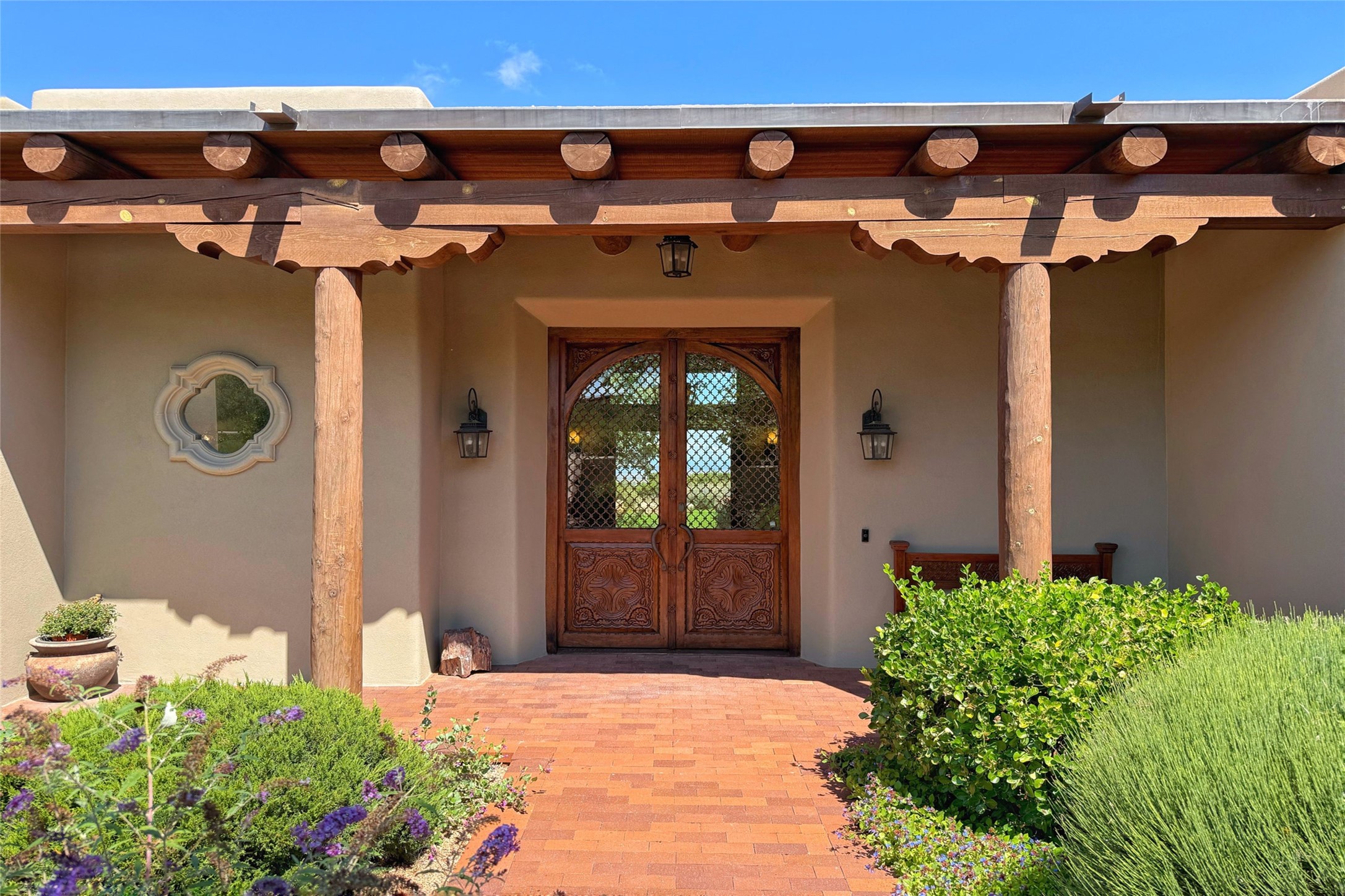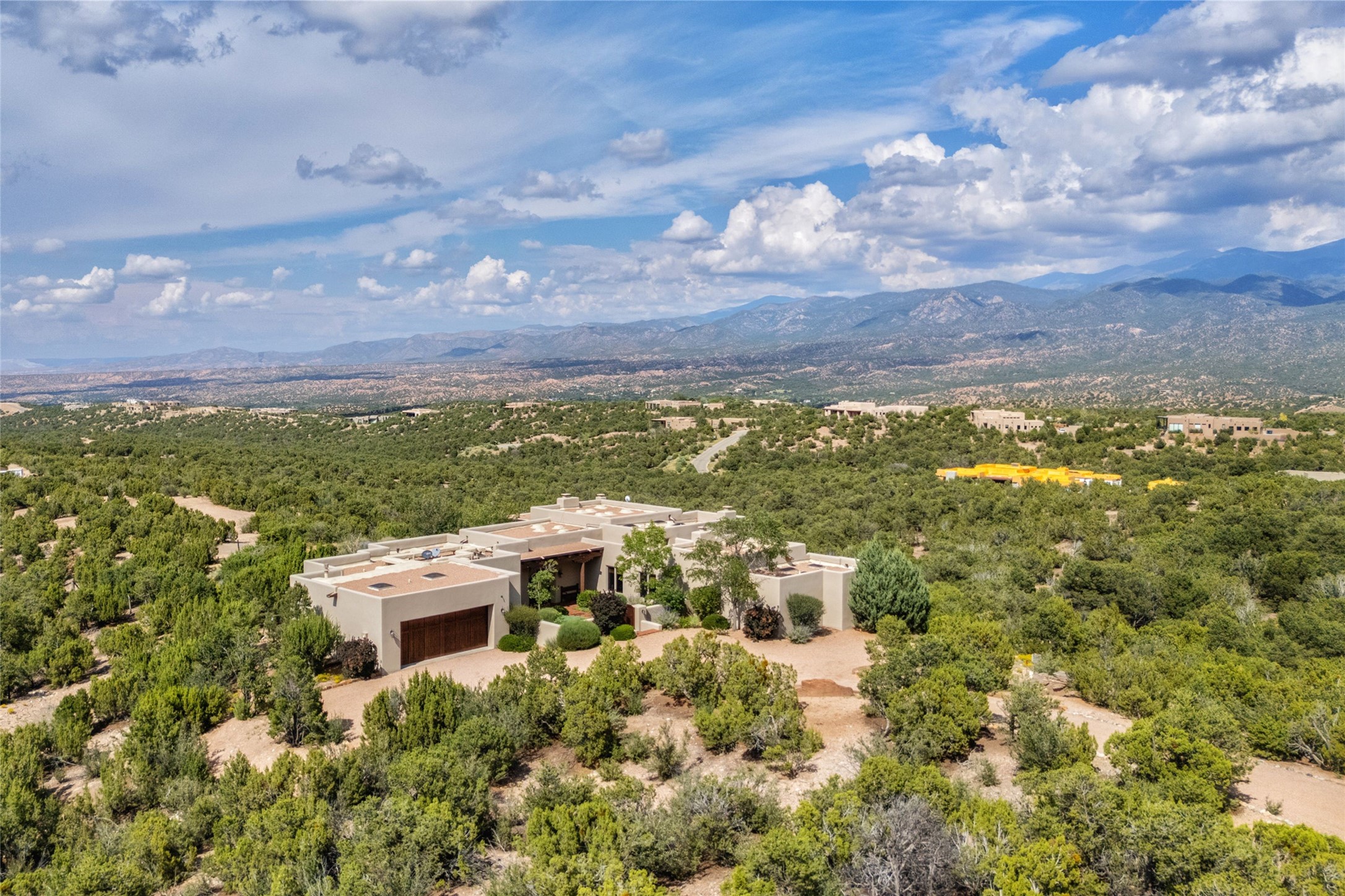 Welcome to Casa de Vistas Infinitas, a stunning home that beautifully blends rustic elegance with timeless Santa Fe charm. Set in a peaceful location with full sweeping views covering the Jemez mountains to the west, the badlands to the north, and Sangre de Cristo mountains to the east, this residence by Sharron Woods captures the absolute best of Northern New Mexico living. With diamond plaster finishes, and Italian travertine floors, every detail speaks to quality and enduring craftsmanship. Enter through double wood carved doors by Seret and Son into a foyer that sets the tone with views of the back garden and mountain ranges that stretch for miles. The living room is a showcase of light and views, with large windows framing Sangre mountain sunrise vistas, a carved stone fireplace, and adjoining eastern-facing portal featuring an outdoor wood burning kiva and a built-in grill.The spacious kitchen is both functional and inspiring, featuring custom cabinetry, leather finish "Cosmos" granite countertops, Wolf appliances and clerestory windows. The gas fireplace in adjoining breakfast-nook creates a warm and inviting gathering space. The primary suite is a true retreat. Enter through another set of beautifully carved wood doors, into a cozy space with a gas fireplace, and more breathtaking Sangre mountain views. The luxurious primary bath is finished in travertine, with more views from the soaking tub. A private office provides front courtyard access, while the guest suites offer tranquil back garden views and luxurious Michelangelo marble bathrooms. Outdoor living is designed for year-round enjoyment. From the serene courtyard entry to the wrap around portal and back garden dotted with Aspens that overlooks endless mountain rangesThoughtfully designed and impeccably finished, this home is more than a residence--it is a sanctuary offering privacy, beauty, and elegance just minutes from the heart of Santa Fe.