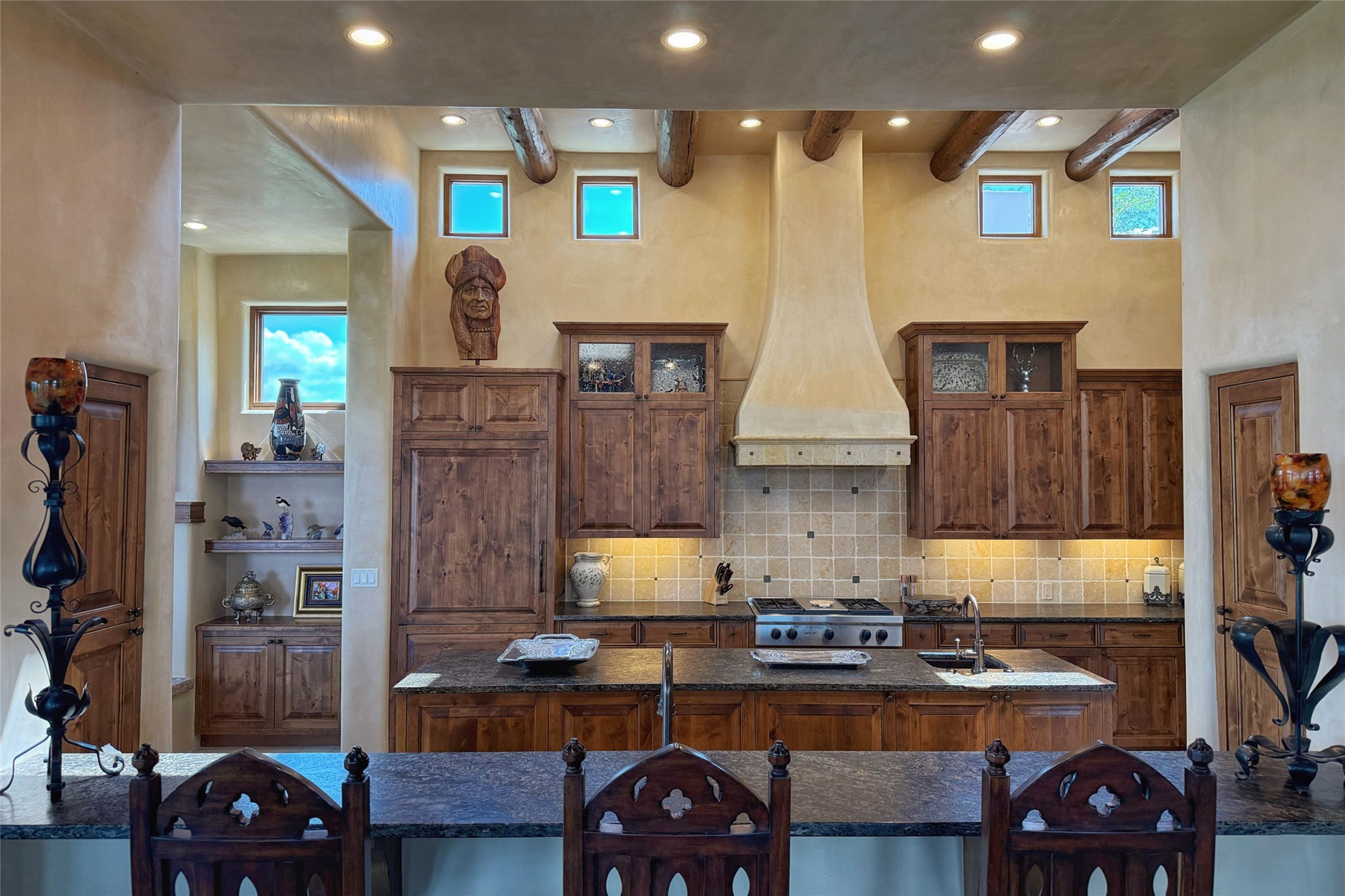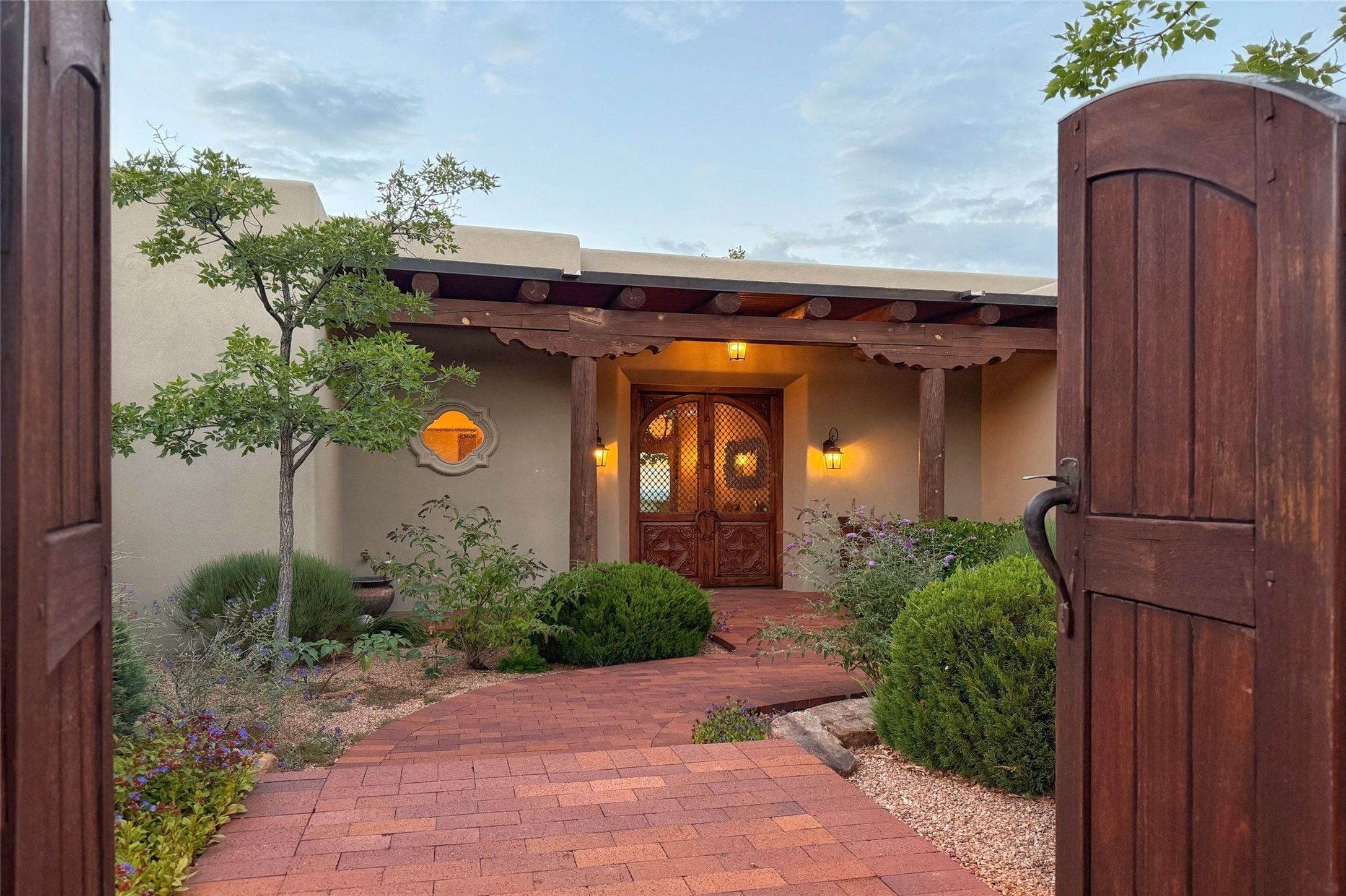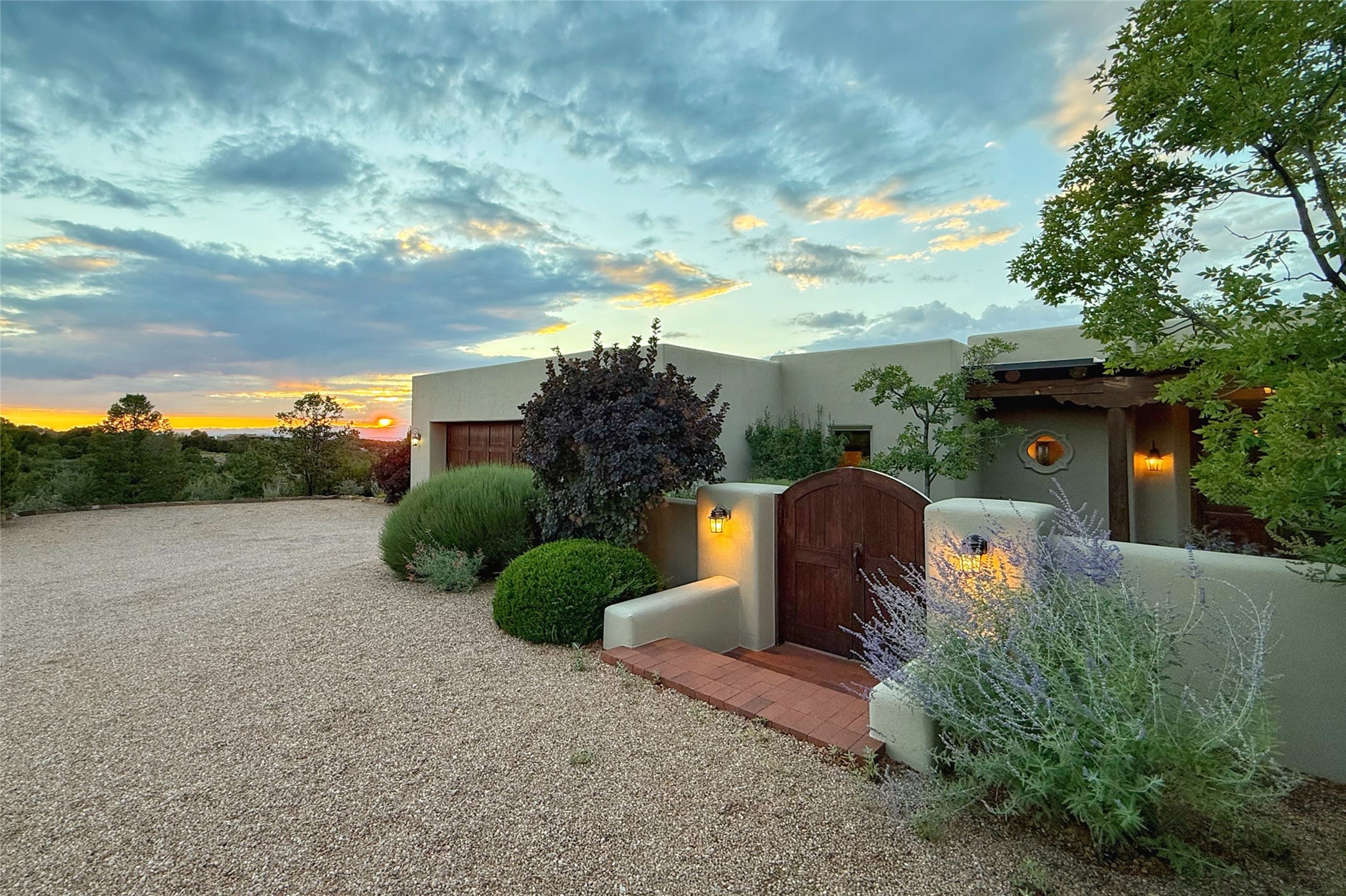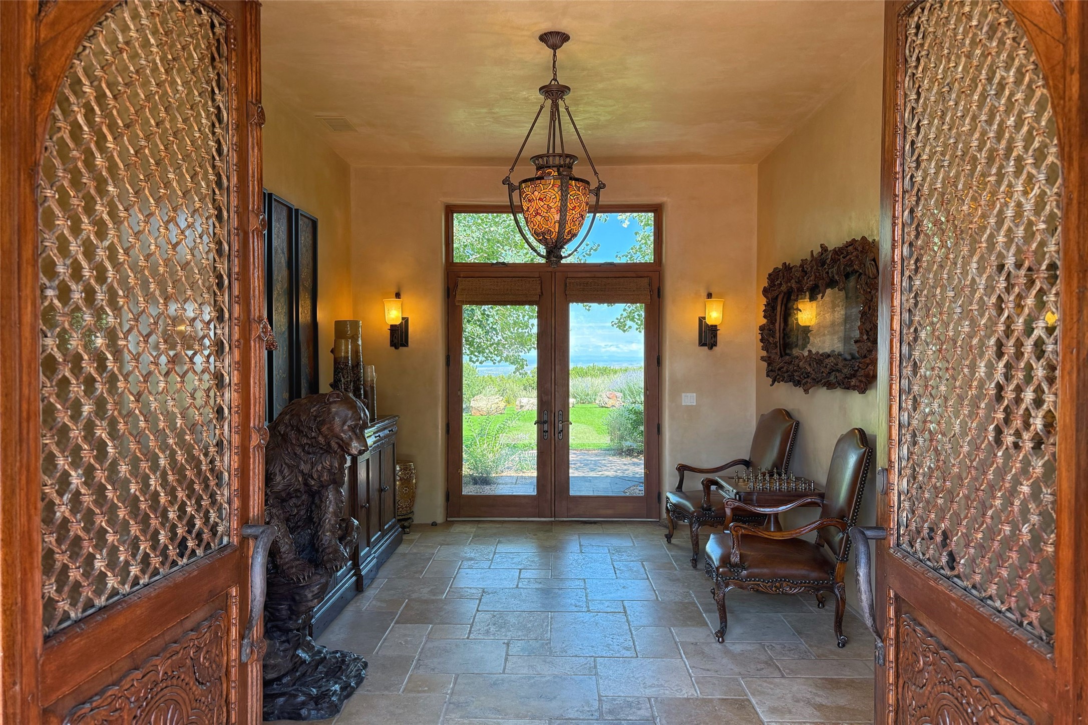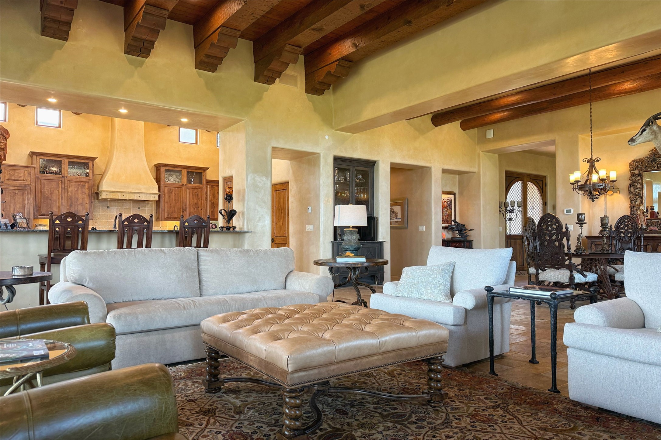 Welcome to Casa de Vistas Infinitas, a stunning home that beautifully blends rustic elegance with timeless Santa Fe charm. Set in a peaceful location with full sweeping views covering the Jemez mountains to the west, the badlands to the north, and Sangre de Cristo mountains to the east, this residence by Sharron Woods captures the absolute best of Northern New Mexico living. With diamond plaster finishes, and Italian travertine floors, every detail speaks to quality and enduring craftsmanship. Enter through double wood carved doors by Seret and Son into a foyer that sets the tone with views of the back garden and mountain ranges that stretch for miles. The living room is a showcase of light and views, with large windows framing Sangre mountain sunrise vistas, a carved stone fireplace, and adjoining eastern-facing portal featuring an outdoor wood burning kiva and a built-in grill.The spacious kitchen is both functional and inspiring, featuring custom cabinetry, leather finish "Cosmos" granite countertops, Wolf appliances and clerestory windows. The gas fireplace in adjoining breakfast-nook creates a warm and inviting gathering space. The primary suite is a true retreat. Enter through another set of beautifully carved wood doors, into a cozy space with a gas fireplace, and more breathtaking Sangre mountain views. The luxurious primary bath is finished in travertine, with more views from the soaking tub. A private office provides front courtyard access, while the guest suites offer tranquil back garden views and luxurious Michelangelo marble bathrooms. Outdoor living is designed for year-round enjoyment. From the serene courtyard entry to the wrap around portal and back garden dotted with Aspens that overlooks endless mountain rangesThoughtfully designed and impeccably finished, this home is more than a residence--it is a sanctuary offering privacy, beauty, and elegance just minutes from the heart of Santa Fe.