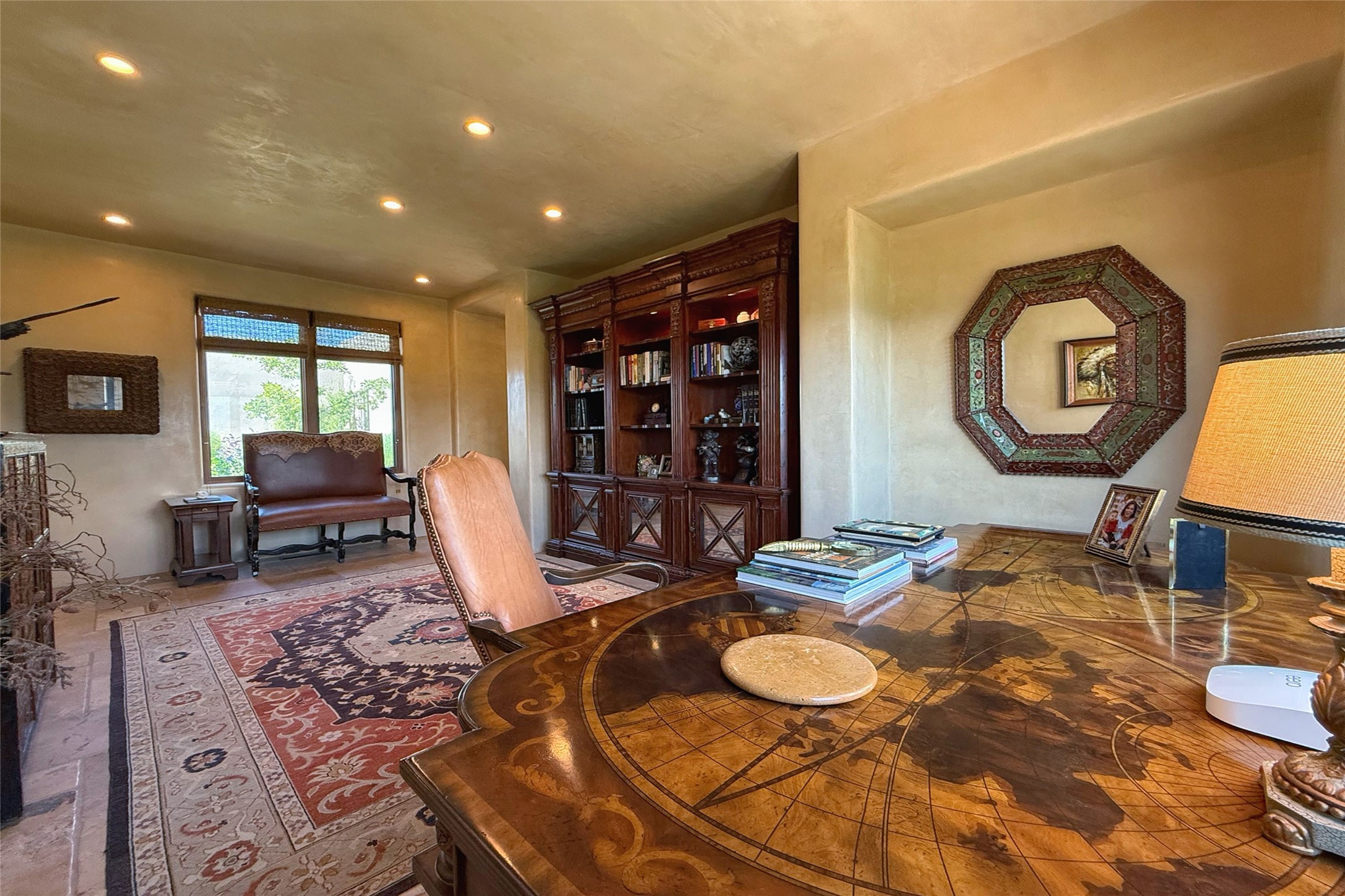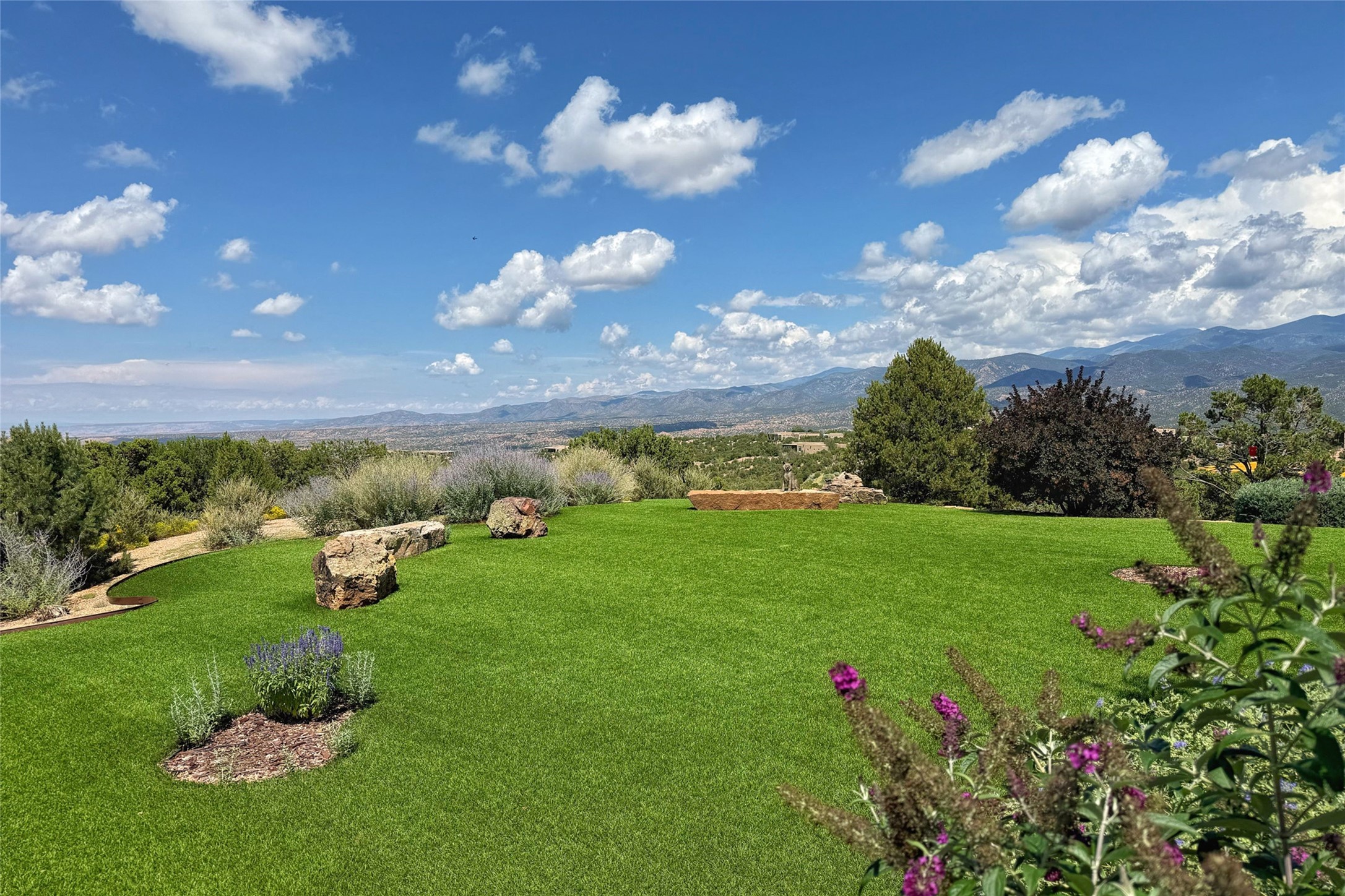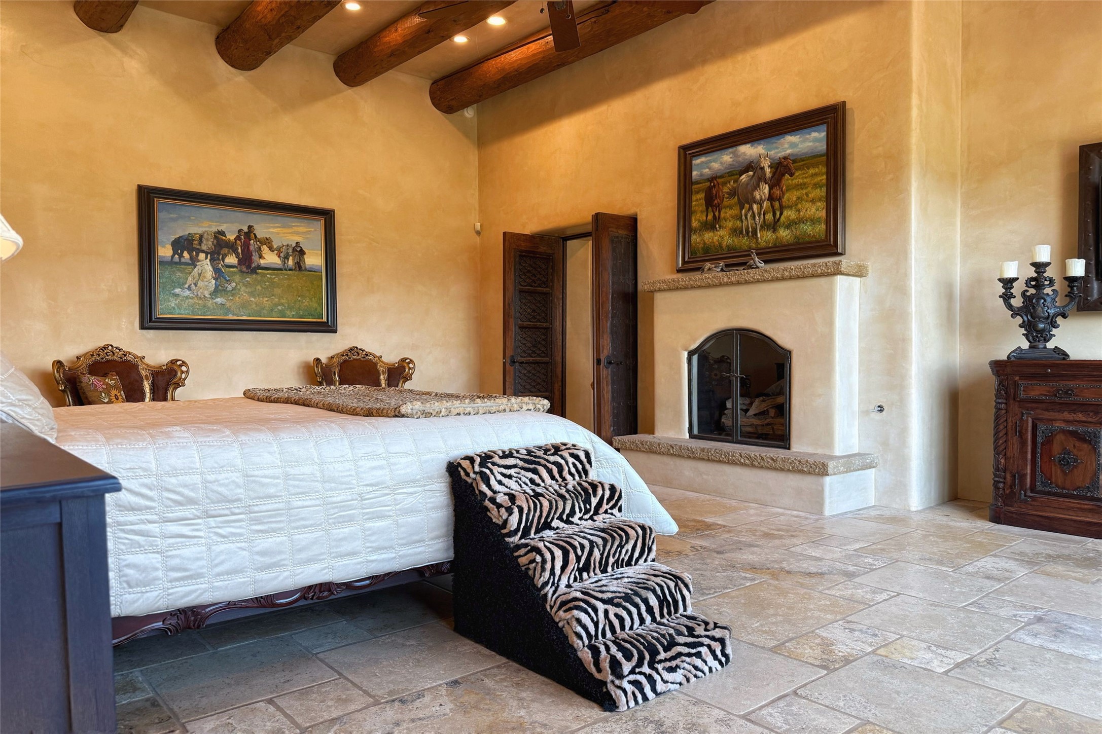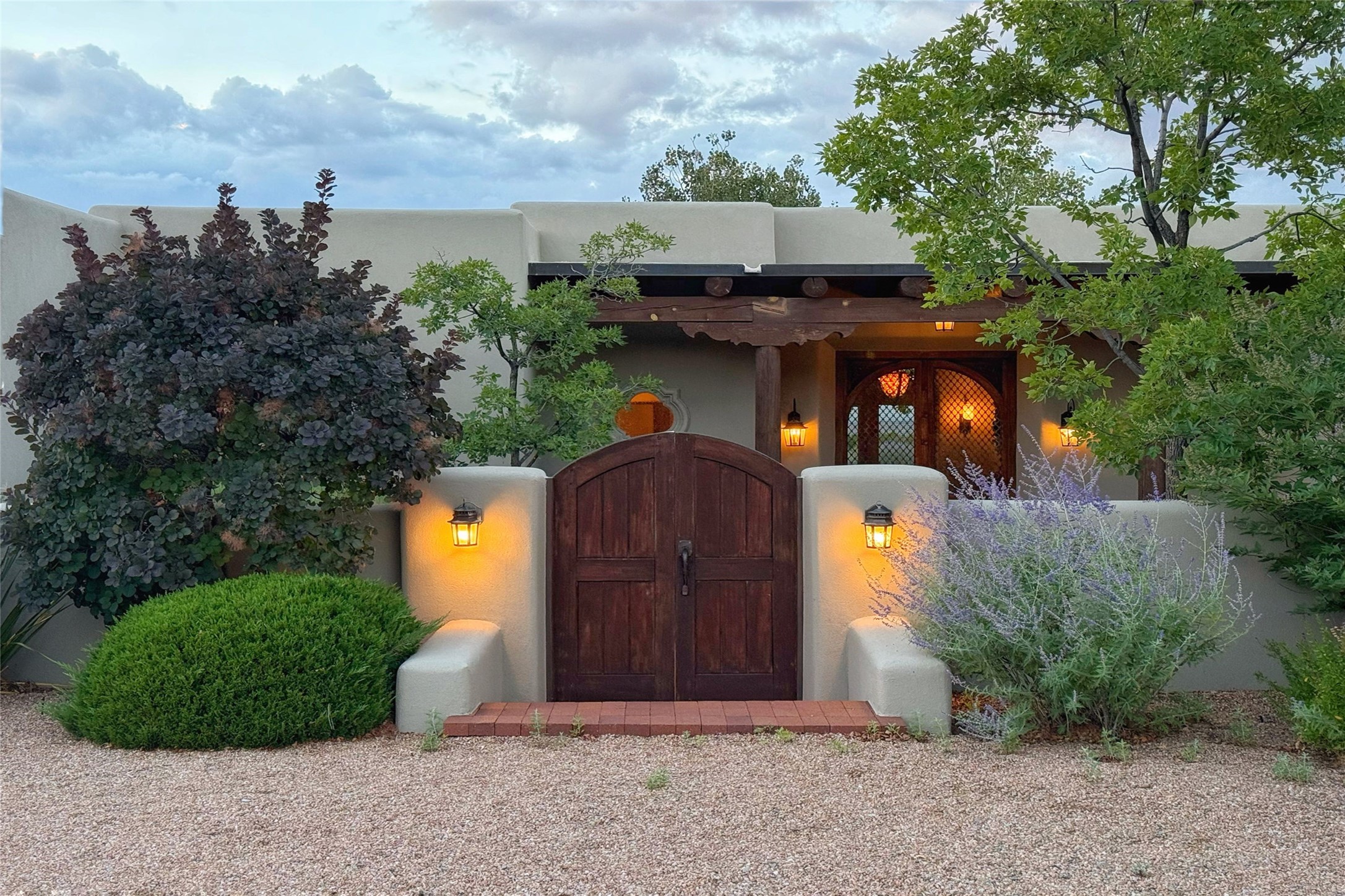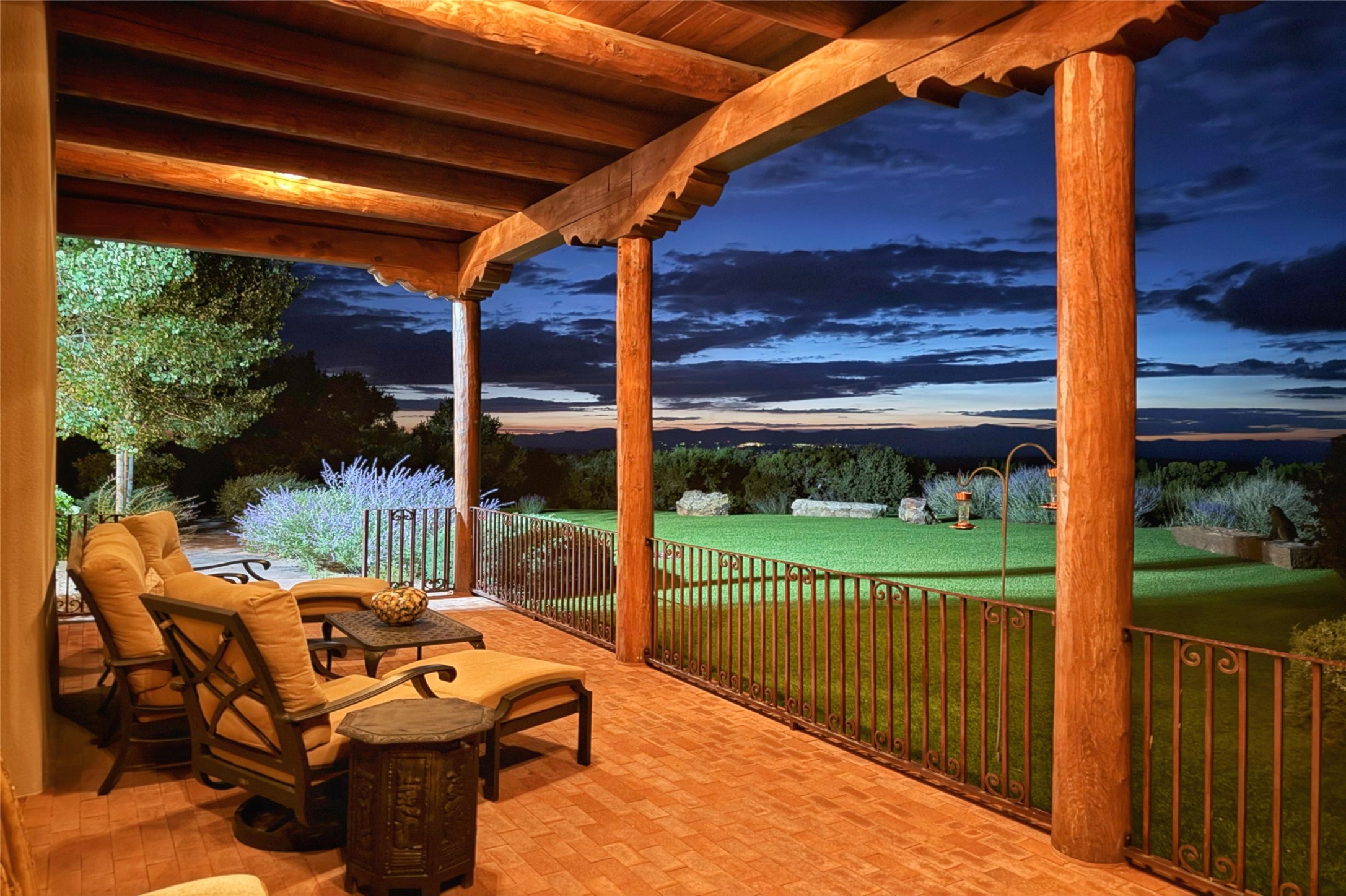 Welcome to Casa de Vistas Infinitas, a stunning home that beautifully blends rustic elegance with timeless Santa Fe charm. Set in a peaceful location with full sweeping views covering the Jemez mountains to the west, the badlands to the north, and Sangre de Cristo mountains to the east, this residence by Sharron Woods captures the absolute best of Northern New Mexico living. With diamond plaster finishes, and Italian travertine floors, every detail speaks to quality and enduring craftsmanship. Enter through double wood carved doors by Seret and Son into a foyer that sets the tone with views of the back garden and mountain ranges that stretch for miles. The living room is a showcase of light and views, with large windows framing Sangre mountain sunrise vistas, a carved stone fireplace, and adjoining eastern-facing portal featuring an outdoor wood burning kiva and a built-in grill.The spacious kitchen is both functional and inspiring, featuring custom cabinetry, leather finish "Cosmos" granite countertops, Wolf appliances and clerestory windows. The gas fireplace in adjoining breakfast-nook creates a warm and inviting gathering space. The primary suite is a true retreat. Enter through another set of beautifully carved wood doors, into a cozy space with a gas fireplace, and more breathtaking Sangre mountain views. The luxurious primary bath is finished in travertine, with more views from the soaking tub. A private office provides front courtyard access, while the guest suites offer tranquil back garden views and luxurious Michelangelo marble bathrooms. Outdoor living is designed for year-round enjoyment. From the serene courtyard entry to the wrap around portal and back garden dotted with Aspens that overlooks endless mountain rangesThoughtfully designed and impeccably finished, this home is more than a residence--it is a sanctuary offering privacy, beauty, and elegance just minutes from the heart of Santa Fe.