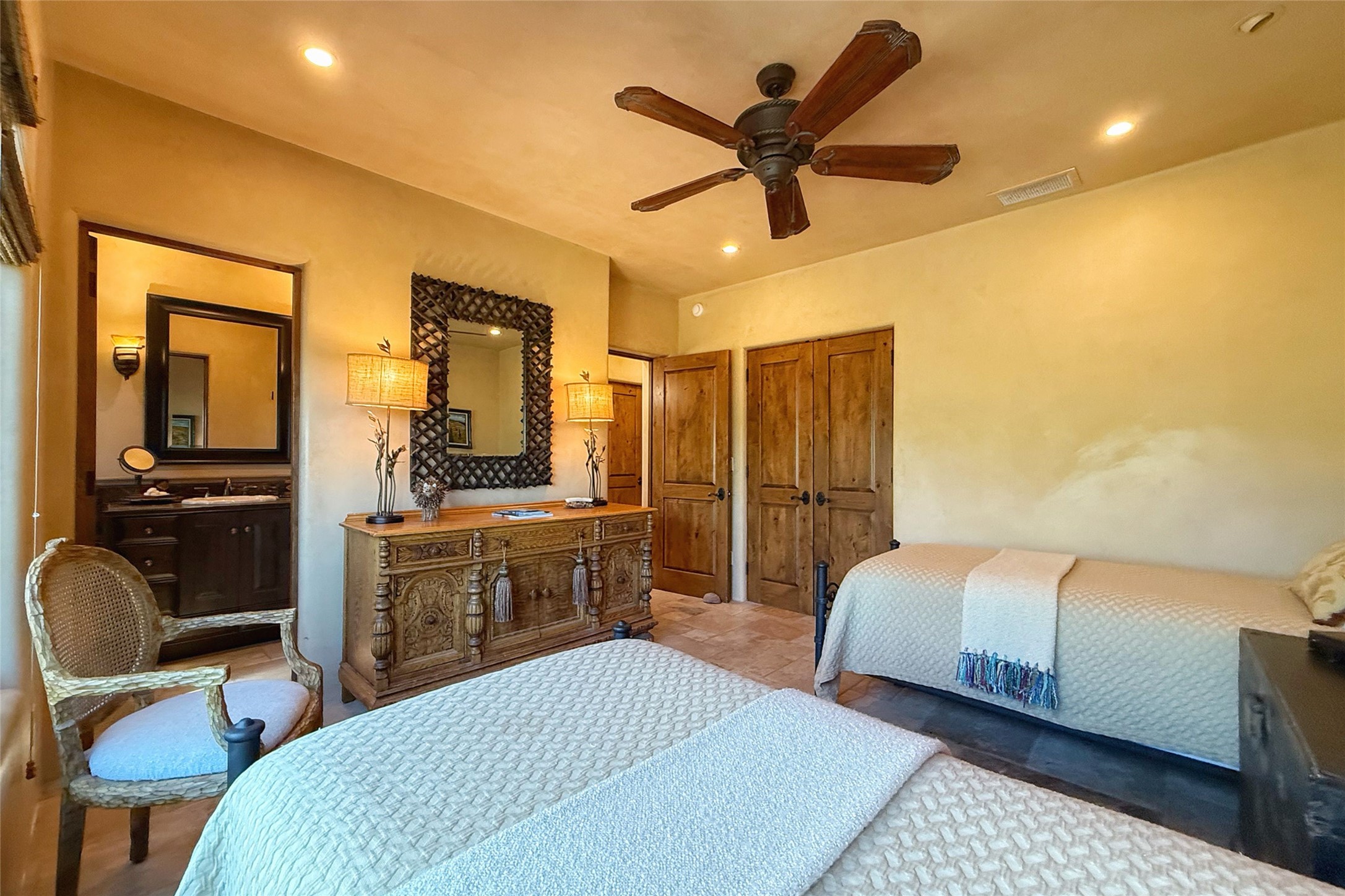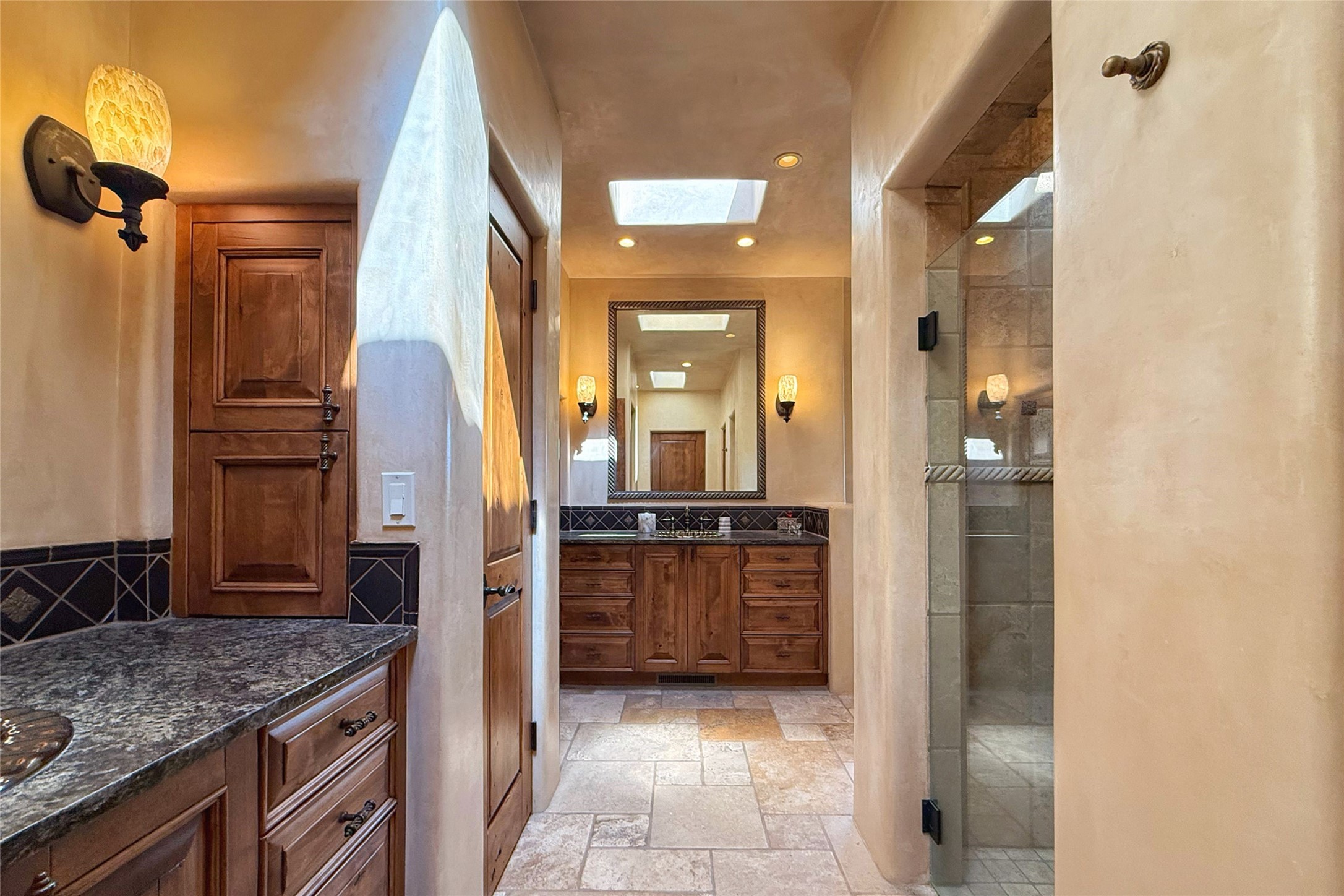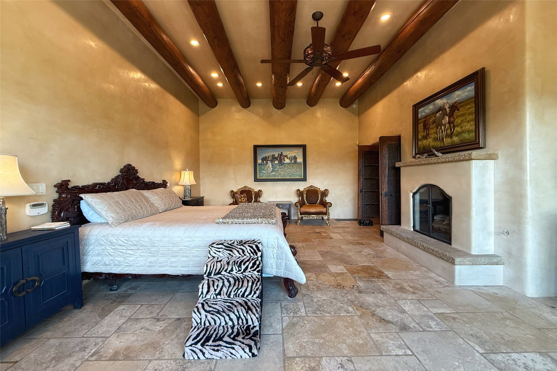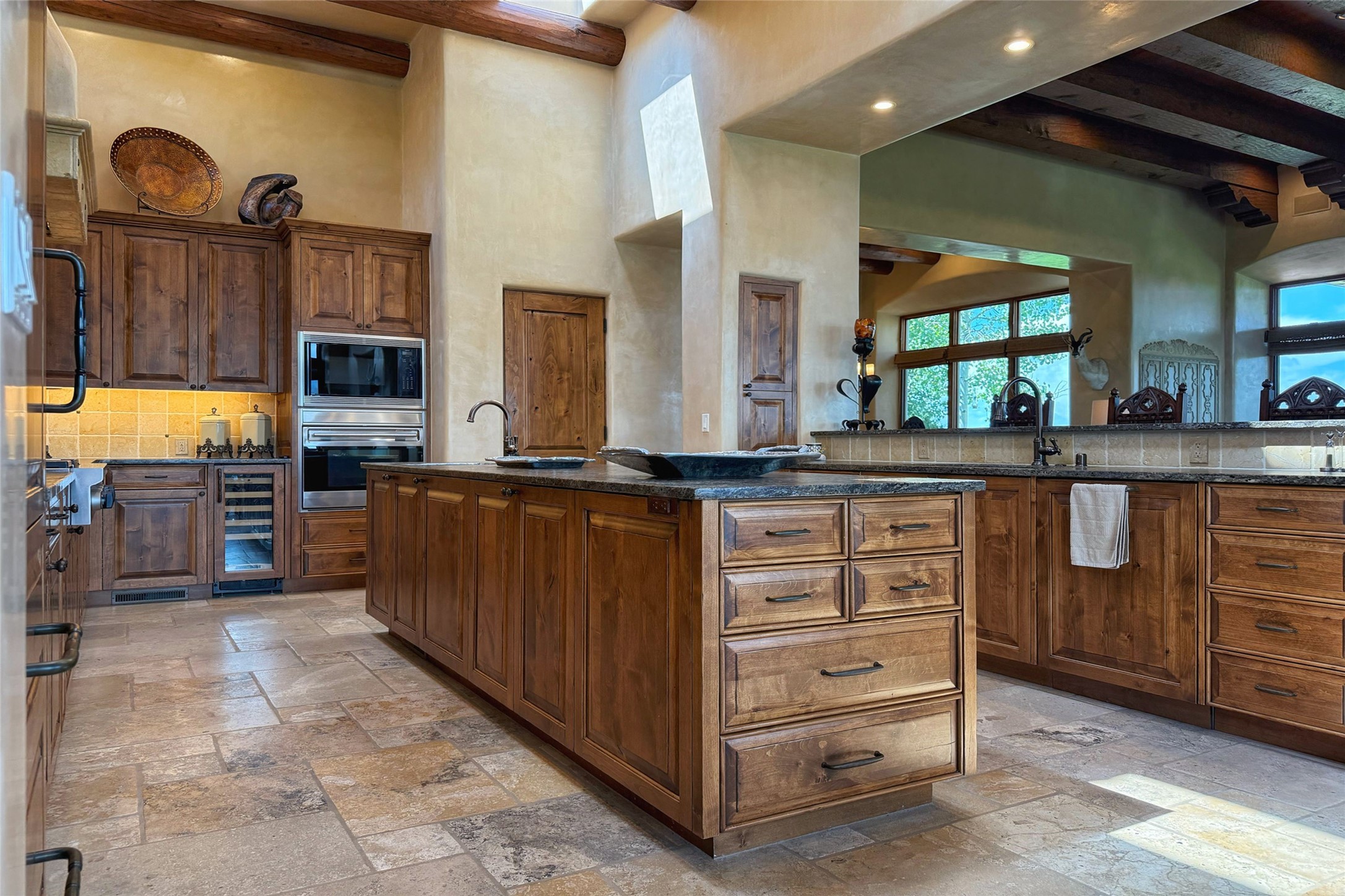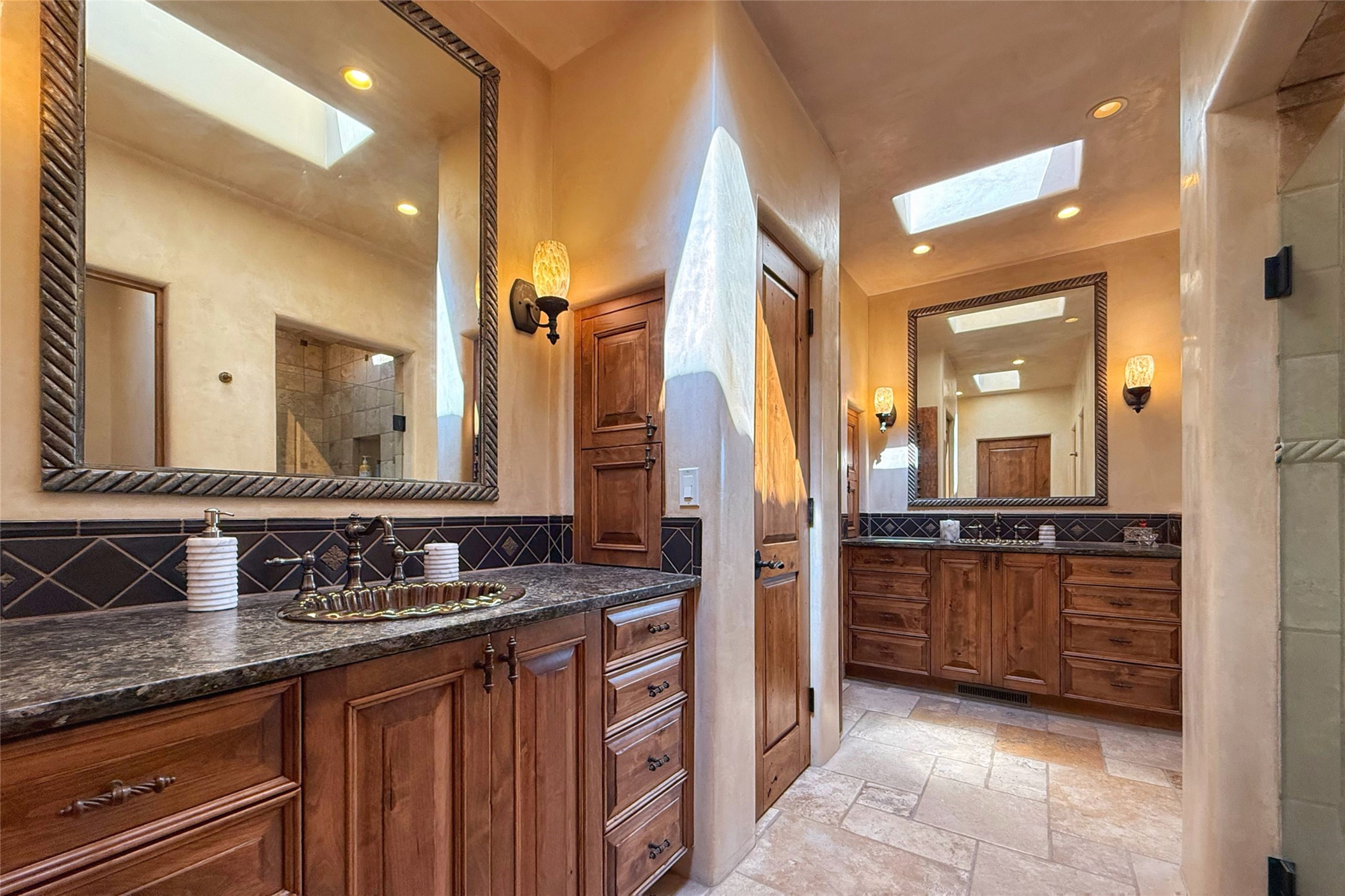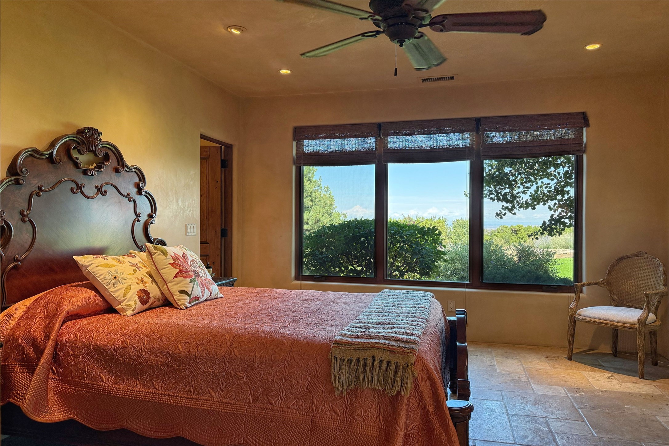 Welcome to Casa de Vistas Infinitas, a stunning home that beautifully blends rustic elegance with timeless Santa Fe charm. Set in a peaceful location with full sweeping views covering the Jemez mountains to the west, the badlands to the north, and Sangre de Cristo mountains to the east, this residence by Sharron Woods captures the absolute best of Northern New Mexico living. With diamond plaster finishes, and Italian travertine floors, every detail speaks to quality and enduring craftsmanship. Enter through double wood carved doors by Seret and Son into a foyer that sets the tone with views of the back garden and mountain ranges that stretch for miles. The living room is a showcase of light and views, with large windows framing Sangre mountain sunrise vistas, a carved stone fireplace, and adjoining eastern-facing portal featuring an outdoor wood burning kiva and a built-in grill.The spacious kitchen is both functional and inspiring, featuring custom cabinetry, leather finish "Cosmos" granite countertops, Wolf appliances and clerestory windows. The gas fireplace in adjoining breakfast-nook creates a warm and inviting gathering space. The primary suite is a true retreat. Enter through another set of beautifully carved wood doors, into a cozy space with a gas fireplace, and more breathtaking Sangre mountain views. The luxurious primary bath is finished in travertine, with more views from the soaking tub. A private office provides front courtyard access, while the guest suites offer tranquil back garden views and luxurious Michelangelo marble bathrooms. Outdoor living is designed for year-round enjoyment. From the serene courtyard entry to the wrap around portal and back garden dotted with Aspens that overlooks endless mountain rangesThoughtfully designed and impeccably finished, this home is more than a residence--it is a sanctuary offering privacy, beauty, and elegance just minutes from the heart of Santa Fe.