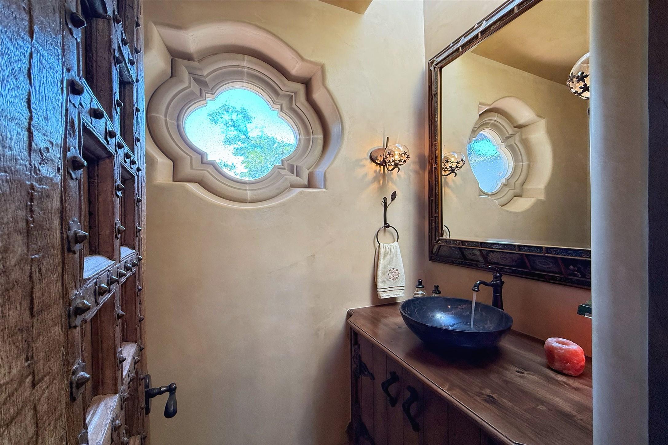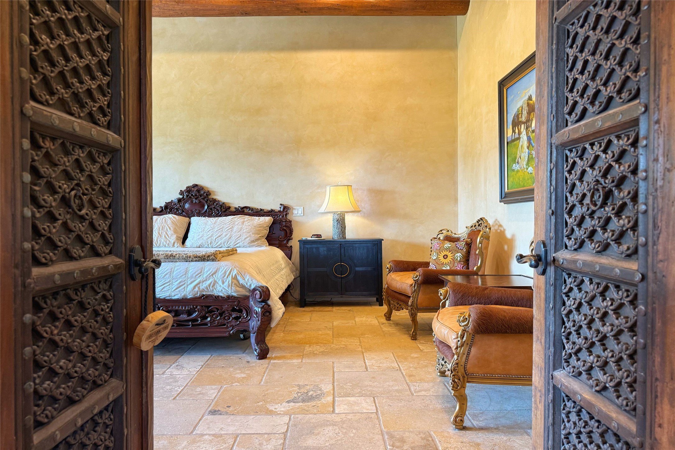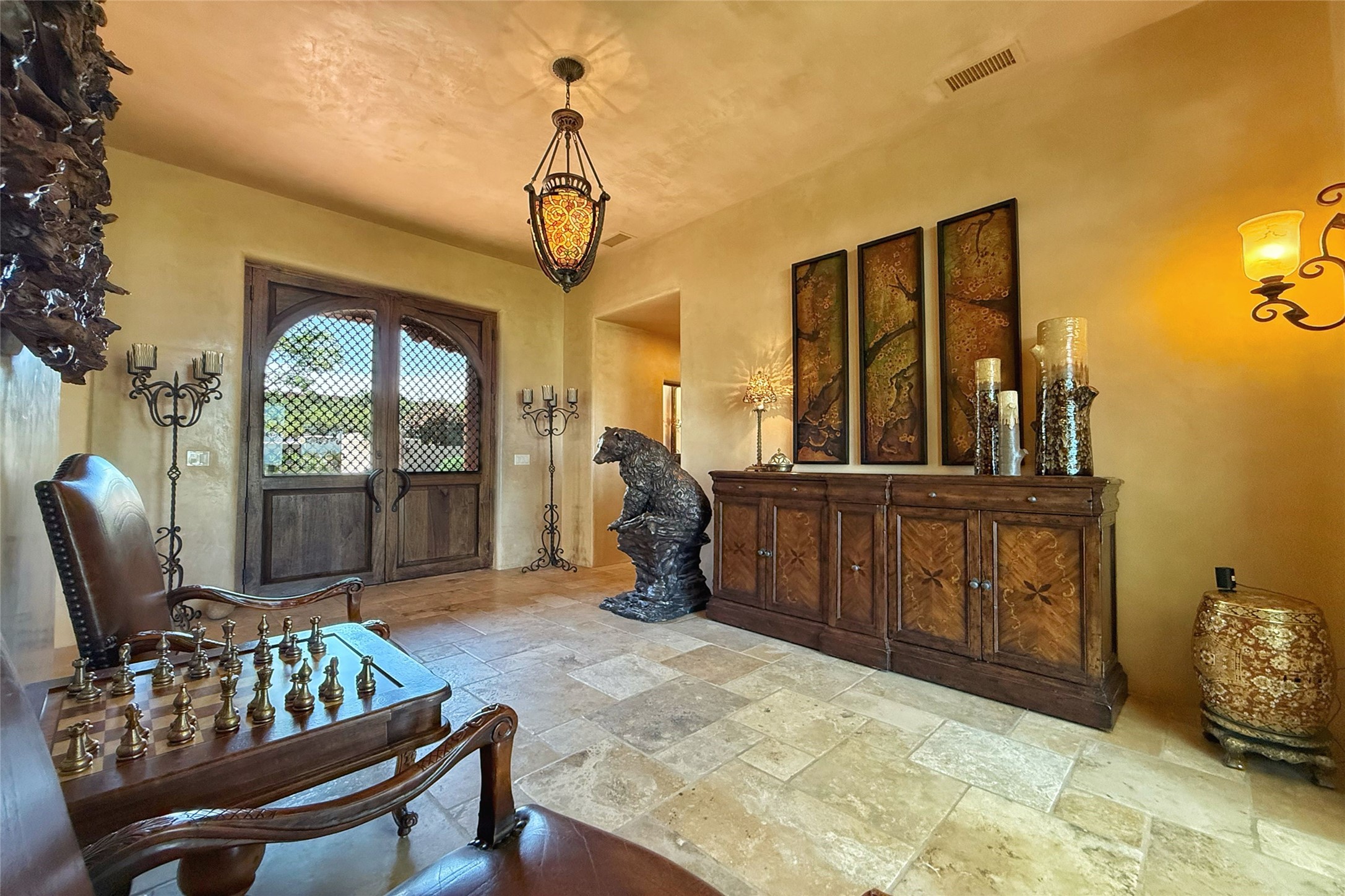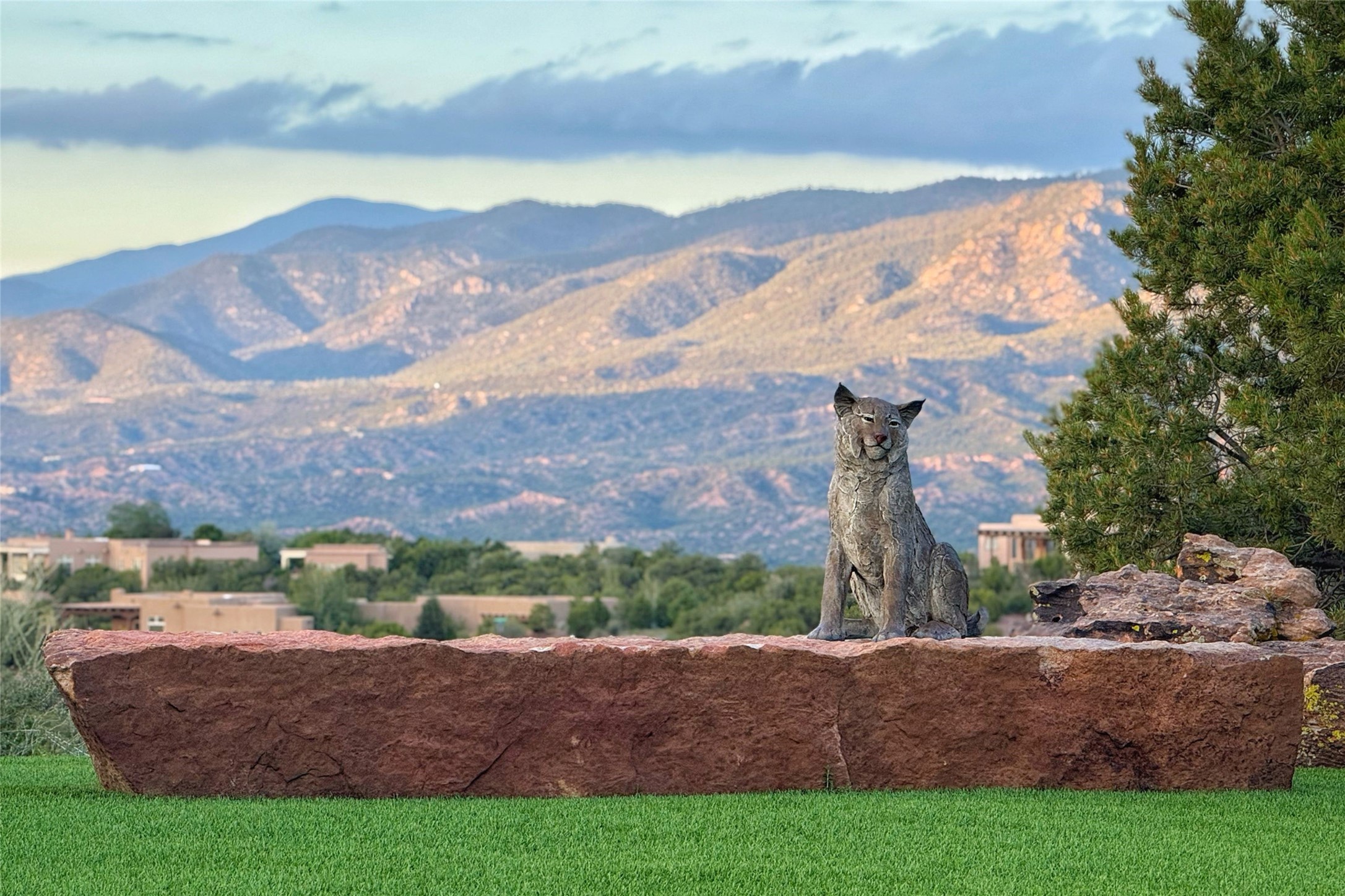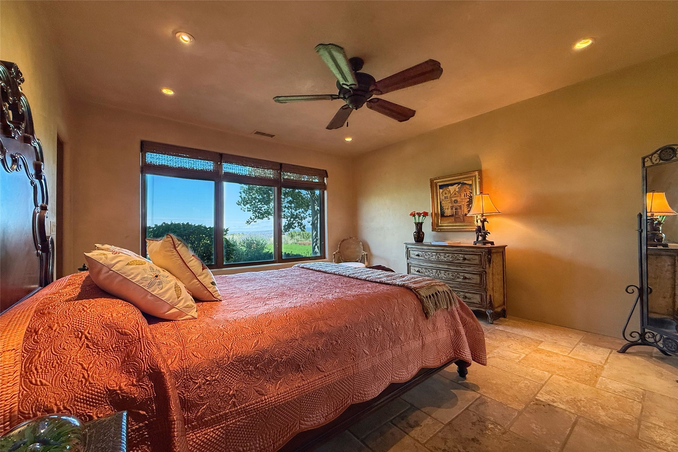 Welcome to Casa de Vistas Infinitas, a stunning home that beautifully blends rustic elegance with timeless Santa Fe charm. Set in a peaceful location with full sweeping views covering the Jemez mountains to the west, the badlands to the north, and Sangre de Cristo mountains to the east, this residence by Sharron Woods captures the absolute best of Northern New Mexico living. With diamond plaster finishes, and Italian travertine floors, every detail speaks to quality and enduring craftsmanship. Enter through double wood carved doors by Seret and Son into a foyer that sets the tone with views of the back garden and mountain ranges that stretch for miles. The living room is a showcase of light and views, with large windows framing Sangre mountain sunrise vistas, a carved stone fireplace, and adjoining eastern-facing portal featuring an outdoor wood burning kiva and a built-in grill.The spacious kitchen is both functional and inspiring, featuring custom cabinetry, leather finish "Cosmos" granite countertops, Wolf appliances and clerestory windows. The gas fireplace in adjoining breakfast-nook creates a warm and inviting gathering space. The primary suite is a true retreat. Enter through another set of beautifully carved wood doors, into a cozy space with a gas fireplace, and more breathtaking Sangre mountain views. The luxurious primary bath is finished in travertine, with more views from the soaking tub. A private office provides front courtyard access, while the guest suites offer tranquil back garden views and luxurious Michelangelo marble bathrooms. Outdoor living is designed for year-round enjoyment. From the serene courtyard entry to the wrap around portal and back garden dotted with Aspens that overlooks endless mountain rangesThoughtfully designed and impeccably finished, this home is more than a residence--it is a sanctuary offering privacy, beauty, and elegance just minutes from the heart of Santa Fe.
