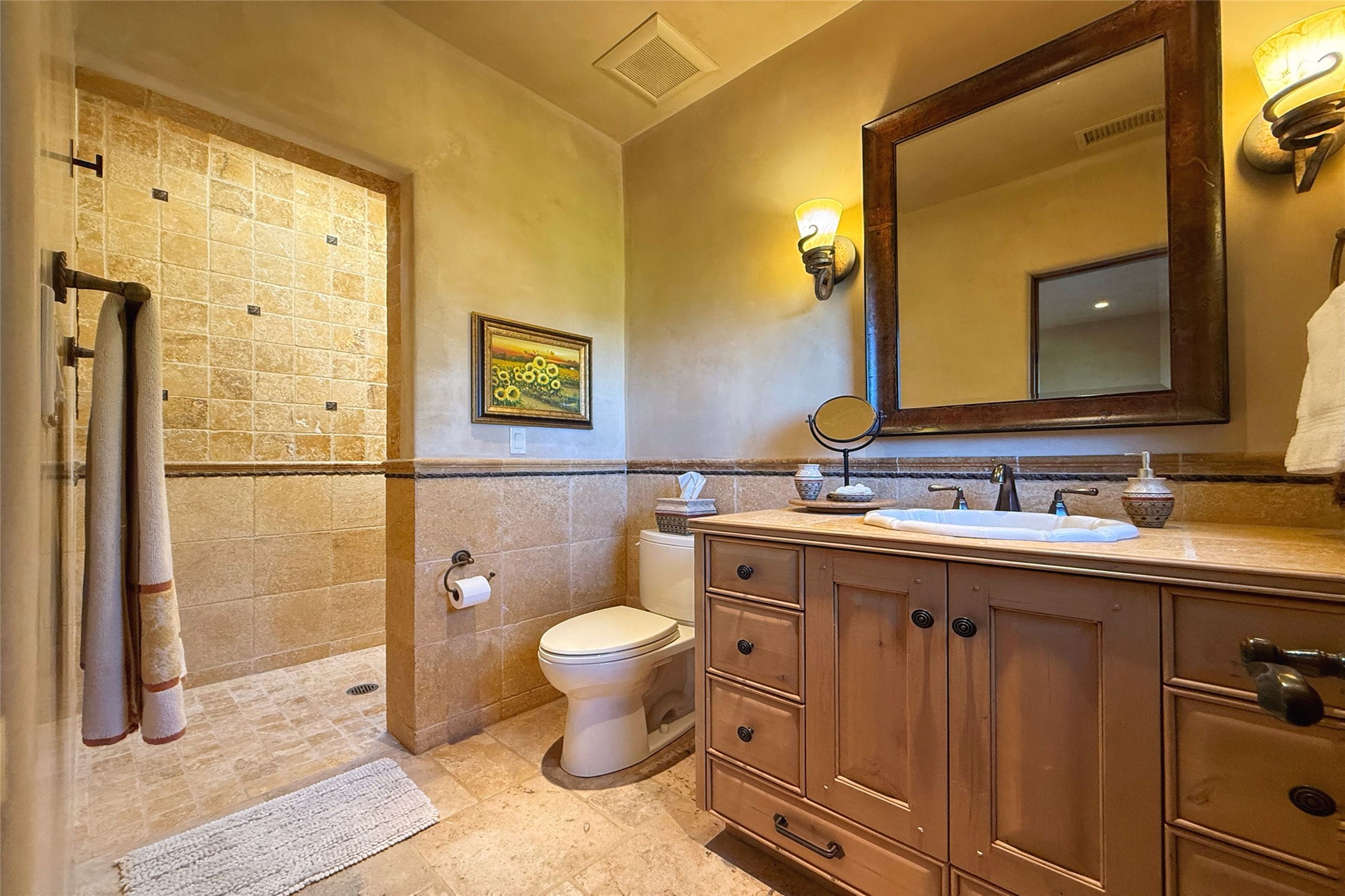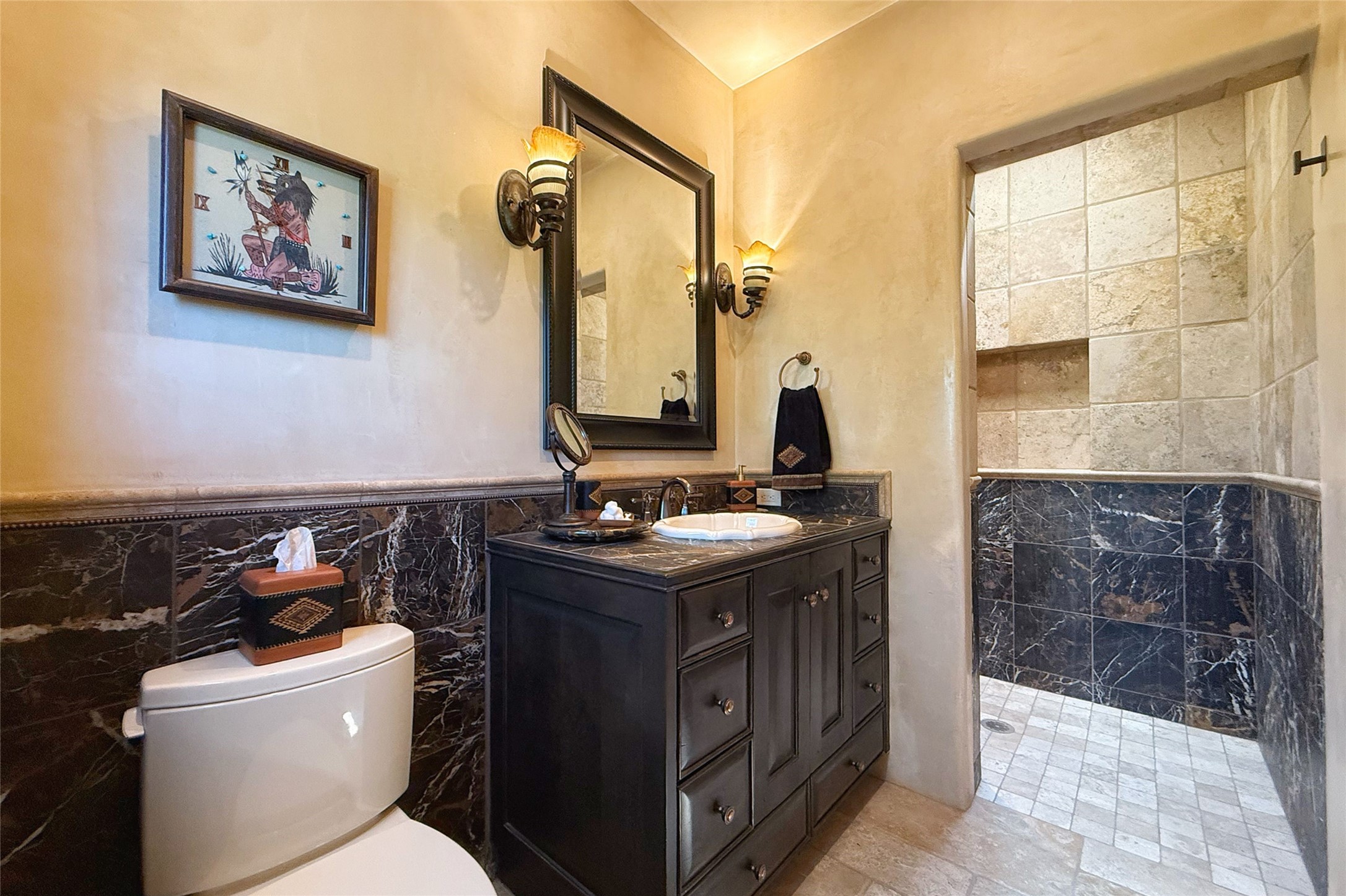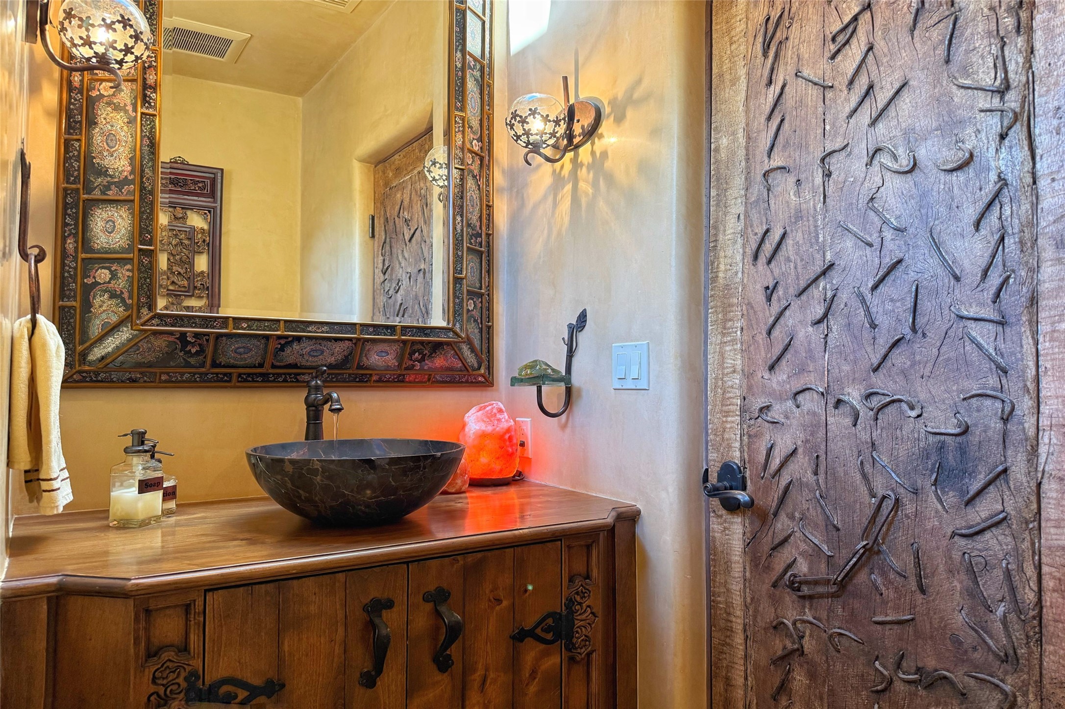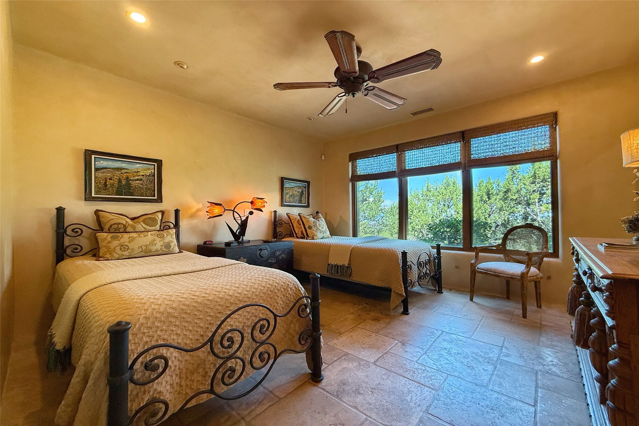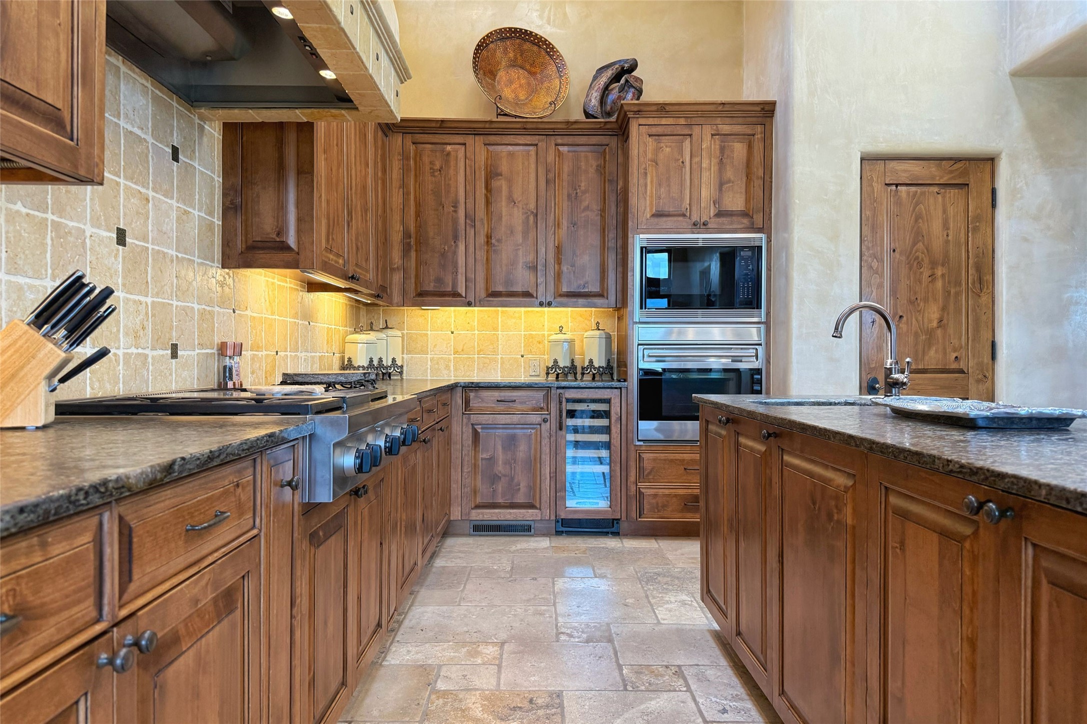 Welcome to Casa de Vistas Infinitas, a stunning home that beautifully blends rustic elegance with timeless Santa Fe charm. Set in a peaceful location with full sweeping views covering the Jemez mountains to the west, the badlands to the north, and Sangre de Cristo mountains to the east, this residence by Sharron Woods captures the absolute best of Northern New Mexico living. With diamond plaster finishes, and Italian travertine floors, every detail speaks to quality and enduring craftsmanship. Enter through double wood carved doors by Seret and Son into a foyer that sets the tone with views of the back garden and mountain ranges that stretch for miles. The living room is a showcase of light and views, with large windows framing Sangre mountain sunrise vistas, a carved stone fireplace, and adjoining eastern-facing portal featuring an outdoor wood burning kiva and a built-in grill.The spacious kitchen is both functional and inspiring, featuring custom cabinetry, leather finish "Cosmos" granite countertops, Wolf appliances and clerestory windows. The gas fireplace in adjoining breakfast-nook creates a warm and inviting gathering space. The primary suite is a true retreat. Enter through another set of beautifully carved wood doors, into a cozy space with a gas fireplace, and more breathtaking Sangre mountain views. The luxurious primary bath is finished in travertine, with more views from the soaking tub. A private office provides front courtyard access, while the guest suites offer tranquil back garden views and luxurious Michelangelo marble bathrooms. Outdoor living is designed for year-round enjoyment. From the serene courtyard entry to the wrap around portal and back garden dotted with Aspens that overlooks endless mountain rangesThoughtfully designed and impeccably finished, this home is more than a residence--it is a sanctuary offering privacy, beauty, and elegance just minutes from the heart of Santa Fe.