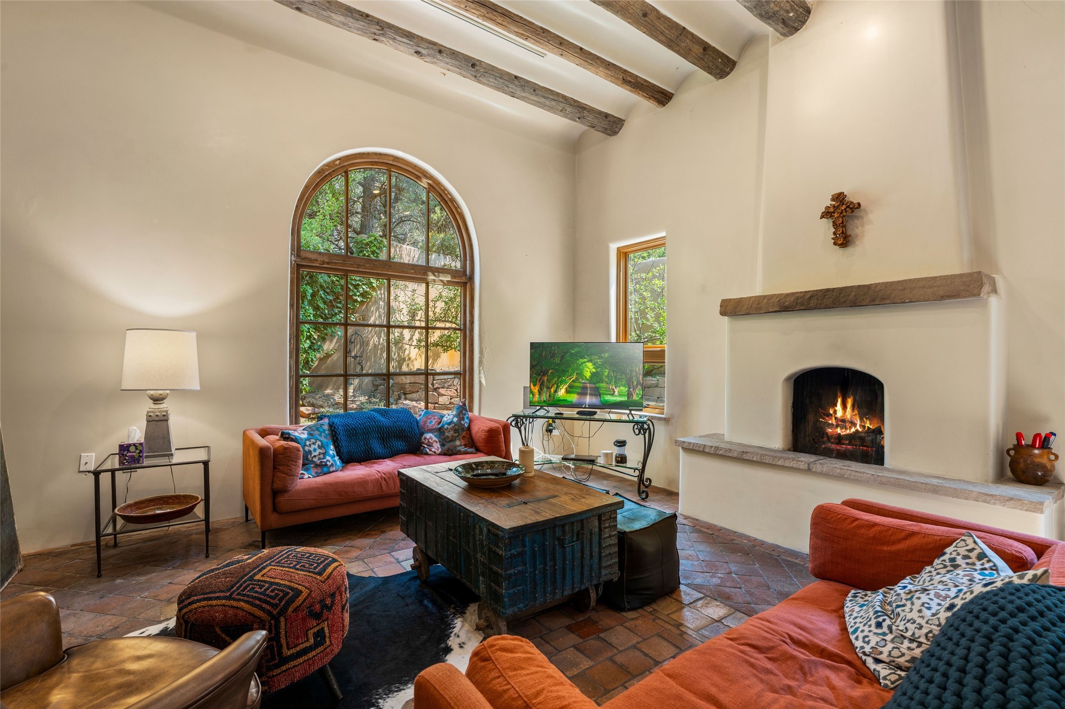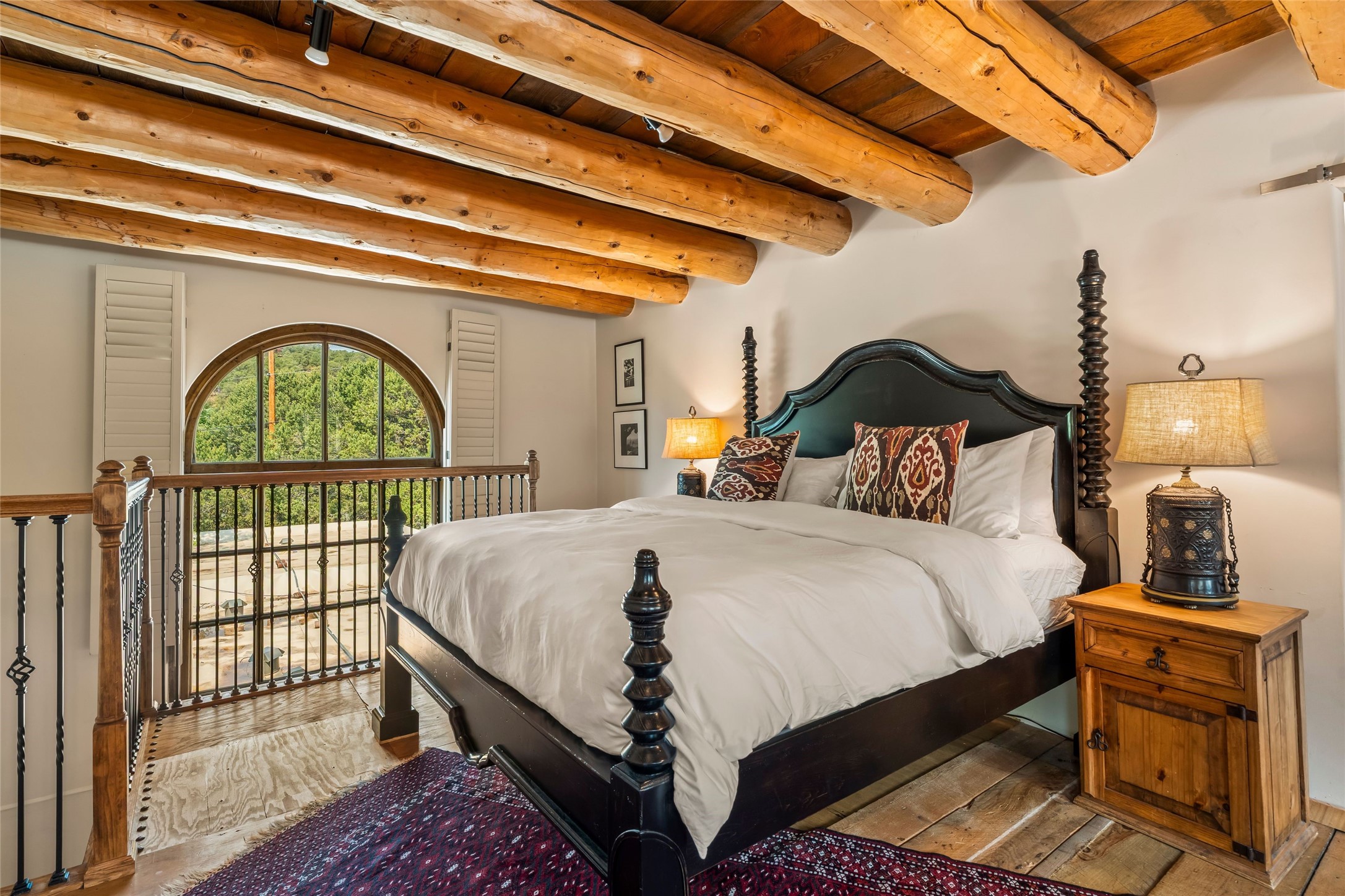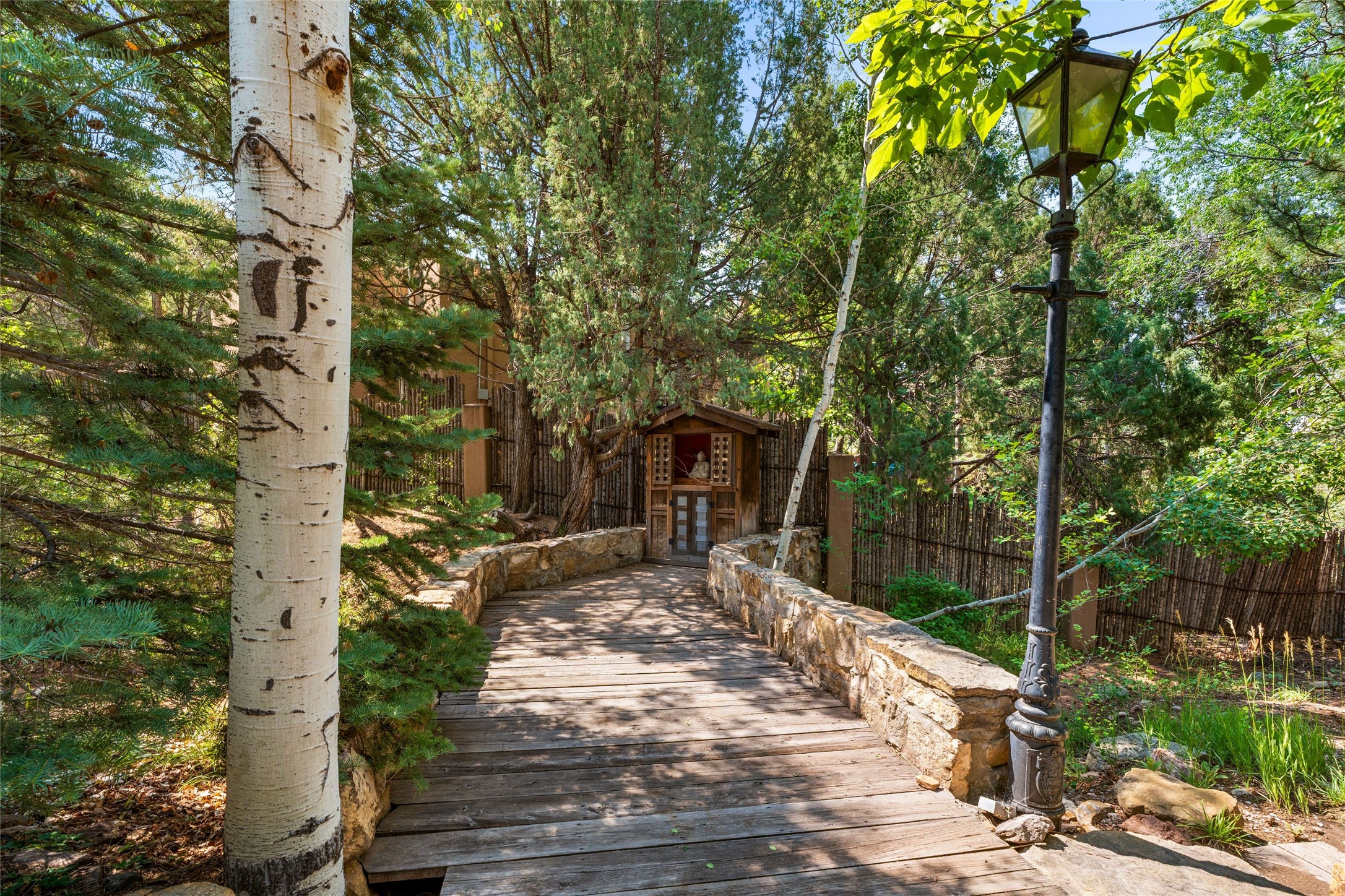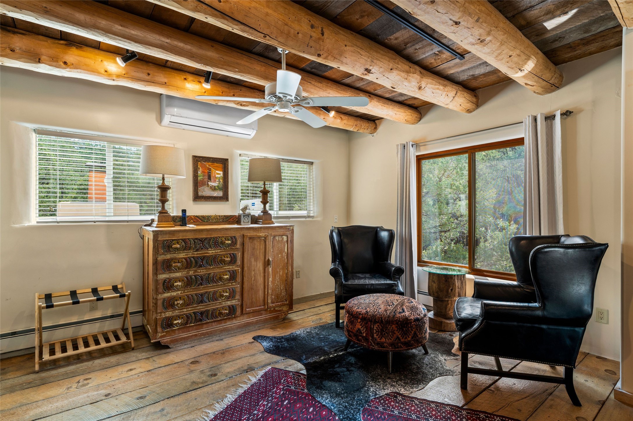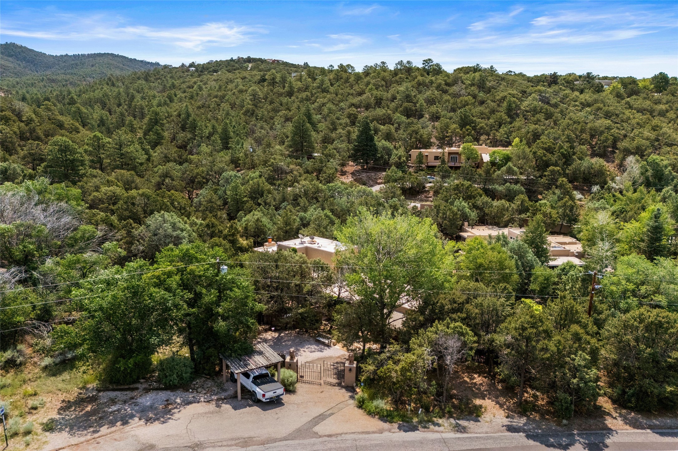 Exquisite 3-bedroom, 3.5-bath vacation rental or primary home and guest house. Excellent on Hyde Park Road situated in a tranquil, gated forest setting, just 10 miles from the Santa Fe Ski Basin. Additionally, the world-famous Ten Thousand Waves spa is right across the road, providing a serene escape for relaxation and rejuvenation. Elegantly designed property featuring imported floor tiles and windows from France. The layout is thoughtfully divided by a foyer, creating the unique opportunity for single family, live/work property or dual living spaces--perfect for families, guests, creative types, or even rental opportunities. The main house has a large living room with stately fireplace, dining room, kitchen, and two bedrooms including one upstairs. The attached guesthouse has a living room, dining room and a generous-sized kitchen with sufficient space for a table for 4-6 and one luxury suite with a glam soaking tub in its bedroom. Recent upgrades enhance the home's appeal, including a new roof, new BBQs, and several new mini splits for comfort in every season. Multiple outdoor areas and portals invite you to enjoy the breathtaking surroundings, whether it's morning coffee on the patio or evening gatherings under the stars. Short drive to the historic Santa Fe Plaza or take public transportation right out your front door.