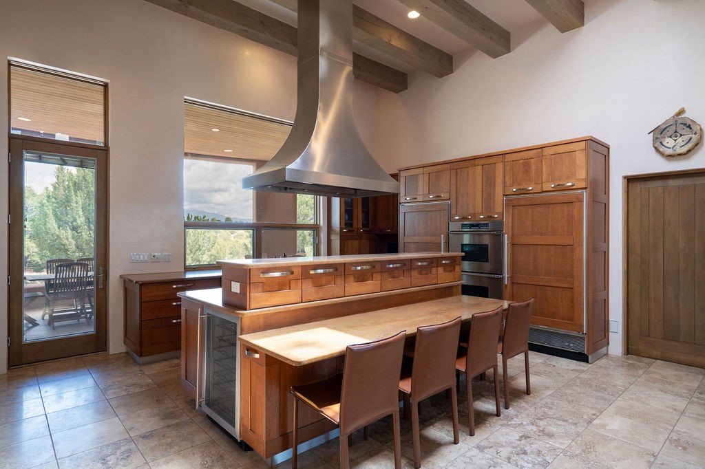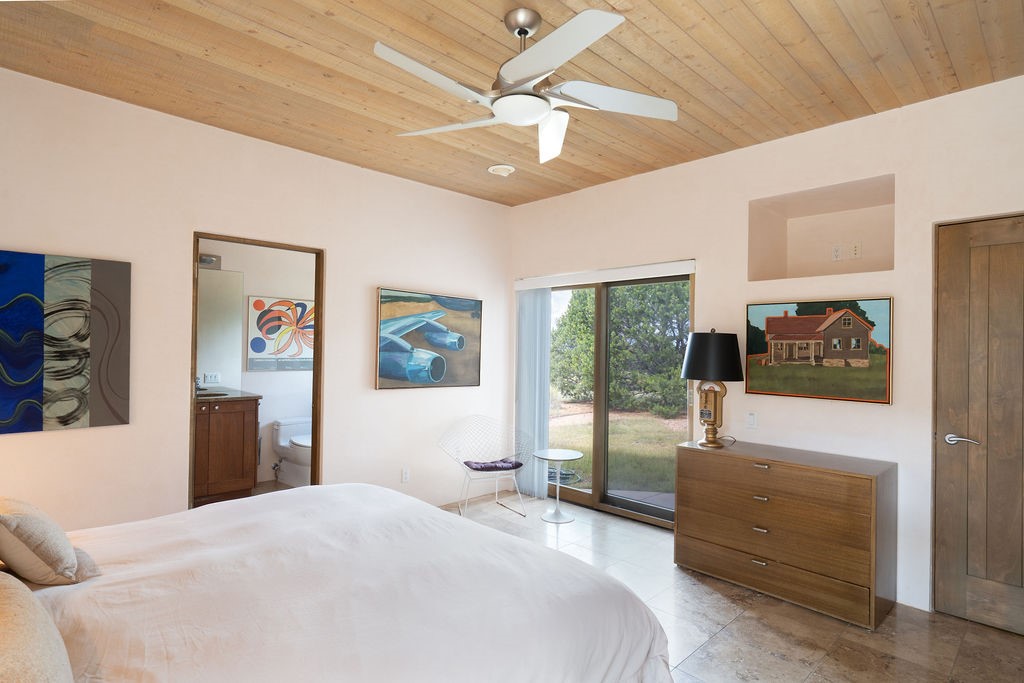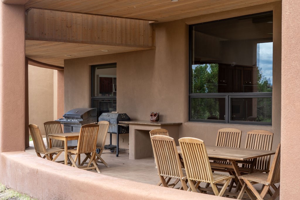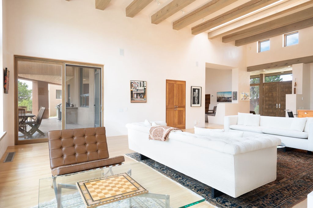 Step into this extraordinary Las Campanas residence where modern design and tranquility adjoin. Nestled on 2.3 acres, this 3-bedroom 3 bath home exemplifies sophistication and style. Upon entering, you are greeted by a dramatic gallery hall with luxurious stone water feature. The main room floods with natural light, highlighting an inviting open-concept floor plan. An expansive gourmet kitchen offers a well-designed central island and cozy sitting area, a footprint that is both spacious and comfortable. High-end appliances and design features throughout the home are accented by tall ceilings and clean lines. The primary bedroom features a fireplace, two expansive walk-in closets, and a luxury bathroom with dual vanities, soaking tub, and walk-in shower. The guest wing contains two spacious guest rooms, each with ensuite bath, providing exceptional comfort and privacy for visitors. Entertaining is effortless with a patio designed for outdoor dining and leisure, framed by courtyard walls with space to dine al fresco while taking in the tranquil surroundings. A spacious 3-car garage adds to the exceptional features of the home. Landscaping is in need of a refresh with an interior courtyard that offers tremendous potential. Seller's golf membership to the Club at Las Campanas is available to the purchaser of the property at an additional cost.