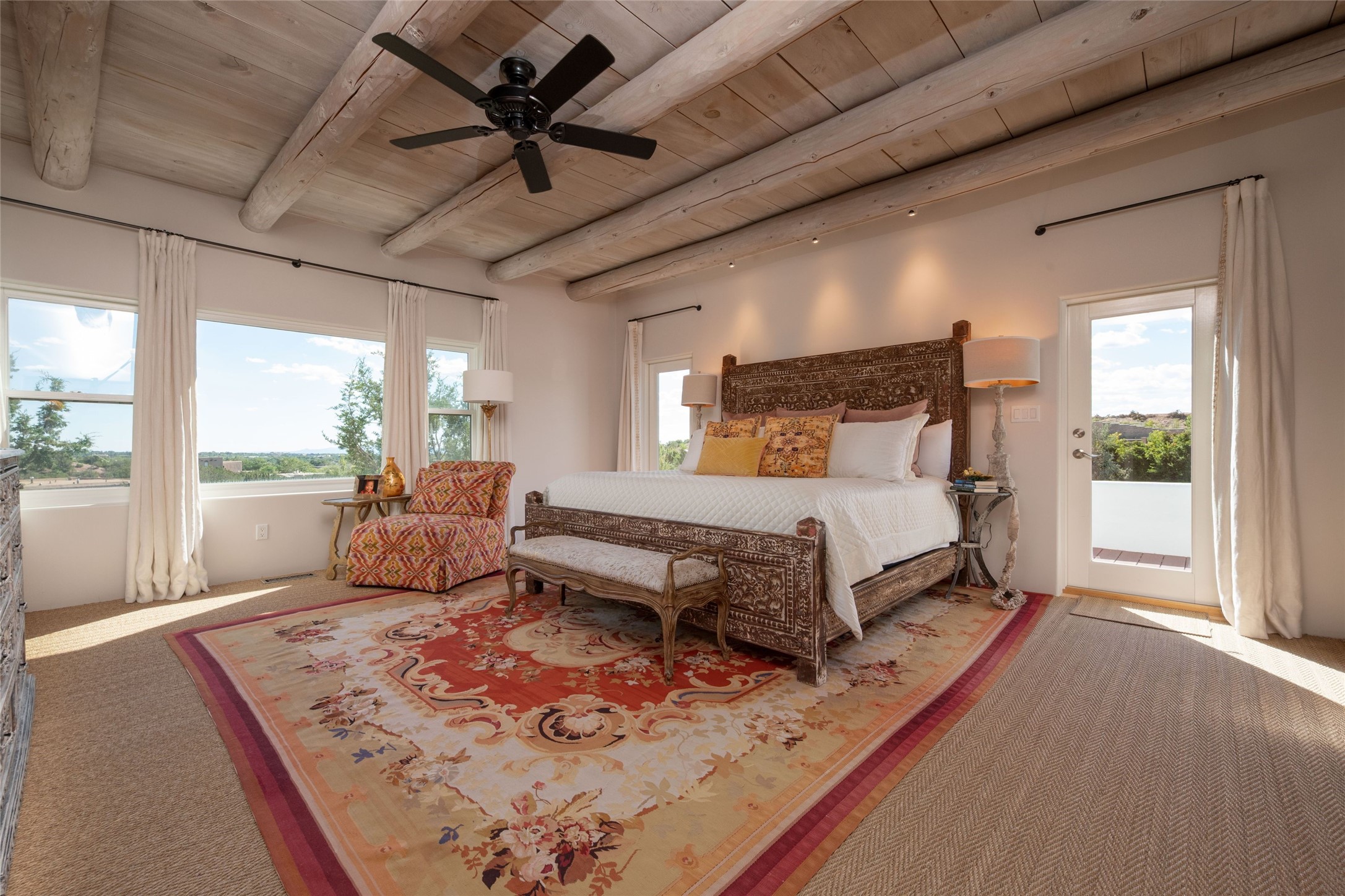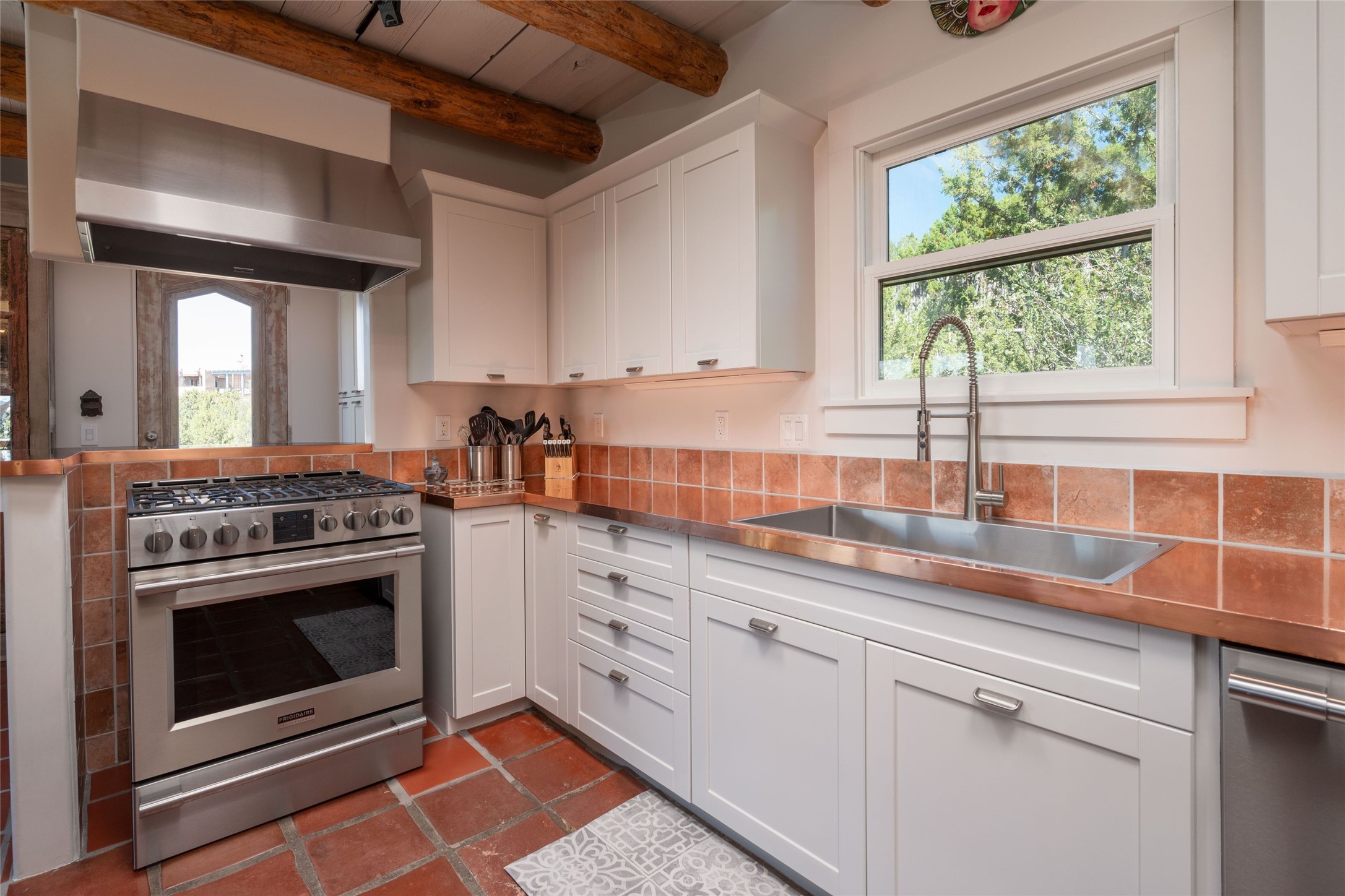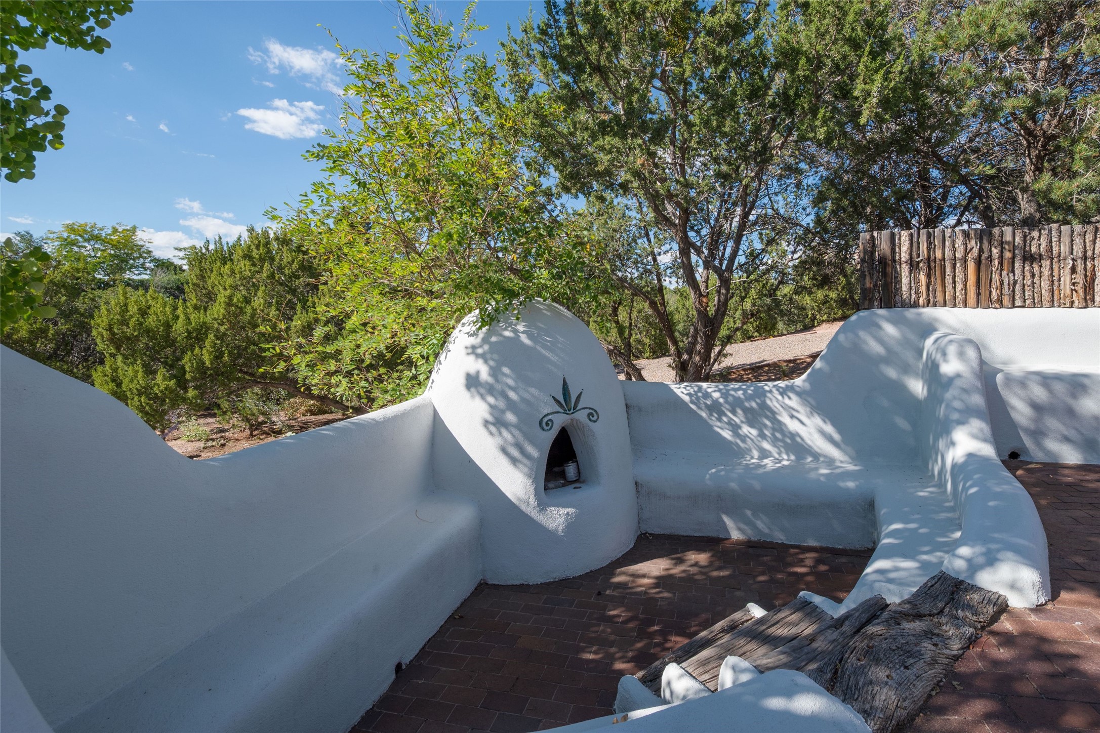 Located mere minutes from the Plaza at the end of the street on just over an acre with some sweet South and West views, this 4,250 sq ft 4 bedroom, 3 bath two story home is stylishly and tastefully updated and enjoys several outdoor living areas. Entering through wrought iron gates, the walled front courtyard has a corner kiva fireplace around which to sit and enjoy the evening, as well as the soothing sound of the big Mexican fountain. The front foyer has fun decorative tile floors, and this level also has a large family room with fireplace, big windows and French doors opening to the enclosed courtyard, laundry room and private guest room with a full bath. Up a grand staircase is the main living area, with a nice large living room with gorgeous fireplace, that is open to both the dining area and kitchen. The gourmet kitchen with copper countertops, gas cooking, wet bar and pizza oven is both functional and beautiful. A flagstone patio off the landing by the living room, enjoys a wonderful protected Southern exposure so as to enjoy the out of doors nearly year round! The primary bedroom is large and has a deck facing West for sunset skies, plenty of closet space, a luxurious bath with custom limestone sinks, big soaking tub and a separate shower. The other two bedrooms on this upper level are generously sized and share a full bath. Many custom architectural details and finishes; from custom fixtures and doors, to hardwood, sisal and tile floors. With plenty of guest parking, a two-car garage, AC and a furniture package if desired, this is a special home showing great pride of ownership and love.
