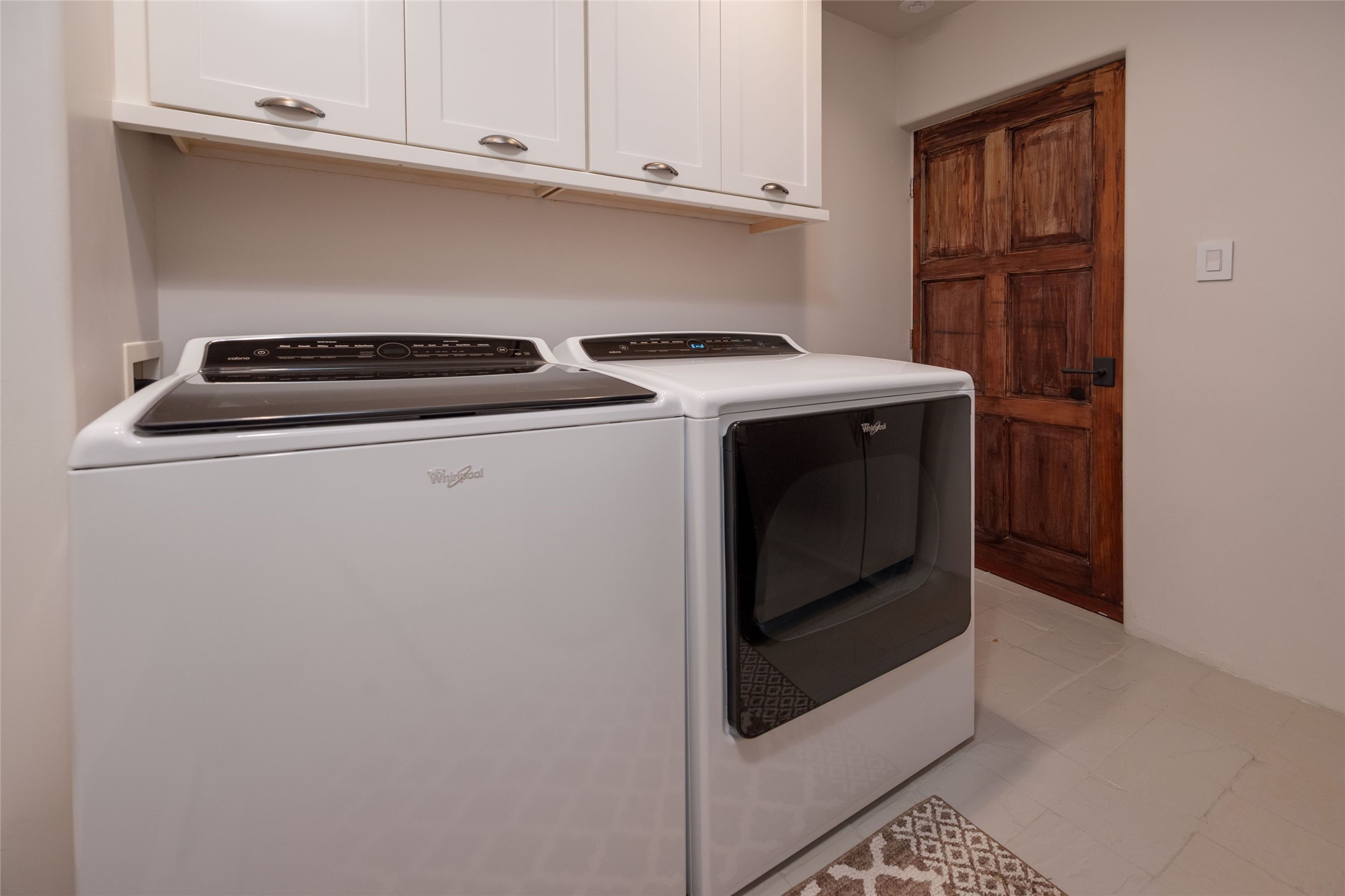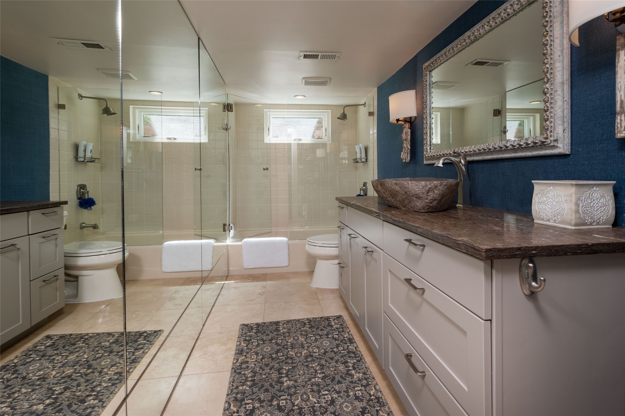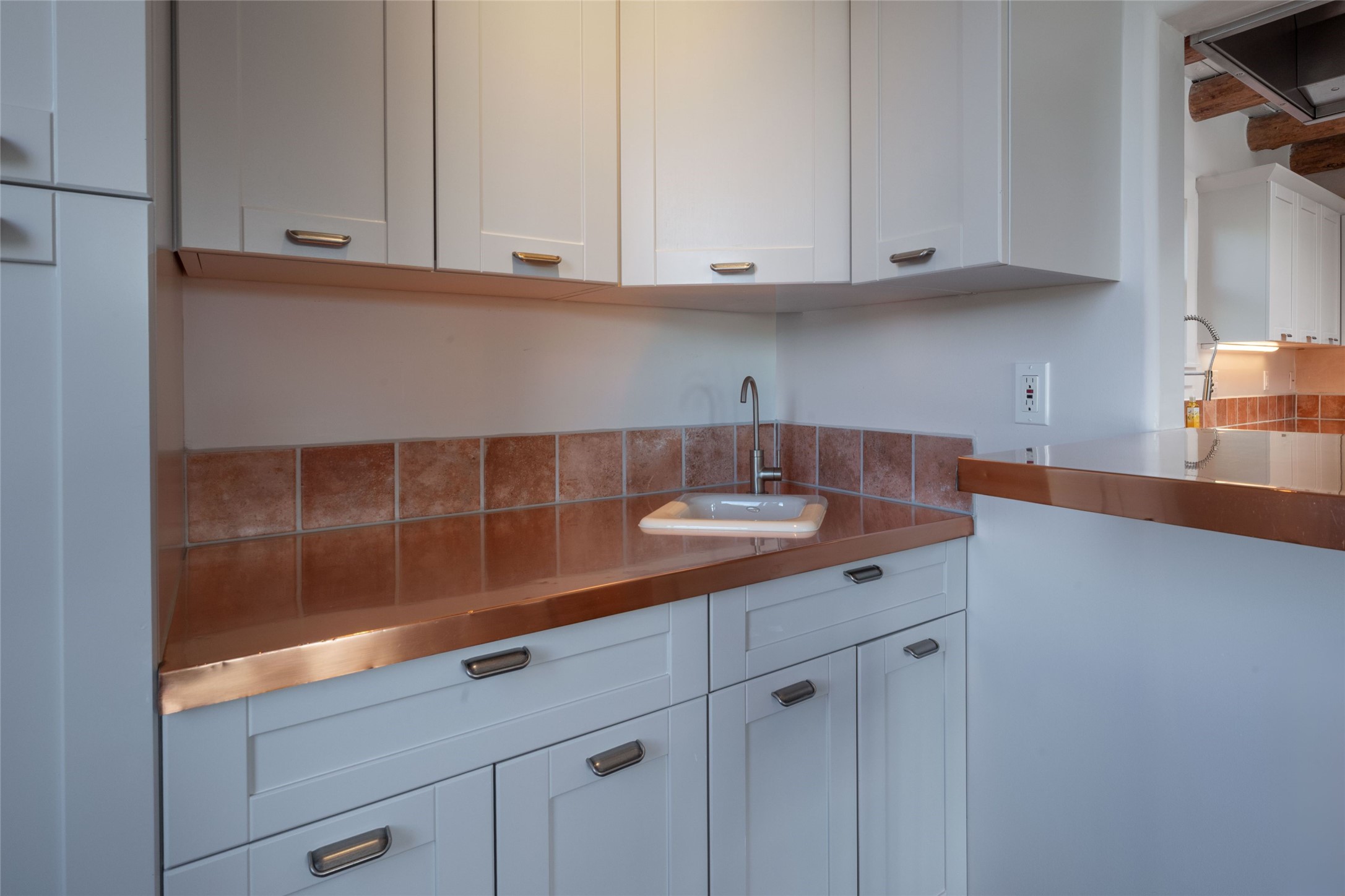 Located mere minutes from the Plaza at the end of the street on just over an acre with some sweet South and West views, this 4,250 sq ft 4 bedroom, 3 bath two story home is stylishly and tastefully updated and enjoys several outdoor living areas. Entering through wrought iron gates, the walled front courtyard has a corner kiva fireplace around which to sit and enjoy the evening, as well as the soothing sound of the big Mexican fountain. The front foyer has fun decorative tile floors, and this level also has a large family room with fireplace, big windows and French doors opening to the enclosed courtyard, laundry room and private guest room with a full bath. Up a grand staircase is the main living area, with a nice large living room with gorgeous fireplace, that is open to both the dining area and kitchen. The gourmet kitchen with copper countertops, gas cooking, wet bar and pizza oven is both functional and beautiful. A flagstone patio off the landing by the living room, enjoys a wonderful protected Southern exposure so as to enjoy the out of doors nearly year round! The primary bedroom is large and has a deck facing West for sunset skies, plenty of closet space, a luxurious bath with custom limestone sinks, big soaking tub and a separate shower. The other two bedrooms on this upper level are generously sized and share a full bath. Many custom architectural details and finishes; from custom fixtures and doors, to hardwood, sisal and tile floors. With plenty of guest parking, a two-car garage, AC and a furniture package if desired, this is a special home showing great pride of ownership and love.