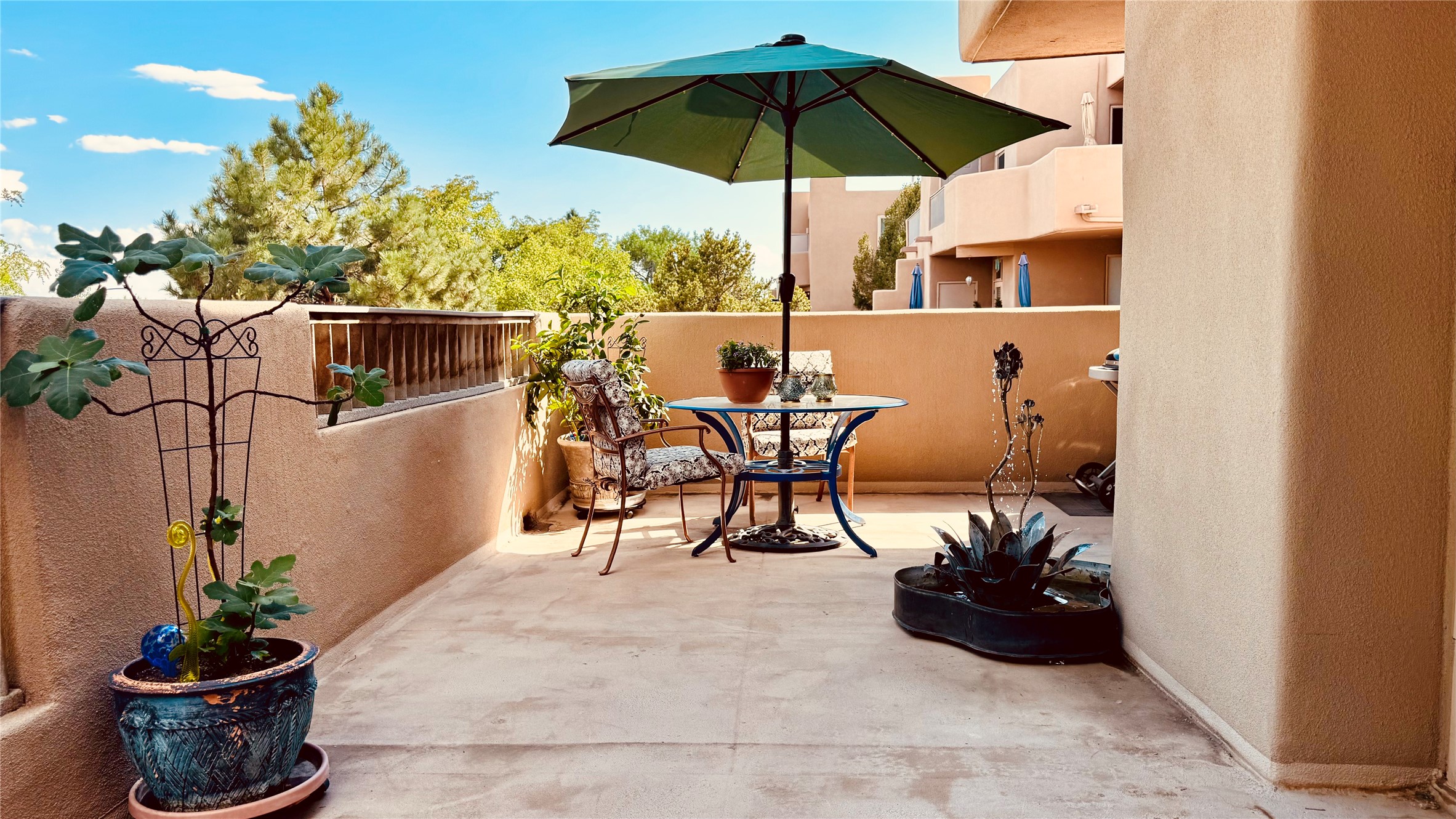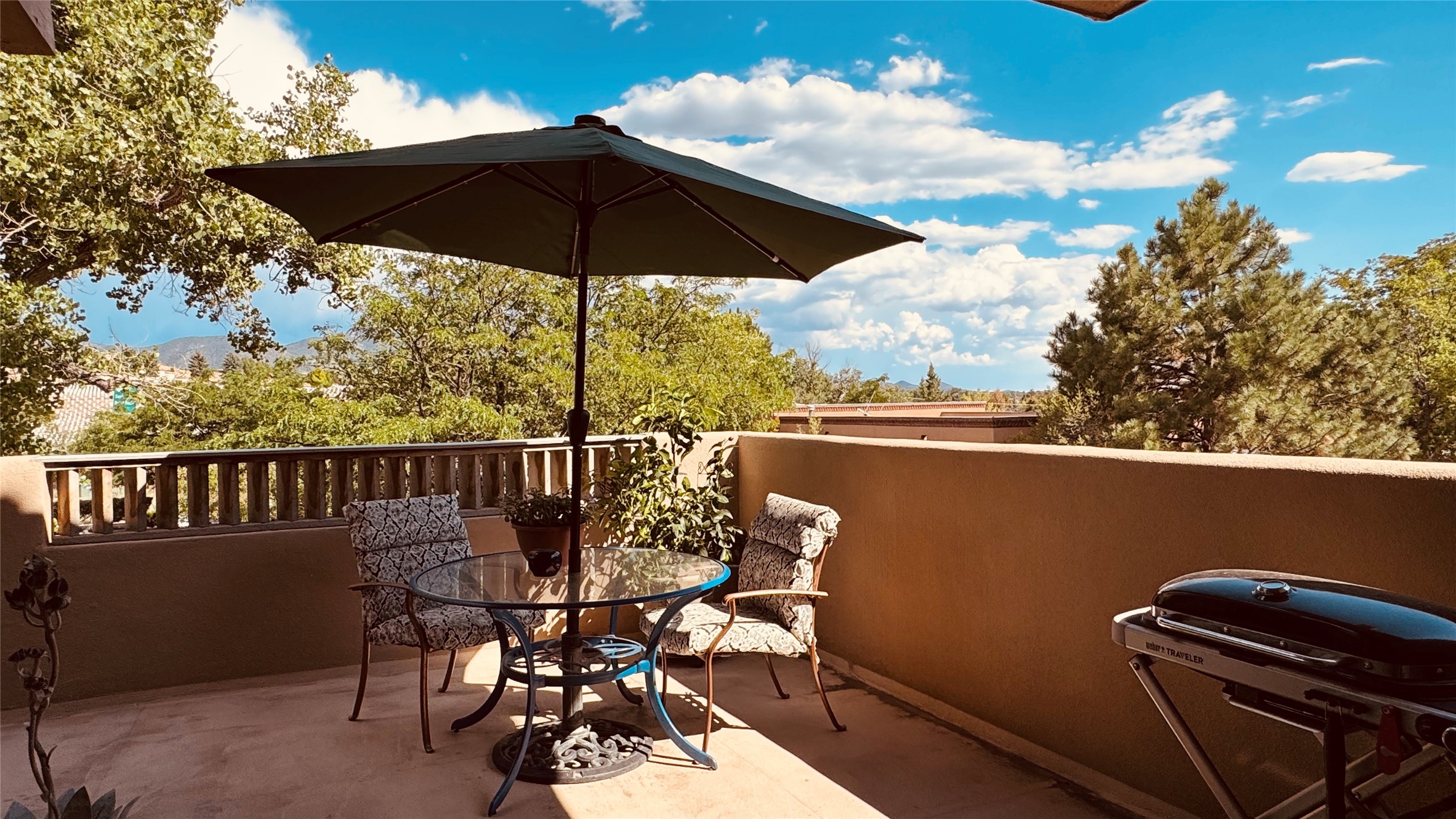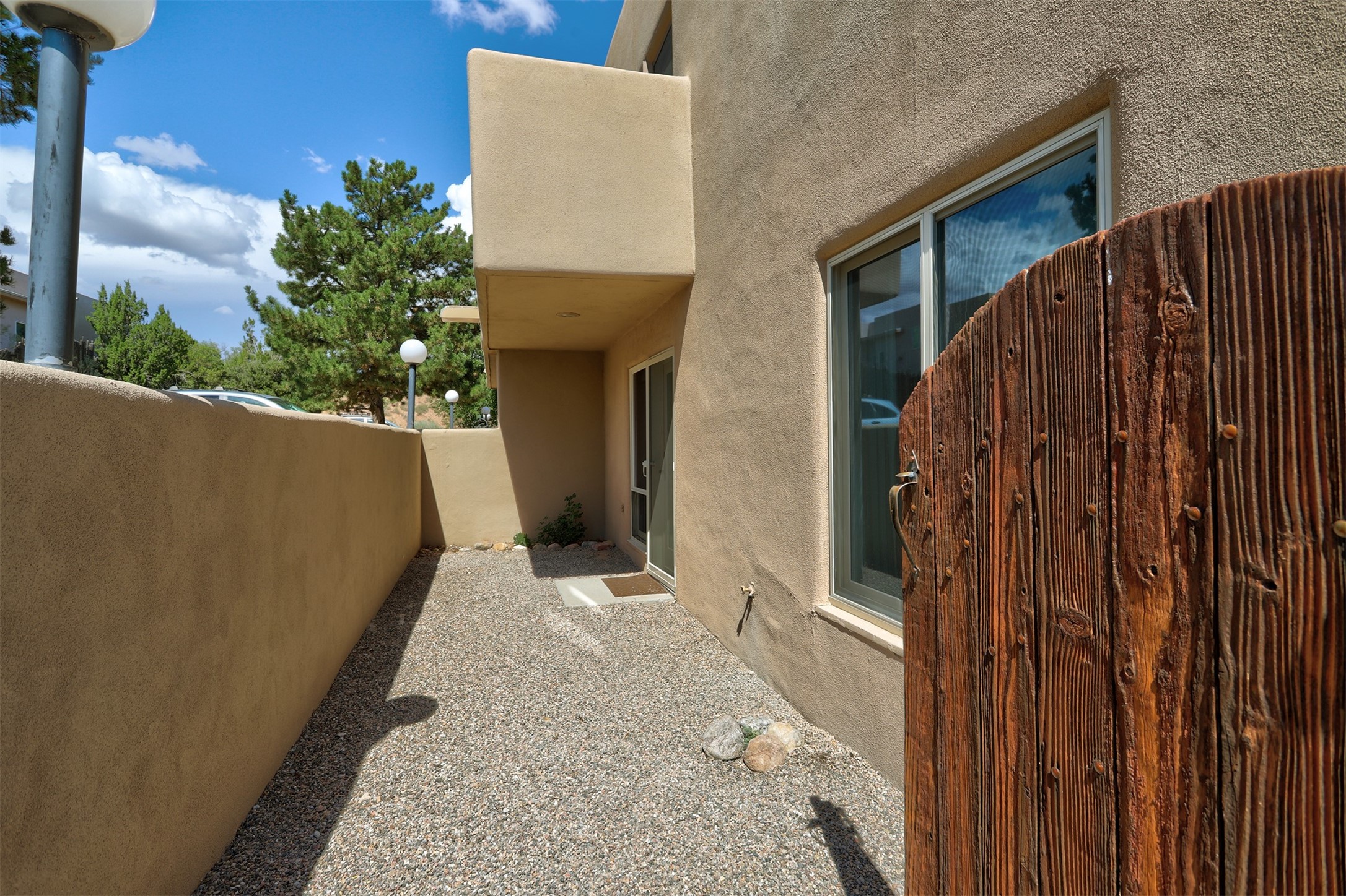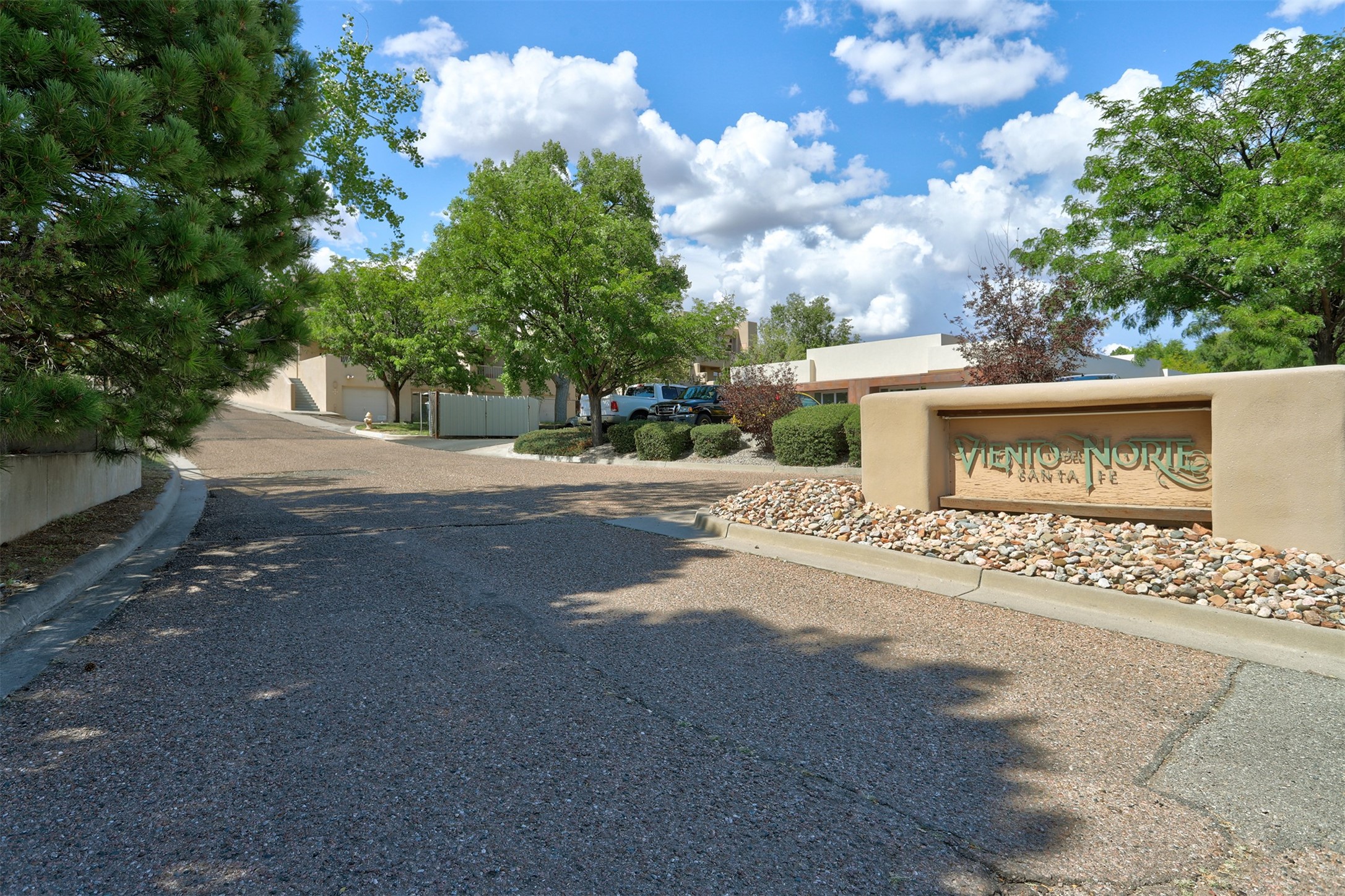 This updated 2-bedroom, 2-bathroom ground-floor end-unit condo on Santa Fe's Northside offers a comfortable blend of privacy and convenience. The location is hard to beat, just minutes to the Plaza, the Opera, shopping, and restaurants, with easy access to Los Alamos and only 17 miles to the ski basin. The living room and kitchen open to a generous wraparound front patio with unobstructed views of the Sangre de Cristo mountains, a perfect spot for morning coffee, dining outdoors, or watching the evening sky. Inside, the light-filled floor plan features tongue-and-groove ceilings with exposed beams and new tile flooring throughout. The kitchen is outfitted with custom cabinetry and newer washer and dryer. Both bedrooms are set at the rear of the home. The primary suite opens to a private walled courtyard with Anderson windows and an Anderson new entry door, adding to the updates. Parking is convenient with a dedicated space behind the condo, as well as an oversized garage below that offers excellent storage. The express bus to LANL is nearby. Whether you're looking for a full-time residence, a second home, or a rental property, this Northside condo is a wonderful place to enjoy Santa Fe living close to everything Santa Fe has to offer.
