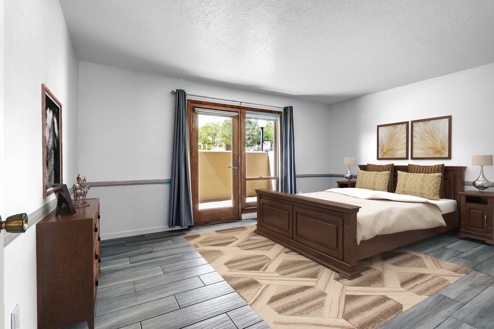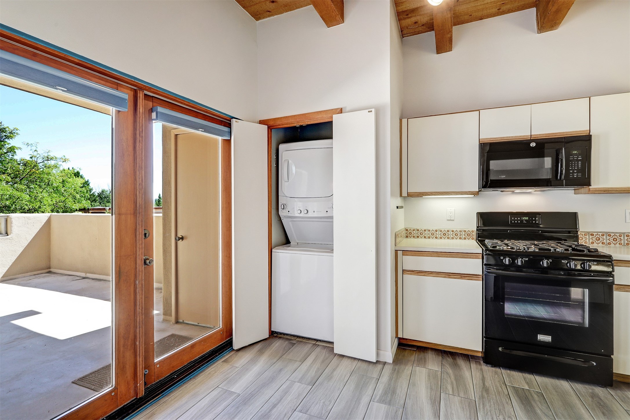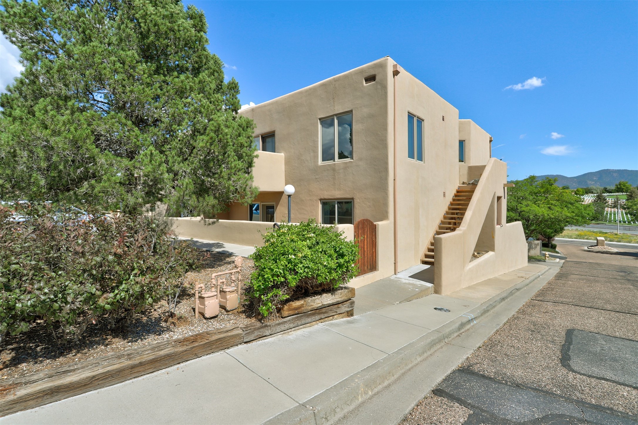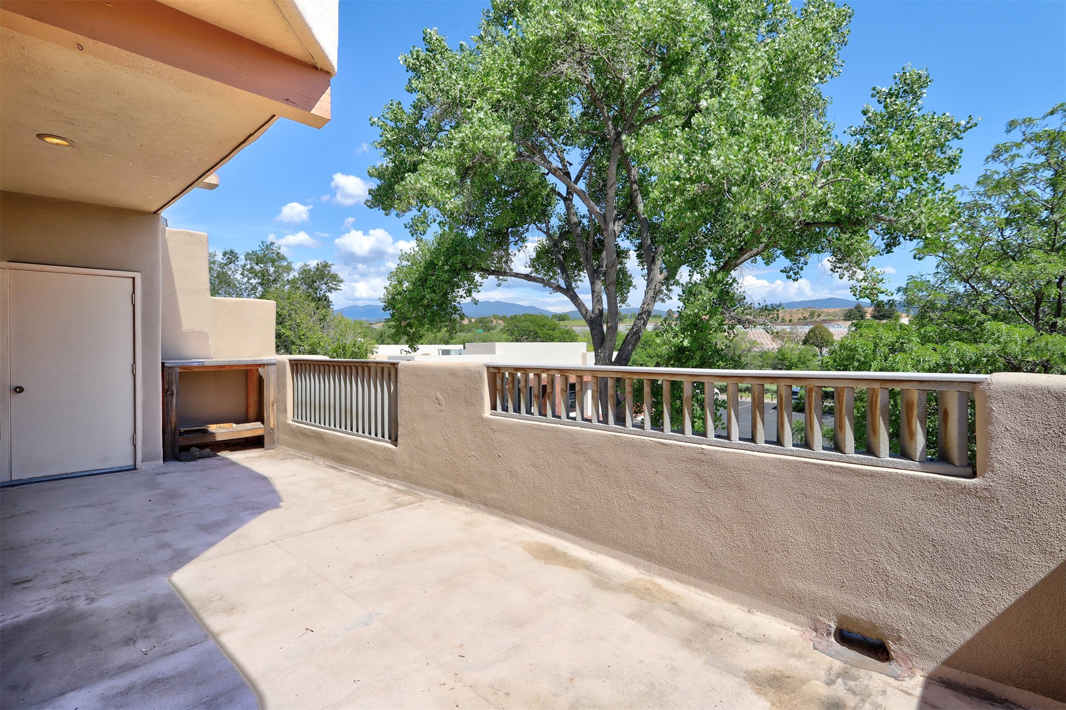 This updated 2-bedroom, 2-bathroom ground-floor end-unit condo on Santa Fe's Northside offers a comfortable blend of privacy and convenience. The location is hard to beat, just minutes to the Plaza, the Opera, shopping, and restaurants, with easy access to Los Alamos and only 17 miles to the ski basin. The living room and kitchen open to a generous wraparound front patio with unobstructed views of the Sangre de Cristo mountains, a perfect spot for morning coffee, dining outdoors, or watching the evening sky. Inside, the light-filled floor plan features tongue-and-groove ceilings with exposed beams and new tile flooring throughout. The kitchen is outfitted with custom cabinetry and newer washer and dryer. Both bedrooms are set at the rear of the home. The primary suite opens to a private walled courtyard with Anderson windows and an Anderson new entry door, adding to the updates. Parking is convenient with a dedicated space behind the condo, as well as an oversized garage below that offers excellent storage. The express bus to LANL is nearby. Whether you're looking for a full-time residence, a second home, or a rental property, this Northside condo is a wonderful place to enjoy Santa Fe living close to everything Santa Fe has to offer.