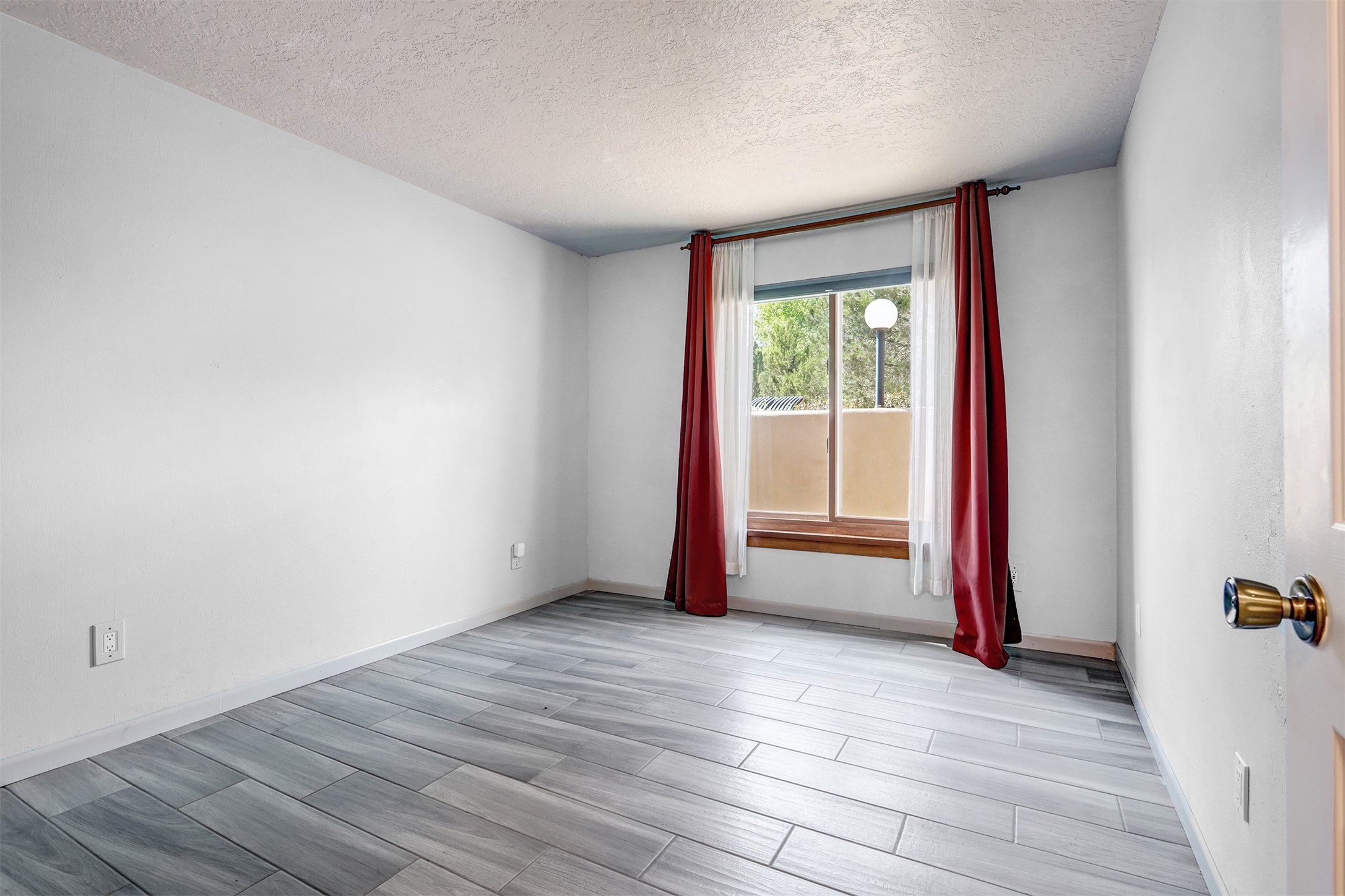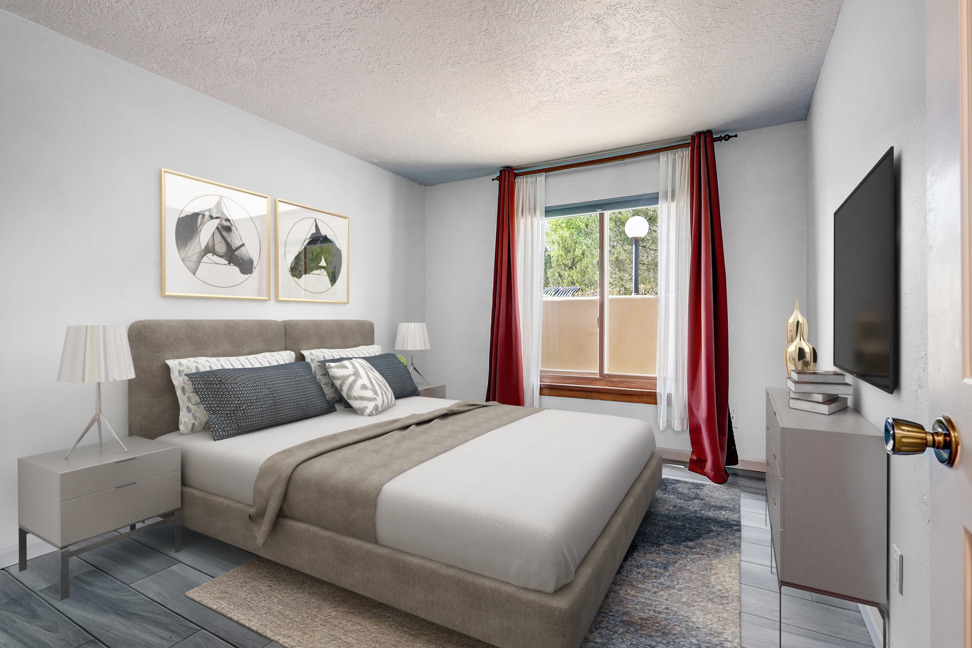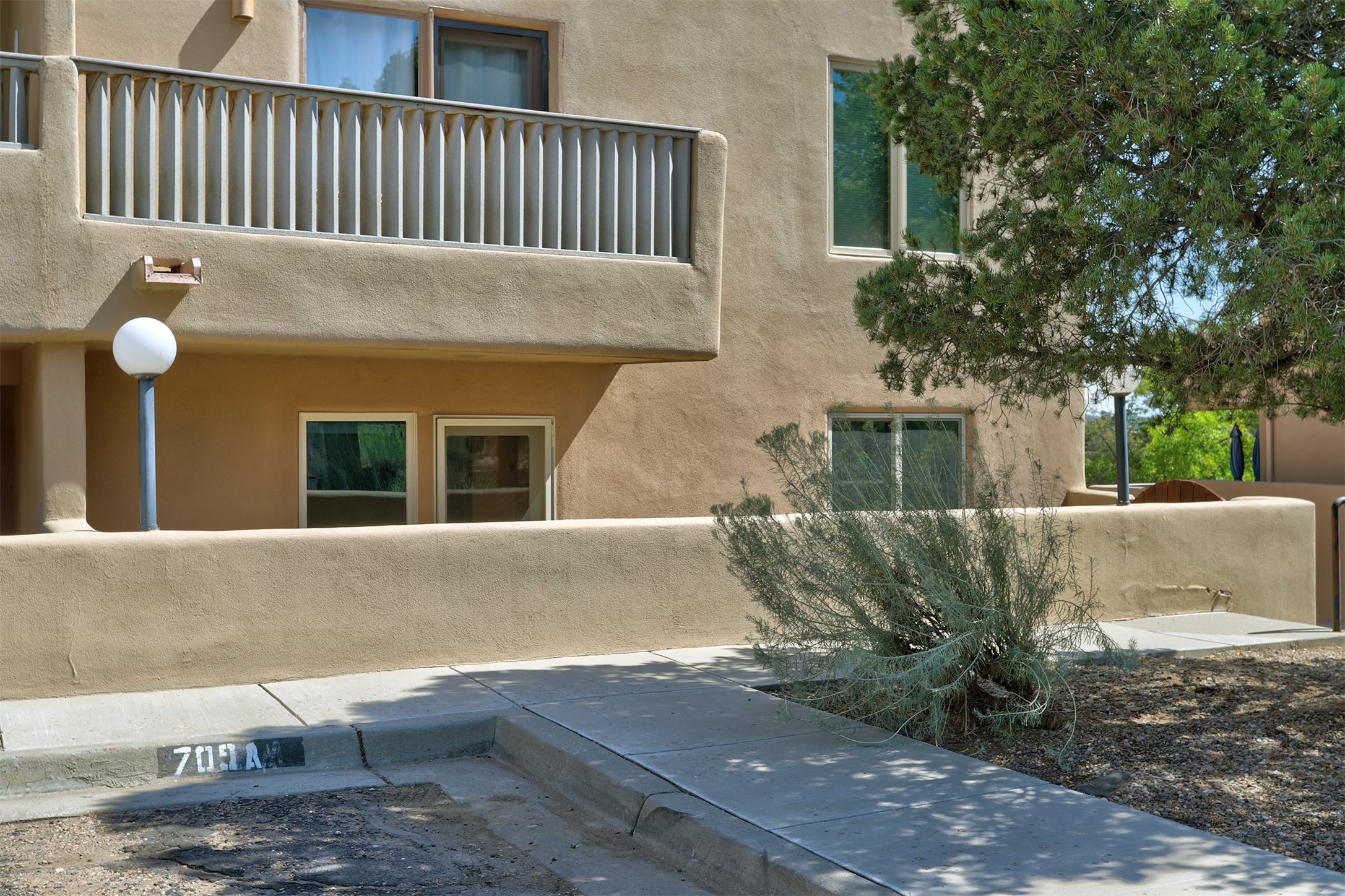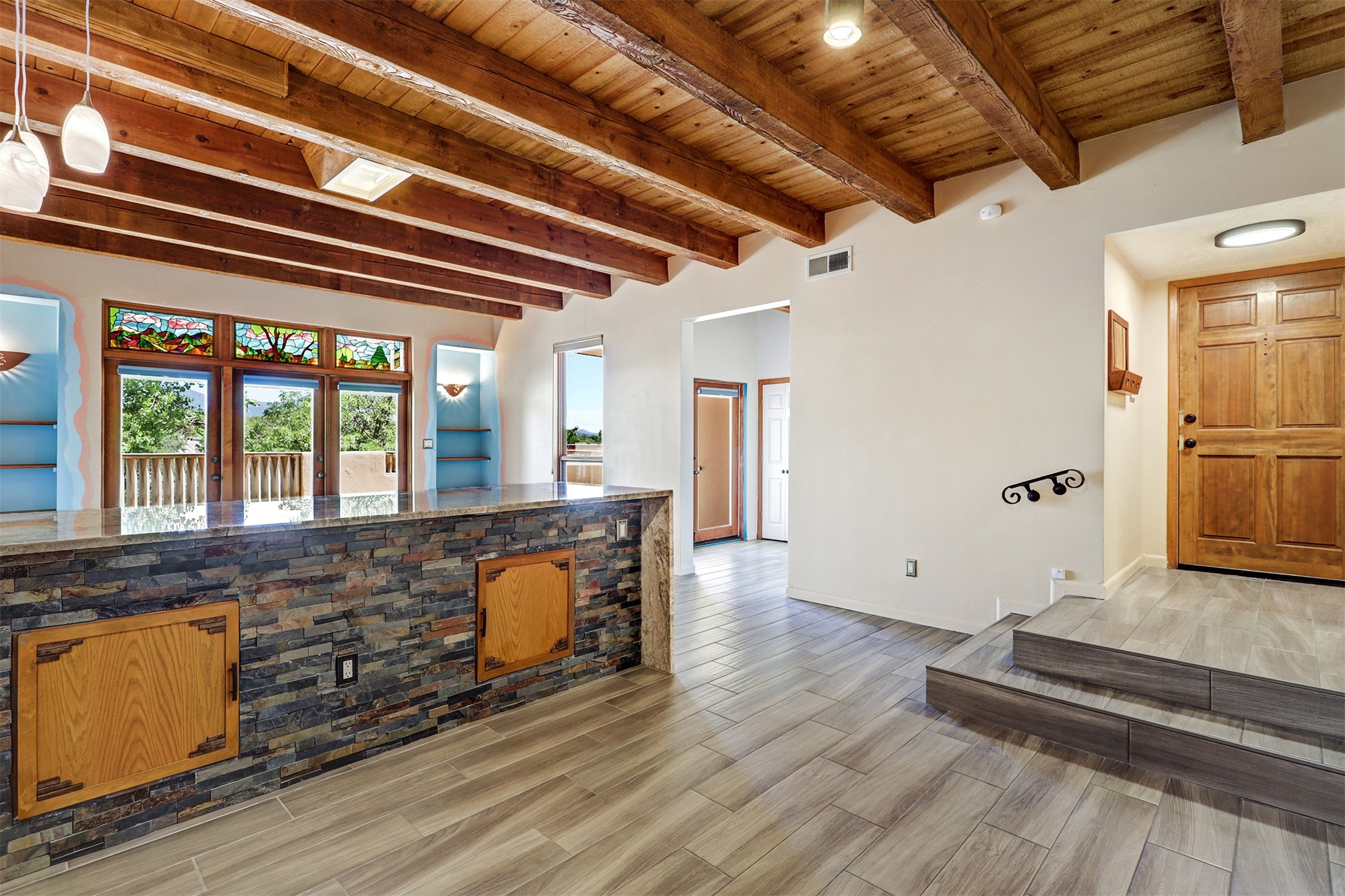 This updated 2-bedroom, 2-bathroom ground-floor end-unit condo on Santa Fe's Northside offers a comfortable blend of privacy and convenience. The location is hard to beat, just minutes to the Plaza, the Opera, shopping, and restaurants, with easy access to Los Alamos and only 17 miles to the ski basin. The living room and kitchen open to a generous wraparound front patio with unobstructed views of the Sangre de Cristo mountains, a perfect spot for morning coffee, dining outdoors, or watching the evening sky. Inside, the light-filled floor plan features tongue-and-groove ceilings with exposed beams and new tile flooring throughout. The kitchen is outfitted with custom cabinetry and newer washer and dryer. Both bedrooms are set at the rear of the home. The primary suite opens to a private walled courtyard with Anderson windows and an Anderson new entry door, adding to the updates. Parking is convenient with a dedicated space behind the condo, as well as an oversized garage below that offers excellent storage. The express bus to LANL is nearby. Whether you're looking for a full-time residence, a second home, or a rental property, this Northside condo is a wonderful place to enjoy Santa Fe living close to everything Santa Fe has to offer.