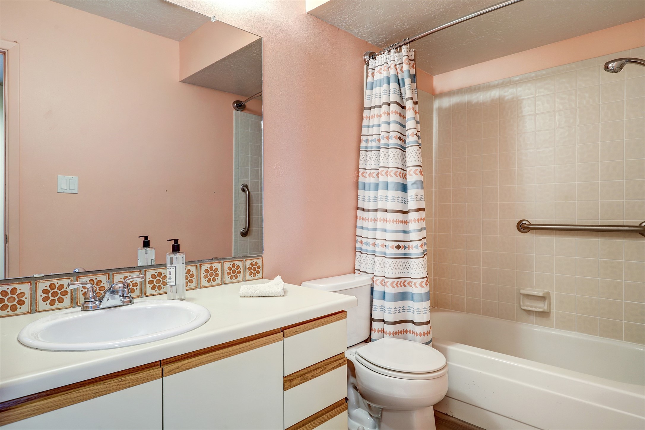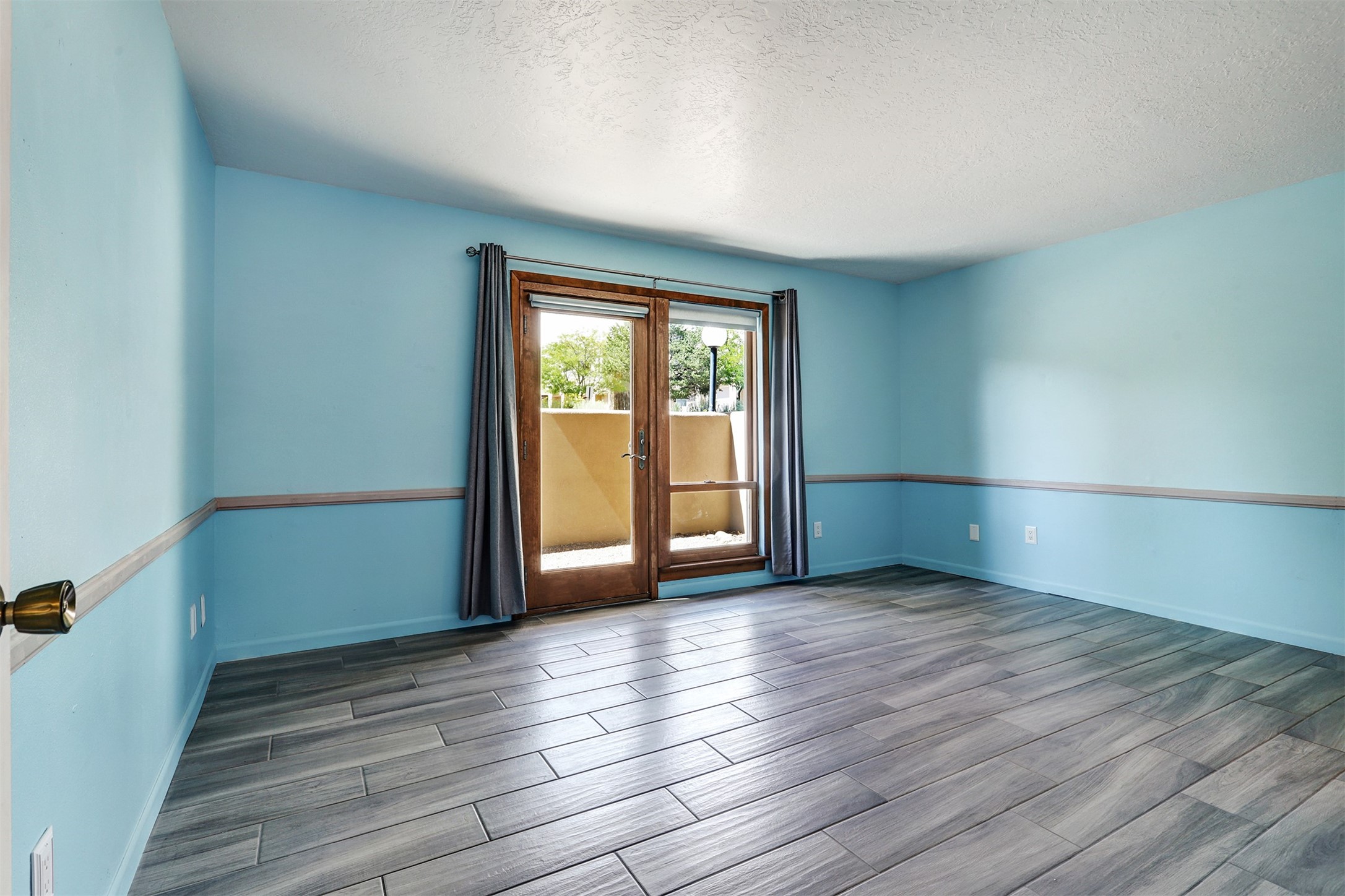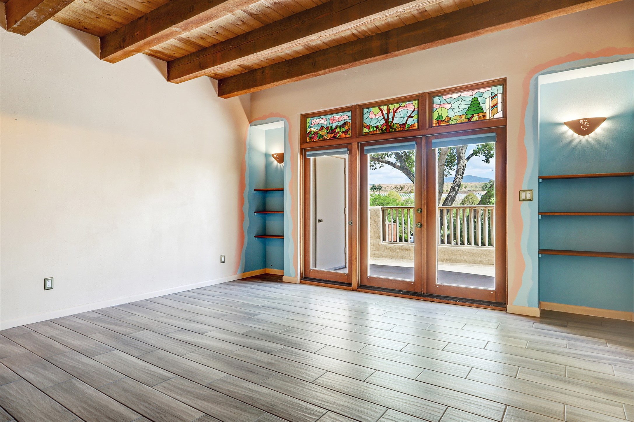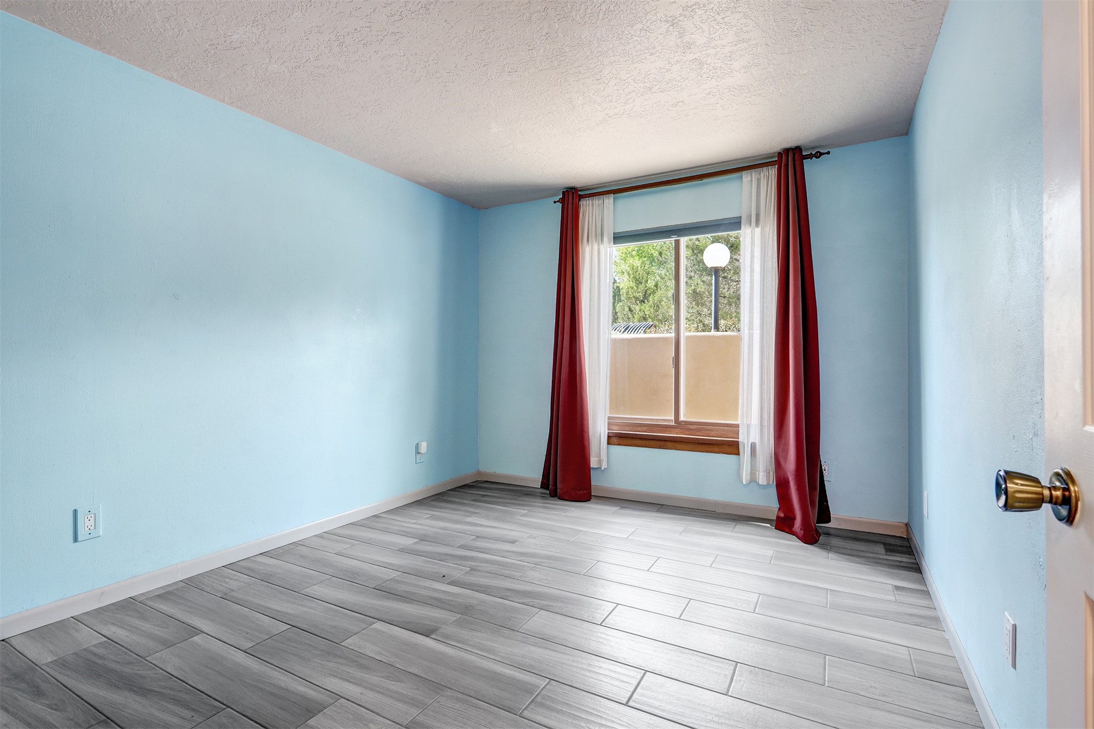 This updated 2-bedroom, 2-bathroom ground-floor end-unit condo on Santa Fe's Northside offers a comfortable blend of privacy and convenience. The location is hard to beat, just minutes to the Plaza, the Opera, shopping, and restaurants, with easy access to Los Alamos and only 17 miles to the ski basin. The living room and kitchen open to a generous wraparound front patio with unobstructed views of the Sangre de Cristo mountains, a perfect spot for morning coffee, dining outdoors, or watching the evening sky. Inside, the light-filled floor plan features tongue-and-groove ceilings with exposed beams and new tile flooring throughout. The kitchen is outfitted with custom cabinetry and newer washer and dryer. Both bedrooms are set at the rear of the home. The primary suite opens to a private walled courtyard with Anderson windows and an Anderson new entry door, adding to the updates. Parking is convenient with a dedicated space behind the condo, as well as an oversized garage below that offers excellent storage. The express bus to LANL is nearby. Whether you're looking for a full-time residence, a second home, or a rental property, this Northside condo is a wonderful place to enjoy Santa Fe living close to everything Santa Fe has to offer.