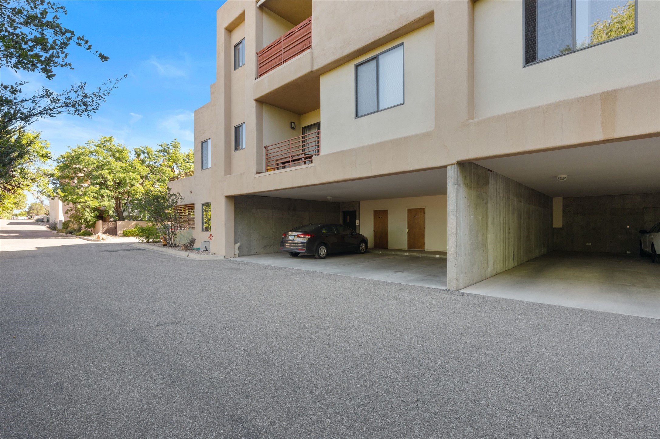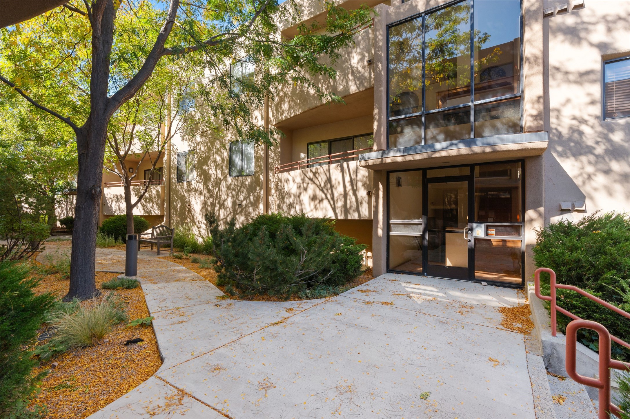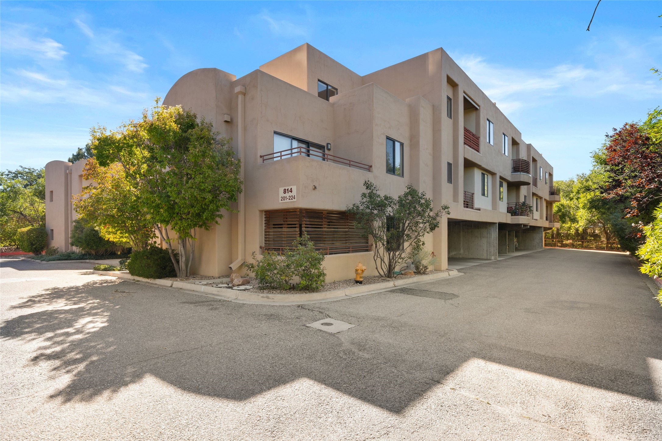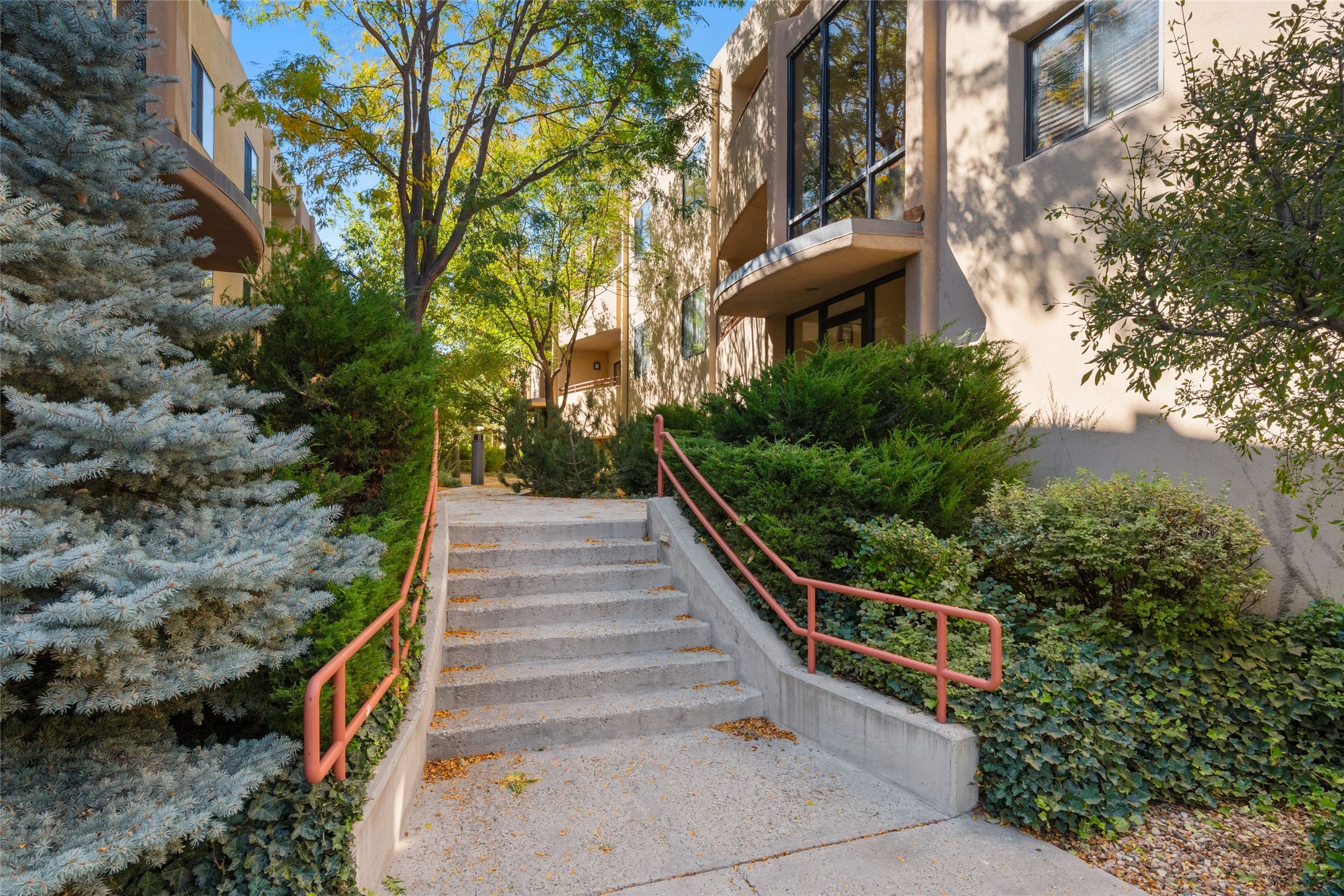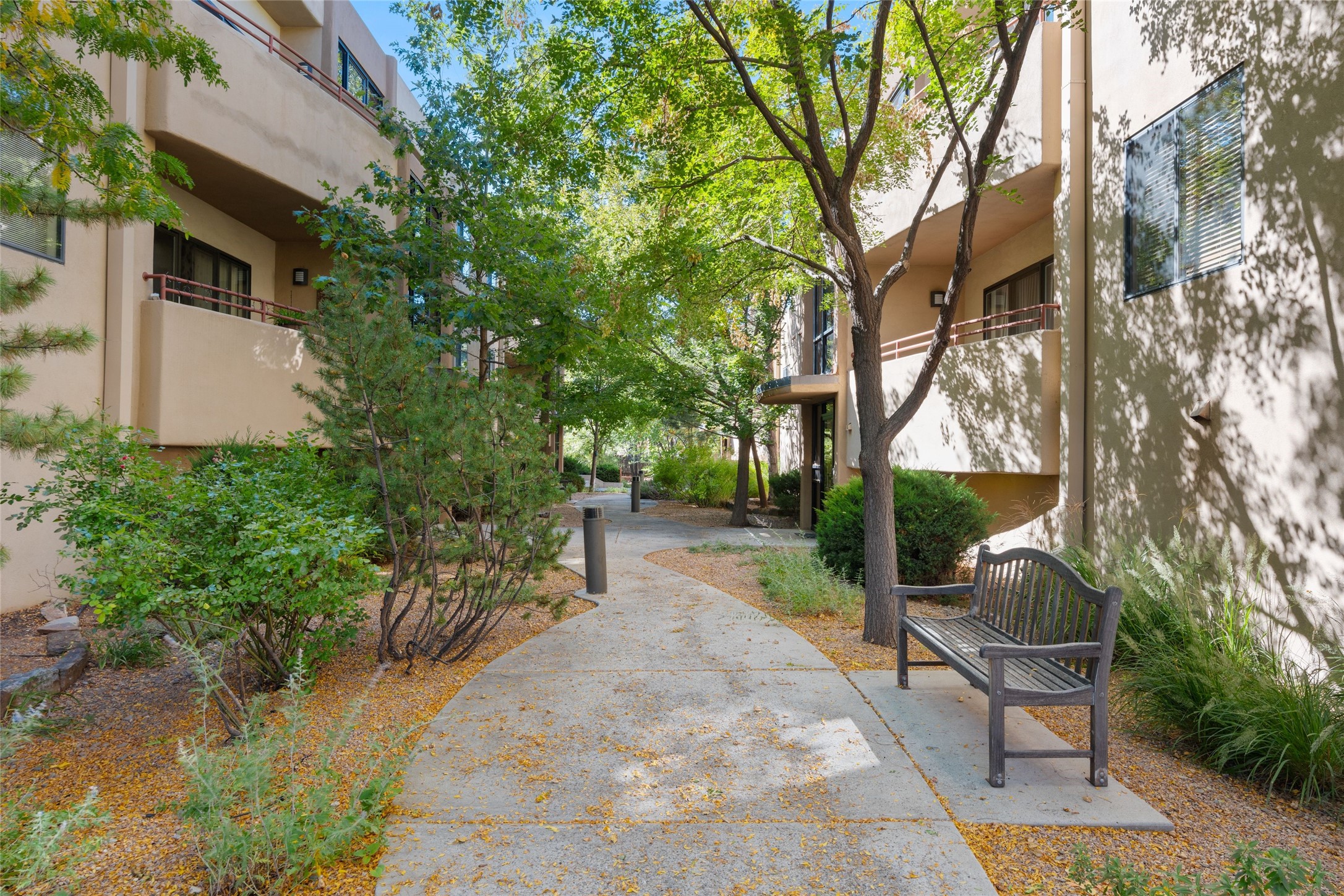 Classic urban oasis surrounded by mature trees, La Remuda Condominium is located on the edge of Midtown where you can walk to relaxed eateries featuring global cuisine and local flair. Not far from theRailyard, quick stops to Trader Joe's and Whole Foods. The central location is convenientfor a fast commute to Los Alamos or I-25. This bright and airy condo features an open floor plan with sliding glass doors at each end of the living/dining rooms with access to the 2 balconies. The kitchen is well designed, with exceptional storage, high quality stainless steel appliances, butcher block on one side of the counter and Italian tile on the other. Other features include: central air conditioning and heating installed in 2023, 9 foot ceilings, beautiful bamboo floors, custom drapes, custom dividedclosets, custom cabinets in living room and office, private storage: 5.5' x 17', Asko washer and dryer, whole house water filtration system installed in 2025, 2 under cover designated parking spots with direct entrance to the secure building, upper floor unit with no interior steps, new roof in 2024 and refreshed stucco in 2025. One of the two only units at La Remuda with 3 bedrooms. Seller will credit one year of special assessment dues with an acceptable offer. This condo is on the second floor and stairs are required to access it.
