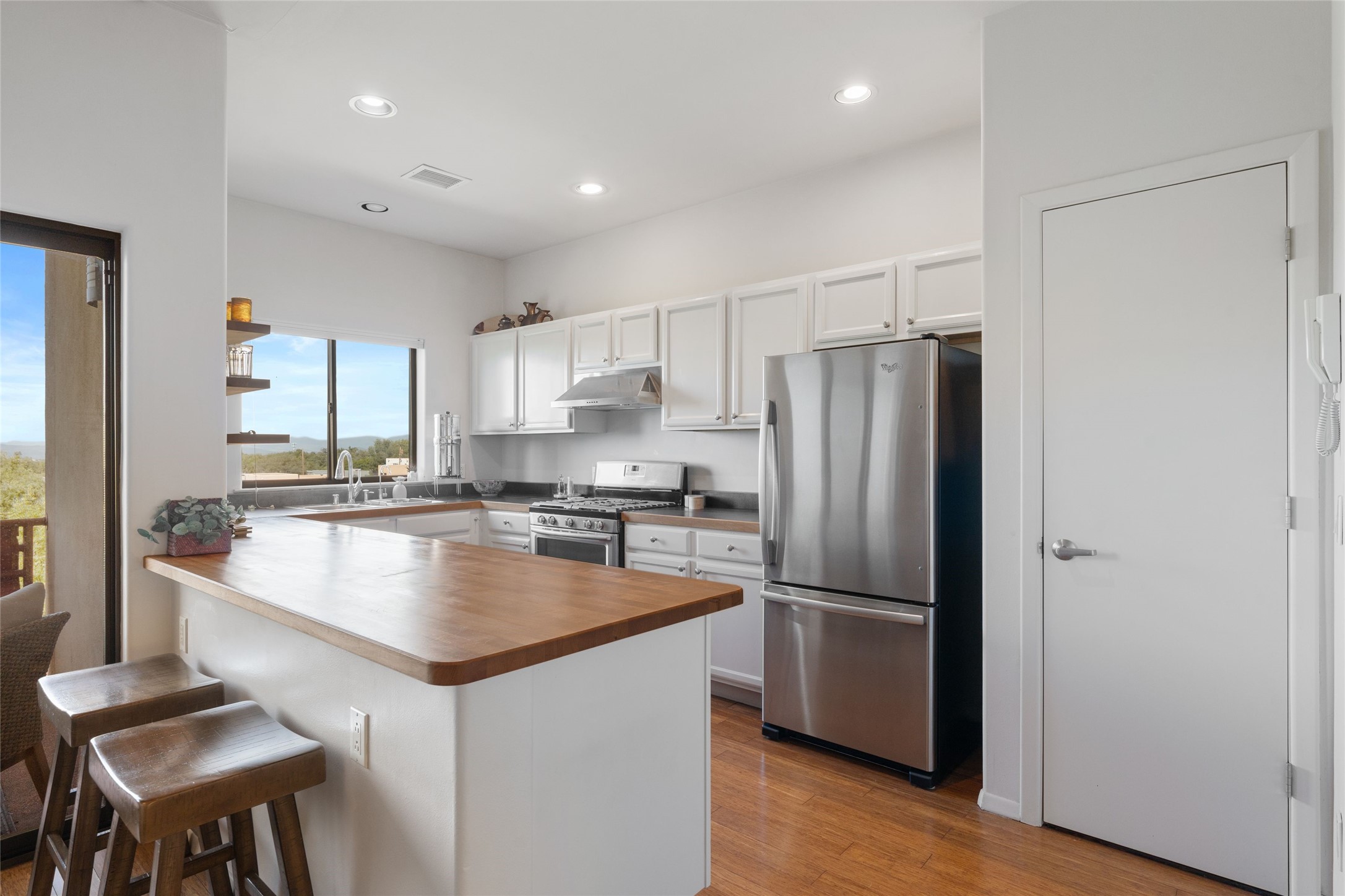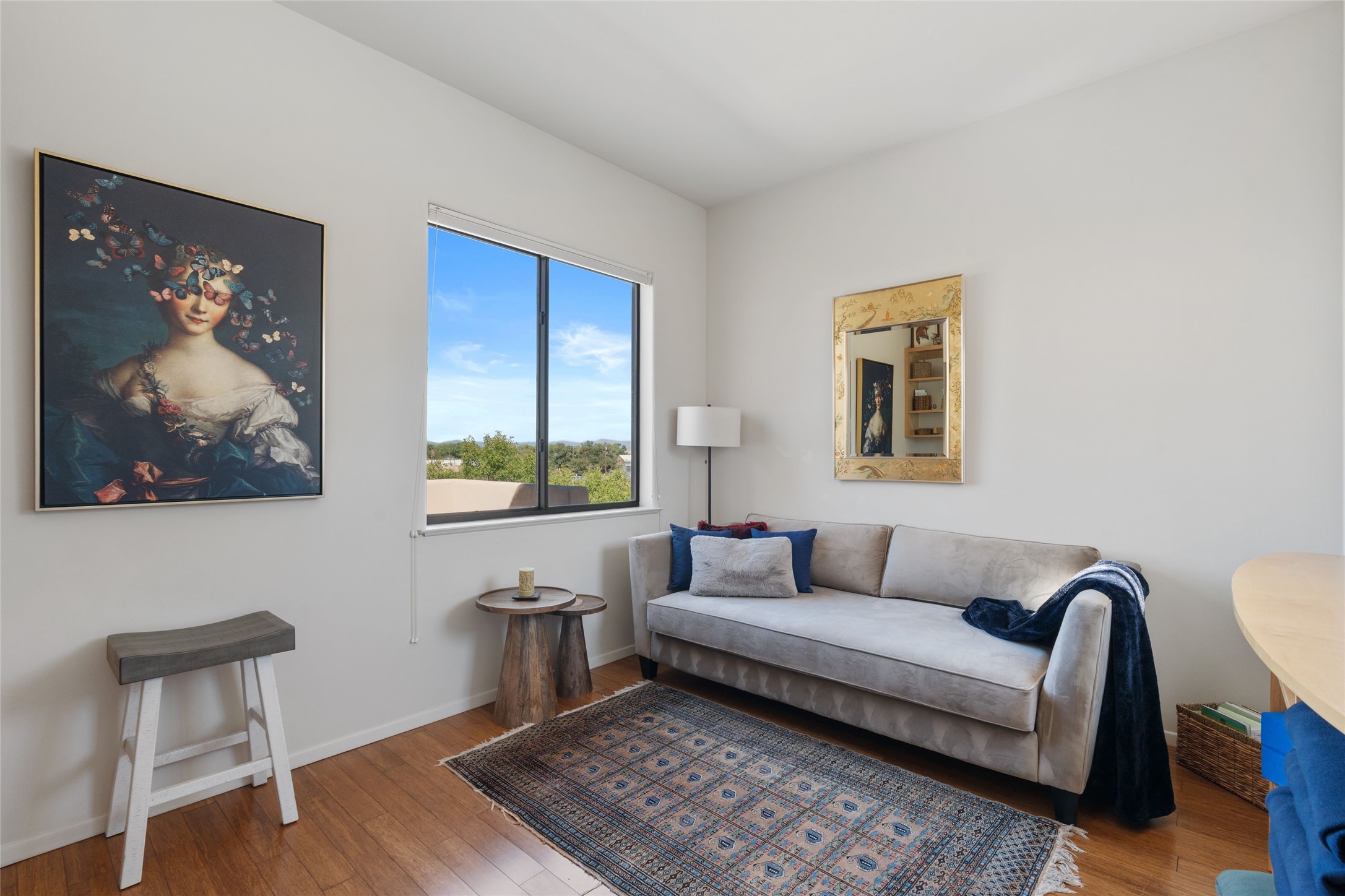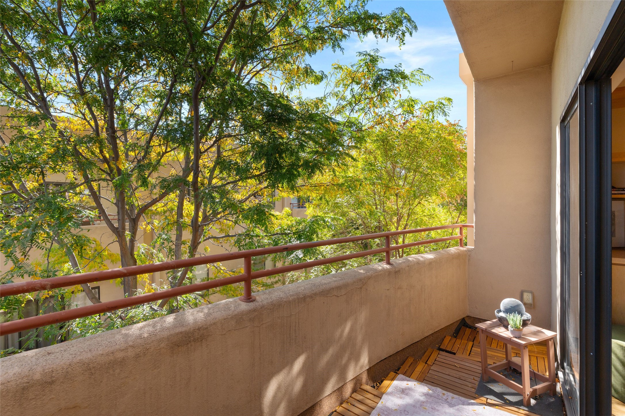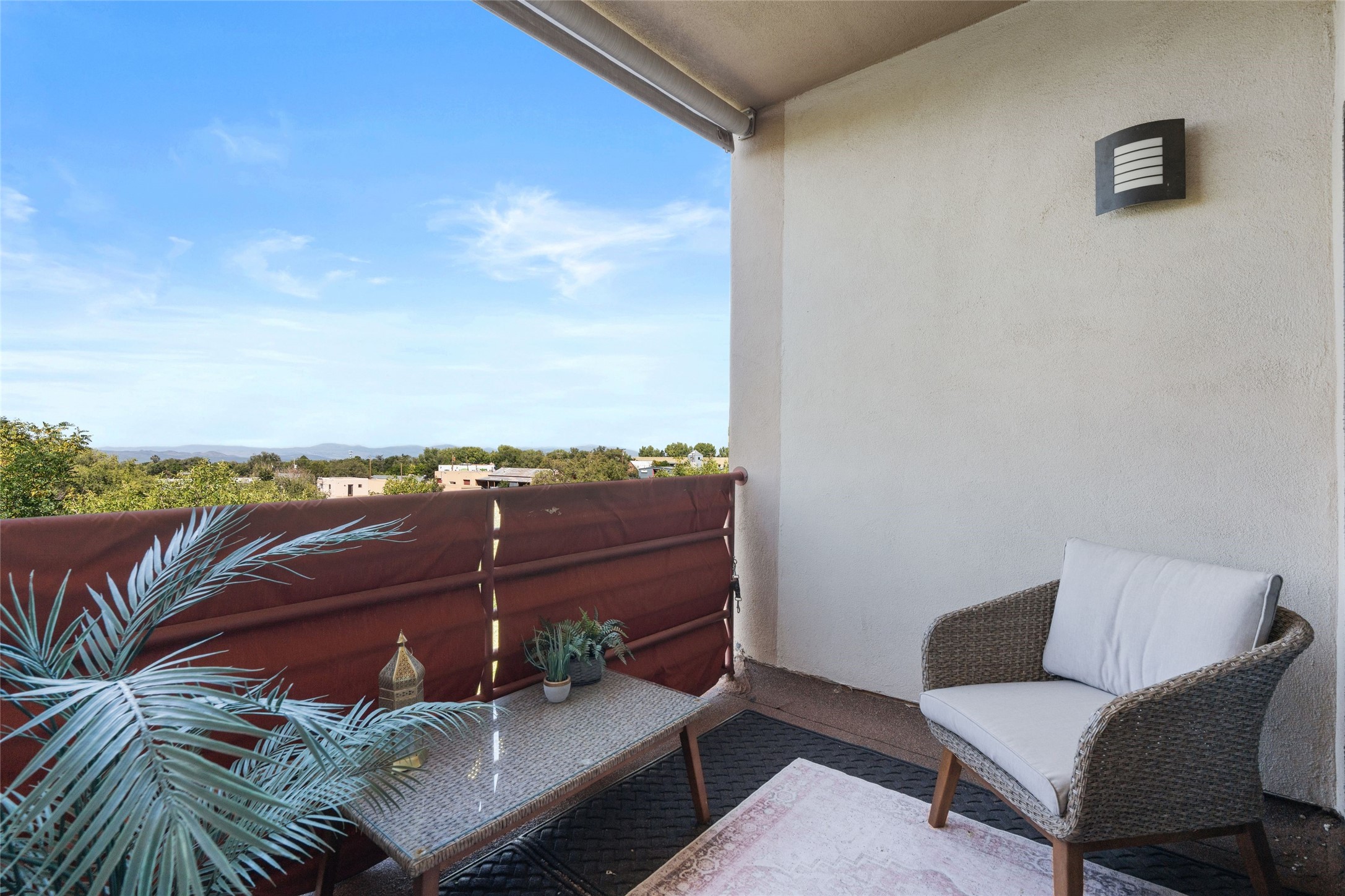 Classic urban oasis surrounded by mature trees, La Remuda Condominium is located on the edge of Midtown where you can walk to relaxed eateries featuring global cuisine and local flair. Not far from theRailyard, quick stops to Trader Joe's and Whole Foods. The central location is convenientfor a fast commute to Los Alamos or I-25. This bright and airy condo features an open floor plan with sliding glass doors at each end of the living/dining rooms with access to the 2 balconies. The kitchen is well designed, with exceptional storage, high quality stainless steel appliances, butcher block on one side of the counter and Italian tile on the other. Other features include: central air conditioning and heating installed in 2023, 9 foot ceilings, beautiful bamboo floors, custom drapes, custom dividedclosets, custom cabinets in living room and office, private storage: 5.5' x 17', Asko washer and dryer, whole house water filtration system installed in 2025, 2 under cover designated parking spots with direct entrance to the secure building, upper floor unit with no interior steps, new roof in 2024 and refreshed stucco in 2025. One of the two only units at La Remuda with 3 bedrooms. Seller will credit one year of special assessment dues with an acceptable offer. This condo is on the second floor and stairs are required to access it.
