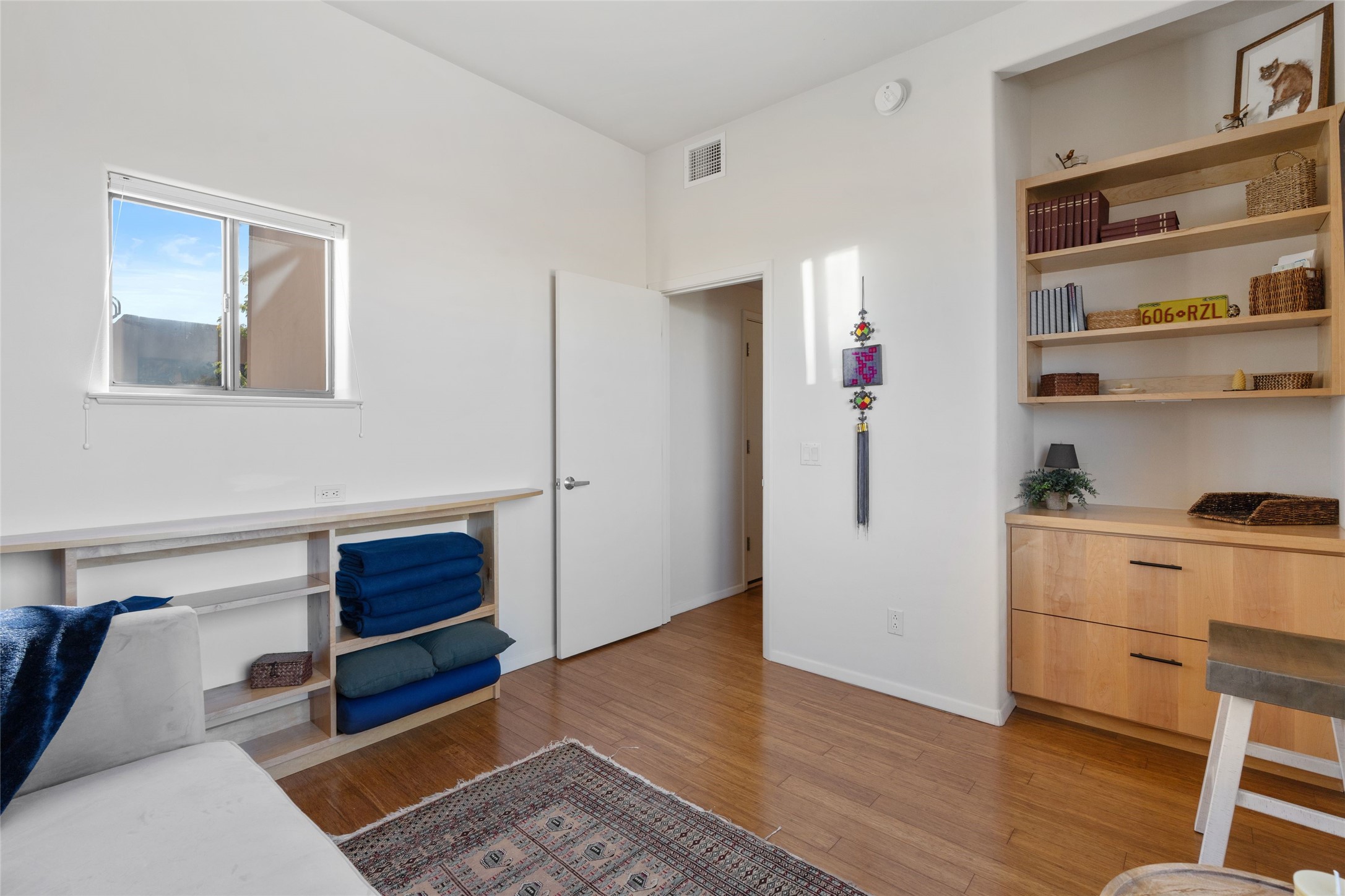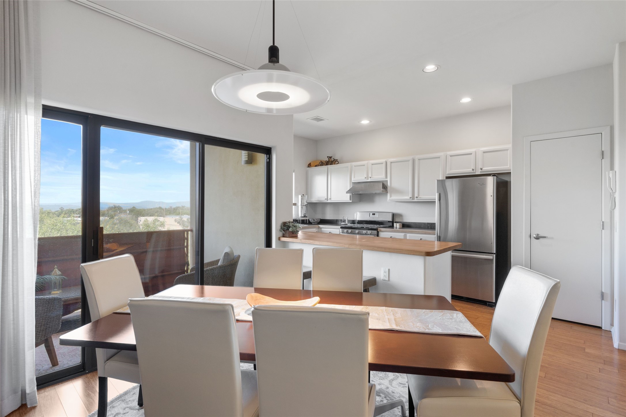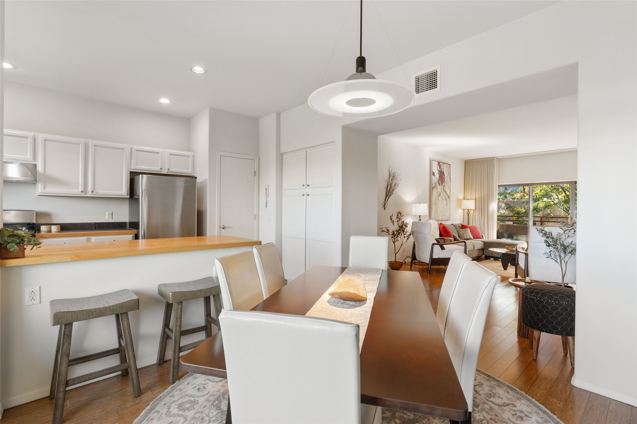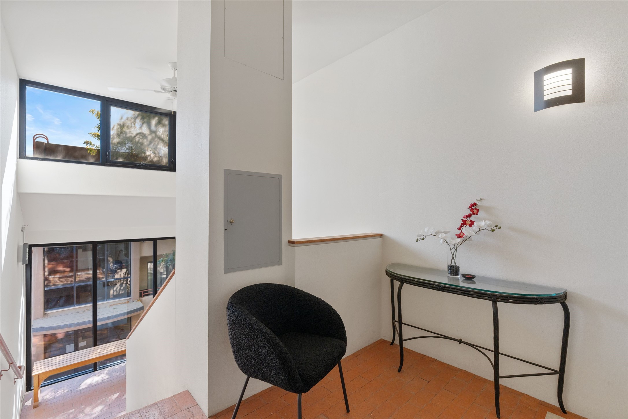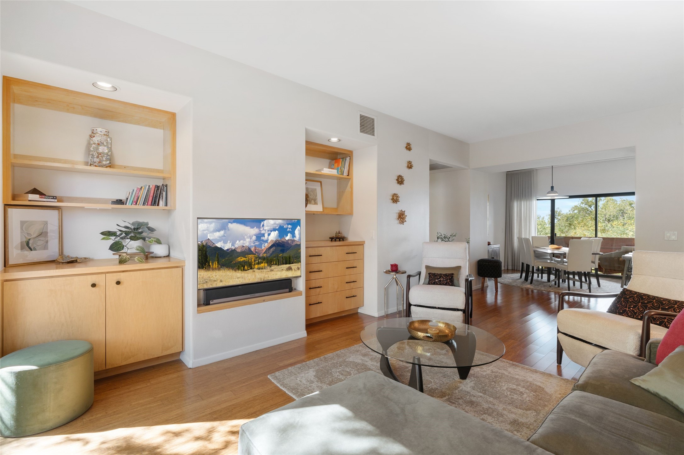 Classic urban oasis surrounded by mature trees, La Remuda Condominium is located on the edge of Midtown where you can walk to relaxed eateries featuring global cuisine and local flair. Not far from theRailyard, quick stops to Trader Joe's and Whole Foods. The central location is convenientfor a fast commute to Los Alamos or I-25. This bright and airy condo features an open floor plan with sliding glass doors at each end of the living/dining rooms with access to the 2 balconies. The kitchen is well designed, with exceptional storage, high quality stainless steel appliances, butcher block on one side of the counter and Italian tile on the other. Other features include: central air conditioning and heating installed in 2023, 9 foot ceilings, beautiful bamboo floors, custom drapes, custom dividedclosets, custom cabinets in living room and office, private storage: 5.5' x 17', Asko washer and dryer, whole house water filtration system installed in 2025, 2 under cover designated parking spots with direct entrance to the secure building, upper floor unit with no interior steps, new roof in 2024 and refreshed stucco in 2025. One of the two only units at La Remuda with 3 bedrooms. Seller will credit one year of special assessment dues with an acceptable offer. This condo is on the second floor and stairs are required to access it.