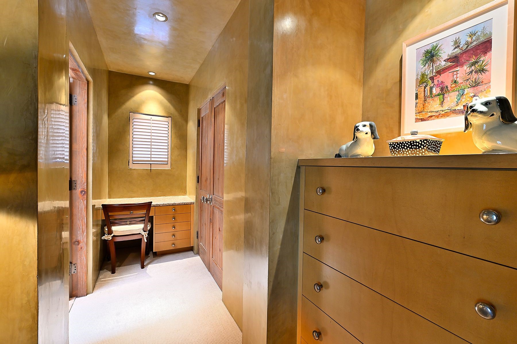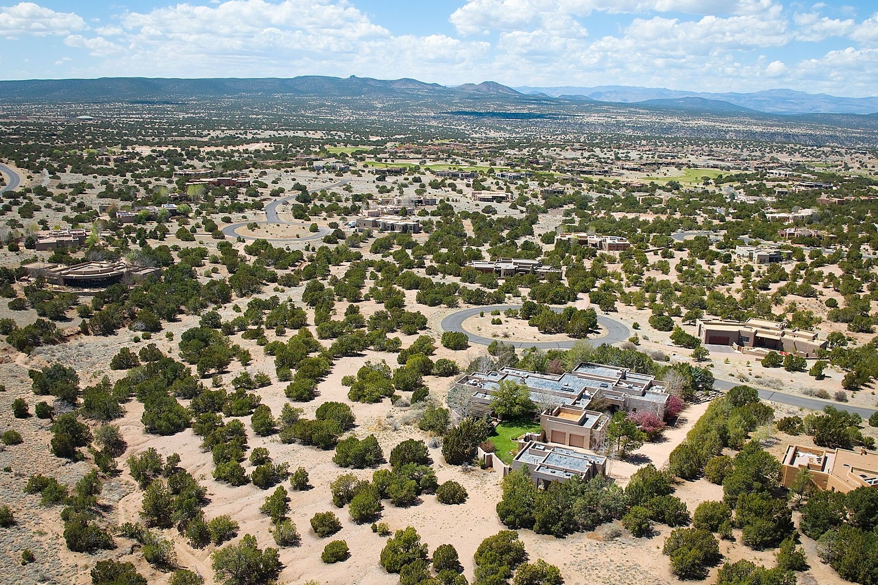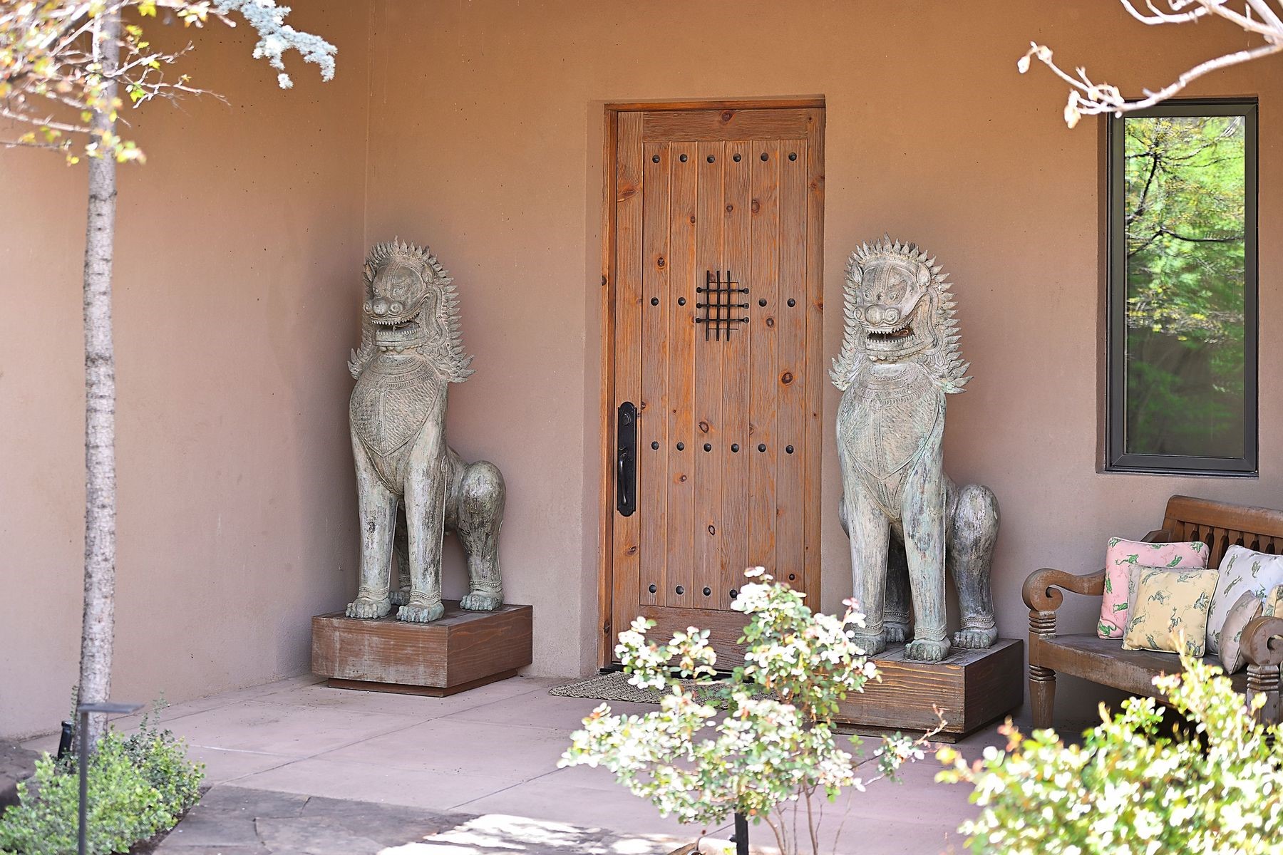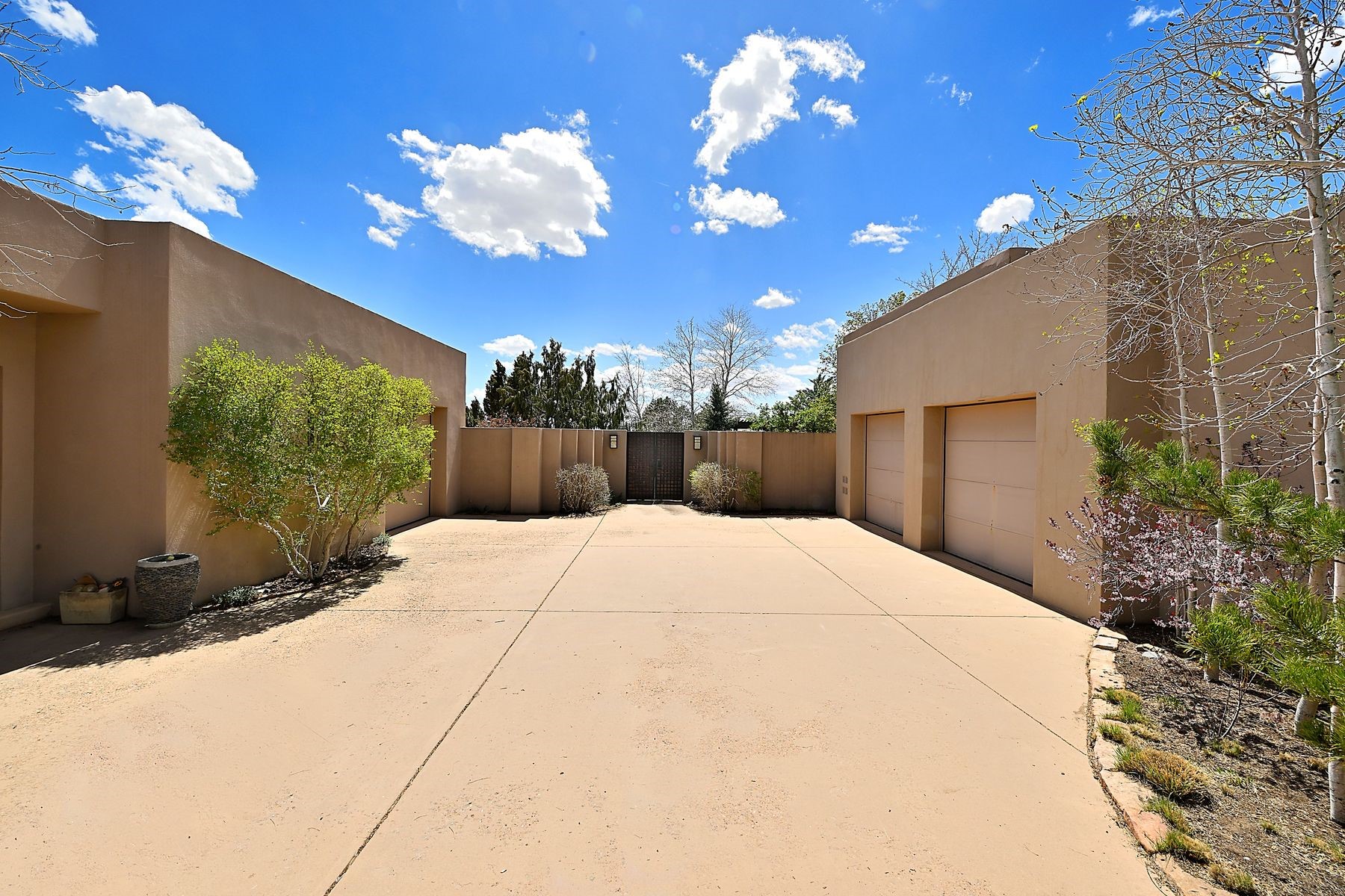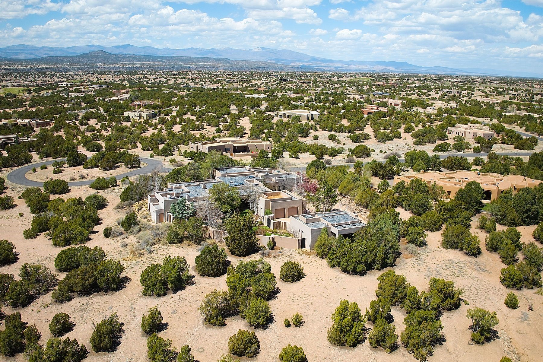 In the rugged reaches of exclusive Las Campanas this secluded estate--a sophisticated home and guesthouse--was custom-designed and -built amid blossoming trees, aspens, and stalwart evergreens. The residence is a bastion of color and volume featuring three luxuriously restful bedroom suites, formal living and dining rooms, a vast cook's kitchen with a wet bar and a family room, an inviting guesthouse with a full kitchen and bath, and painstakingly landscaped grounds. Vibrantly colored polished plaster walls combine with soaring ceilings, wide windows, multiple fireplaces, a collection of portales, a roof deck, and a swimming pool shaded by a pergola to create an ideal setting for grand entertaining, a haven crafted for the appreciation of the outdoors, and the perfect venue for the display of art. Surrounding the home are natural greenery, carefully chosen landscaping, sculpture gardens, water features, and a water-wise artificial turf lawn.
