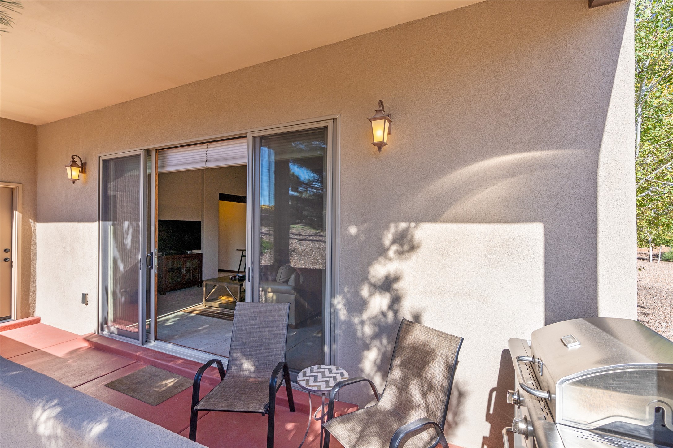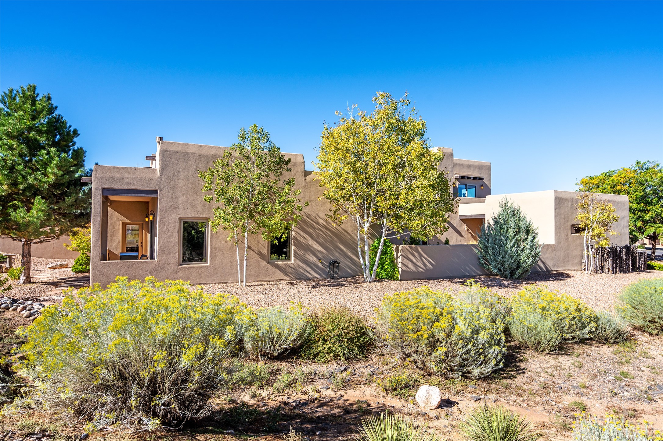 EASY ELEGANCE IN LAS CAMPANAS. Built in 2014 by Rachel Matthews, this 4-bedroom, 4-bath residence with detached guest casita feels practically new; a rare find in the Los Santeros Villas, offering both the ease of lock-and-leave lifestyle and the comfort of a primary residence. The main home spans approximately 2,106 sqft, complemented by a 274 sqft casita, each space designed with privacy, flexibility, and everyday living in mind. The primary suite and one guest room are located on the main level, while a versatile upstairs bedroom or office opens to an observation deck - perfect for morning coffee with Sangre de Cristo Mountain views or stargazing under Las Campanas' protected night skies. The detached casita, complete with its own bedroom and bath, provides ideal accommodations for visitors or a private studio retreat. Warm interiors feature two gas Kiva fireplaces, abundant natural light, and central heating and cooling for year-round comfort. A gated courtyard with low-maintenance landscaping creates a welcoming entry, while a two-car garage and HOA security patrols add peace of mind. This sparkling single-owner home has been carefully maintained and offers timeless Santa Fe style with the flexibility to serve as either a secure getaway or a full-time residence in one of Santa Fe's most desirable communities.