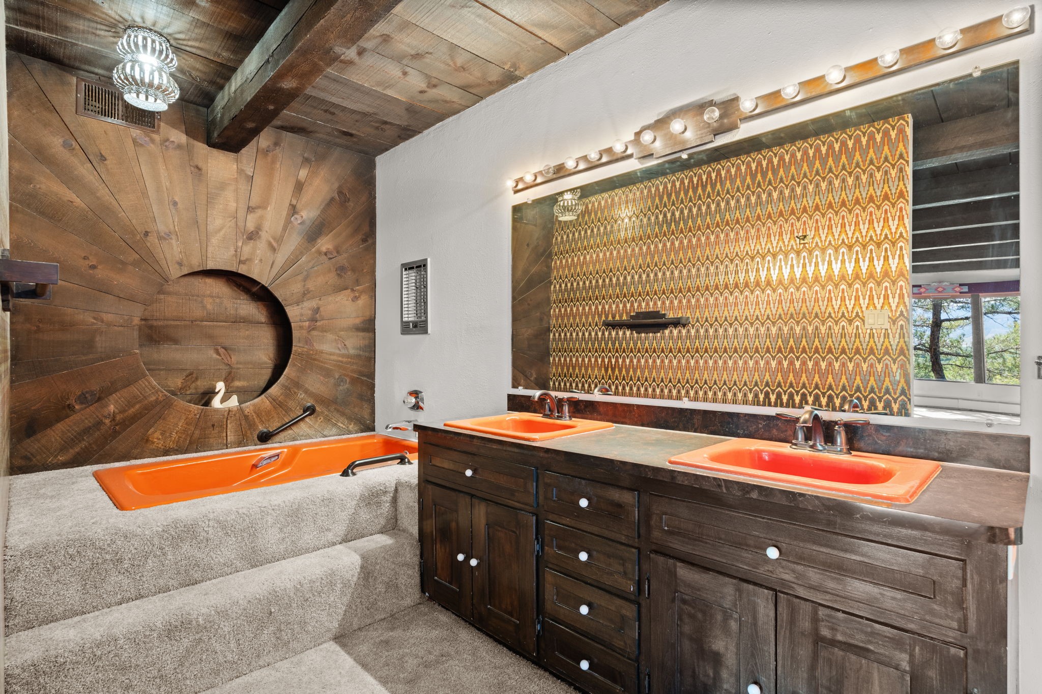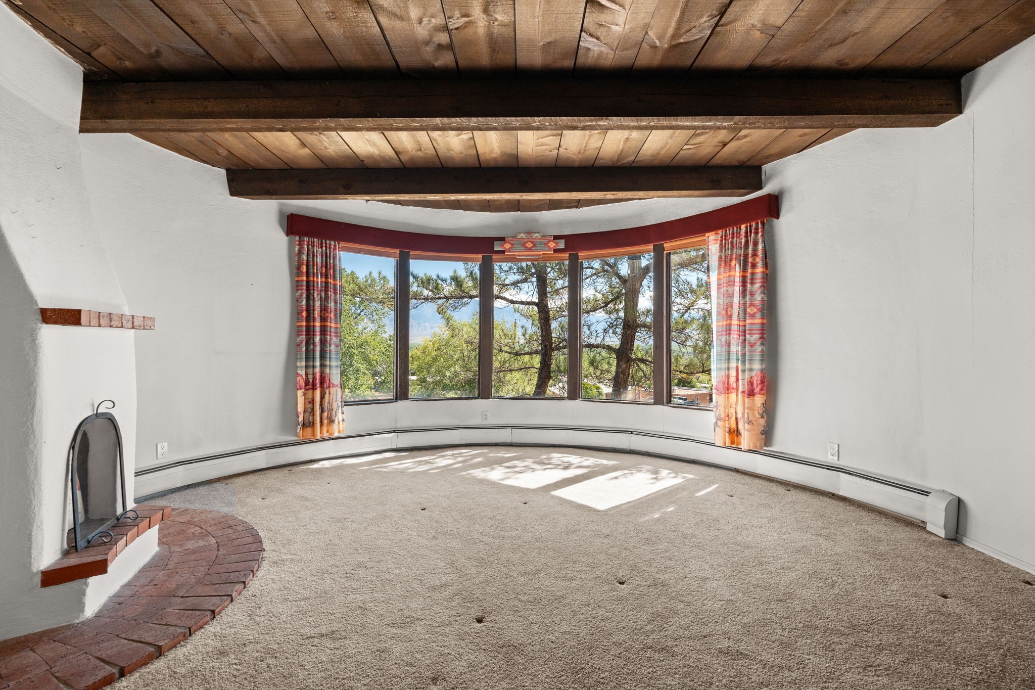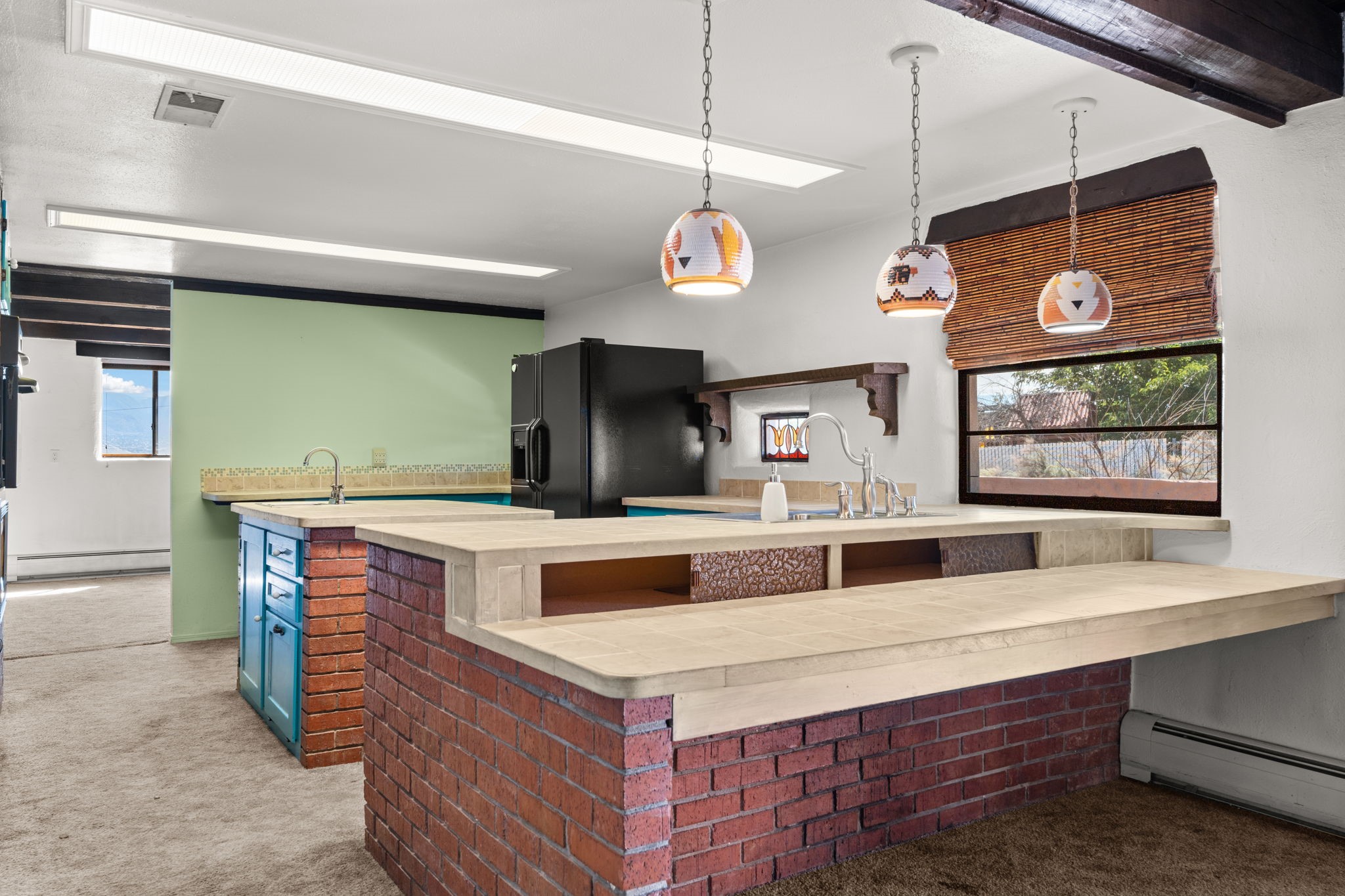 What an opportunity to purchase an adobe on two lots, 1.38 acres with guest house & unlimited views. Indoor pool, stained glass, 3 levels, 4 car garage. Brick floors, latillas, beams, vigas, kiva fireplaces, & unlimited potential. 5 BR's, 4, Baths, studio, in a sought out area that is convienant for shopping and commuting. Main home 3746. sf. includes the guest house of 561 sf. Indoor pool room of 1280 sf is not included in sf. A four car garage plus storage. A dumb waiter or utility lift functions from the garage to the third level for owners convienence. A must to see and call home!
