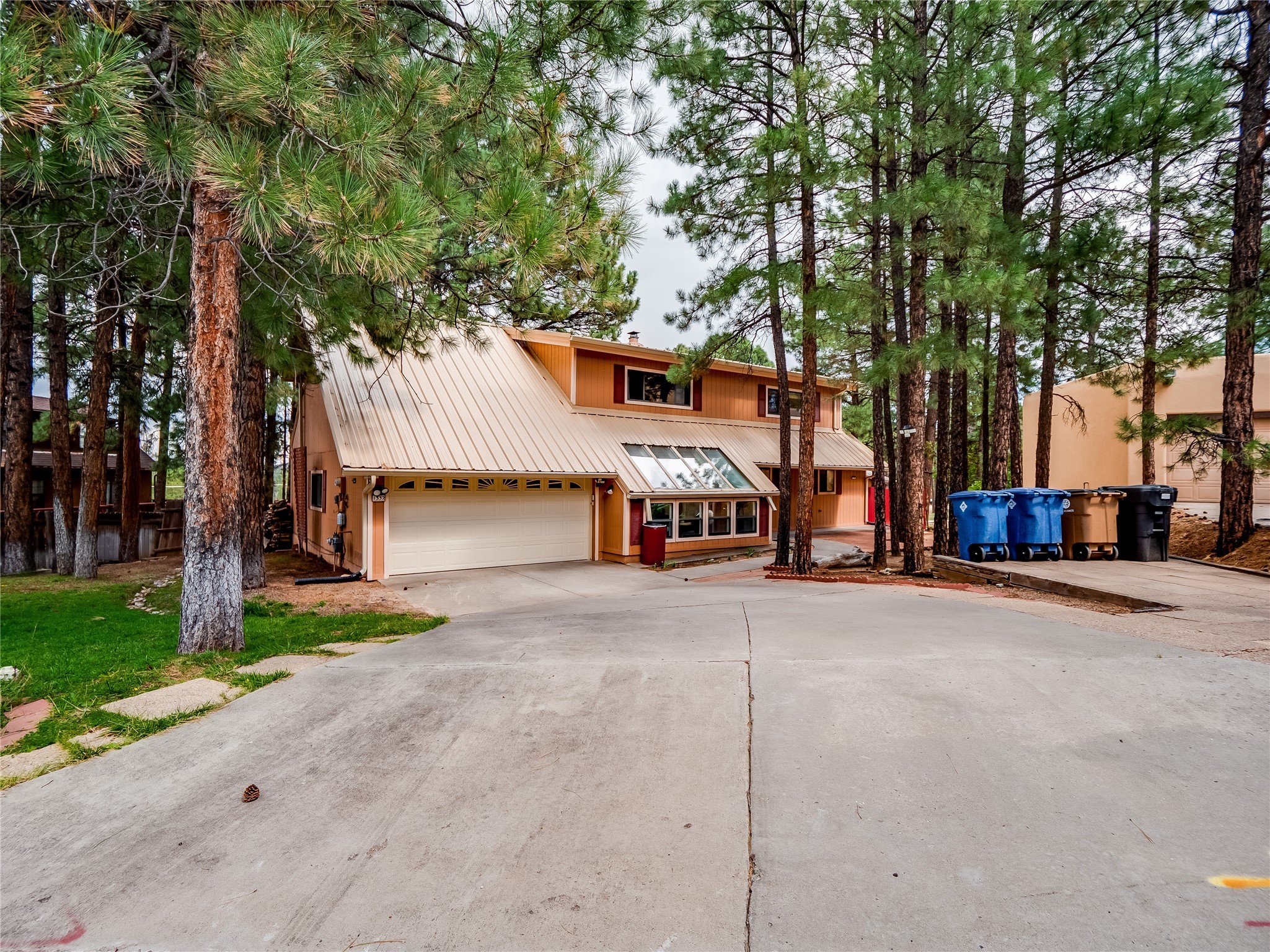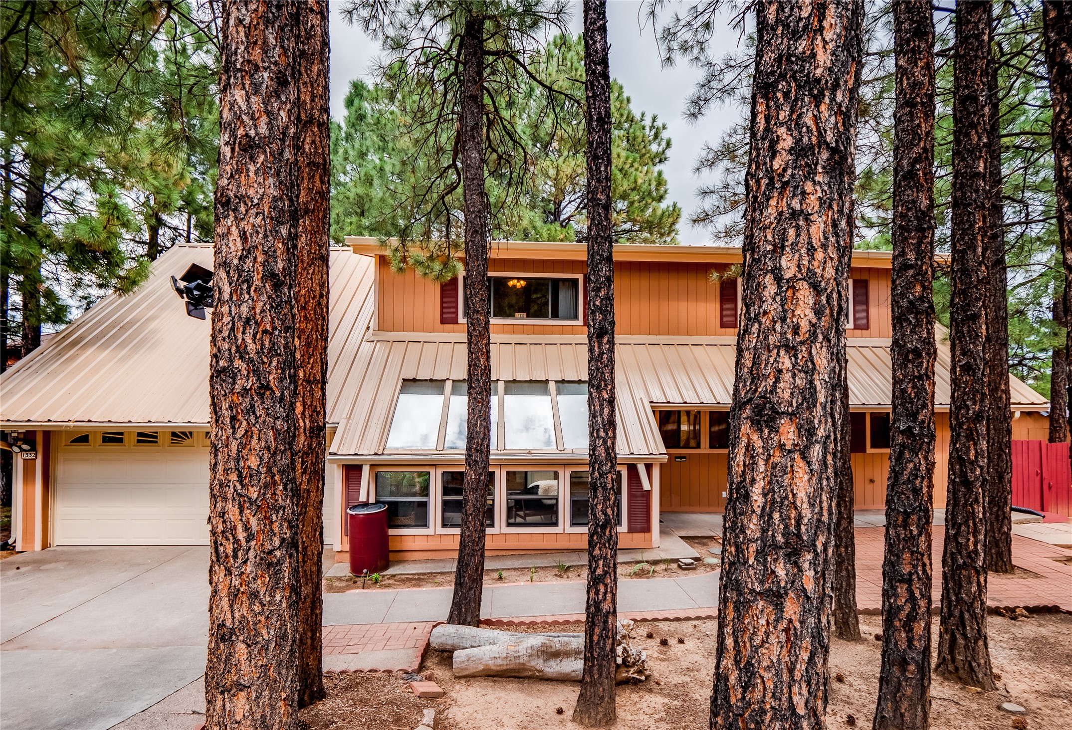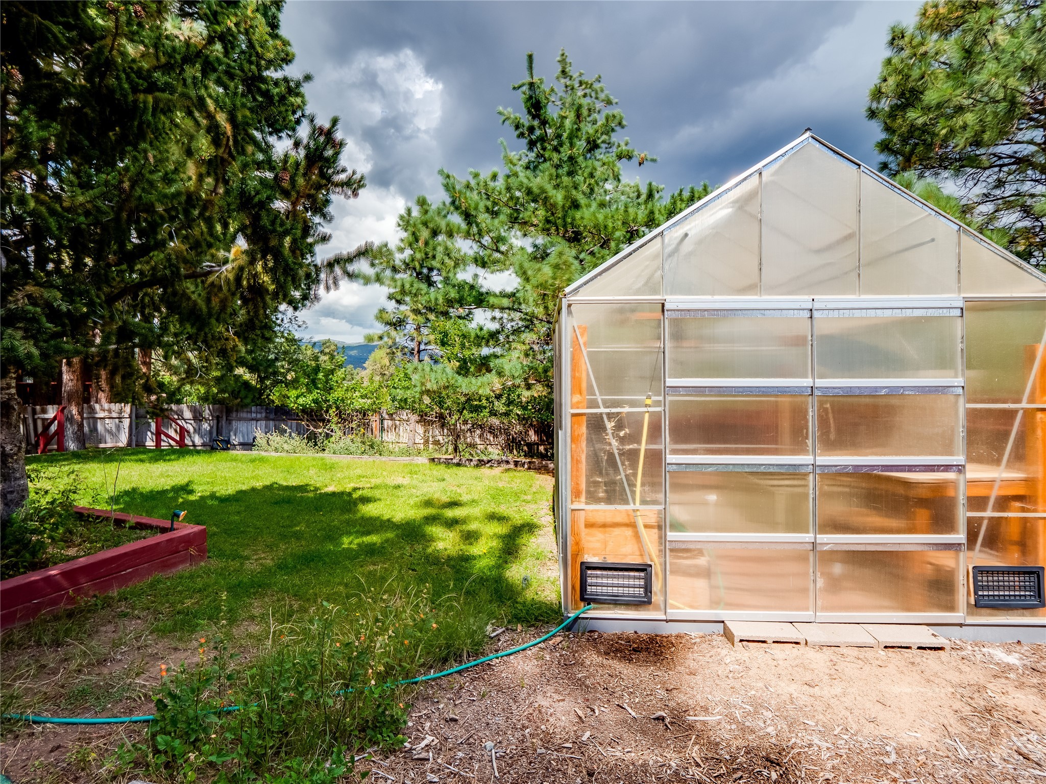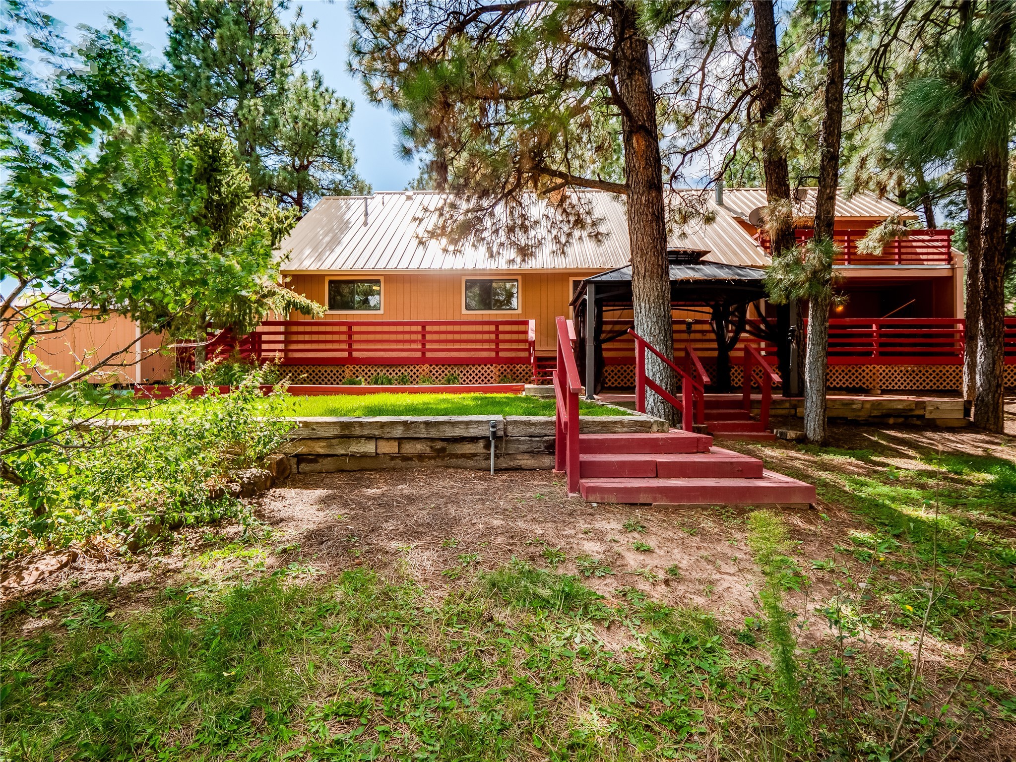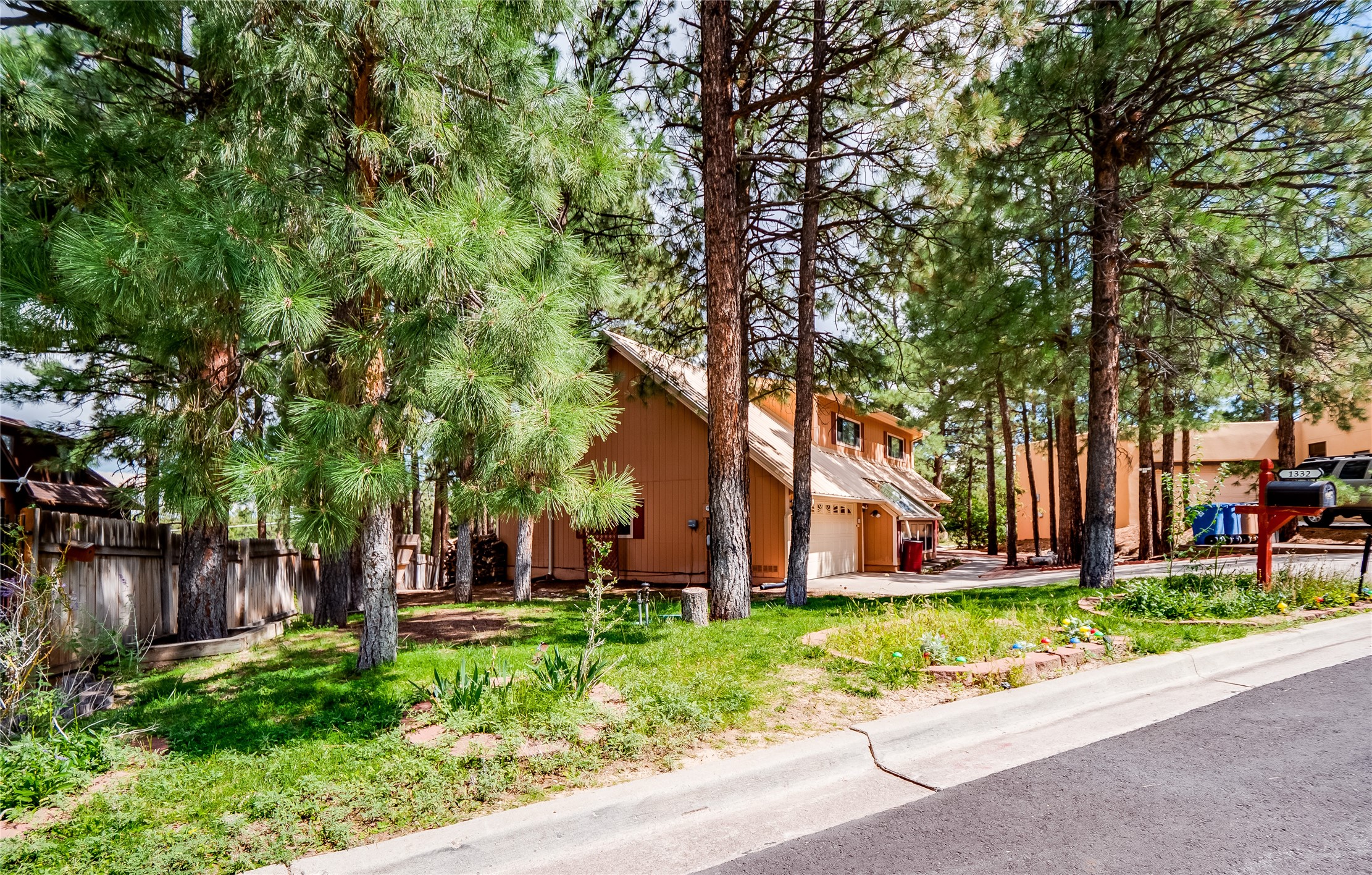 Welcome to this beautiful two-story home in the highly sought-after North Mesa neighborhood! Nestled on a wooded lot with a lush grass lawn, vibrant flower beds, and mature trees, the inviting curb appeal leads you to a charming sunroom-style front porch with stone flooring and direct access to the two-car garage. Step inside through one of two entryways, including sliding doors that open into the warm and welcoming living room. Here, vaulted ceilings create a spacious atmosphere while a stunning corner stone wood-burning fireplace serves as the focal point. Sliding doors extend the living space outdoors to a covered wood deck overlooking the expansive backyard--complete with fruit trees, mature landscaping, a grassy lawn, greenhouse, and storage shed, making it a true outdoor retreat. The dining and kitchen area features tile flooring, a tray ceiling with a skylight, and a thoughtful layout perfect for everyday living. The kitchen is equipped with warm wood cabinets accented by black hardware, light counters, a tile backsplash, and stainless steel appliances. Down the hall, the main level also offers a comfortable guest en-suite with a walk-in shower, an additional guest bedroom, a full guest bathroom with a single sink vanity, and a convenient laundry closet. Upstairs, plush carpet leads to a cozy loft-style family room with built-in cabinet bookcases, ideal for reading or gathering. A bright guest bedroom provides storage space and sliding doors that open to a private deck with breathtaking mountain views. The large primary en-suite is a peaceful retreat, featuring a spacious walk-in closet and extra storage. The bathroom is designed with a white single sink vanity with granite counters located within the bedroom, while a separate enclosed space houses the walk-in glass shower and toilet for added privacy. This fantastic home is in a prime location close to the golf course, trails, horse stables, and schools. Don't miss your chance to own this one-of-a-kind home!