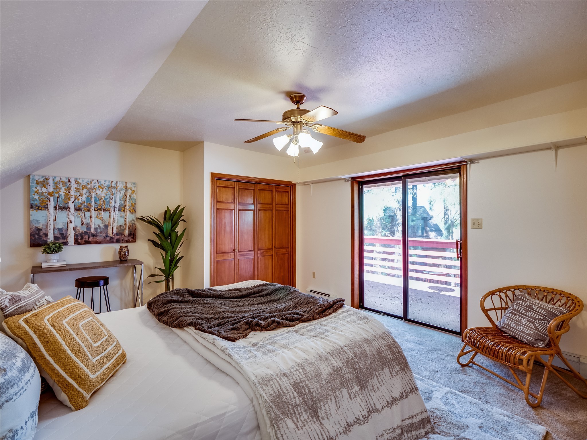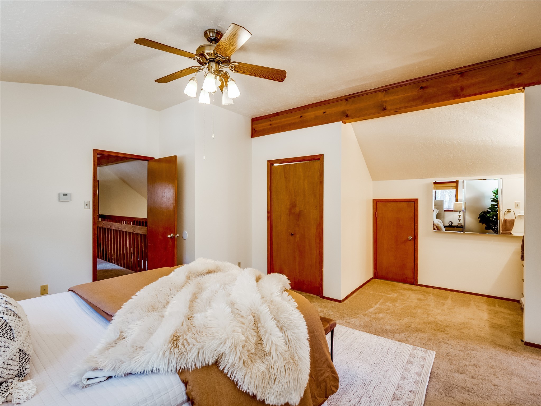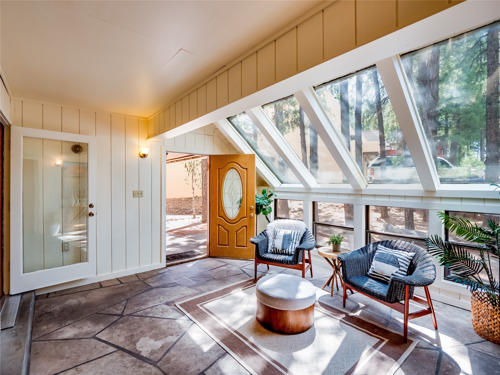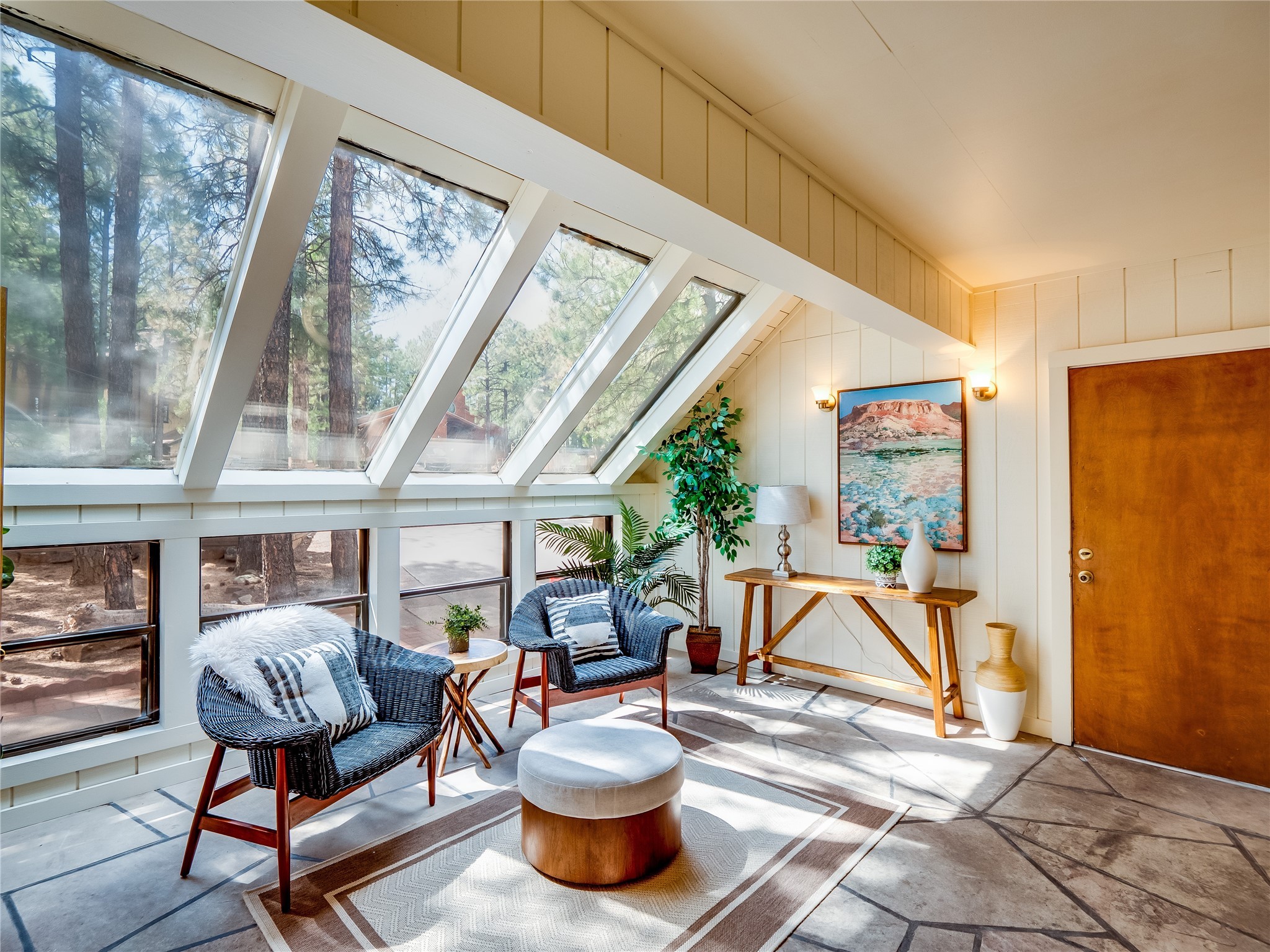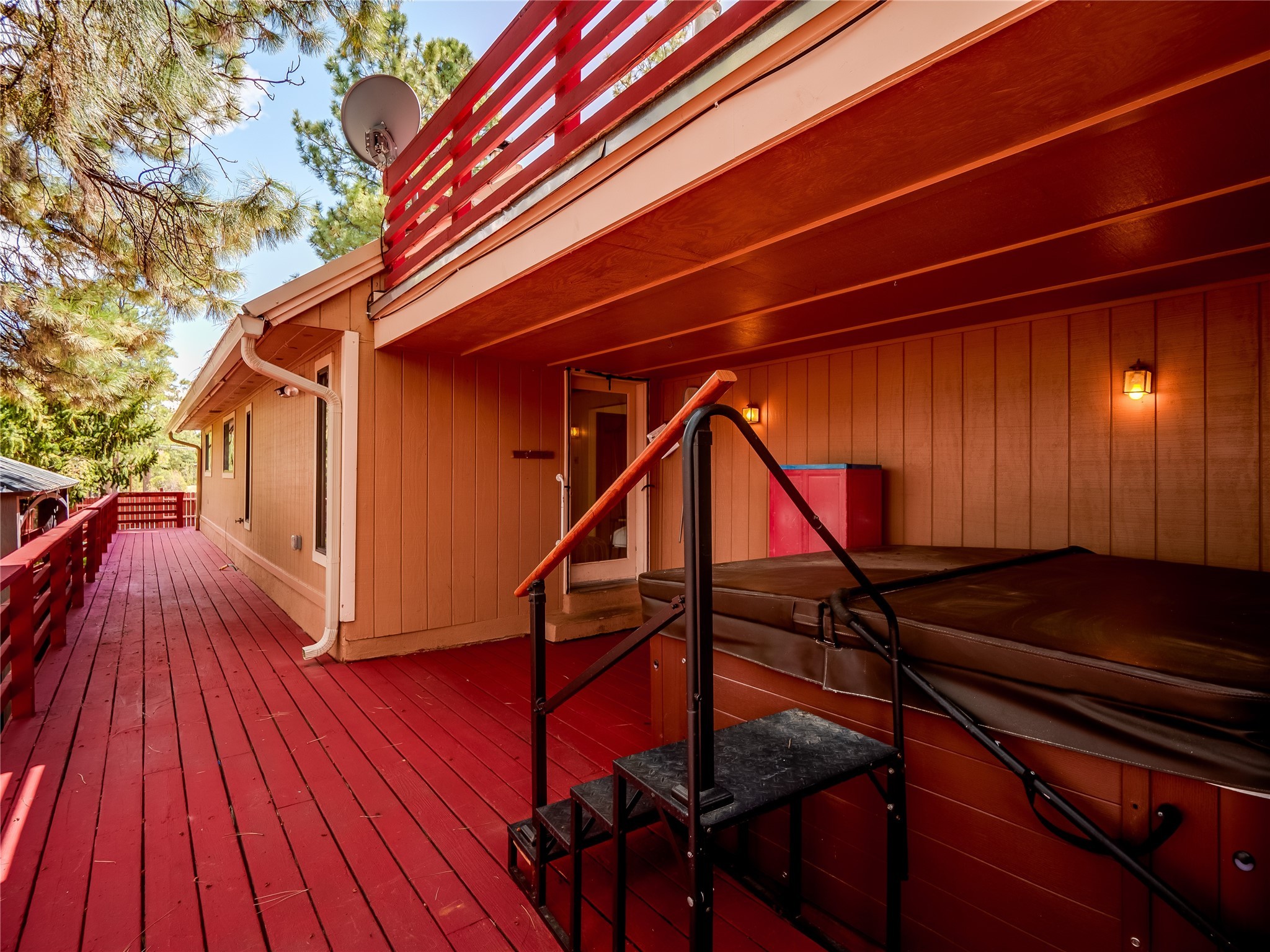 Welcome to this beautiful two-story home in the highly sought-after North Mesa neighborhood! Nestled on a wooded lot with a lush grass lawn, vibrant flower beds, and mature trees, the inviting curb appeal leads you to a charming sunroom-style front porch with stone flooring and direct access to the two-car garage. Step inside through one of two entryways, including sliding doors that open into the warm and welcoming living room. Here, vaulted ceilings create a spacious atmosphere while a stunning corner stone wood-burning fireplace serves as the focal point. Sliding doors extend the living space outdoors to a covered wood deck overlooking the expansive backyard--complete with fruit trees, mature landscaping, a grassy lawn, greenhouse, and storage shed, making it a true outdoor retreat. The dining and kitchen area features tile flooring, a tray ceiling with a skylight, and a thoughtful layout perfect for everyday living. The kitchen is equipped with warm wood cabinets accented by black hardware, light counters, a tile backsplash, and stainless steel appliances. Down the hall, the main level also offers a comfortable guest en-suite with a walk-in shower, an additional guest bedroom, a full guest bathroom with a single sink vanity, and a convenient laundry closet. Upstairs, plush carpet leads to a cozy loft-style family room with built-in cabinet bookcases, ideal for reading or gathering. A bright guest bedroom provides storage space and sliding doors that open to a private deck with breathtaking mountain views. The large primary en-suite is a peaceful retreat, featuring a spacious walk-in closet and extra storage. The bathroom is designed with a white single sink vanity with granite counters located within the bedroom, while a separate enclosed space houses the walk-in glass shower and toilet for added privacy. This fantastic home is in a prime location close to the golf course, trails, horse stables, and schools. Don't miss your chance to own this one-of-a-kind home!