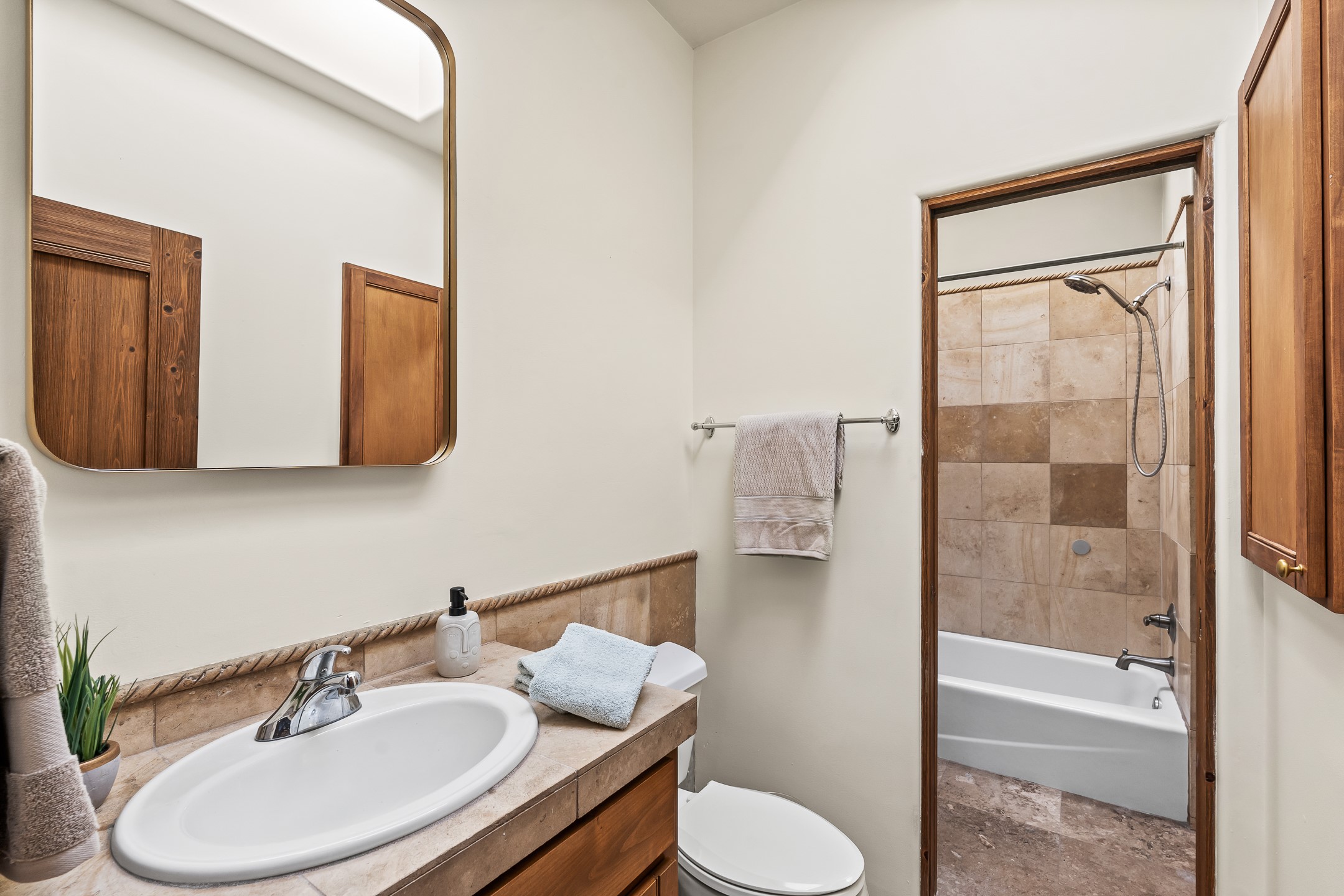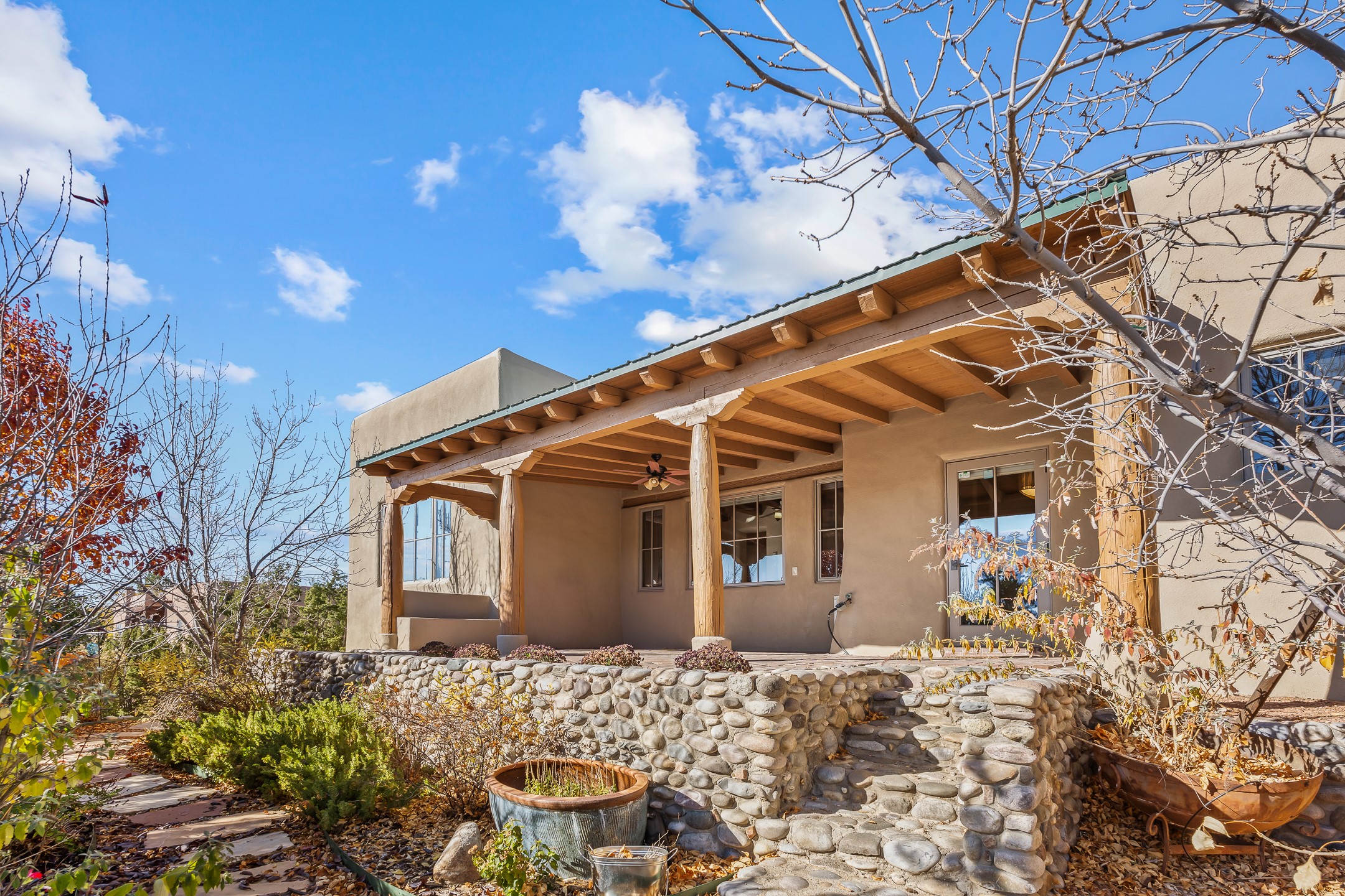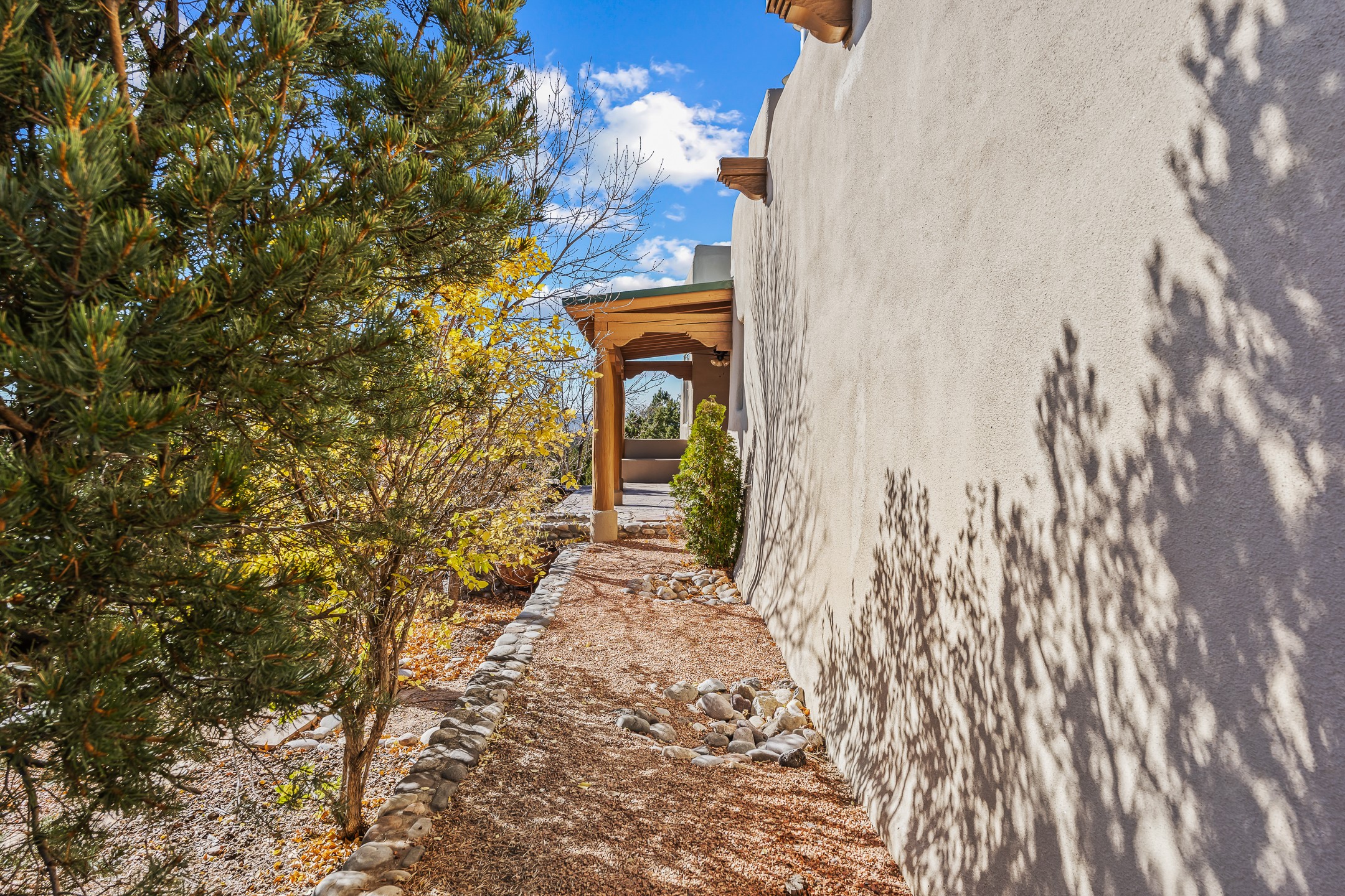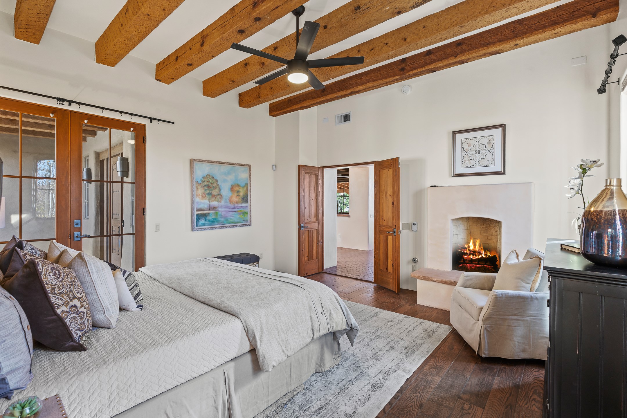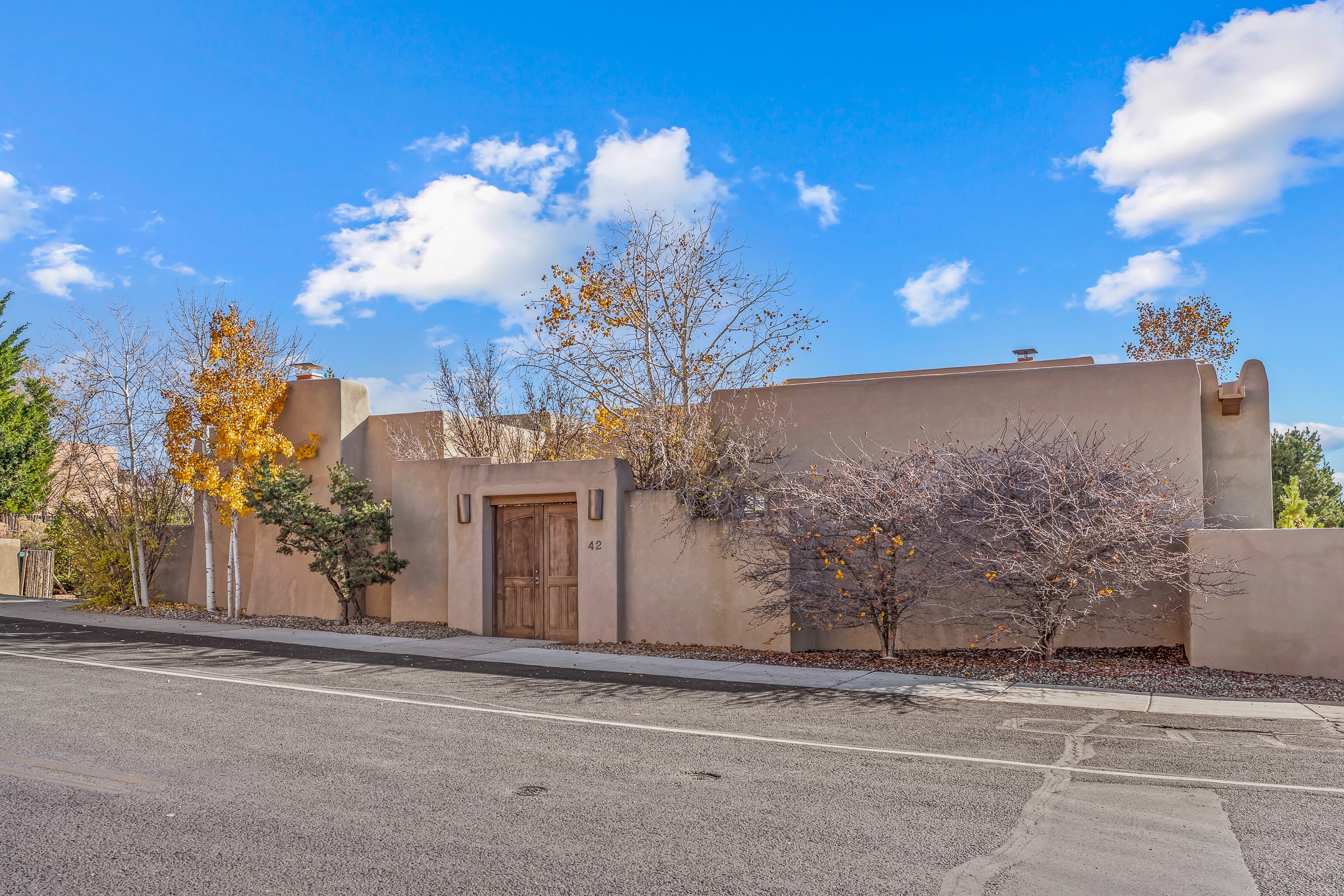 42 E. Va Plaza Nueva offers a warm embrace of classic Santa Fe style within the highly desirable community of Aldea de Santa Fe. This 2,392-square-foot residence features 3 bedrooms, 2.5 baths, and a 2-car garage, blending timeless craftsmanship with inviting indoor-outdoor living.Enter through a private front courtyard and step into a home rich with Old World charm. Brick and tile floors run throughout, complementing the carved wood beams, vigas, and hand-troweled plaster walls in the main living areas. The expansive living room feels gracious and grounded, ideal for quiet evenings or elegant entertaining.The third bedroom, with its own separate entrance and cozy fireplace, offers versatility--perfect as a guest suite or a comfortable home office with added privacy.The kitchen is appointed with wood cabinetry, a gas cooktop and vent hood, double wall ovens, and granite counters accented by tile surrounds. A cozy breakfast nook creates an inviting place to savor your morning coffee.Designed for Santa Fe's coveted lifestyle, the home's outdoor living and dining spaces are surrounded by mature landscaping and back up to open space, creating a serene setting with views to the Sandias to enjoy year-round.Located in desirable Aldea de Santa Fe, a vibrant village-style community, residents enjoy 13 miles of walking trails, extensive shared open space, a community center, and tennis, basketball, and bocce courts. Neighborhood life is enhanced further with annual art tours, community garage sales, and a variety of active clubs--participate as much or as little as you like.This home embodies the warmth, texture, and tradition of Old Santa Fe while offering the amenities of a welcoming, engaged community.