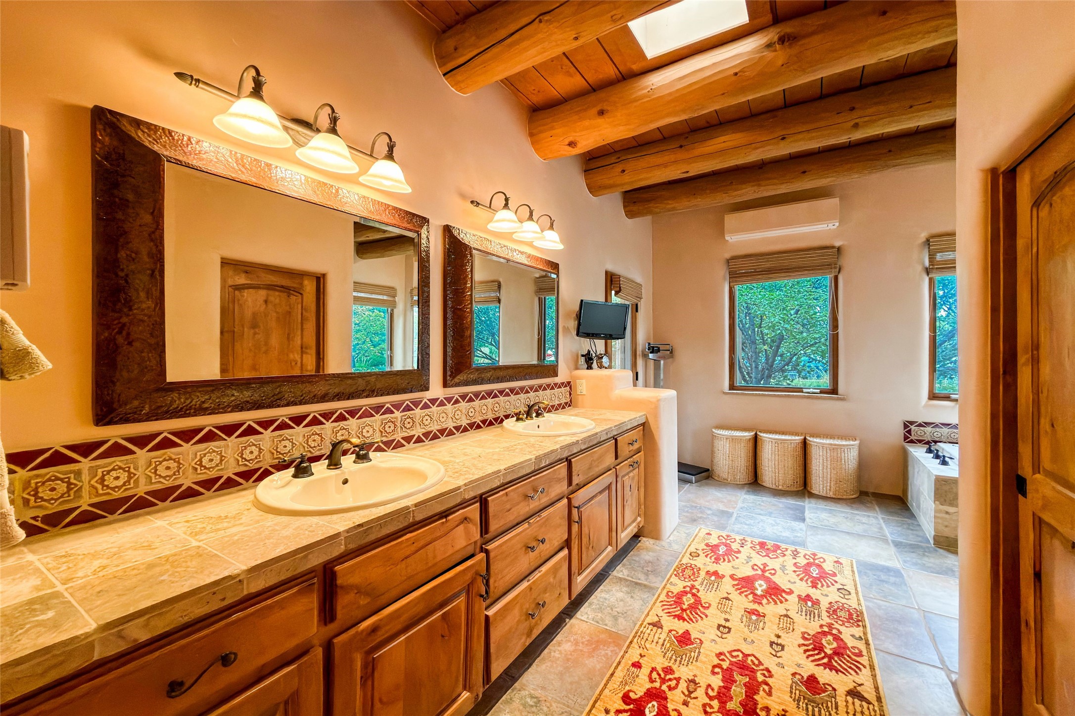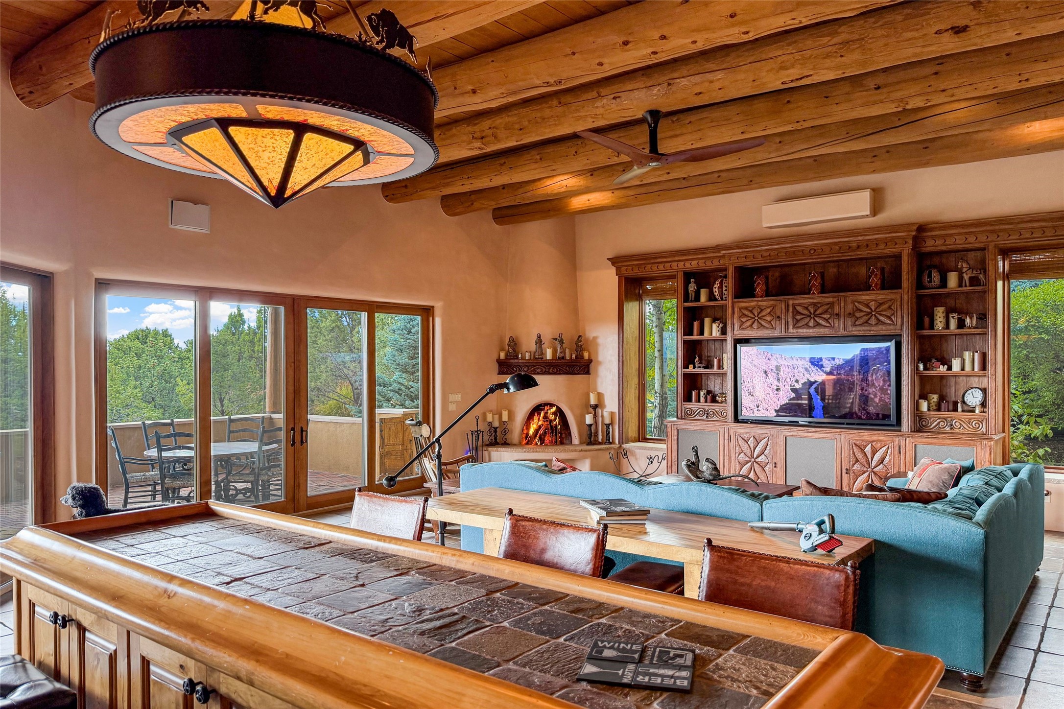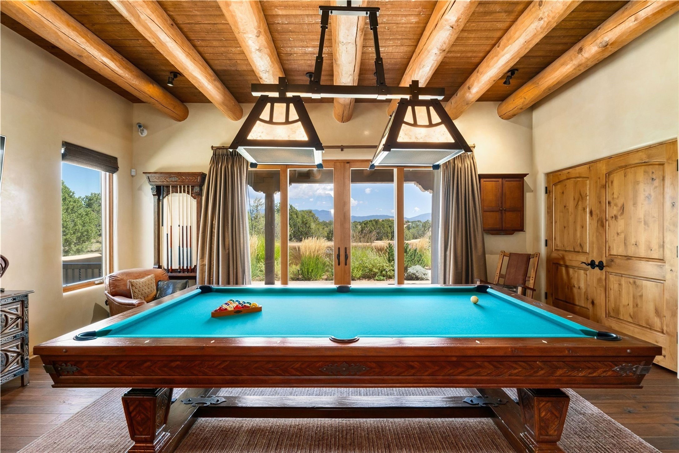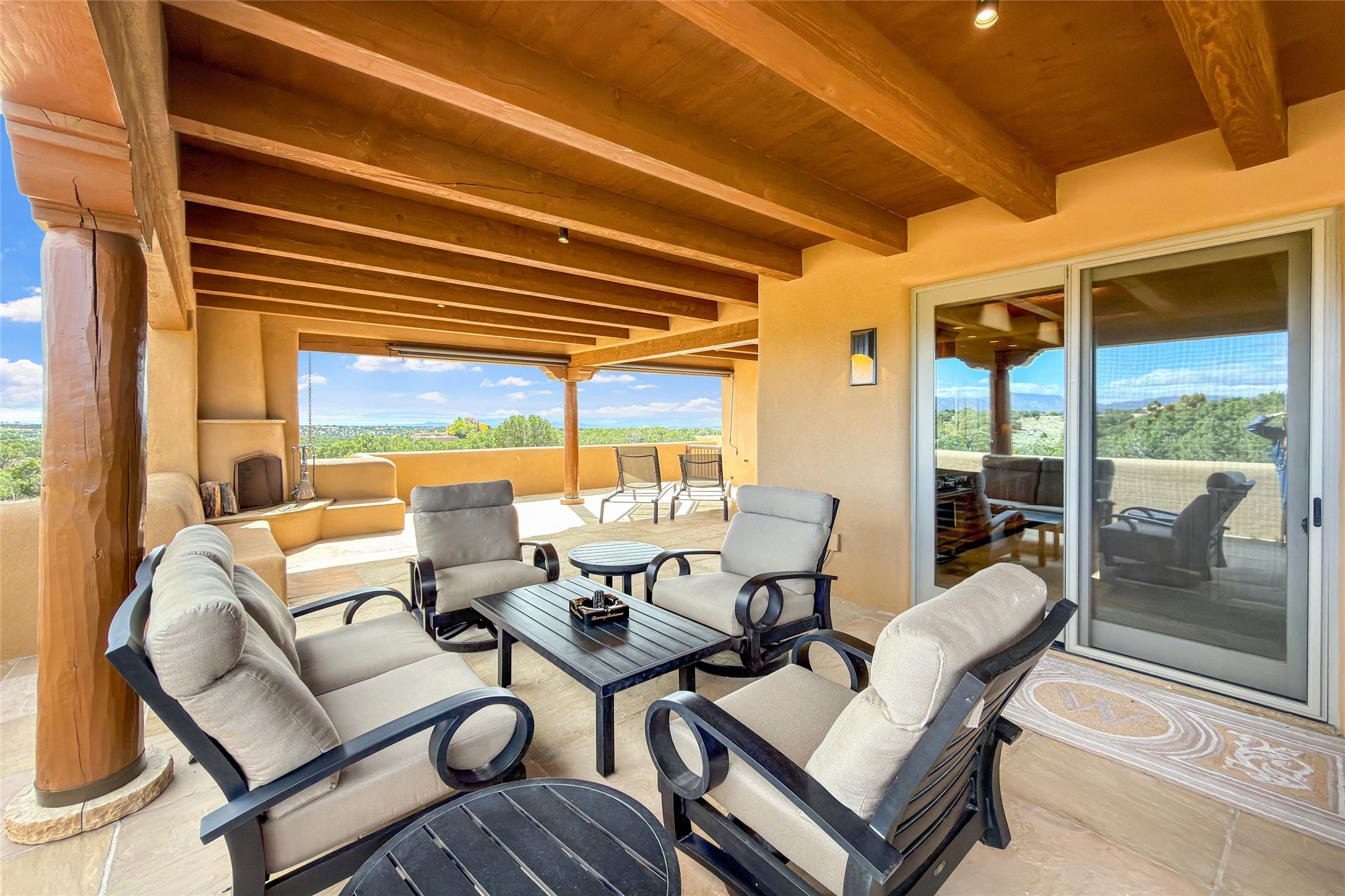 Set high on a private hilltop, and enjoying sunset mountain views, this custom Pueblo Revival compound embodies craftsmanship, substance, and timeless Santa Fe style. Built with quality at every turn and refreshed with a new roof and stucco, the property is introduced by a grand, gated courtyard with center fountain, full poured concrete drive, and a spacious garage for 4 cars. The 3-bedroom main residence, remodeled by Kim Dressel in 2012, reveals artisan details from the moment you step into the dramatic Zaguan entry. Finishes include slate floors, carved woodwork by master craftsman David Naylor, thick plaster walls, and a freestanding bar that anchors the open living and dining spaces. The chef's island kitchen features Wolf, Sub-Zero, and wine refrigeration, ideal for both daily living and entertaining. The split-bedroom layout offers privacy, while the primary suite is a sanctuary with dual closets, built-ins with fridge, kiva fireplace, and a dedicated exercise room. Outdoor living extends to multiple portals, a rooftop deck with 360 mountain views, a full kitchen, fireplace, and an elegant in-ground cocktail pool. The 3,050 sq. ft. second residence, newly built by Kim Dressel in 2013, echoes the same solid construction and fine finishes. With 2 bedrooms, 2 living rooms, a full kitchen and dining space, carved details by David Naylor, and far-reaching Sangre de Cristo and Jemez views, it offers luxurious comfort. Special features include a built-in bar, 90-inch screen with 9-speaker theater, and an expansive portal with pizza oven, grill, and fireplace. Additional amenities--a workshop, generator, and 15,000 gallon irrigation cistern--enhance function and reliability. Only 15 minutes from The Plaza and Santa Fe Airport, this compound is ideal for multi-generational living or hosting guests in a one-of-a-kind setting where custom design, quality finishes, and Pueblo Revival authenticity define the experience. A contiguous 1.7-acre lot on Black Mesa may be available separately. Membership to the Club at Las Campanas is available for purchase and upon approval.