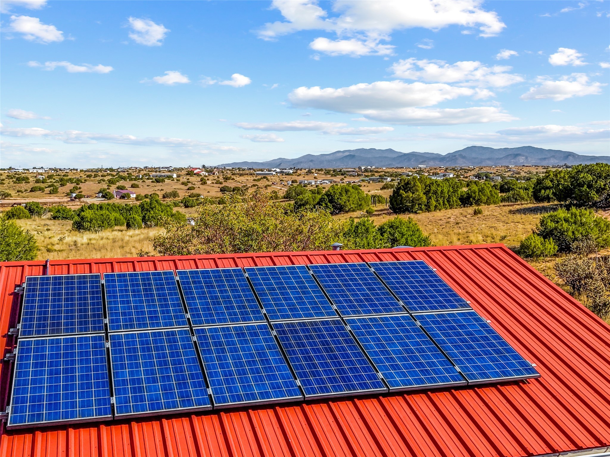 This sparkling, light-filled New Mexico ranch house, set on a gentle hillside among mature trees, wildflowers, and expansive mountain views, offers an easy blend of indoor and outdoor living. It includes 3+ fully fenced acres, located on a quiet road just north of the historic, artists' village of Cerrillos and just south of Santa Fe. Horses are allowed or may be boarded nearby. Inside, a thoughtfully designed layout flows from room to room, offering versatility for entertaining, home-business, or family use. The spacious living room has a wood-burning stove and convenient pass-through access to the kitchen. The kitchen features custom tiled floors and trim, all new appliances, and ample counter space. A large adjoining dining area is surrounded by tall windows. It opens to a covered patio and rear courtyard, complete with a ramada for shade and a fire ring for cool-season conversations under the stars. The primary suite catches the morning sun and opens onto a secluded rock garden. It features a lavish tiled bath and walk-in closet. Down the hall you'll find two generously sized bedrooms, a recently restyled bath with soaking tub, and flexible space for your office, media, studio, or whatever you can imagine. Grid-tied solar PV, a high efficiency gas furnace, upgraded windows and insulation assure low energy bills for years to come. A new water heater, supplemental water storage, and Pro-Panel roof round out the practicality of this beautiful place you'll want to come home to. Highly rated charter schools with bus service nearby. Outdoor furnishings and equipment will stay if desired. Seller financing available.