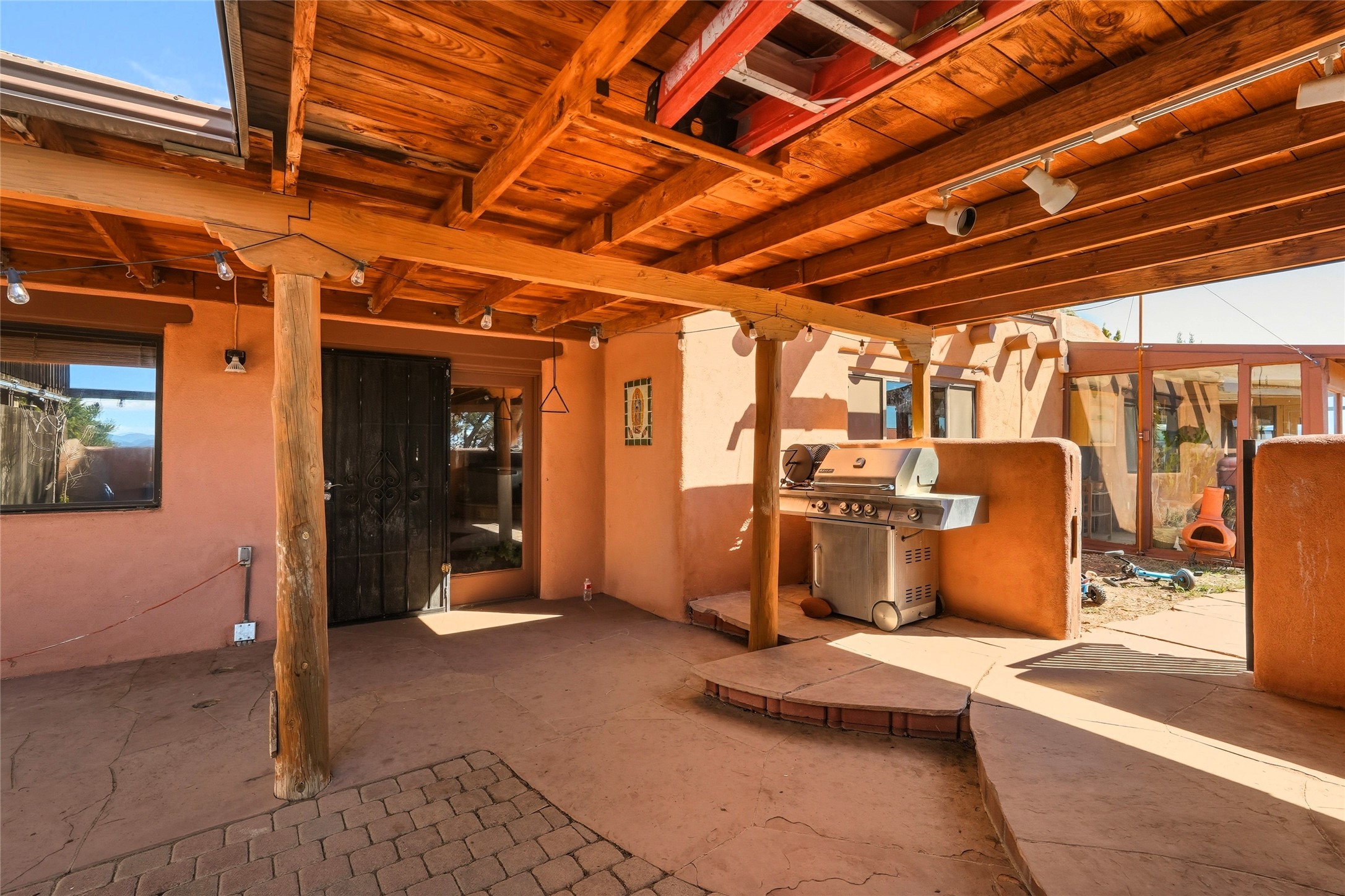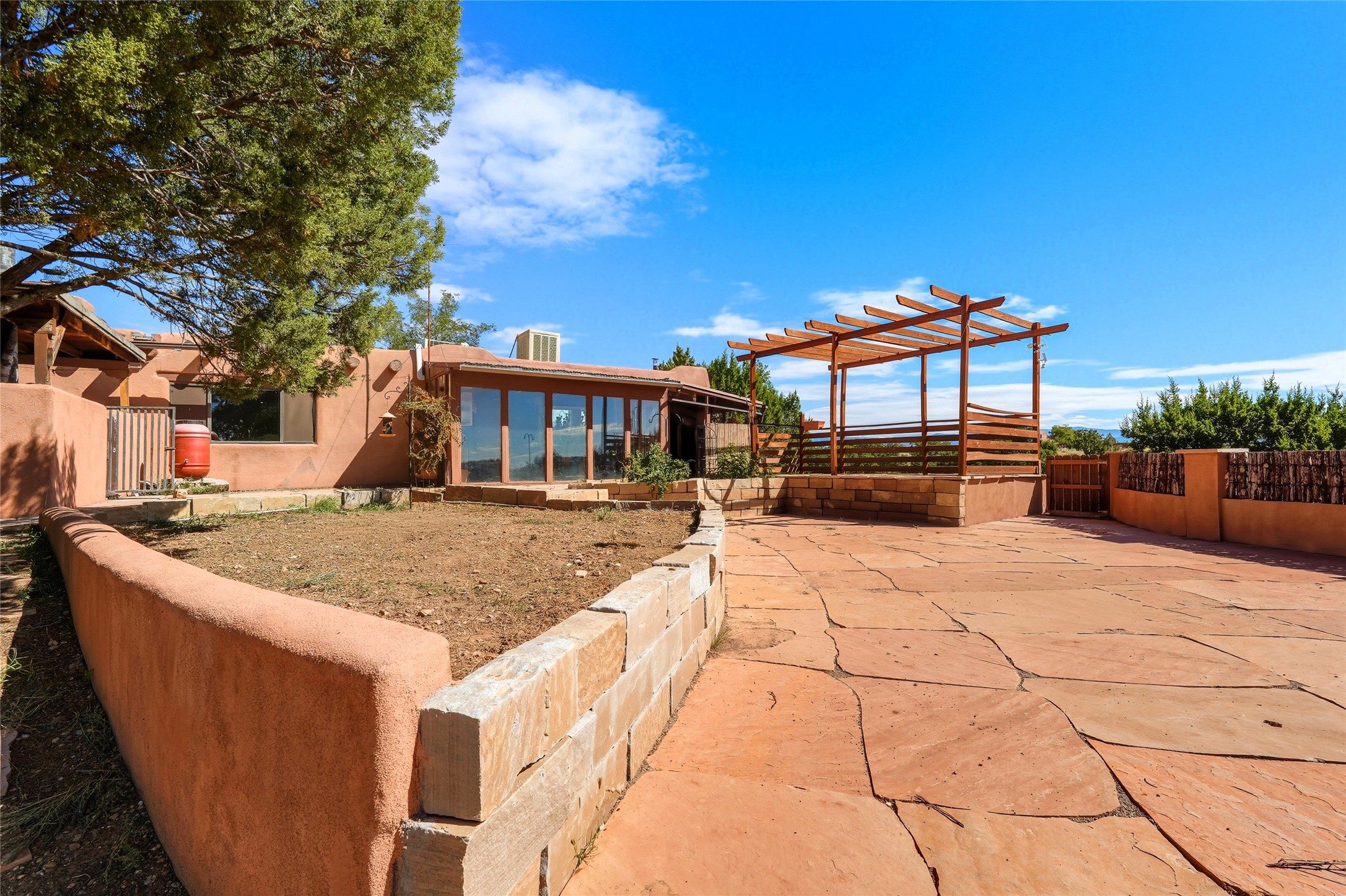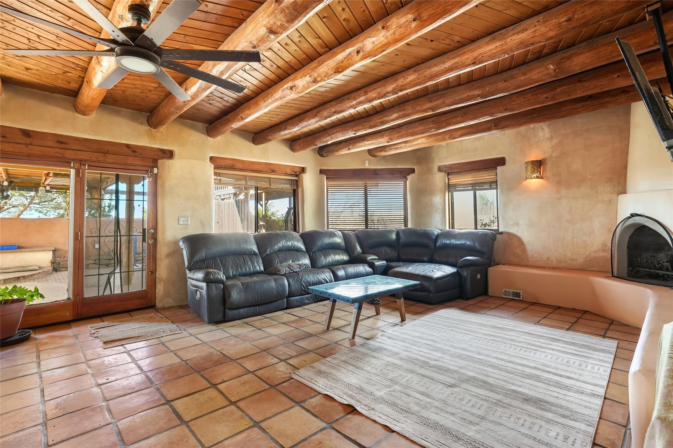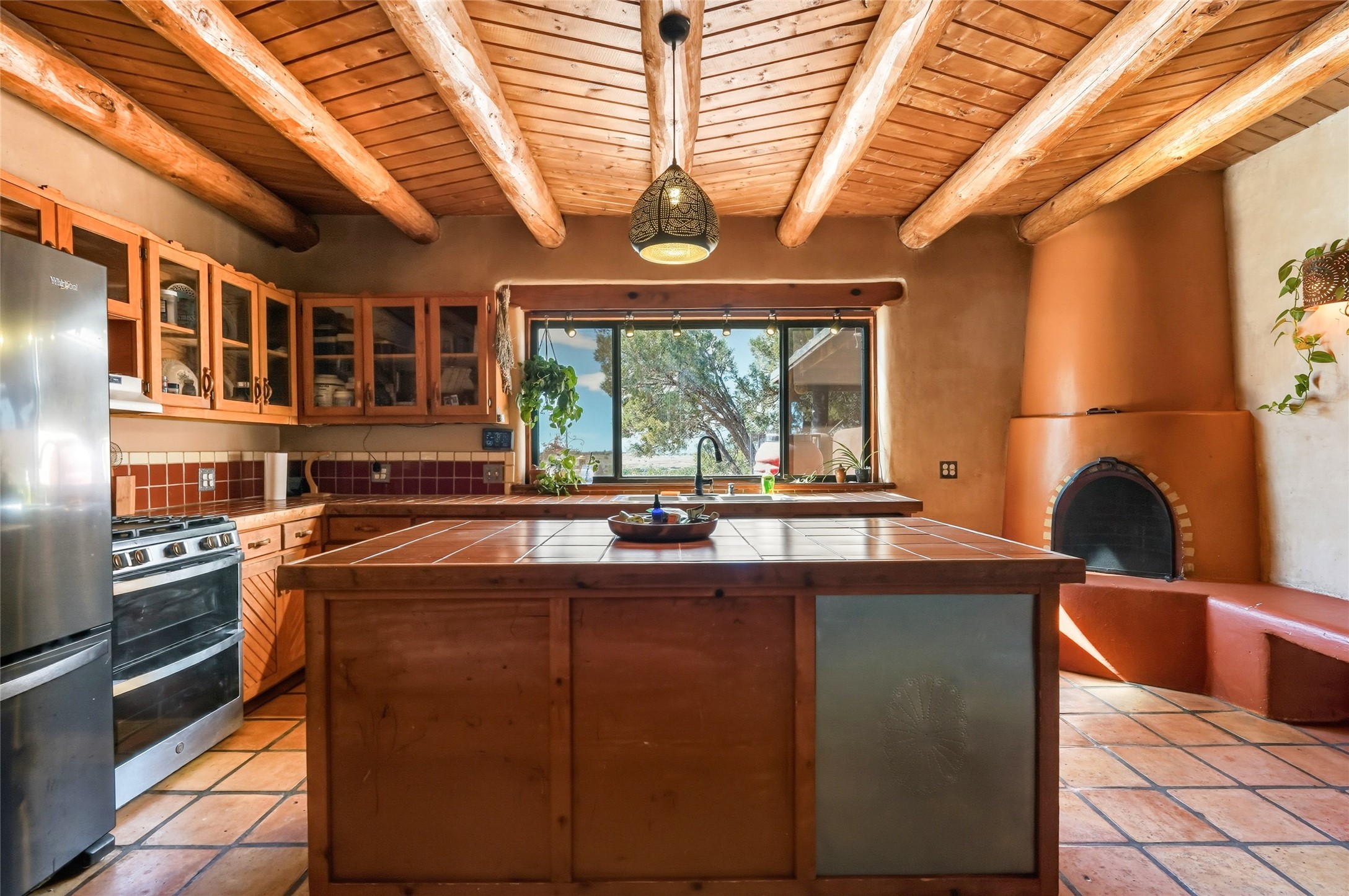 Experience classic Santa Fe charm in this Pueblo-style home nestled on 2.5 acres with sweeping views. The 2-bedroom, 2-bathroom main residence spans 2,134 sq. ft. and showcases authentic Southwestern details, including vigas, a cozy kiva fireplace, and inviting living spaces designed for comfort and style. A spacious flagstone patio extends the living outdoors, offering the perfect spot for entertaining or enjoying peaceful sunsets. Gardeners will appreciate the on-site greenhouse, ideal for year-round cultivation. The property also features a 500 sq. ft. guest house with its own kitchen, bathroom, and two flexible rooms that are perfect for hosting visitors, creating an art studio, or rental. This retreat offers the rare combination of privacy, natural beauty, and convenient access to downtown Santa Fe amenities.