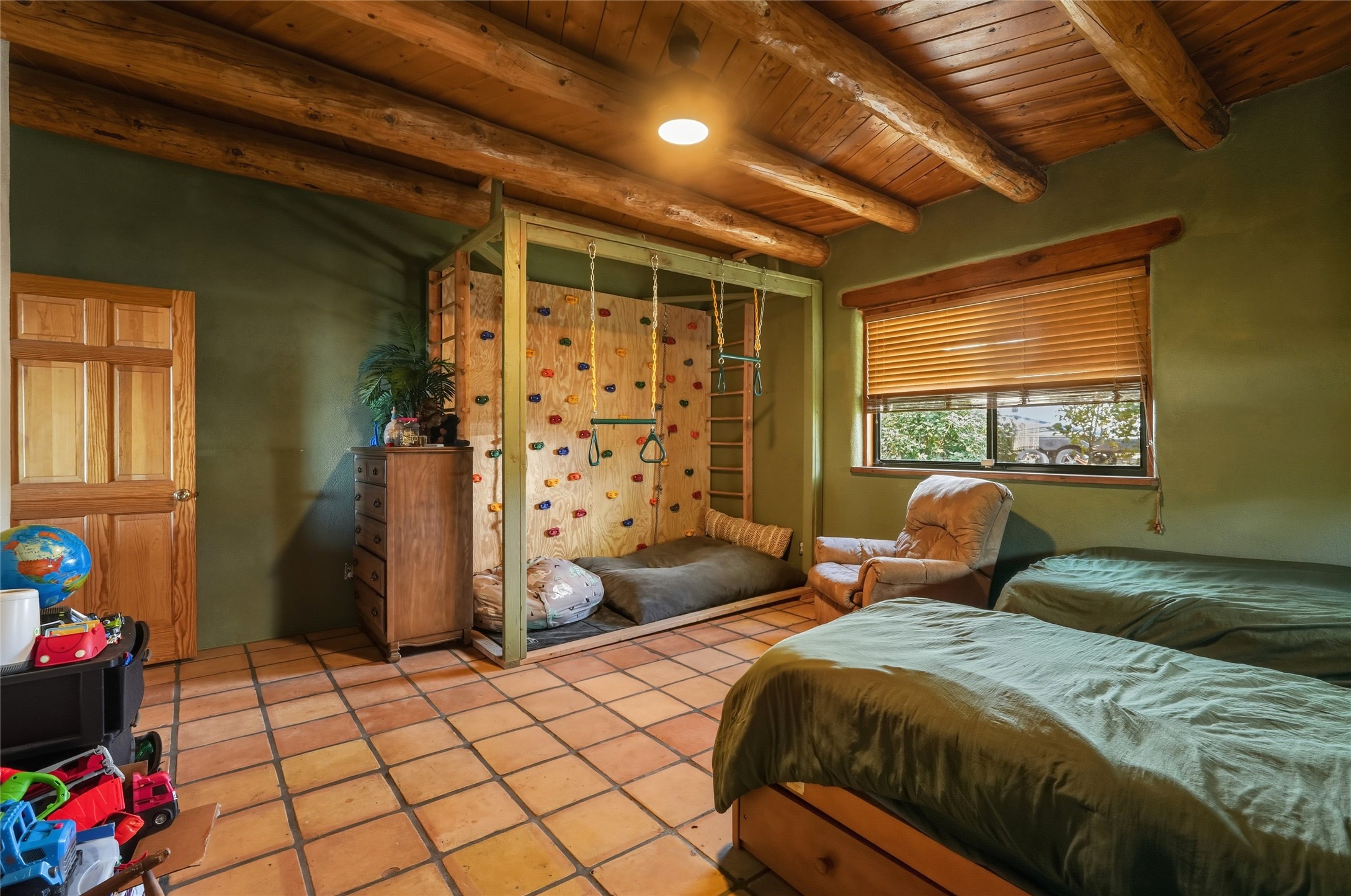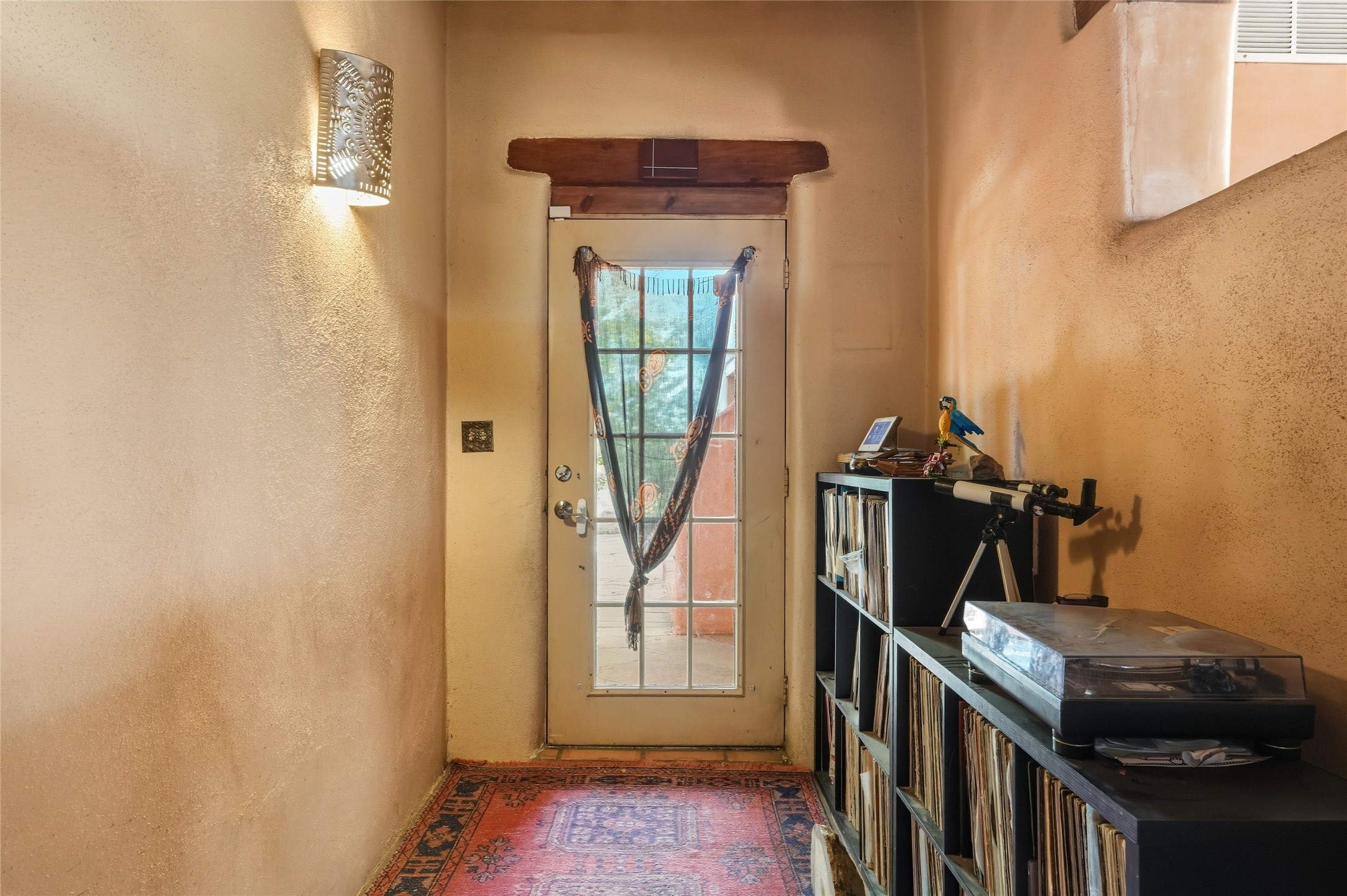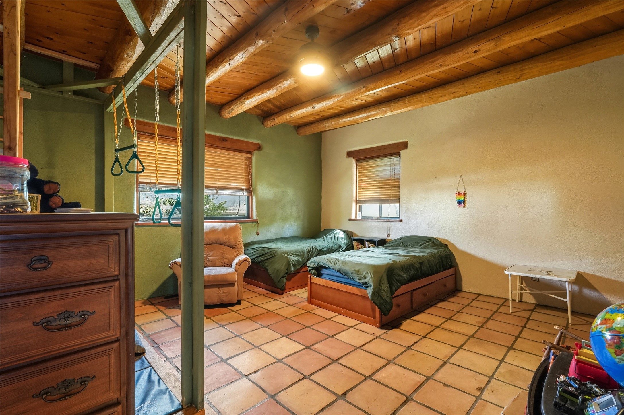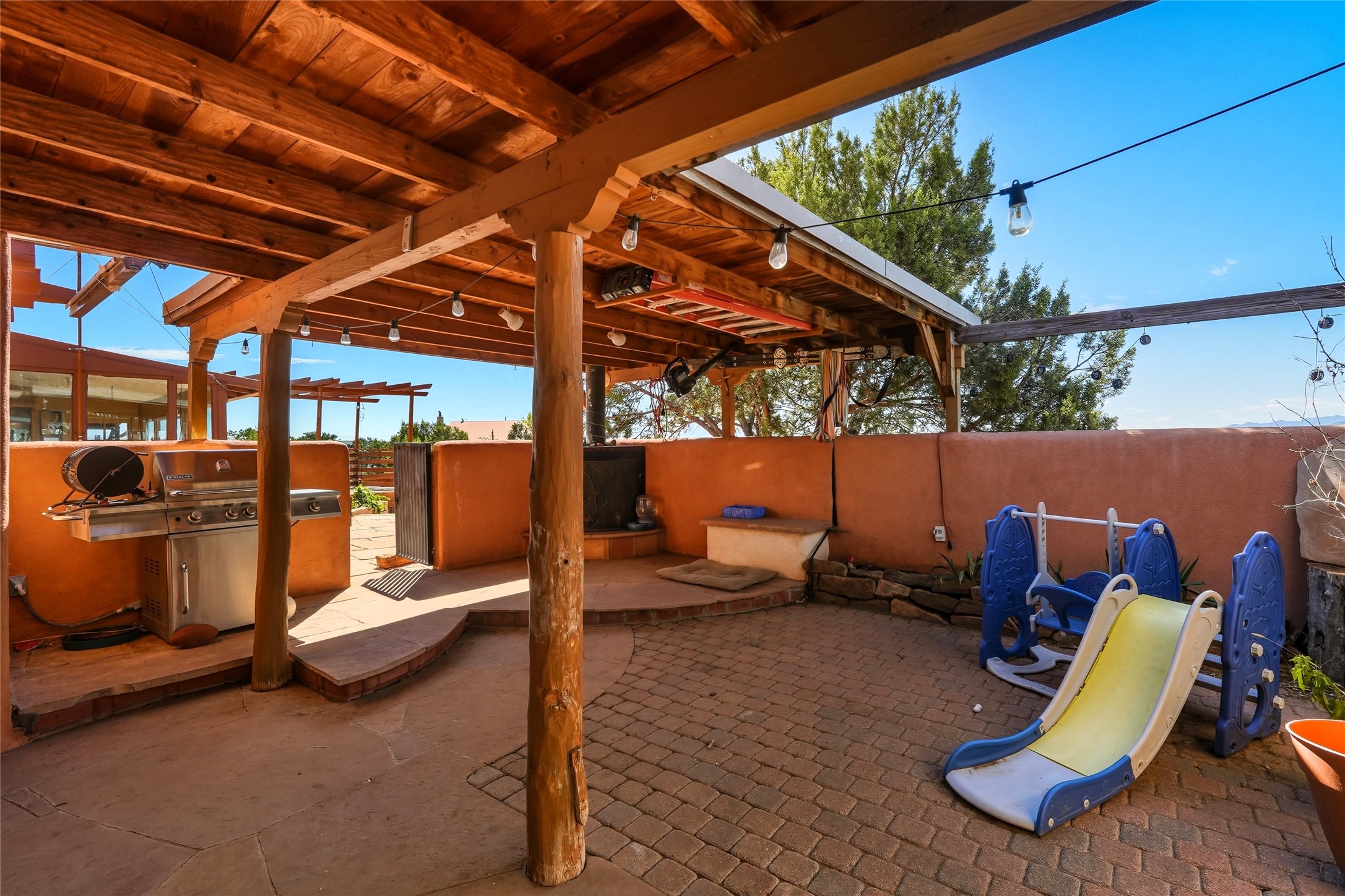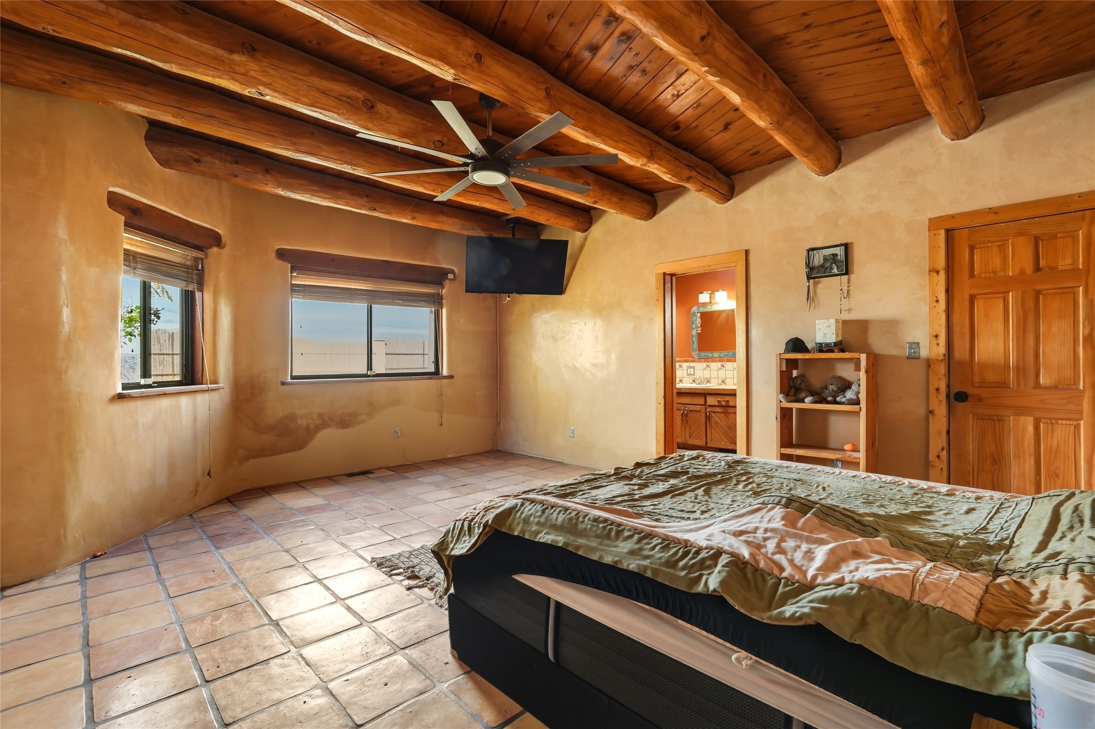 Experience classic Santa Fe charm in this Pueblo-style home nestled on 2.5 acres with sweeping views. The 2-bedroom, 2-bathroom main residence spans 2,134 sq. ft. and showcases authentic Southwestern details, including vigas, a cozy kiva fireplace, and inviting living spaces designed for comfort and style. A spacious flagstone patio extends the living outdoors, offering the perfect spot for entertaining or enjoying peaceful sunsets. Gardeners will appreciate the on-site greenhouse, ideal for year-round cultivation. The property also features a 500 sq. ft. guest house with its own kitchen, bathroom, and two flexible rooms that are perfect for hosting visitors, creating an art studio, or rental. This retreat offers the rare combination of privacy, natural beauty, and convenient access to downtown Santa Fe amenities.