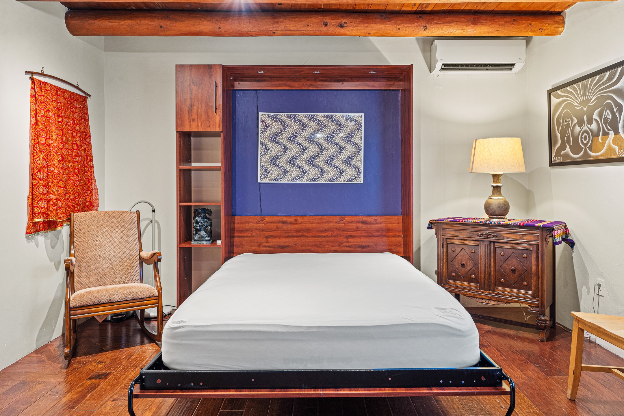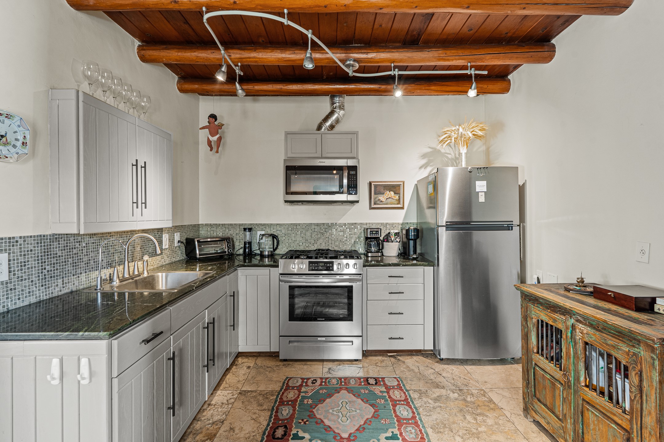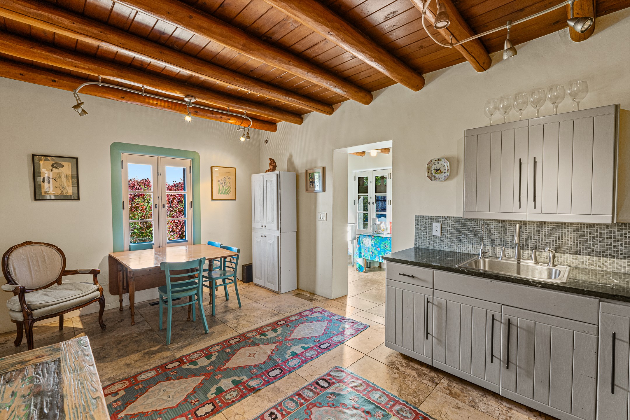 Beautifully renovated commercial property featuring sustainable, green design elements in the bustling S. St. Francis corridor, designed by Scott Irving. Step into a welcoming reception and waiting area with hardwood floors and viga ceilings throughout. The front of the building includes three windowed offices and two restrooms, one of which is ADA accessible. The updated kitchen/breakroom features track lighting and modern appliances.Toward the back of the building, you'll find a private office with an en suite restroom and hardwood floors, along with a large office or conference room that opens to a private, fenced, landscaped courtyard shaded by mature trees. Additional features include washer/dryer connections, abundant storage, and on-site parking. This property is ideal for office users, medical professionals, and many other business types. Don't miss this opportunity!