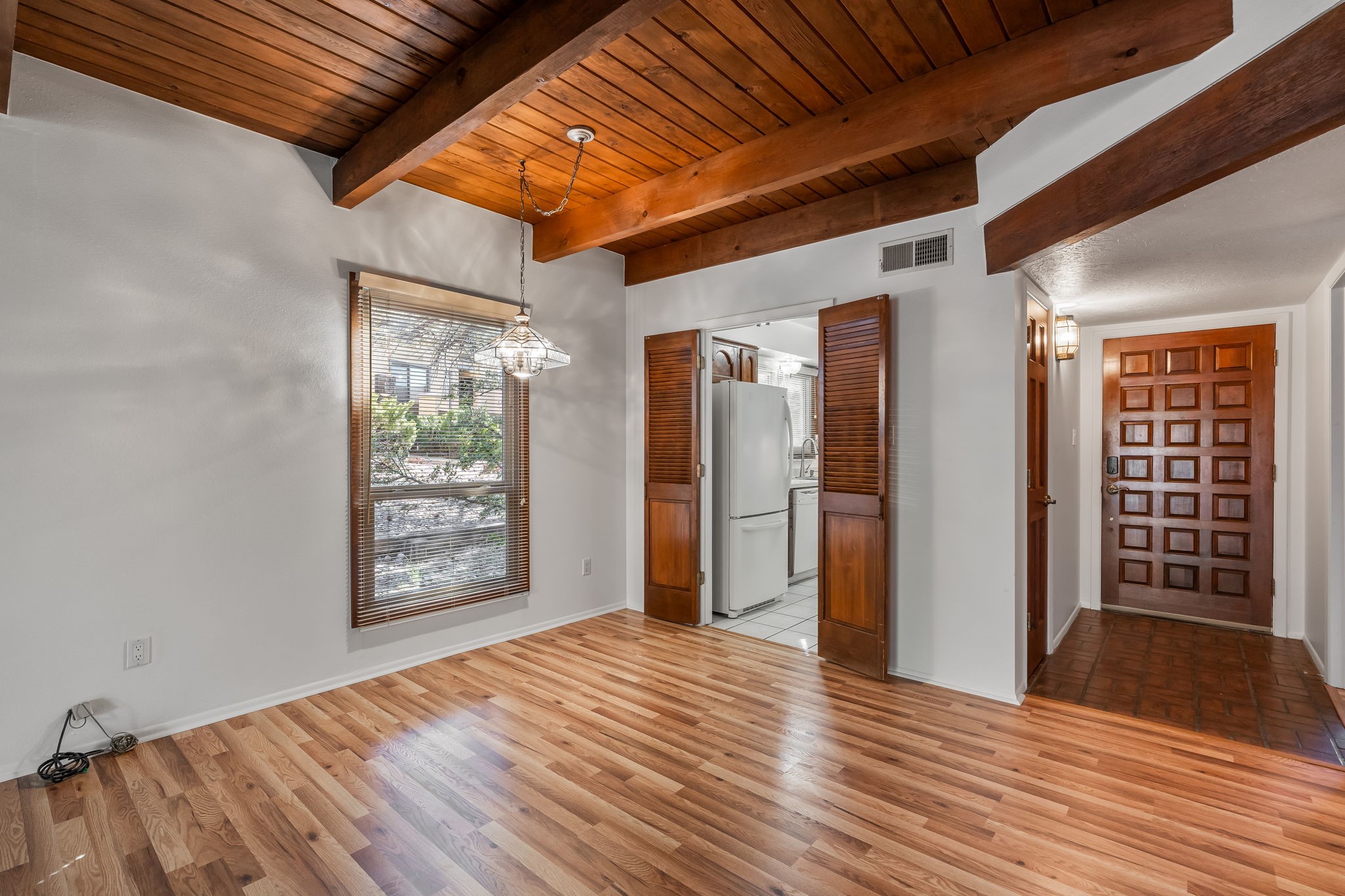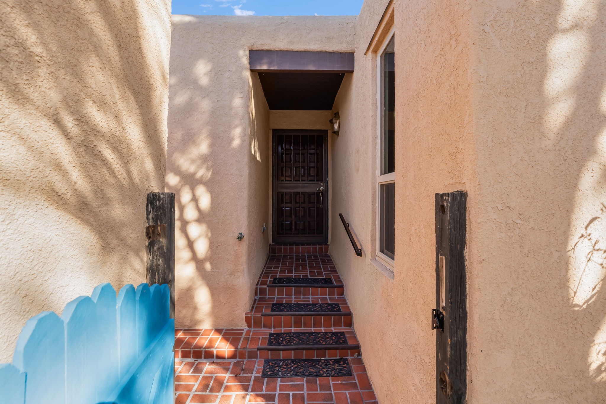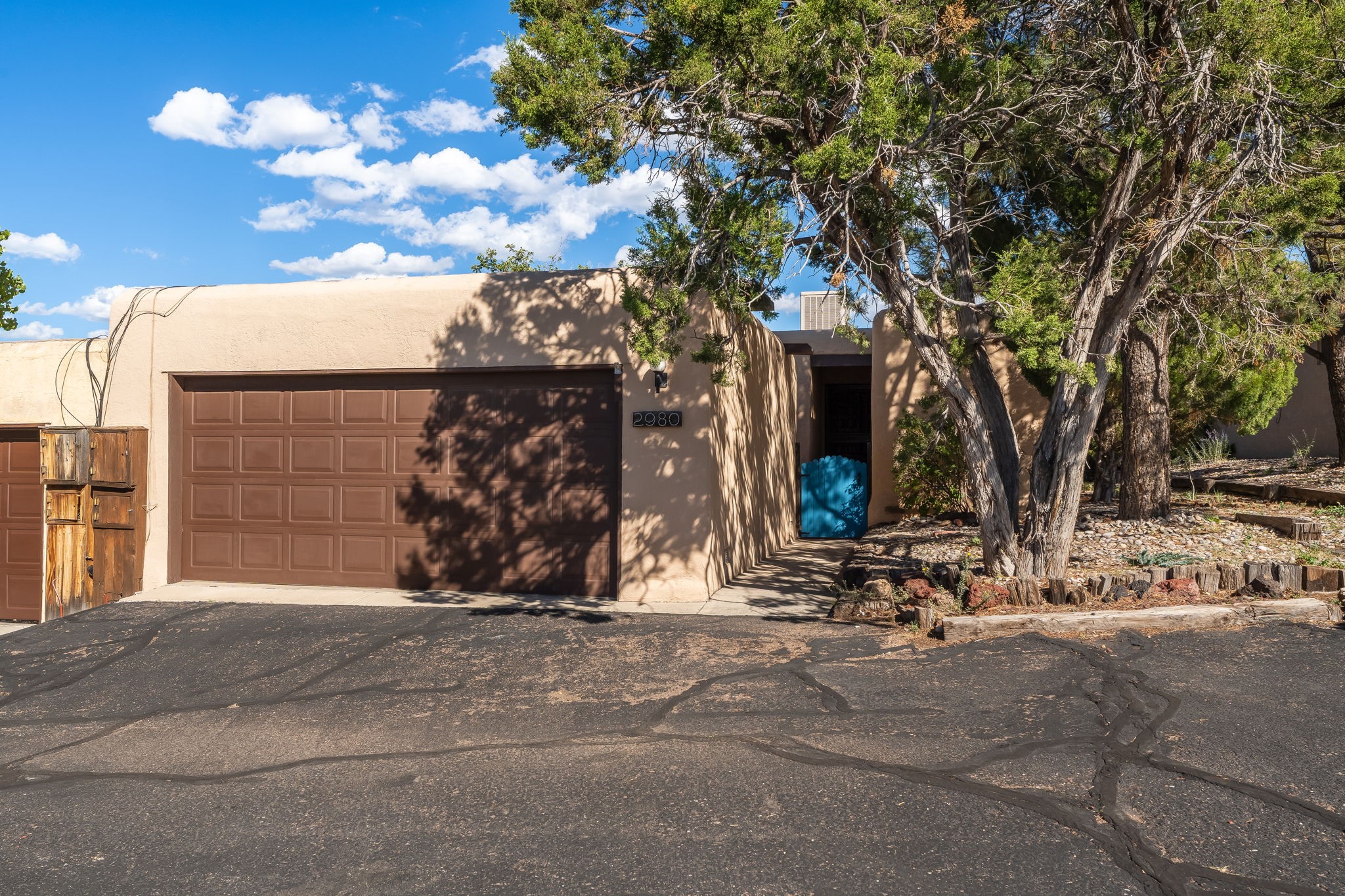 Welcome home to this beautifully refreshed single-story townhouse offering 2 bedrooms, an office, and timeless Santa Fe charm. Step through the inviting blue gate into a brick courtyard, where a sense of warmth and tranquility sets the tone for what's inside.Freshly painted throughout and featuring new laminate flooring, this home is move-in ready and thoughtfully designed for both comfort and style. Just off the entry hall, you'll find a versatile office--perfect for working from home or creative pursuits.The living room is a true highlight, showcasing a beamed ceiling, corner Kiva fireplace, and sliding doors that open to a spacious covered portal overlooking the backyard. A charming little gate leads directly to a neighborhood walking path, ideal for morning strolls or evening walks.The galley kitchen features tile floors, newer appliances, and a cozy breakfast area filled with natural light. The second bedroom includes a walk-in closet, while the generous primary suite offers a large picture window, walk-in closet, and a private bath.Outside, a detached two-car garage provides convenience and extra storage.Located in Park Plazas, one of Santa Fe's most beloved communities, residents enjoy miles of walking trails, tennis courts, an off-leash dog park, and a community garden--all just minutes from shopping, restaurants, and the Santa Fe Plaza.This home beautifully combines authentic Santa Fe character with modern updates and an unbeatable location. Come see why Park Plazas living is so special!