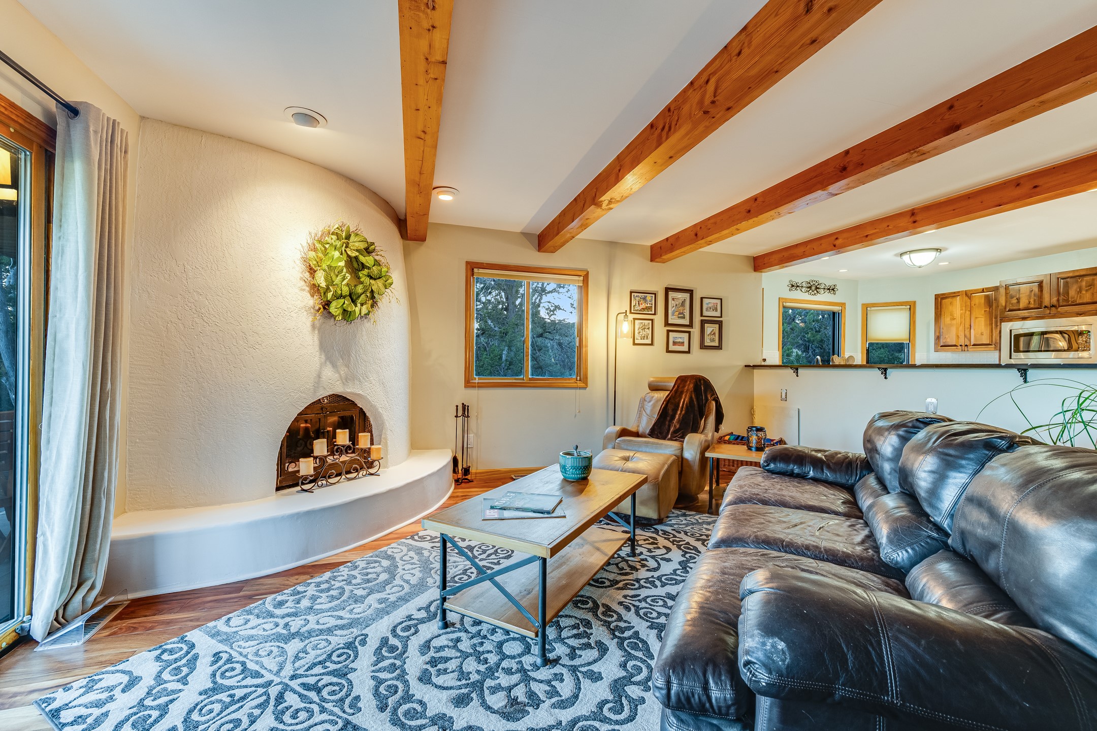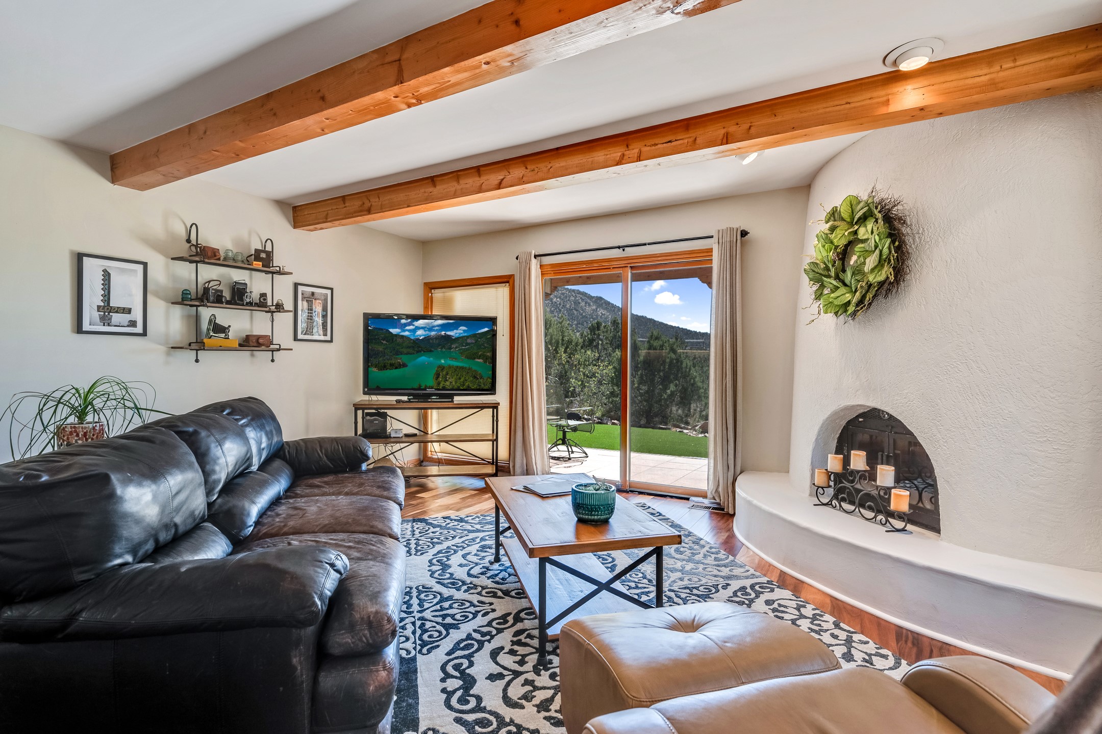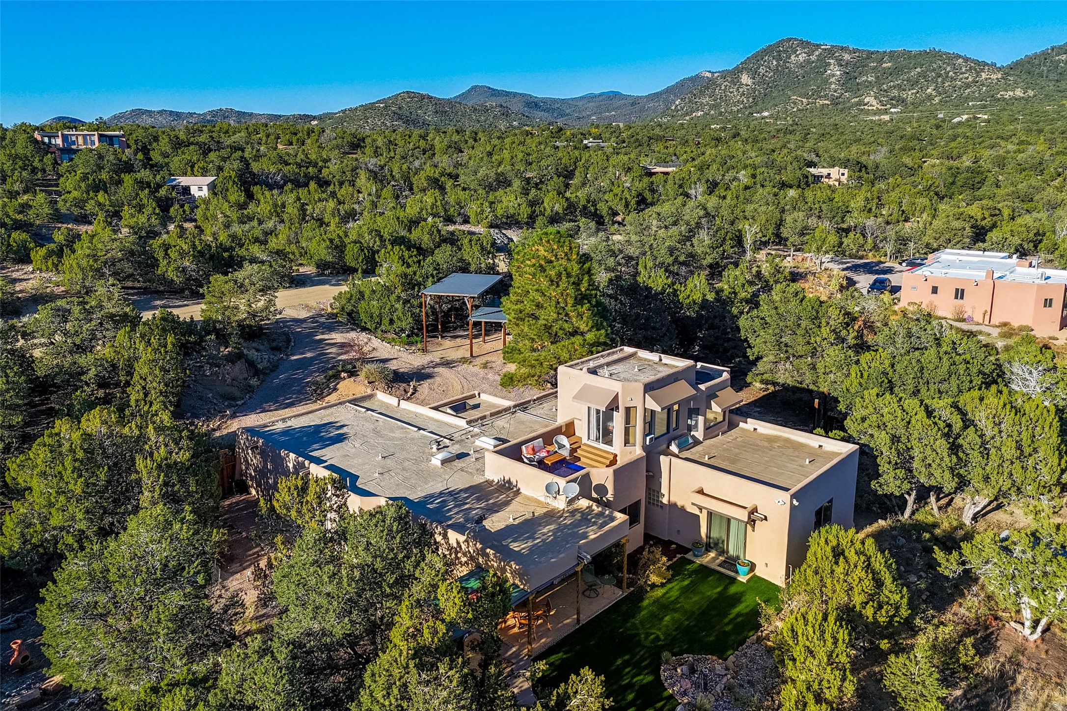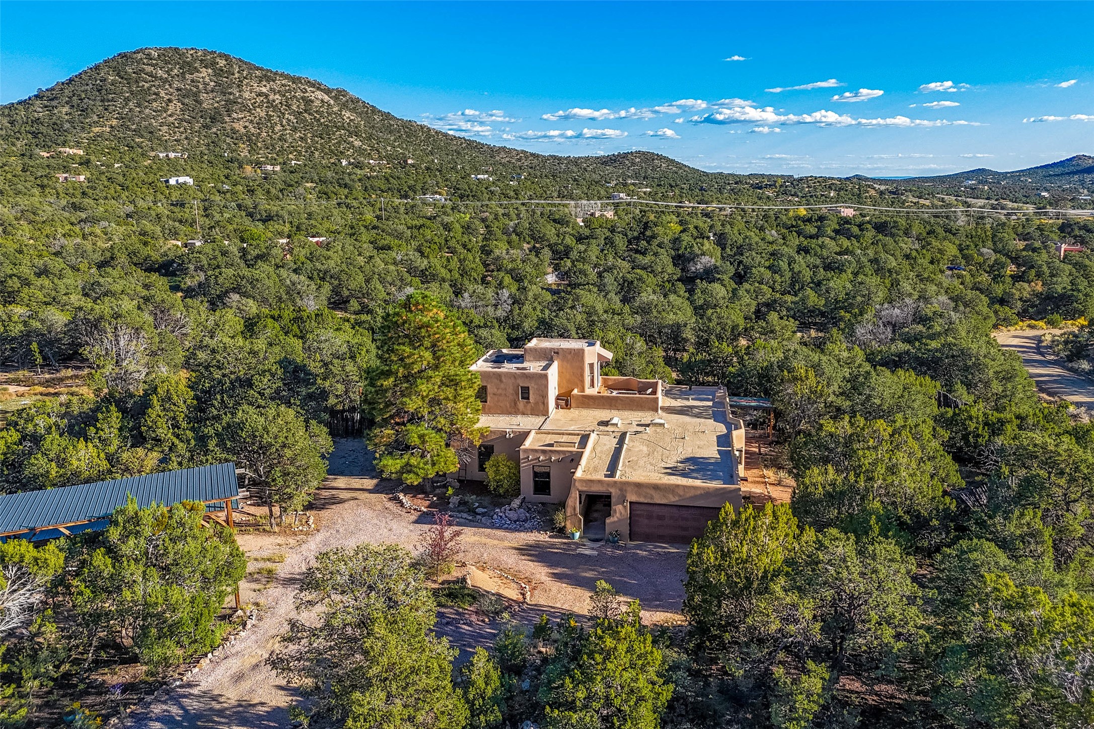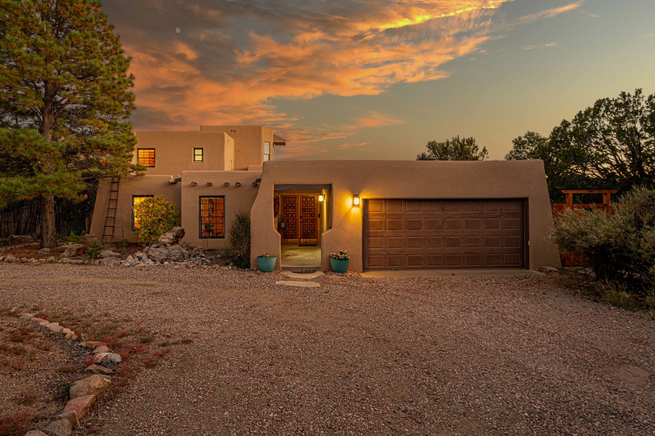 In a serene, tree-filled setting with sweeping views of the Sangre de Cristo foothills, this single-level 2600 sqft main residence offers comfort and privacy. Featuring three bedrooms and two bathrooms, a cheerful office with built-ins, separate living and dining rooms, and a completely renovated custom kitchen, the generous floor plan has space for everyone. Enjoy a cozy fire while watching the sun dip beyond the horizon or take in your morning coffee on the back portal while the fountain gurgles - this home will entice you to slow your pace and enjoy living amongst the pion trees. The primary bedroom is a true sanctuary, with a generous walk-in closet, a well-appointed ensuite bath, and direct backyard access to provide a seamless indoor-outdoor flow. A bonus room and a dedicated laundry room off the kitchen add to the functionality while the STUDIO CASITA (additional 478 sqft) with a private entrance is perfect for creative work, quiet retreats, and passive income. Other features include a tiled foyer, wood floors, beamed ceilings, stone countertops, and enhanced lighting throughout. Set on a private, 2+ acre lot with mature landscaping, the property is further augmented by a separate carport, RV space, an electric vehicle charger, and SOLAR PANELS for energy efficiency. Insurance was currently renewed, providing peace of mind. This property blends Southwest charm with modern updates and a flexible layout--a rare find with built-in investment opportunity.