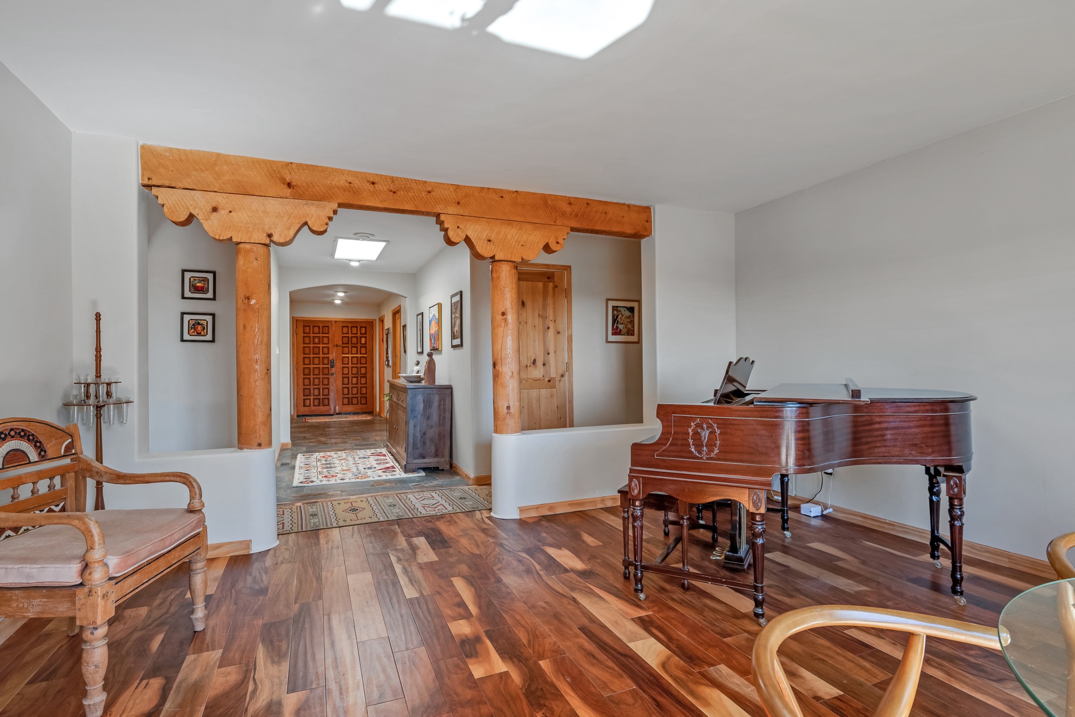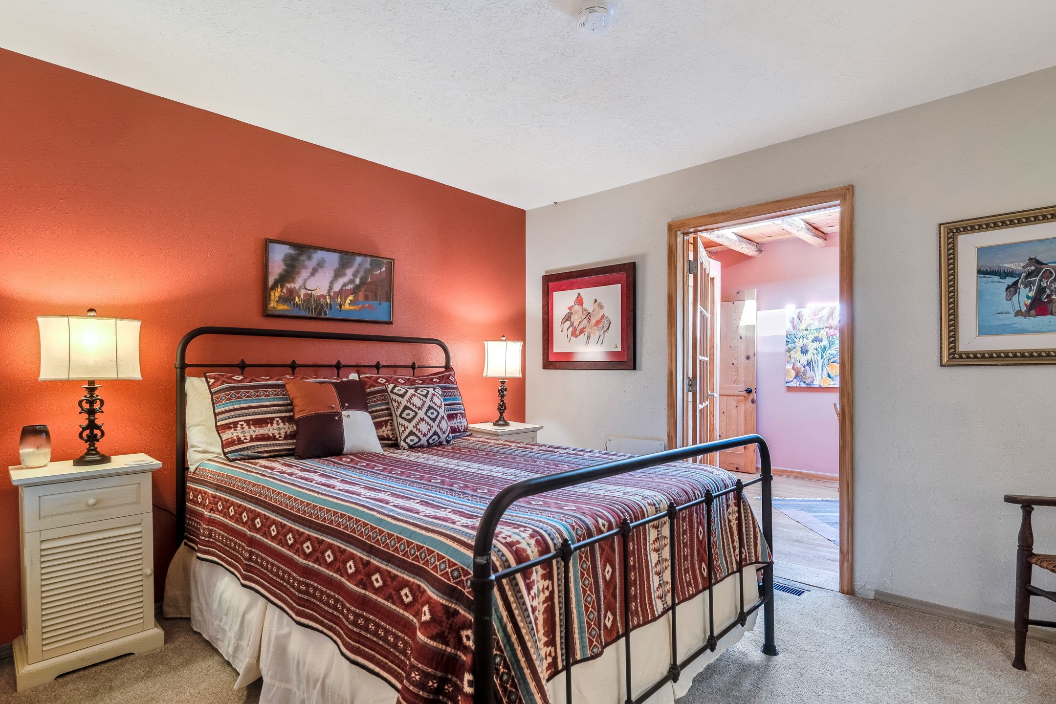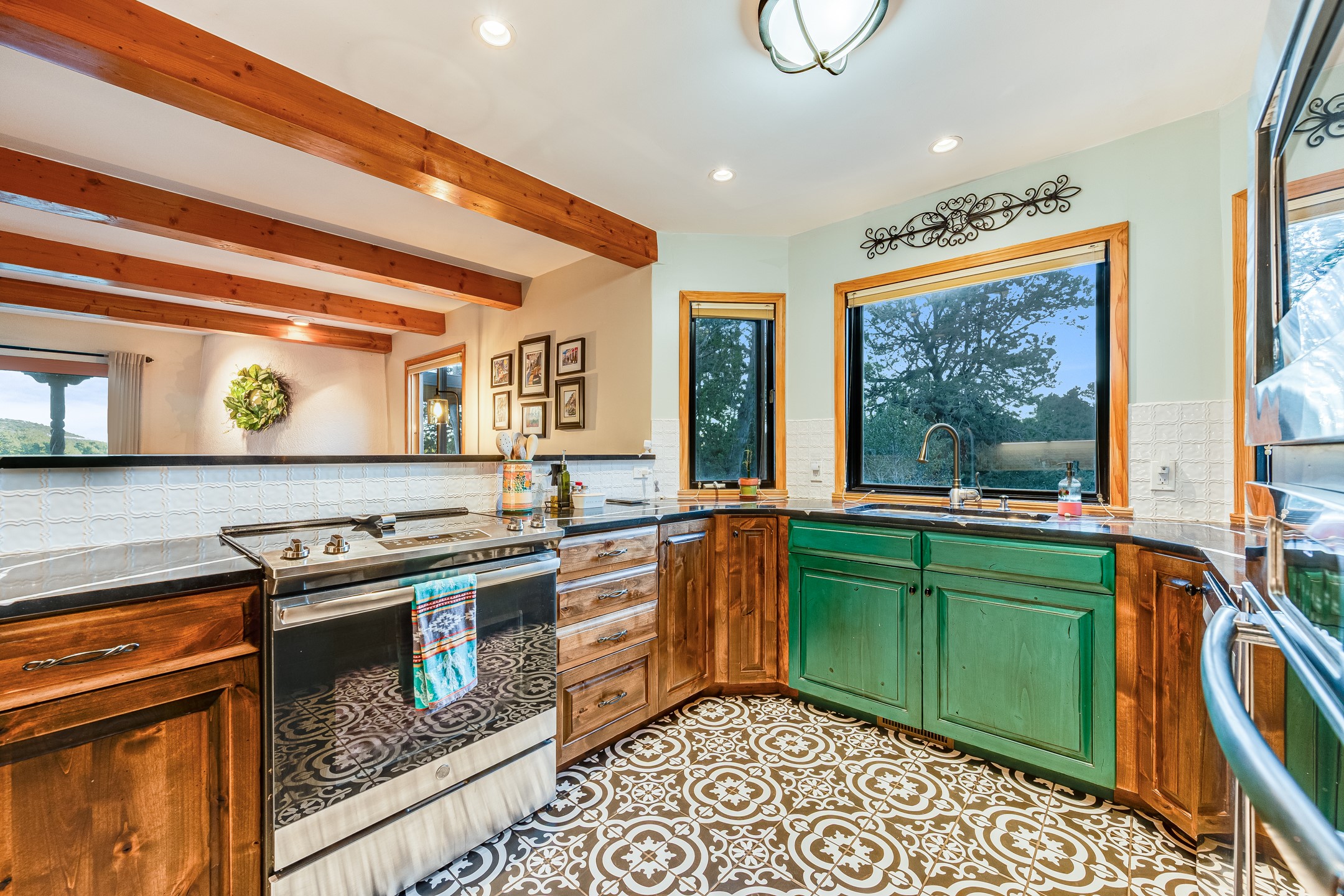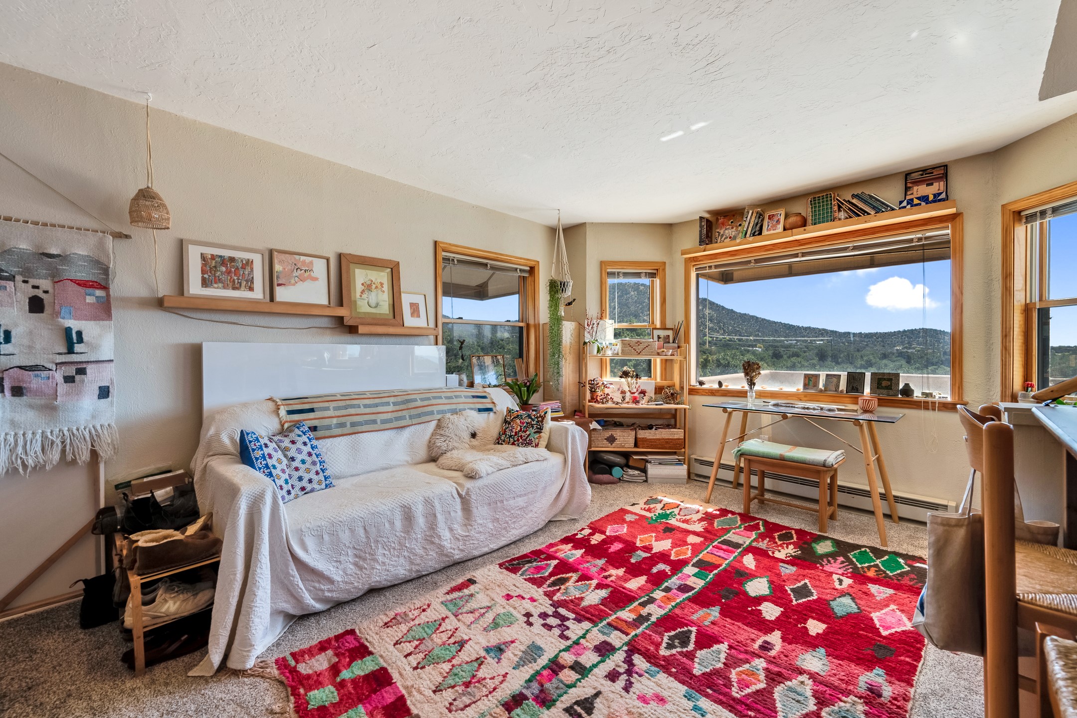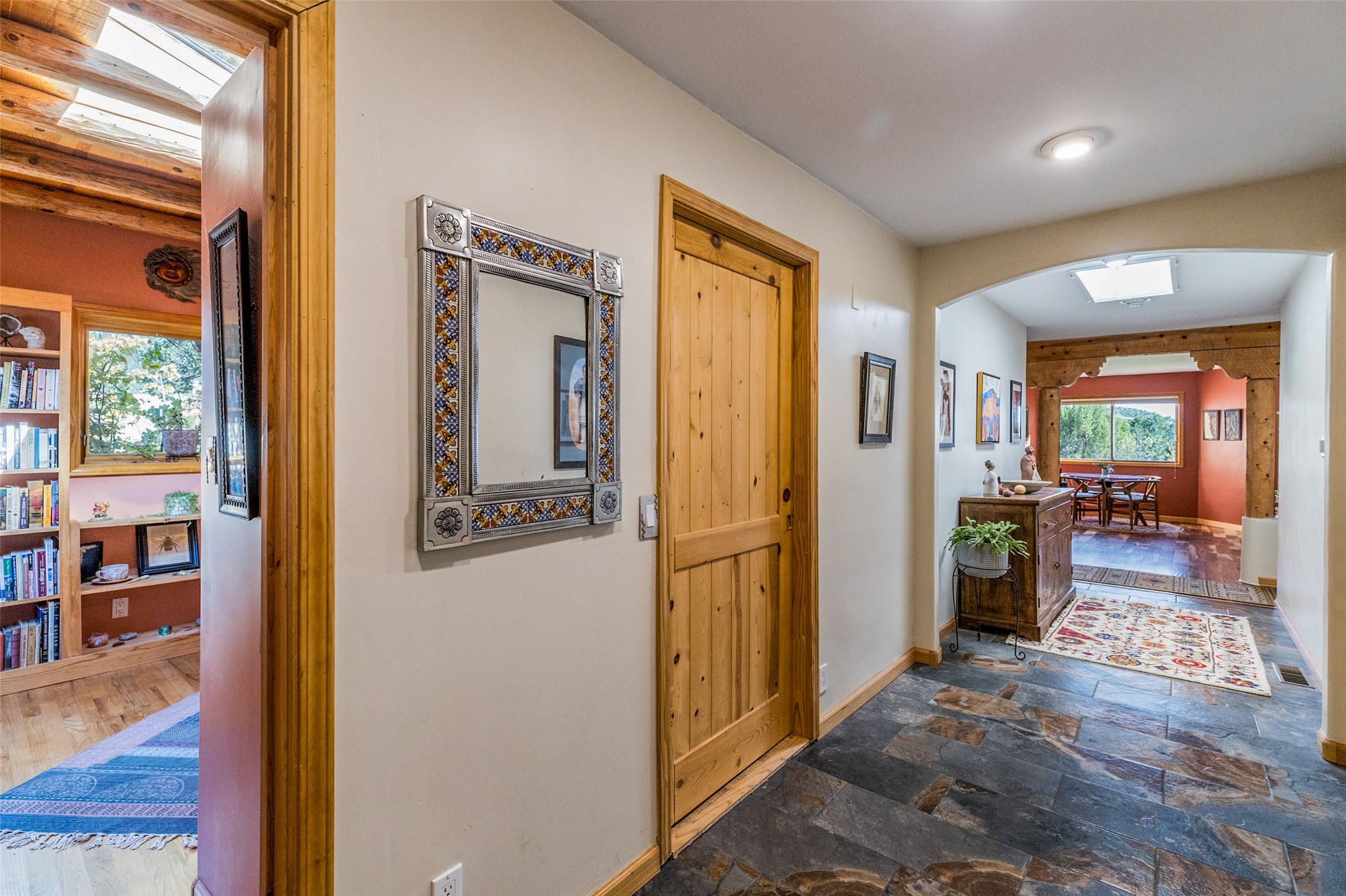 In a serene, tree-filled setting with sweeping views of the Sangre de Cristo foothills, this single-level 2600 sqft main residence offers comfort and privacy. Featuring three bedrooms and two bathrooms, a cheerful office with built-ins, separate living and dining rooms, and a completely renovated custom kitchen, the generous floor plan has space for everyone. Enjoy a cozy fire while watching the sun dip beyond the horizon or take in your morning coffee on the back portal while the fountain gurgles - this home will entice you to slow your pace and enjoy living amongst the pion trees. The primary bedroom is a true sanctuary, with a generous walk-in closet, a well-appointed ensuite bath, and direct backyard access to provide a seamless indoor-outdoor flow. A bonus room and a dedicated laundry room off the kitchen add to the functionality while the STUDIO CASITA (additional 478 sqft) with a private entrance is perfect for creative work, quiet retreats, and passive income. Other features include a tiled foyer, wood floors, beamed ceilings, stone countertops, and enhanced lighting throughout. Set on a private, 2+ acre lot with mature landscaping, the property is further augmented by a separate carport, RV space, an electric vehicle charger, and SOLAR PANELS for energy efficiency. Insurance was currently renewed, providing peace of mind. This property blends Southwest charm with modern updates and a flexible layout--a rare find with built-in investment opportunity.