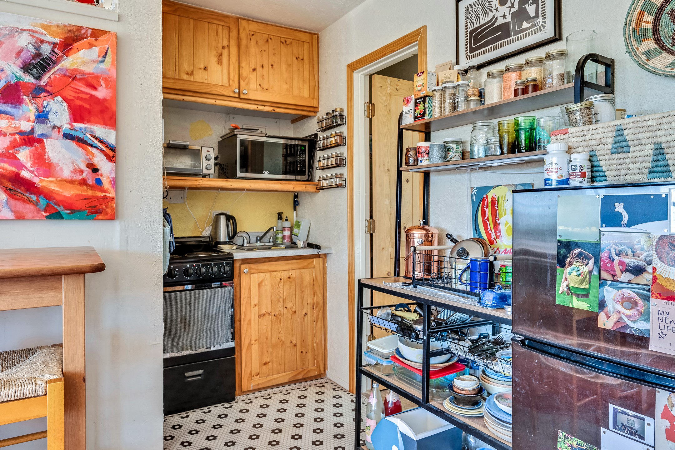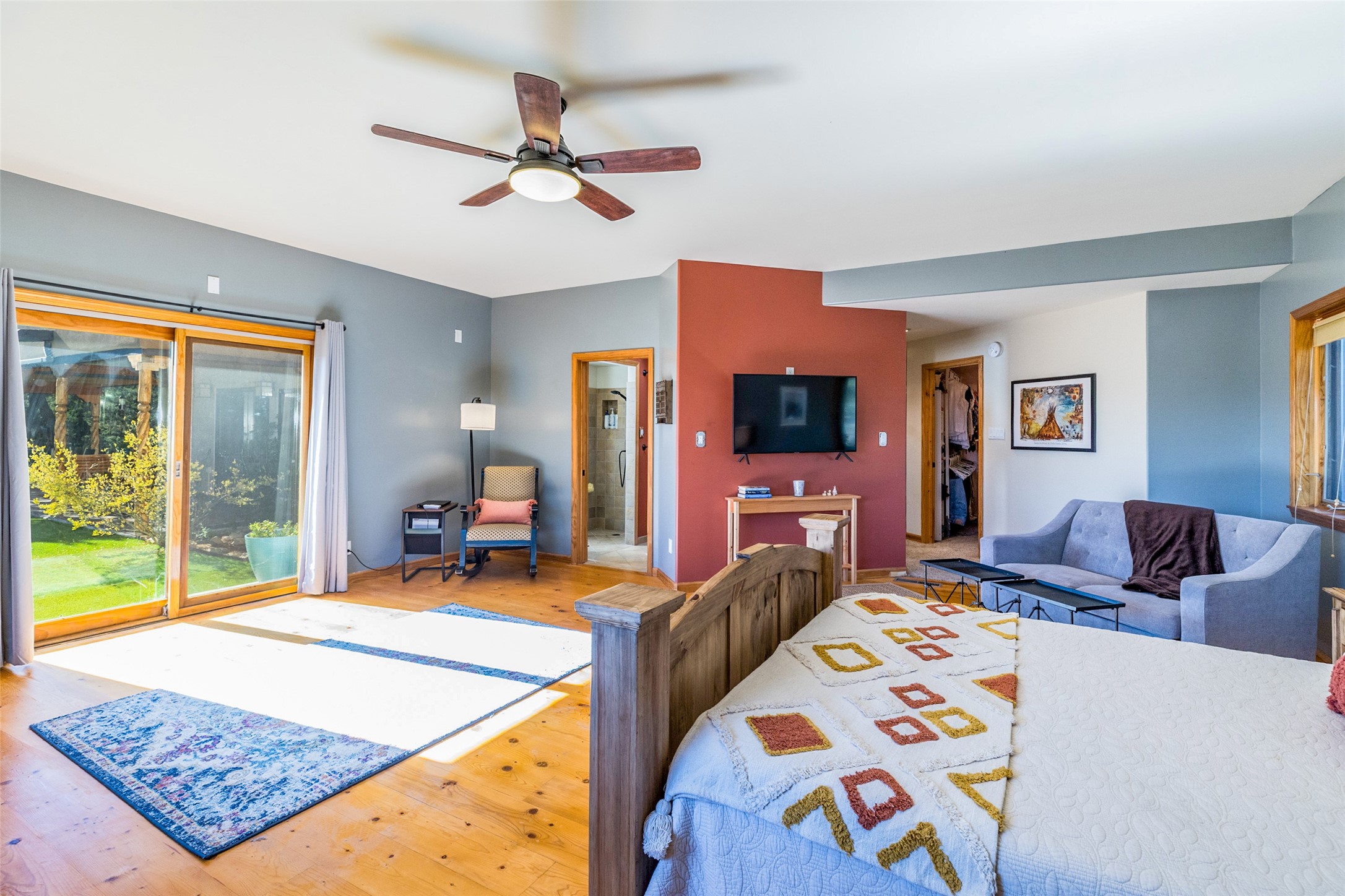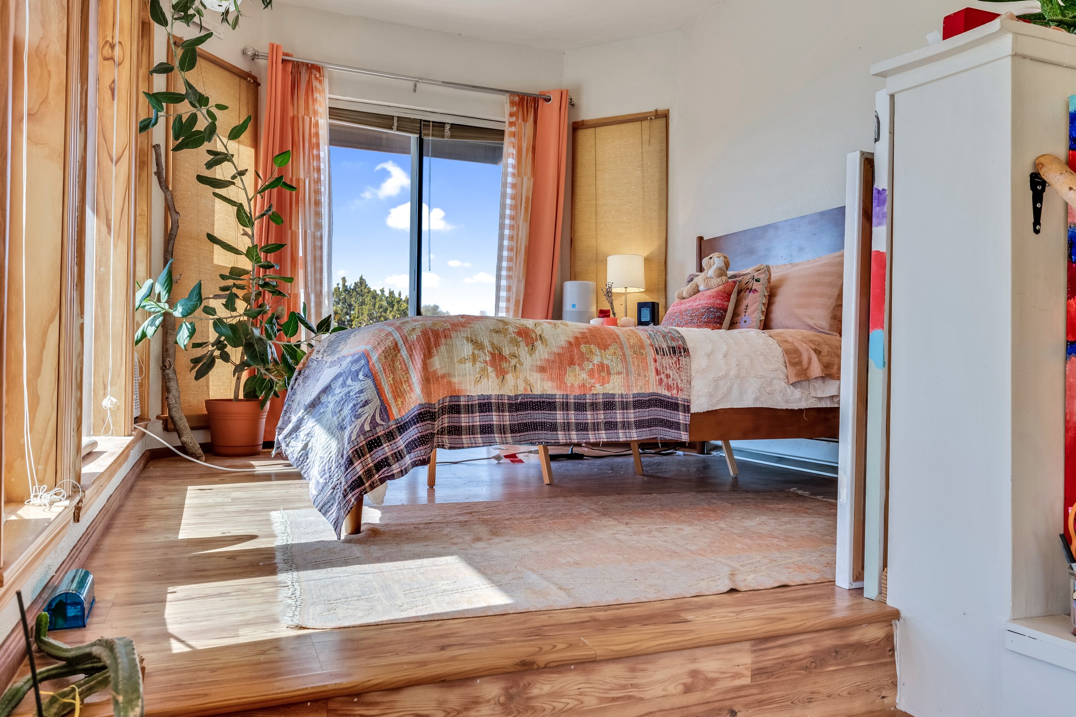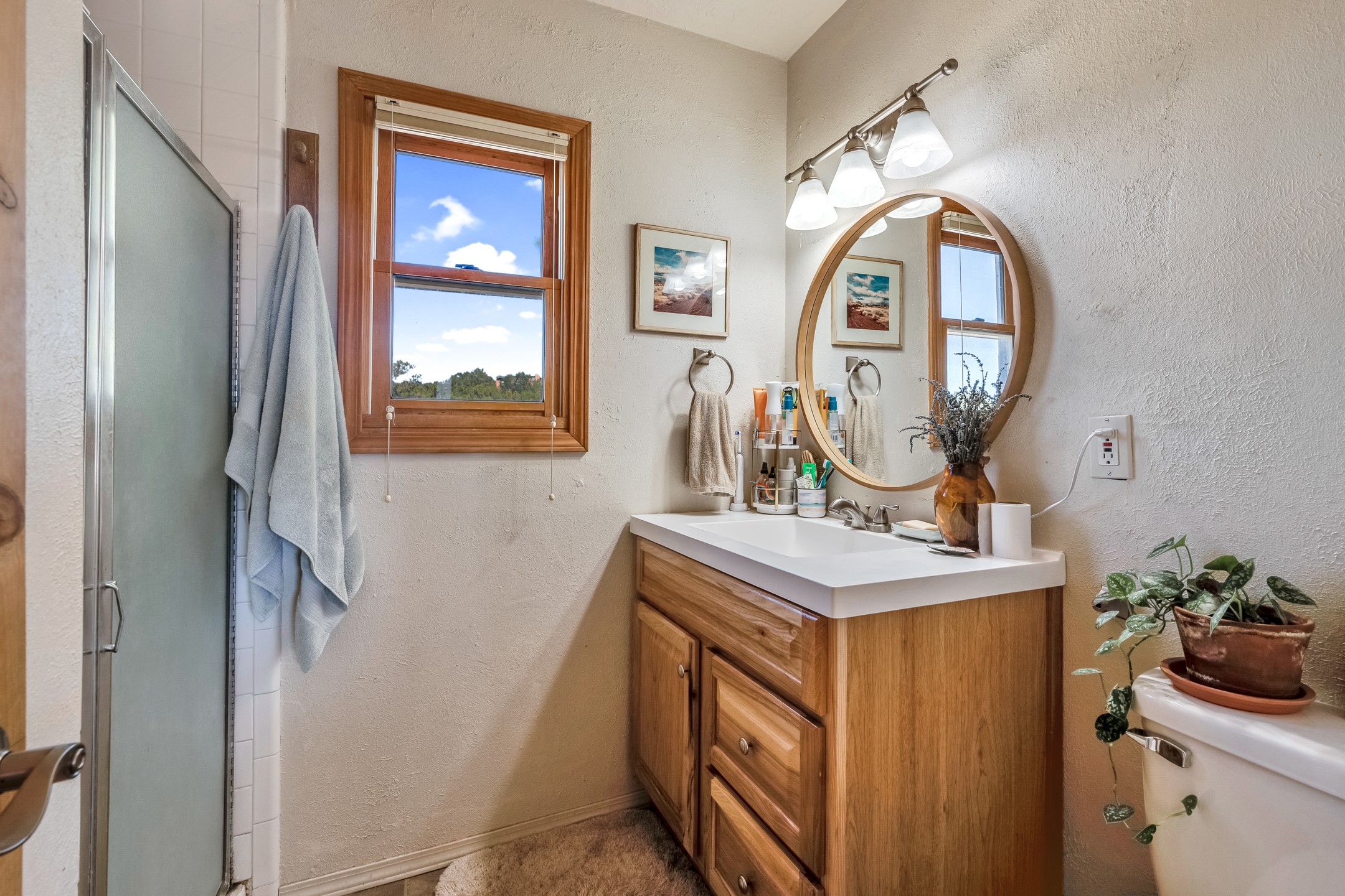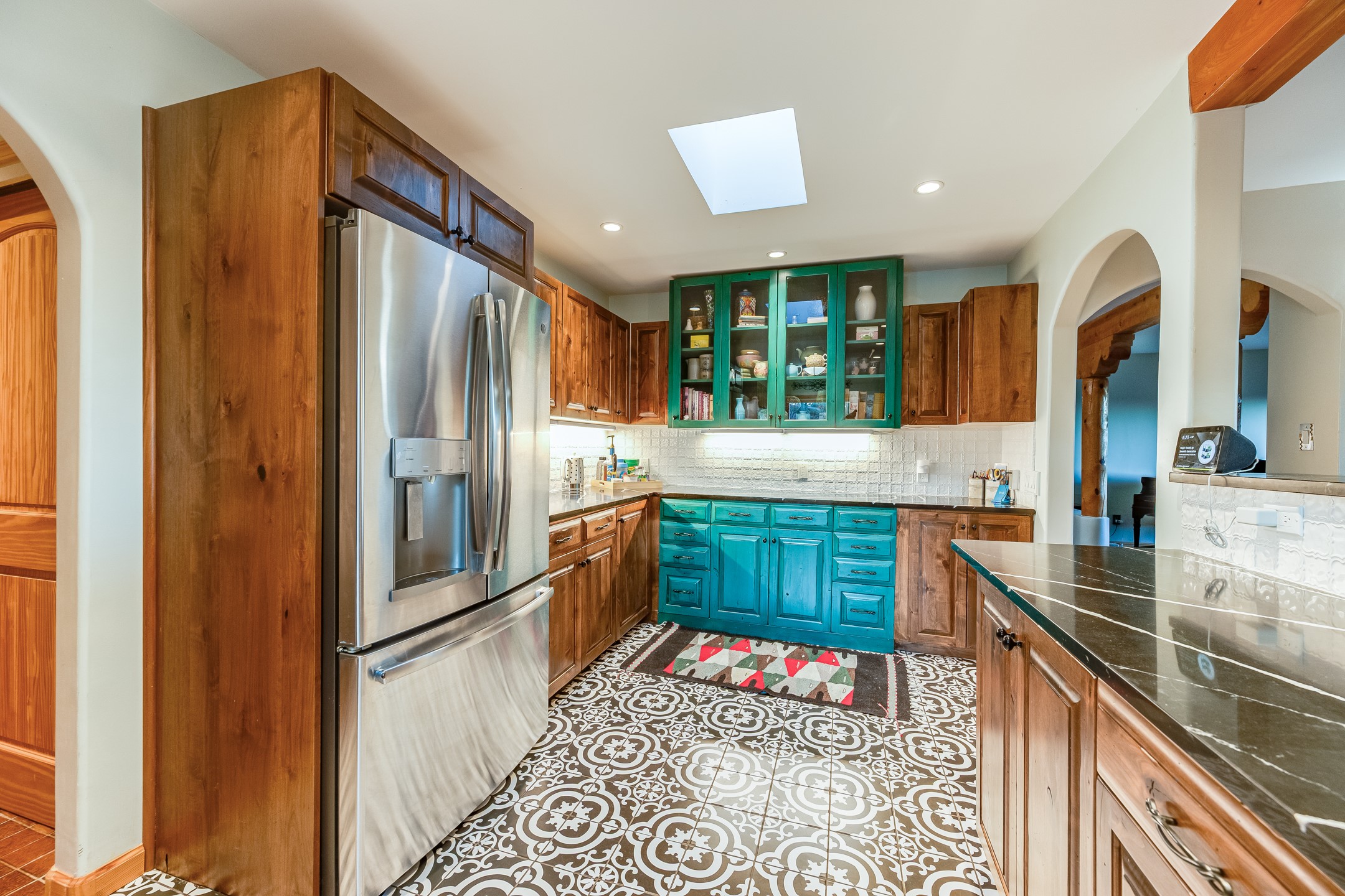 In a serene, tree-filled setting with sweeping views of the Sangre de Cristo foothills, this single-level 2600 sqft main residence offers comfort and privacy. Featuring three bedrooms and two bathrooms, a cheerful office with built-ins, separate living and dining rooms, and a completely renovated custom kitchen, the generous floor plan has space for everyone. Enjoy a cozy fire while watching the sun dip beyond the horizon or take in your morning coffee on the back portal while the fountain gurgles - this home will entice you to slow your pace and enjoy living amongst the pion trees. The primary bedroom is a true sanctuary, with a generous walk-in closet, a well-appointed ensuite bath, and direct backyard access to provide a seamless indoor-outdoor flow. A bonus room and a dedicated laundry room off the kitchen add to the functionality while the STUDIO CASITA (additional 478 sqft) with a private entrance is perfect for creative work, quiet retreats, and passive income. Other features include a tiled foyer, wood floors, beamed ceilings, stone countertops, and enhanced lighting throughout. Set on a private, 2+ acre lot with mature landscaping, the property is further augmented by a separate carport, RV space, an electric vehicle charger, and SOLAR PANELS for energy efficiency. Insurance was currently renewed, providing peace of mind. This property blends Southwest charm with modern updates and a flexible layout--a rare find with built-in investment opportunity.