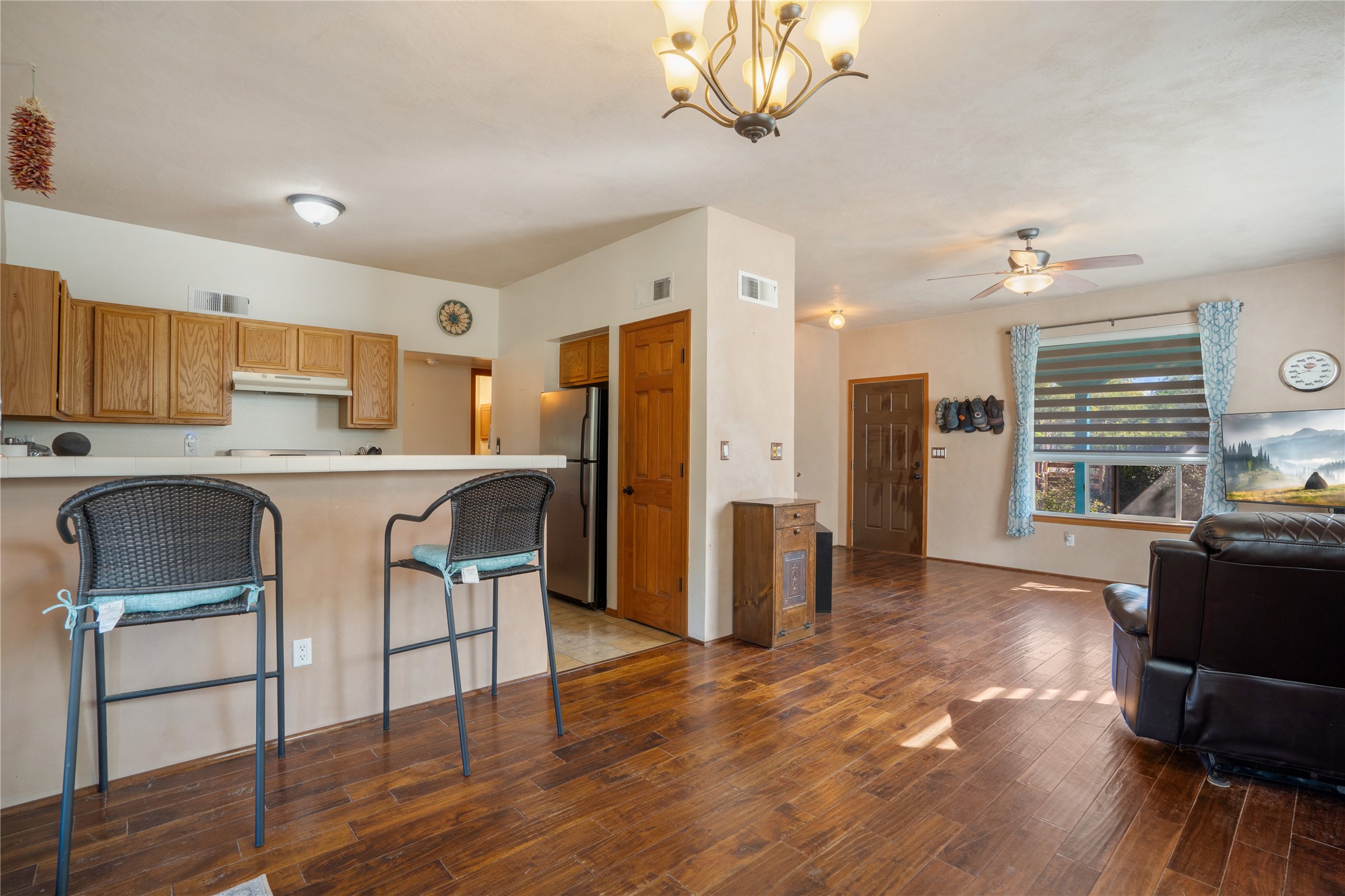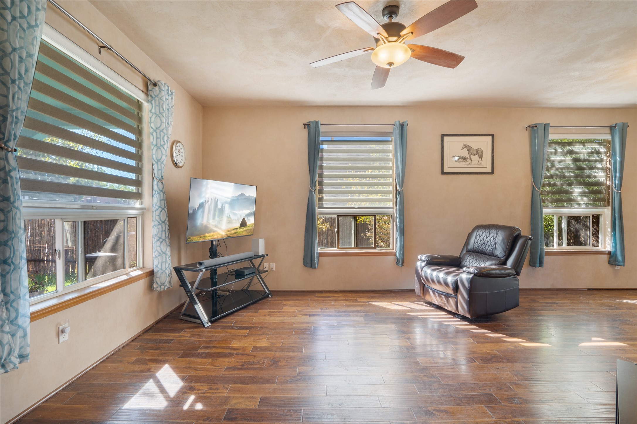 Charming 2-bedroom, 1-bath home with a 1-car garage and off-street parking. Comfortable, move-in ready living with tranquil outdoor spaces. A gated, fenced front yard with established, drip-irrigated plantings provides curb appeal and privacy. Inside, the living and dining areas flow into the kitchen, and an updated bathroom showcases clean, modern finishes. The fully enclosed backyard is a gardener's delight with bountiful apple trees and lush landscaping, plus a detached garage that could also serve as a gym or workshop. Ideally located with easy access to I-25 and NM-599 and near shopping, schools, popular restaurants, and Presbyterian Hospital. Schedule your showing today!