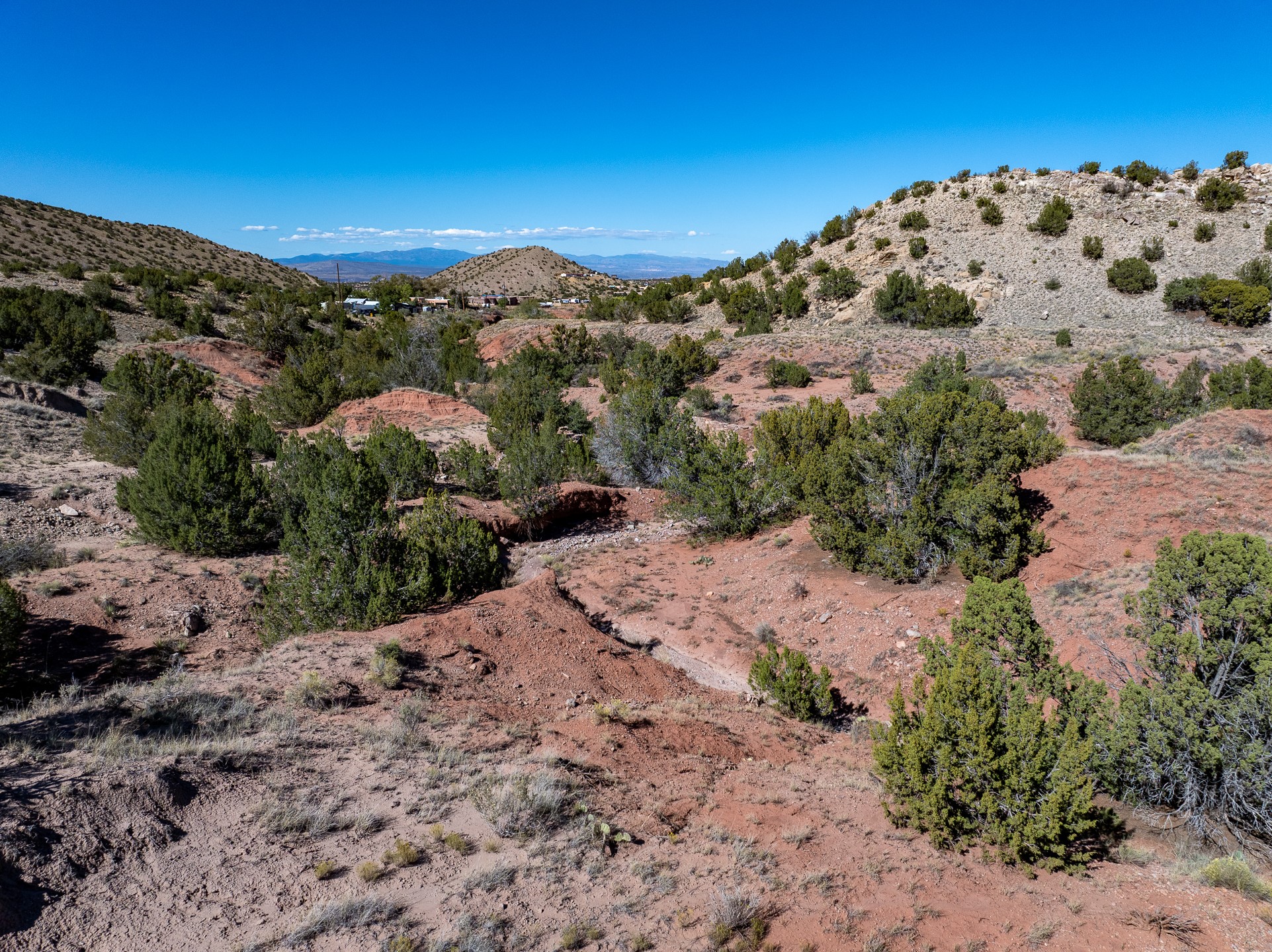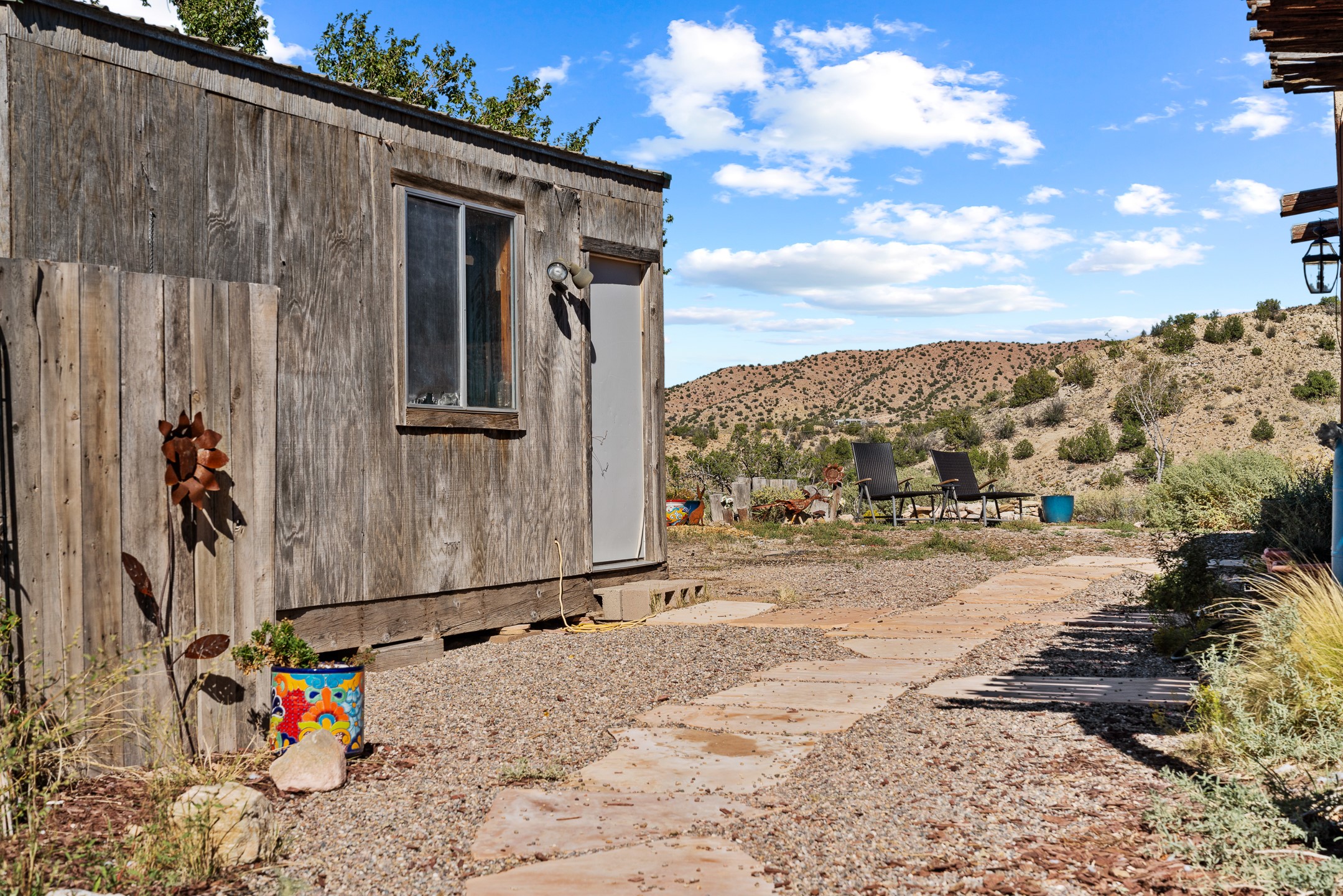 Nestled beside a picturesque canyon, part of the historic San Antonio de Las Huertas Land Grant, and near National Forest access, this charming adobe home--dating back to the 1940s--sits on two tranquil acres surrounded by sweeping mountain views. Thoughtfully updated to preserve its authentic Southwestern character, the home features traditional vigas and wood plank ceilings that create a warm, inviting atmosphere. Step onto the spacious covered portal, complete with vigas and a brick floor, and take in the serene vistas of the Sandia and Jemez mountains--an ideal setting for outdoor dining or entertaining. The main portal opens into a cozy living room with pellet stove and beautifully plastered adobe walls. The remodeled kitchen blends rustic charm with modern convenience, offering a country-style farm sink, quartz countertops, and a butcher block island. Both bedrooms are generously sized. Pella windows and patio door. Recent upgrades include a new roof system, new hot water heater, and new main electric panel service, all installed in September 2025. 320-square-foot workshop, 108-square-foot storage shed, and a large, fenced yard perfect for dogs. An older addition presents exciting possibilities--building plans available to convert to dining room.