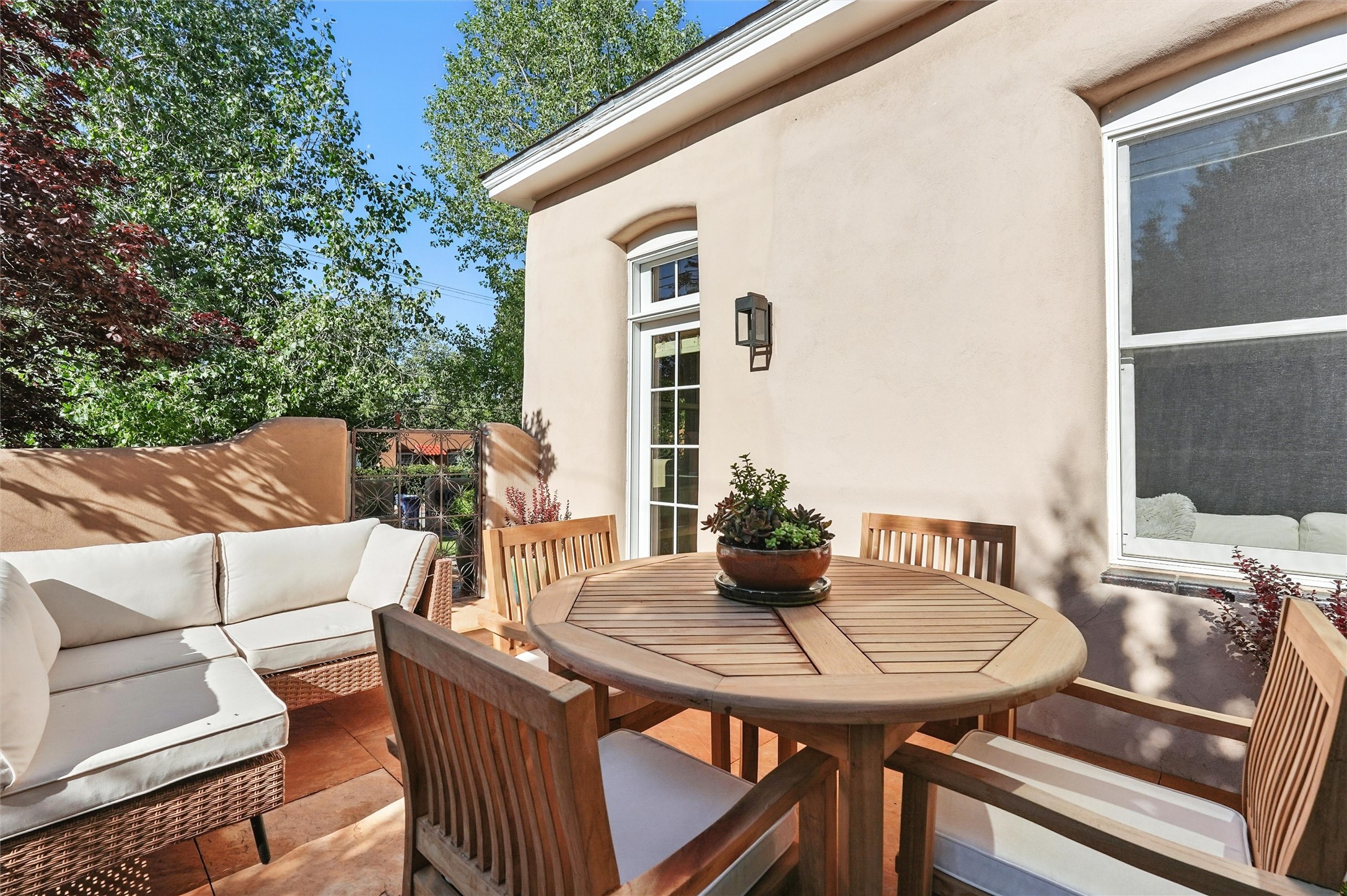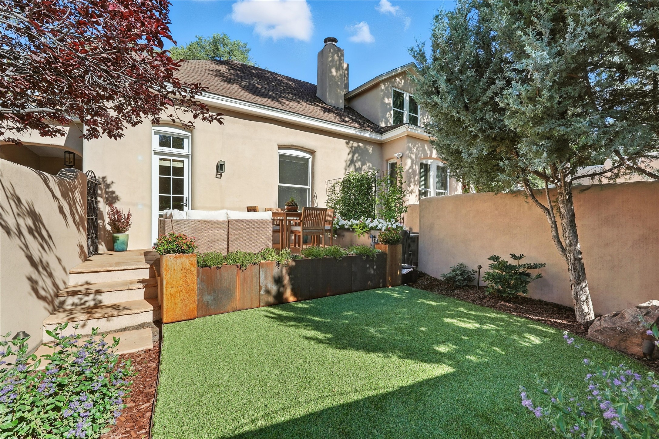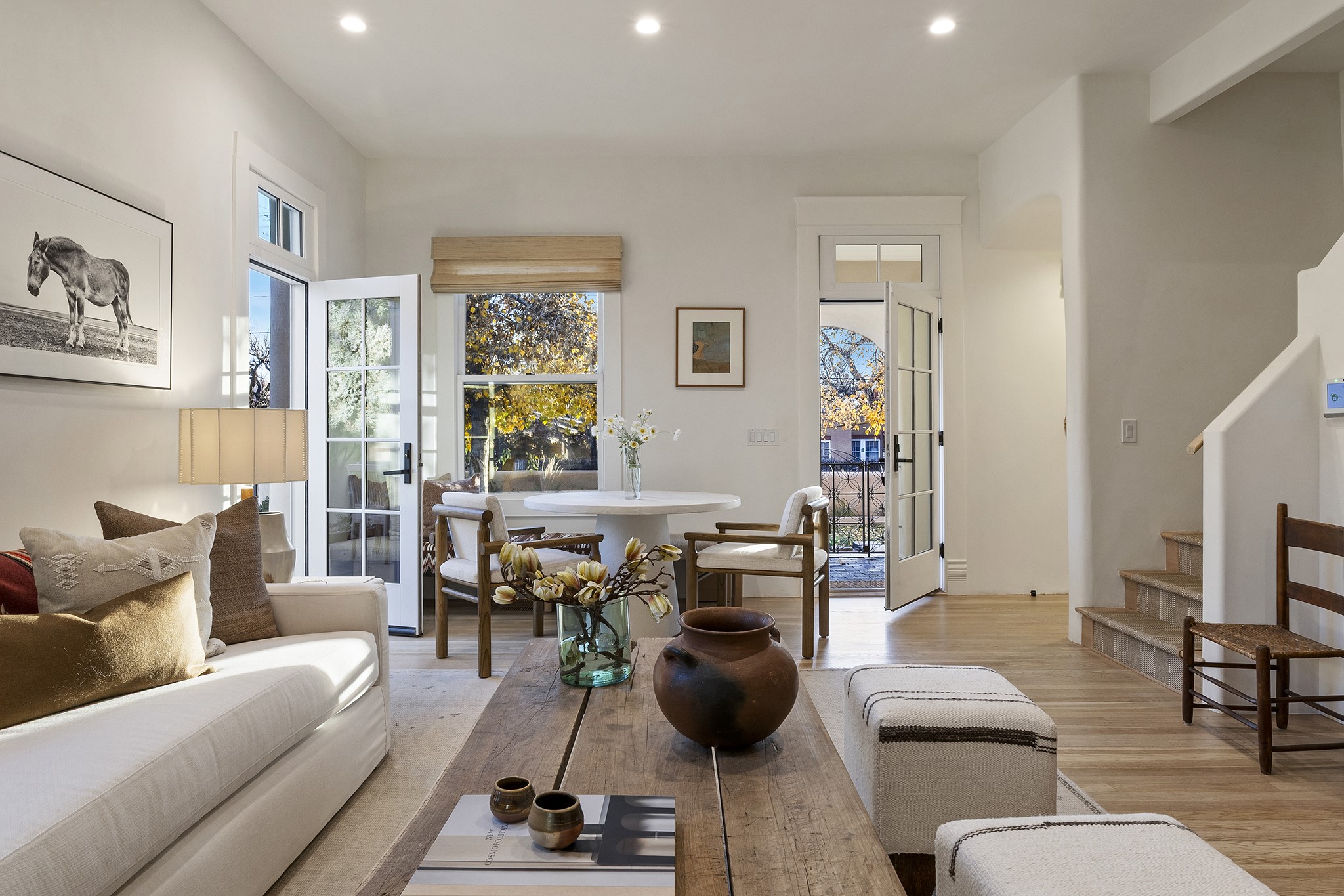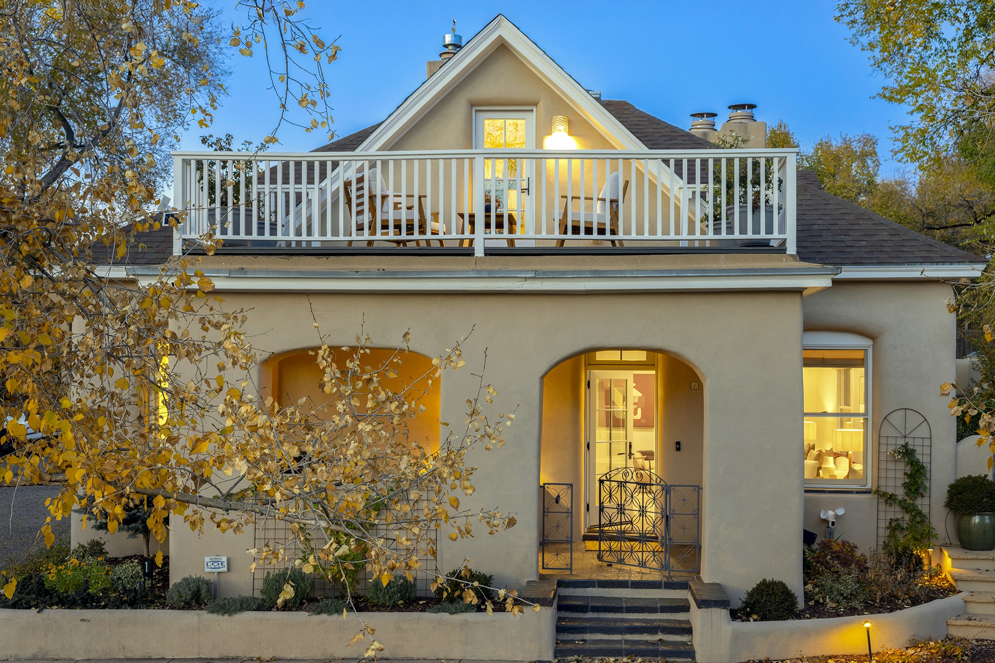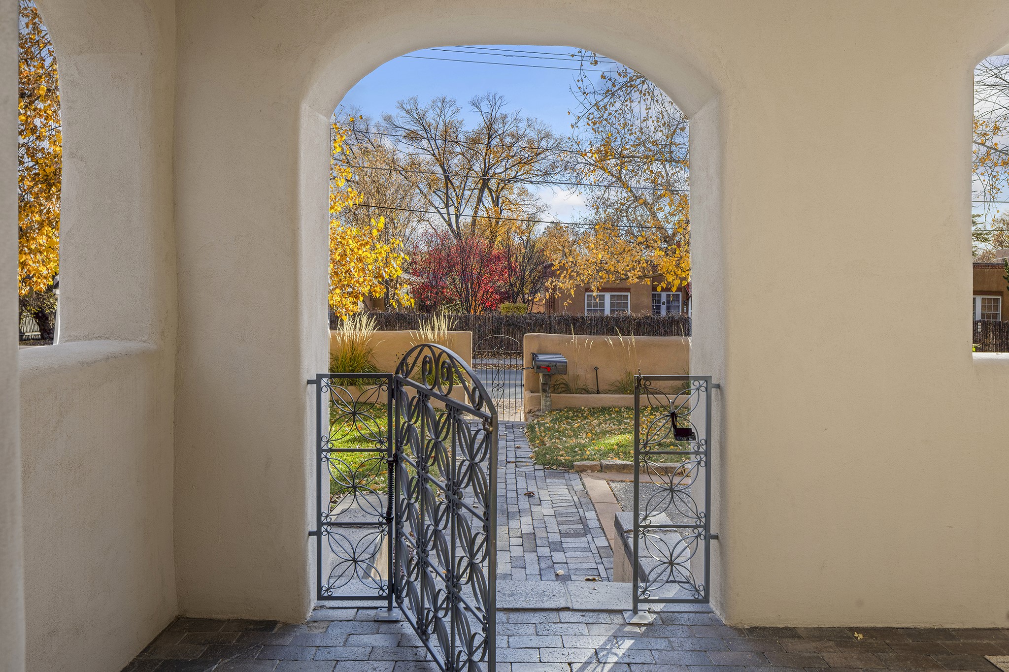 Just moments from Santa Fe's historic Plaza and Canyon Road, this 3 bedroom, 2 bath home embodies refined Southwestern elegance. Masterfully reimagined by Bergman Vass Interiors, it blends contemporary sophistication with the warmth of Santa Fe's timeless style. Every detail reflects exceptional craftsmanship with no surface left untouched! New energy-efficient windows and custom glass doors bathe rich hardwood floors in natural light. Recessed lighting highlights the home's architectural beauty, while landscaped gardens, an upstairs deck and flagstone patios create a serene outdoor retreat. A hand-forged gate, custom fireplace screen, and luxurious closets complete this remarkable residence.