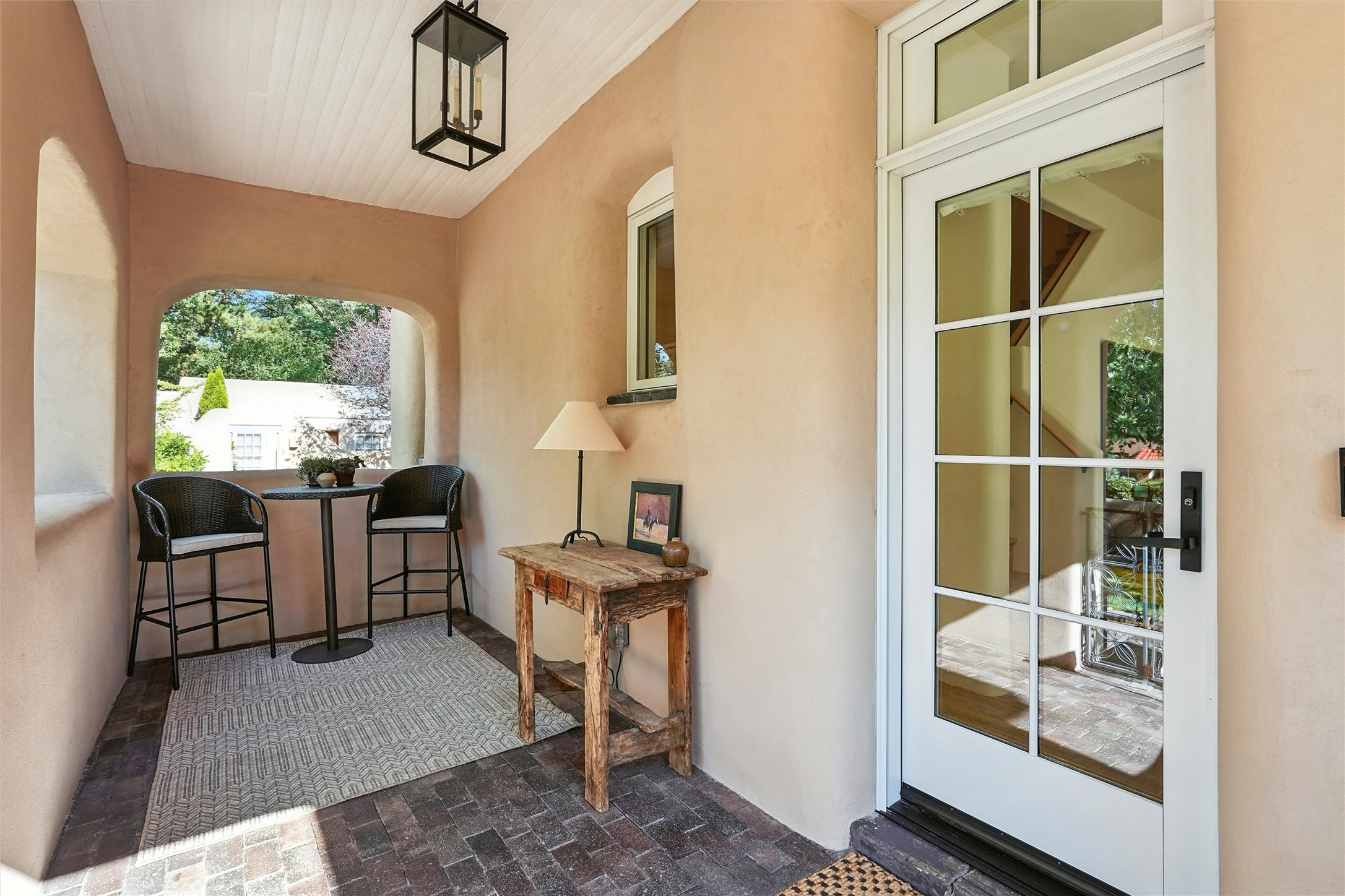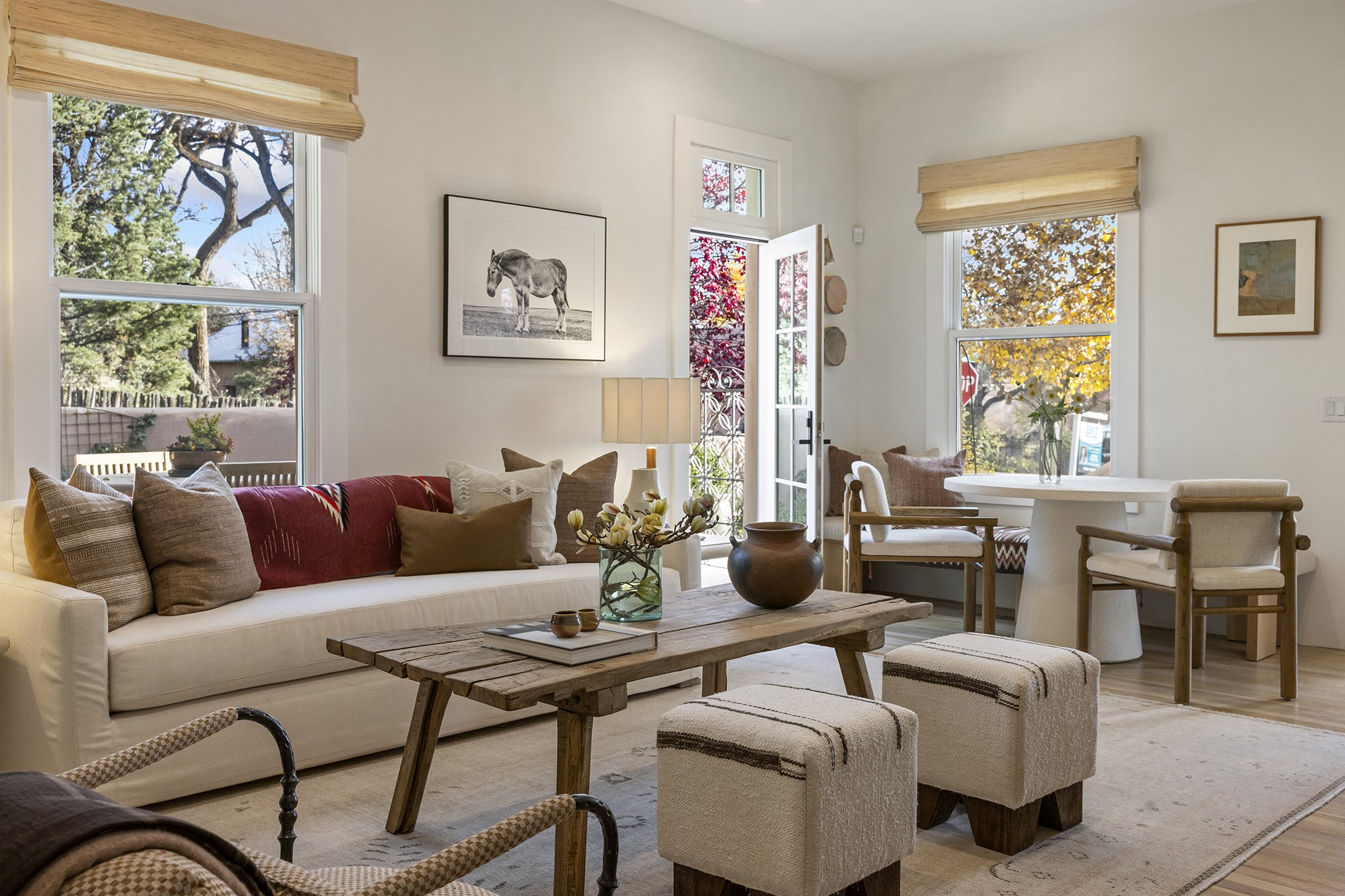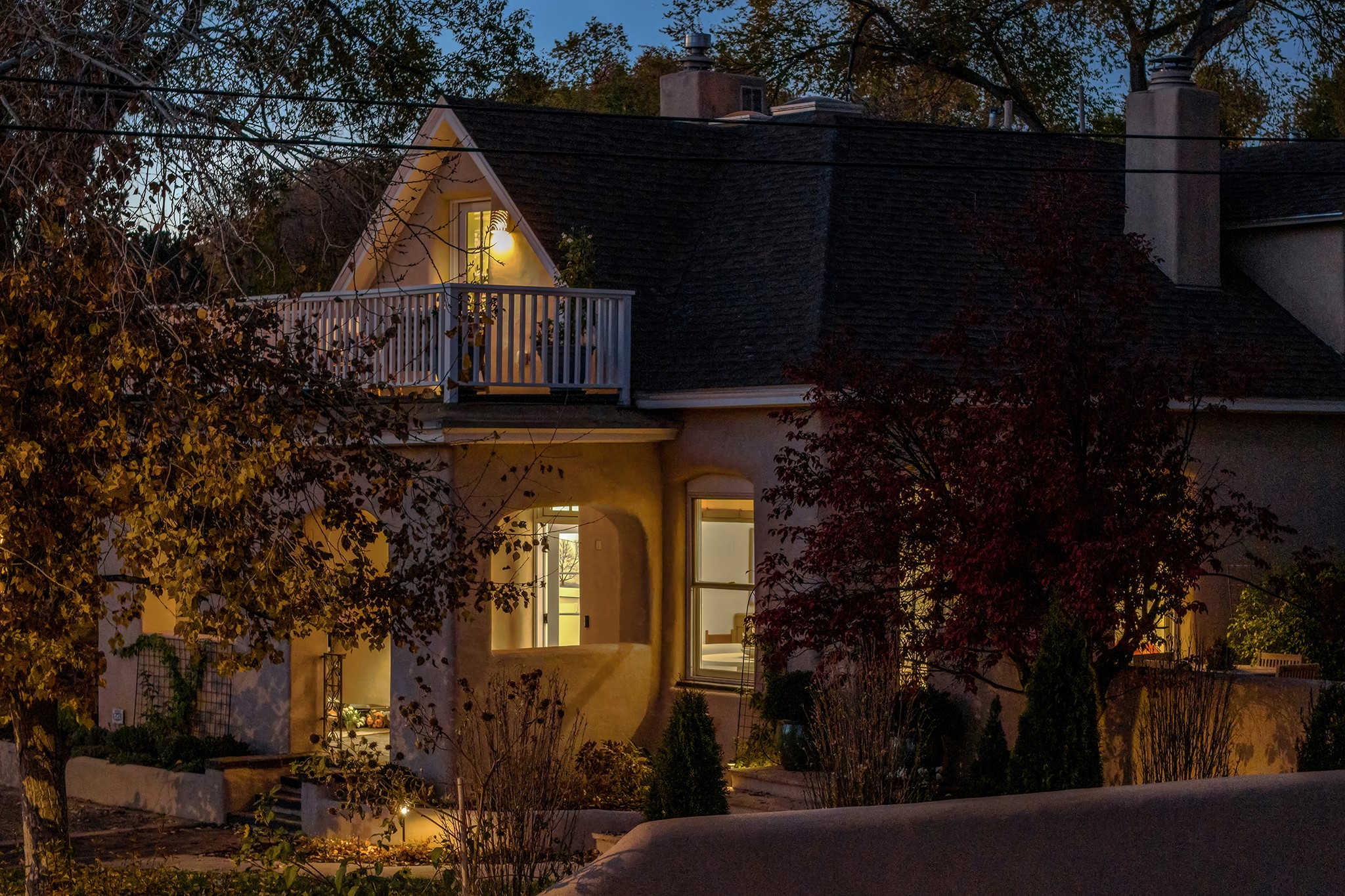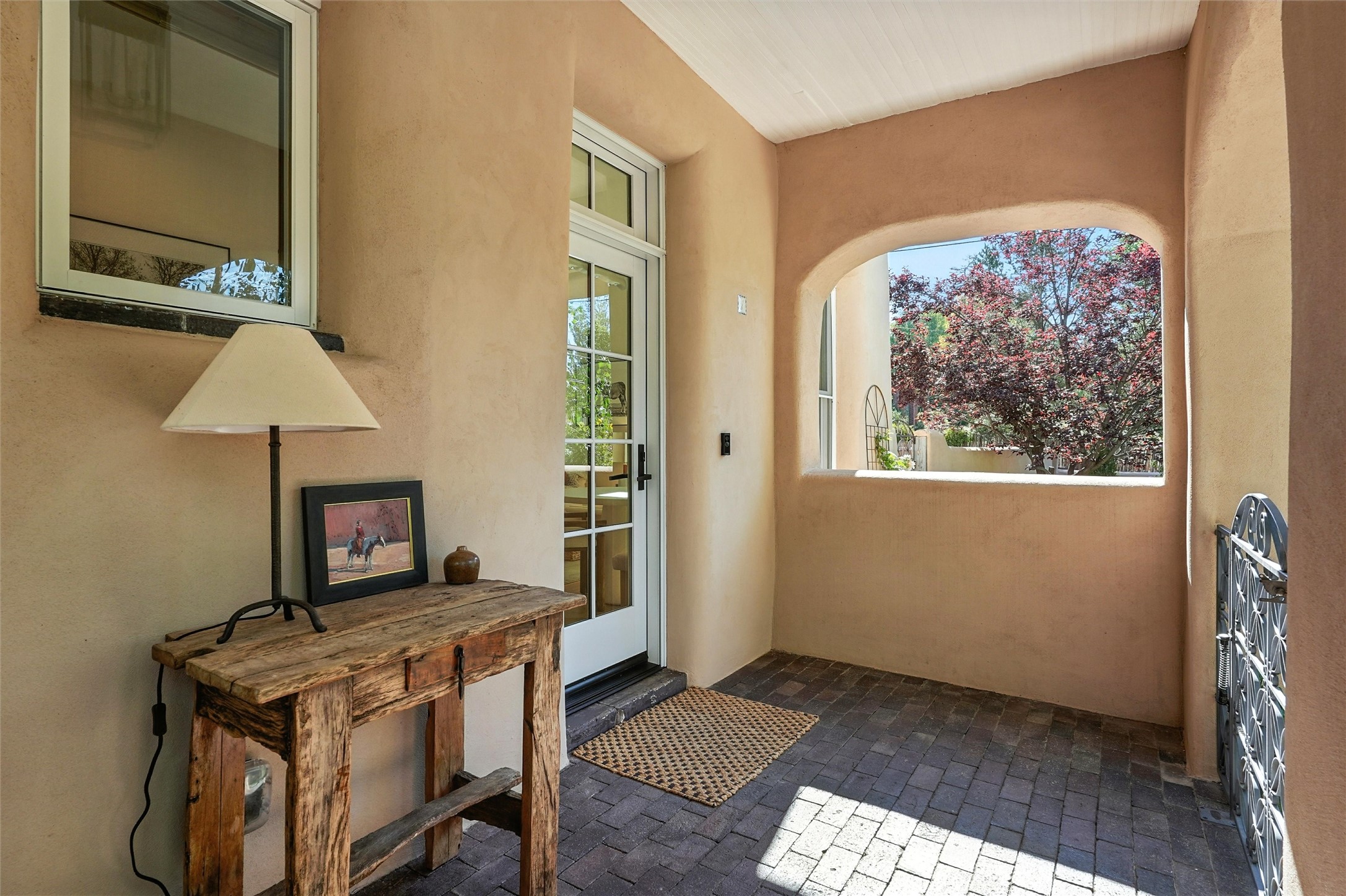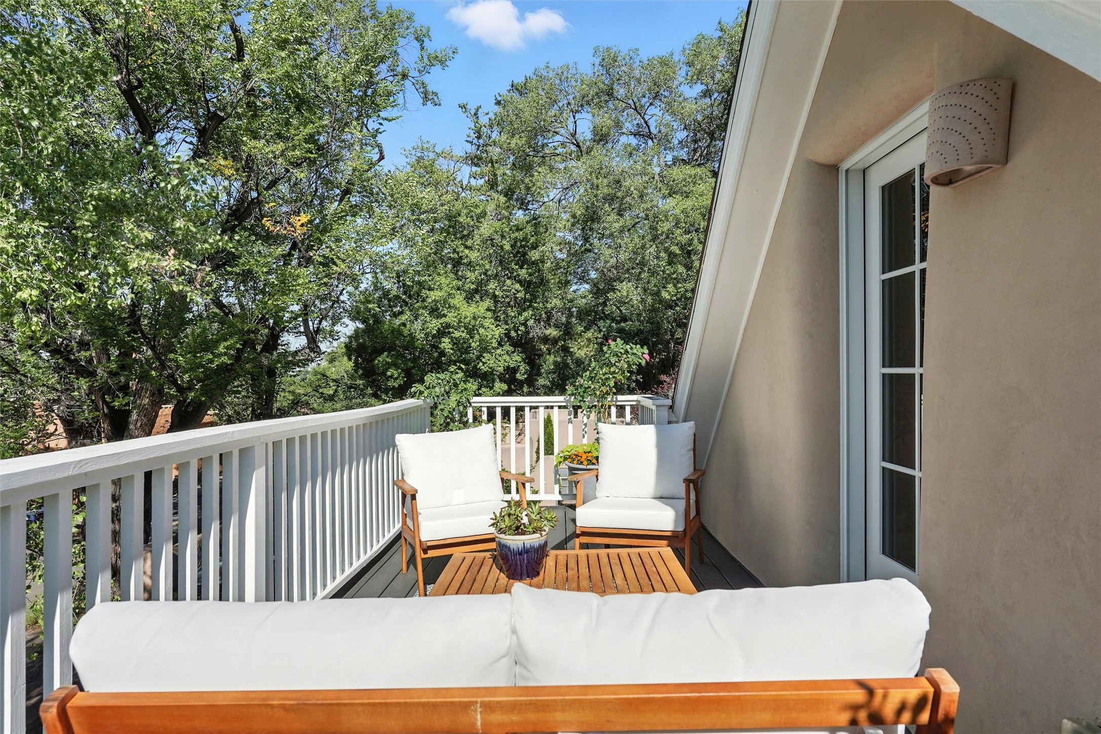 Just moments from Santa Fe's historic Plaza and Canyon Road, this 3 bedroom, 2 bath home embodies refined Southwestern elegance. Masterfully reimagined by Bergman Vass Interiors, it blends contemporary sophistication with the warmth of Santa Fe's timeless style. Every detail reflects exceptional craftsmanship with no surface left untouched! New energy-efficient windows and custom glass doors bathe rich hardwood floors in natural light. Recessed lighting highlights the home's architectural beauty, while landscaped gardens, an upstairs deck and flagstone patios create a serene outdoor retreat. A hand-forged gate, custom fireplace screen, and luxurious closets complete this remarkable residence.