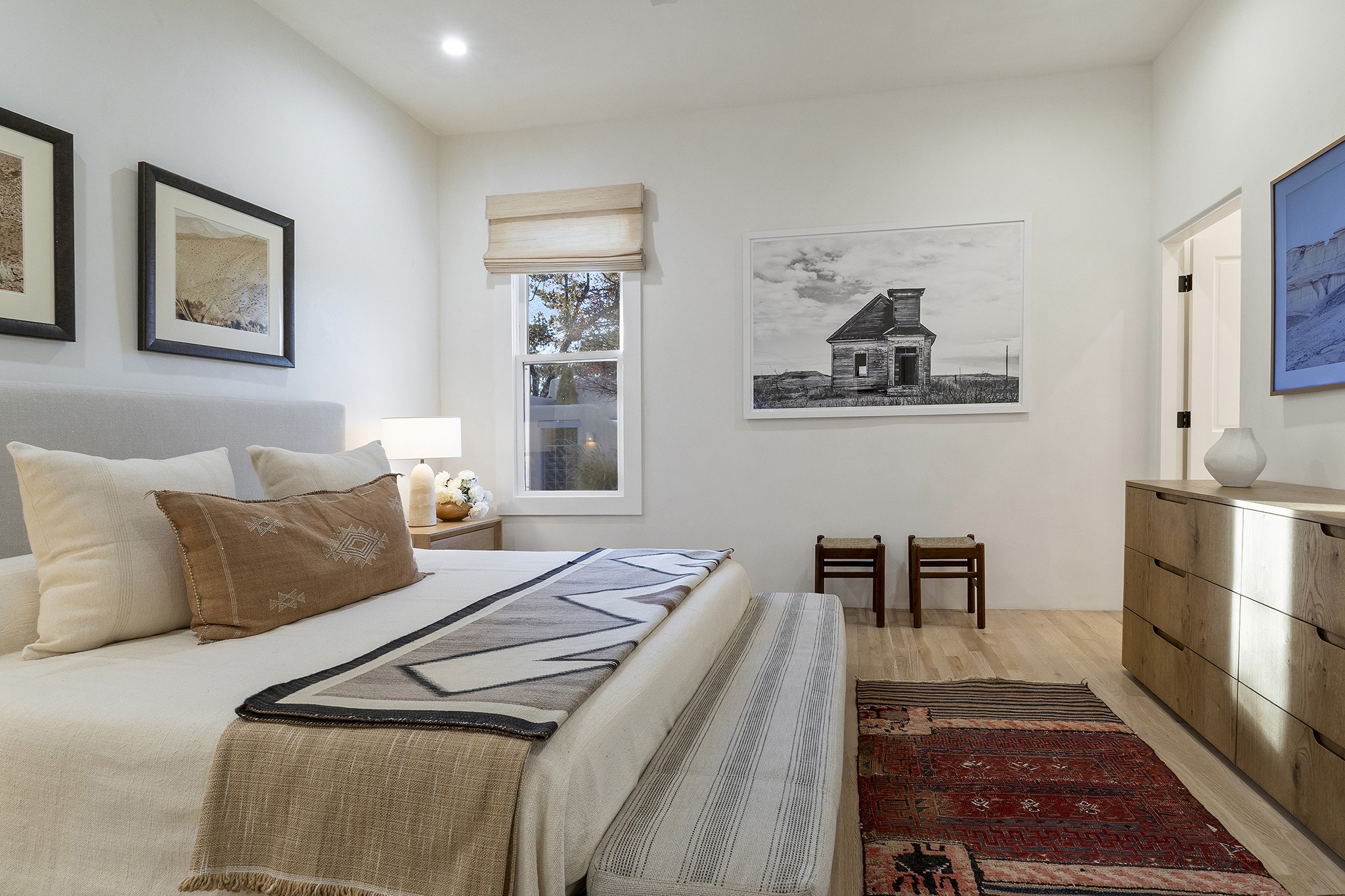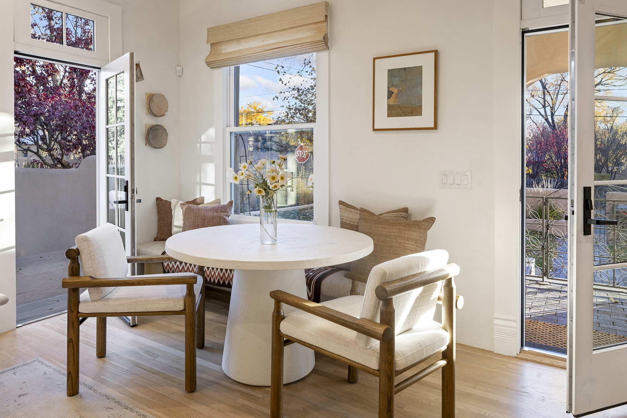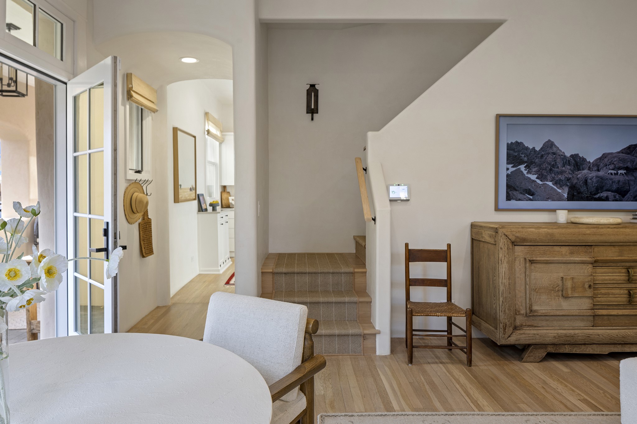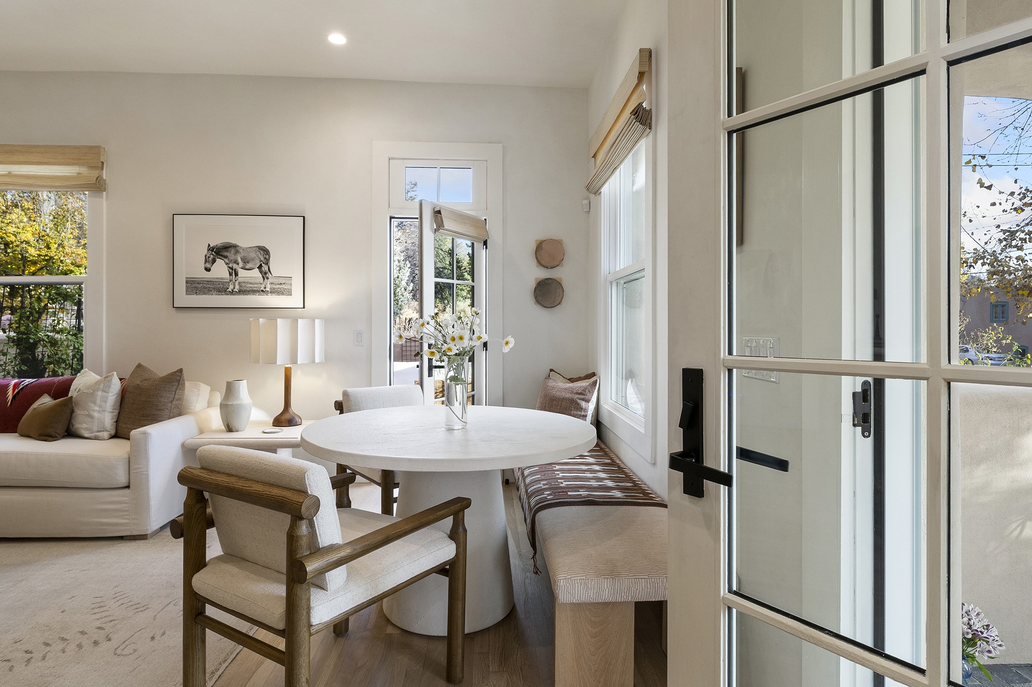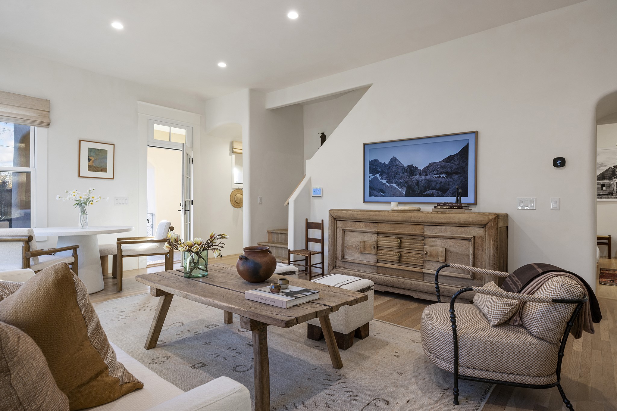 Just moments from Santa Fe's historic Plaza and Canyon Road, this 3 bedroom, 2 bath home embodies refined Southwestern elegance. Masterfully reimagined by Bergman Vass Interiors, it blends contemporary sophistication with the warmth of Santa Fe's timeless style. Every detail reflects exceptional craftsmanship with no surface left untouched! New energy-efficient windows and custom glass doors bathe rich hardwood floors in natural light. Recessed lighting highlights the home's architectural beauty, while landscaped gardens, an upstairs deck and flagstone patios create a serene outdoor retreat. A hand-forged gate, custom fireplace screen, and luxurious closets complete this remarkable residence.