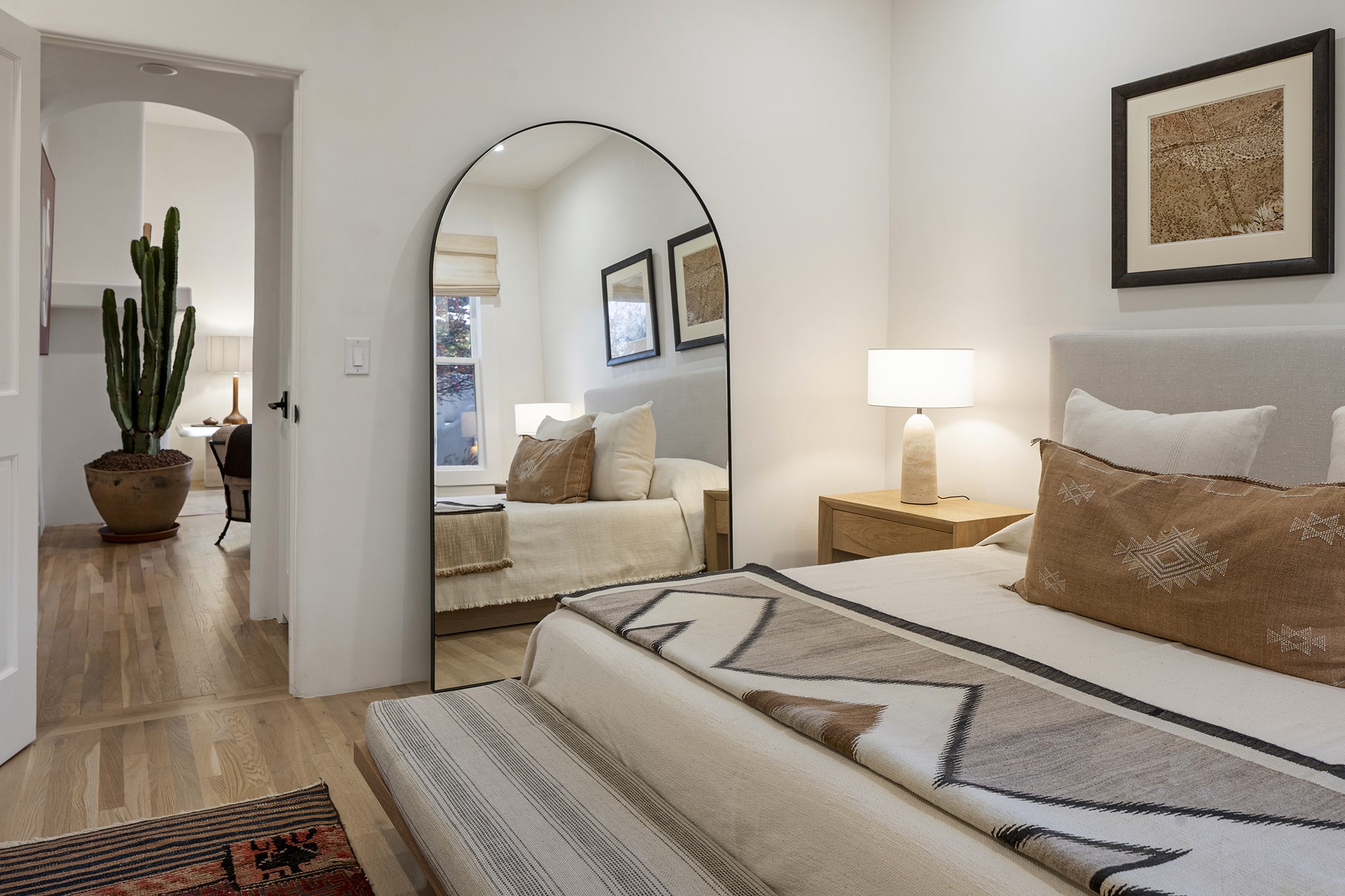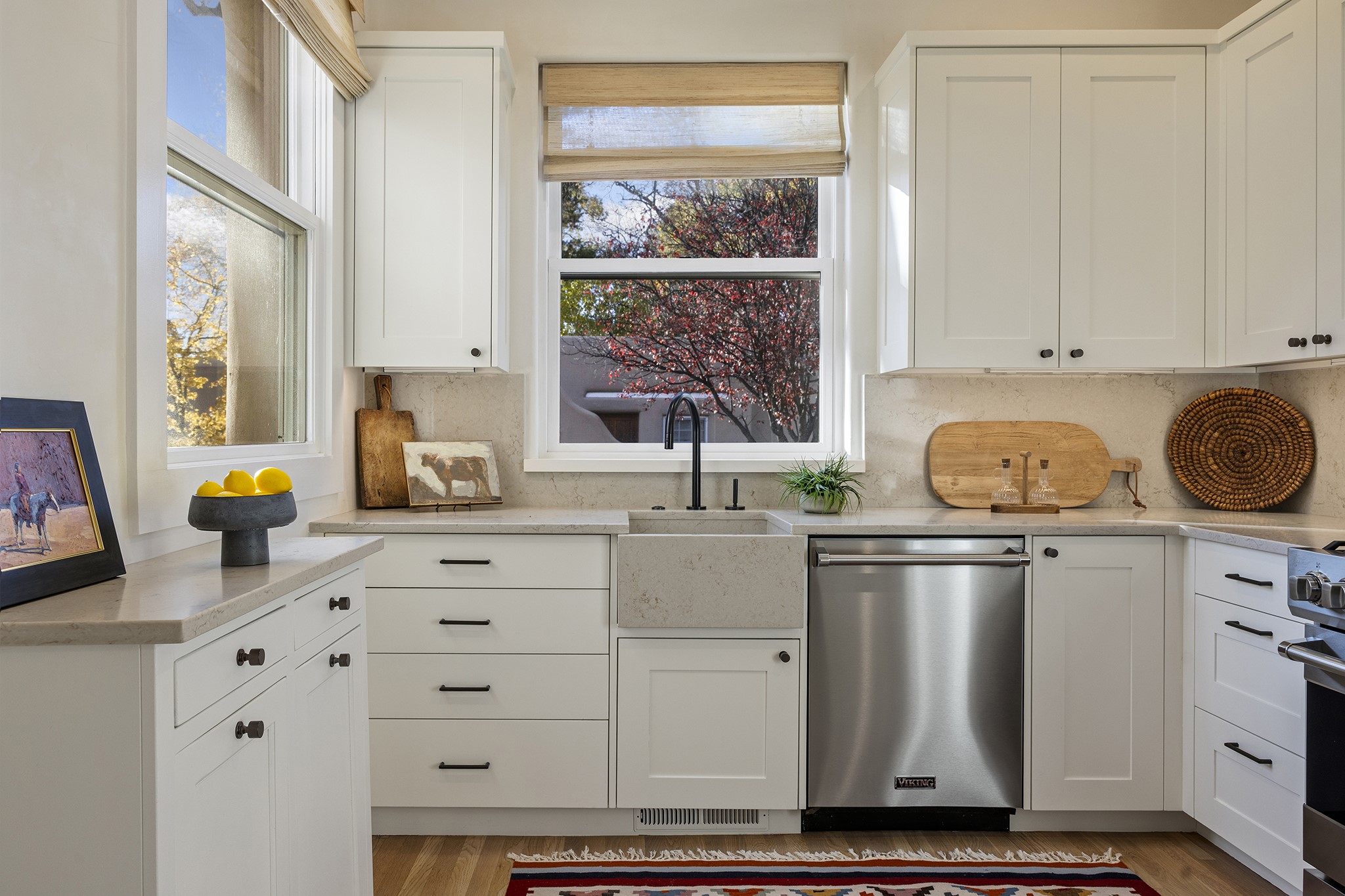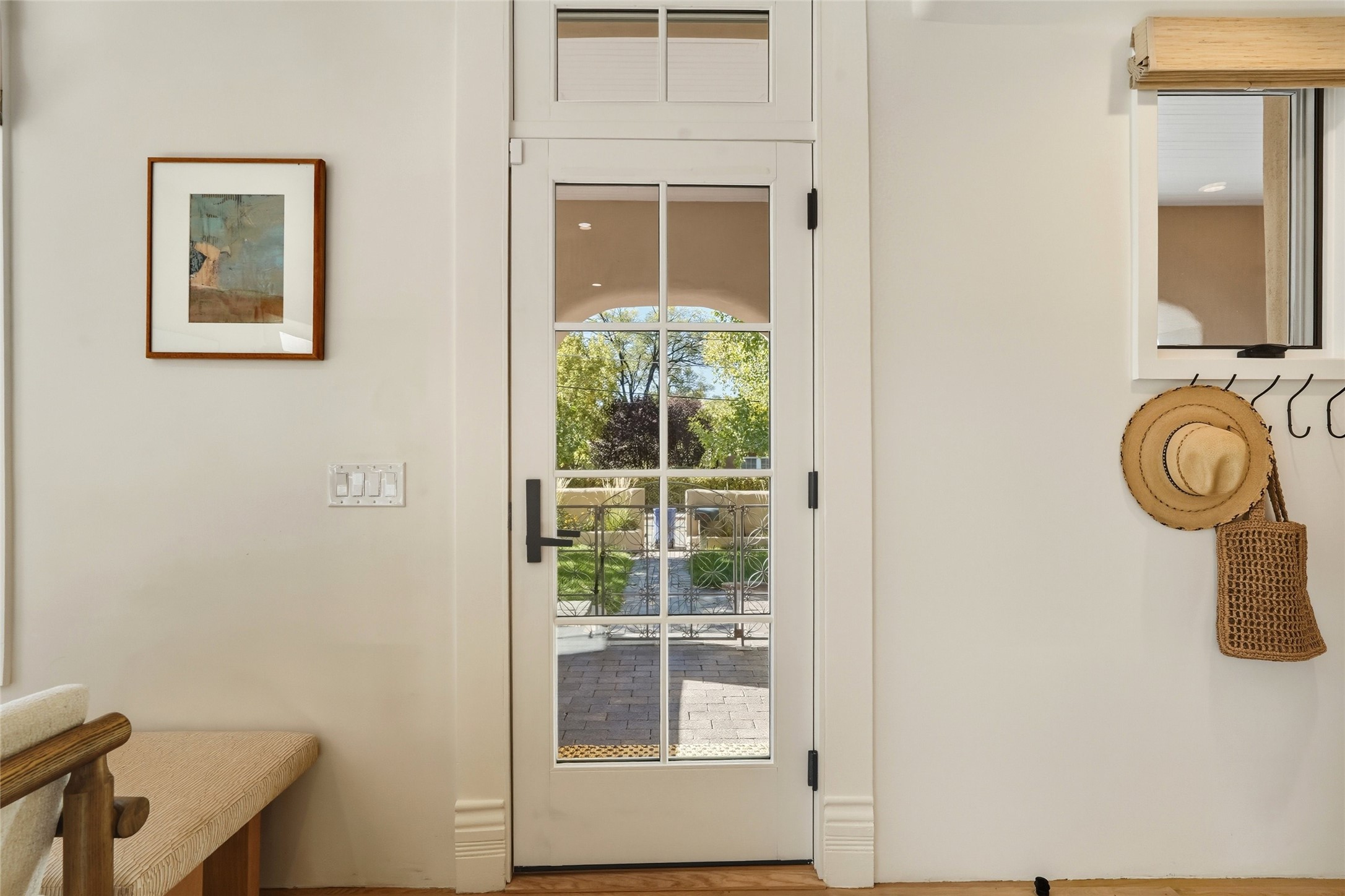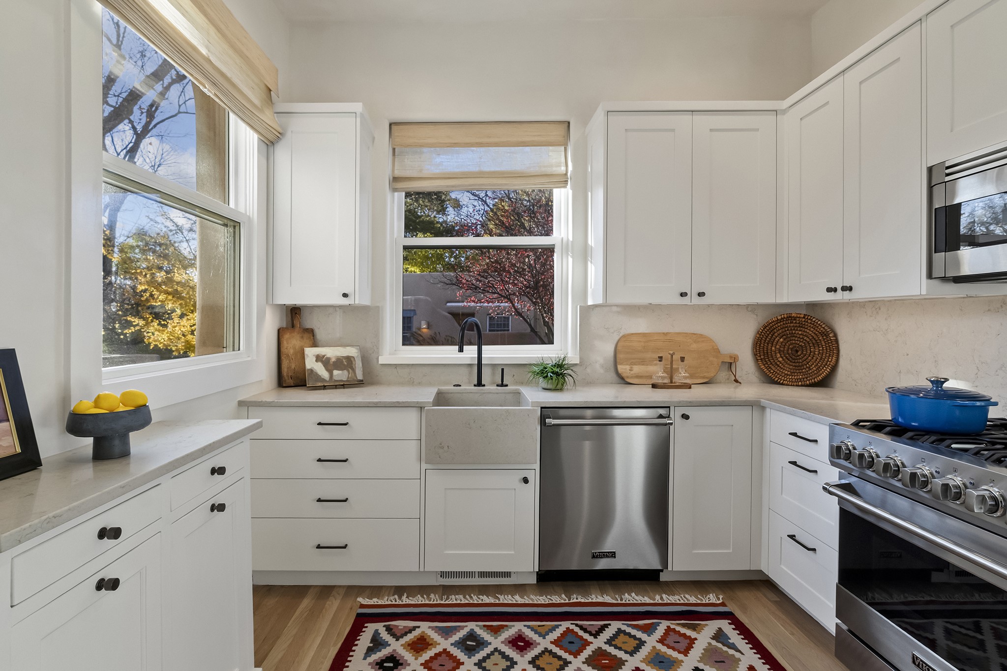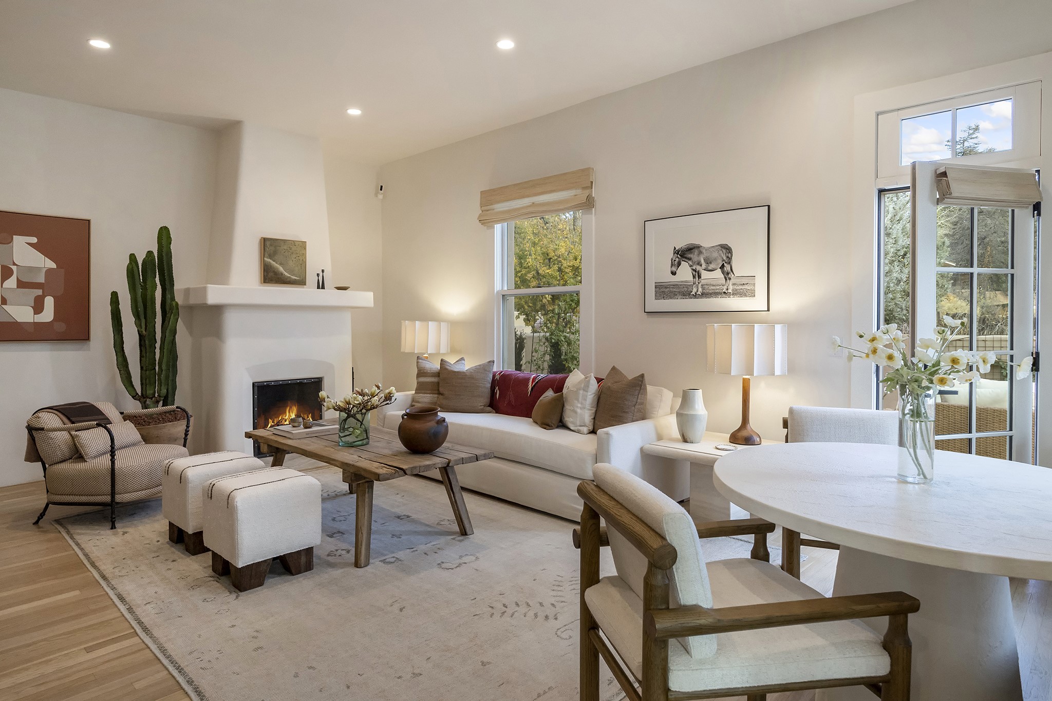 Just moments from Santa Fe's historic Plaza and Canyon Road, this 3 bedroom, 2 bath home embodies refined Southwestern elegance. Masterfully reimagined by Bergman Vass Interiors, it blends contemporary sophistication with the warmth of Santa Fe's timeless style. Every detail reflects exceptional craftsmanship with no surface left untouched! New energy-efficient windows and custom glass doors bathe rich hardwood floors in natural light. Recessed lighting highlights the home's architectural beauty, while landscaped gardens, an upstairs deck and flagstone patios create a serene outdoor retreat. A hand-forged gate, custom fireplace screen, and luxurious closets complete this remarkable residence.