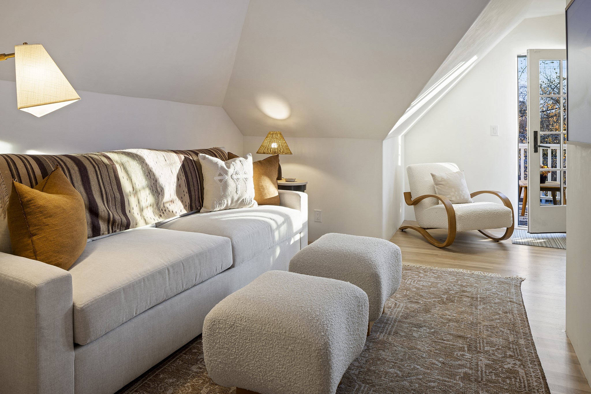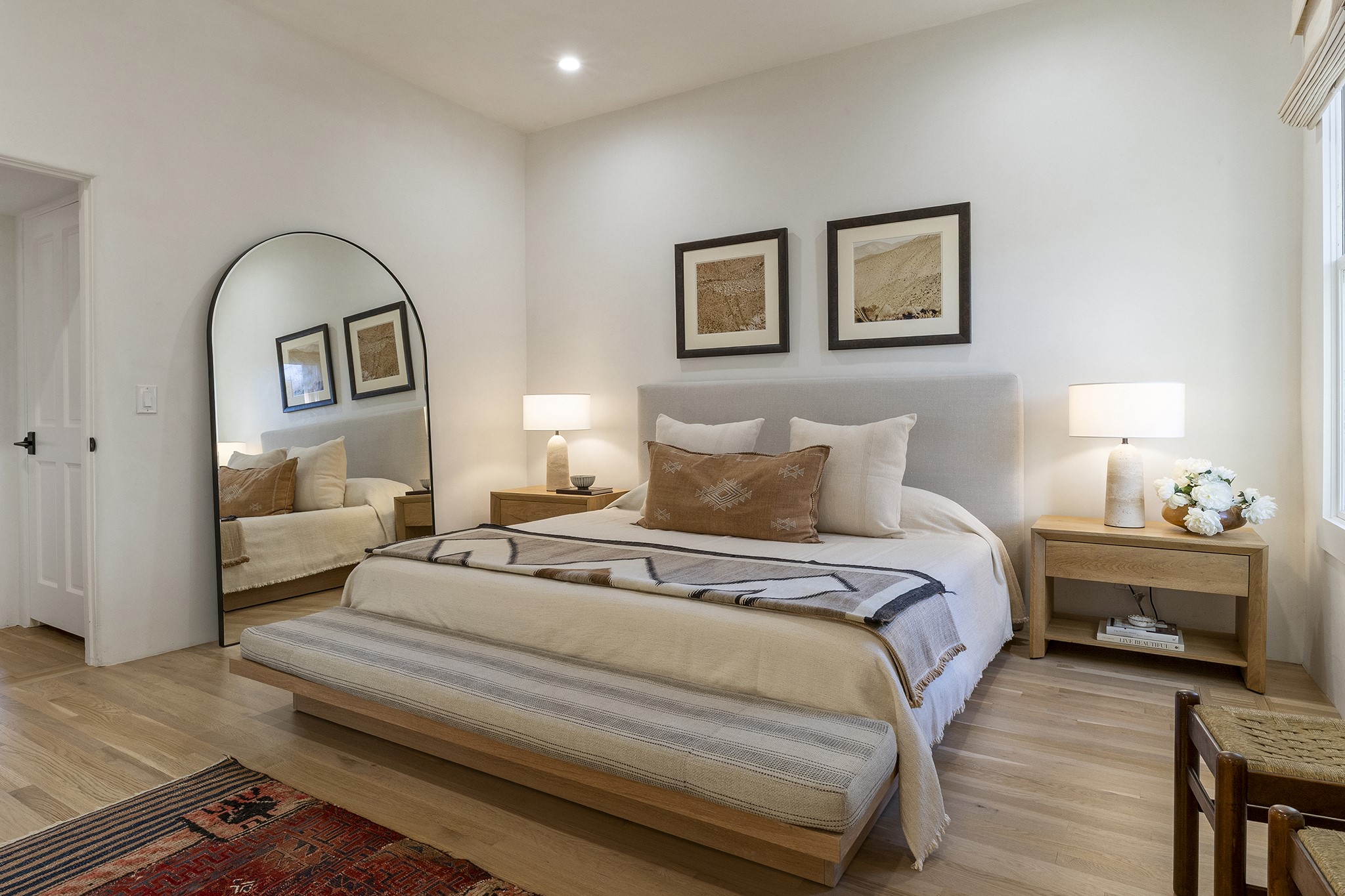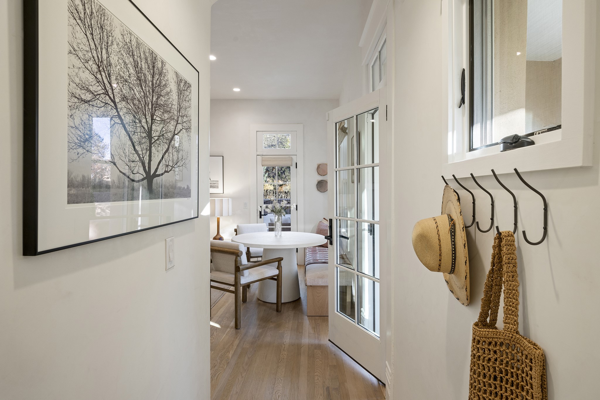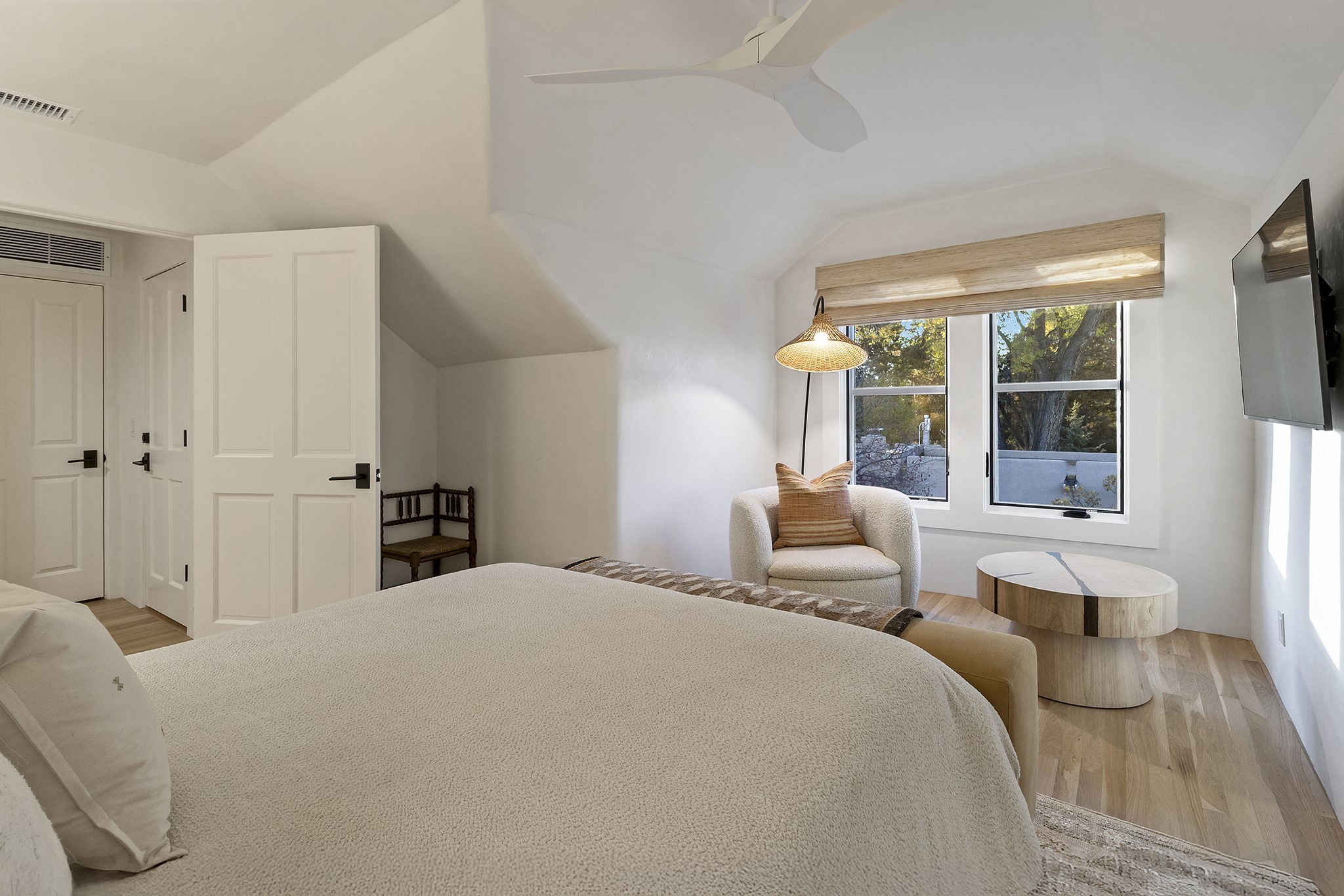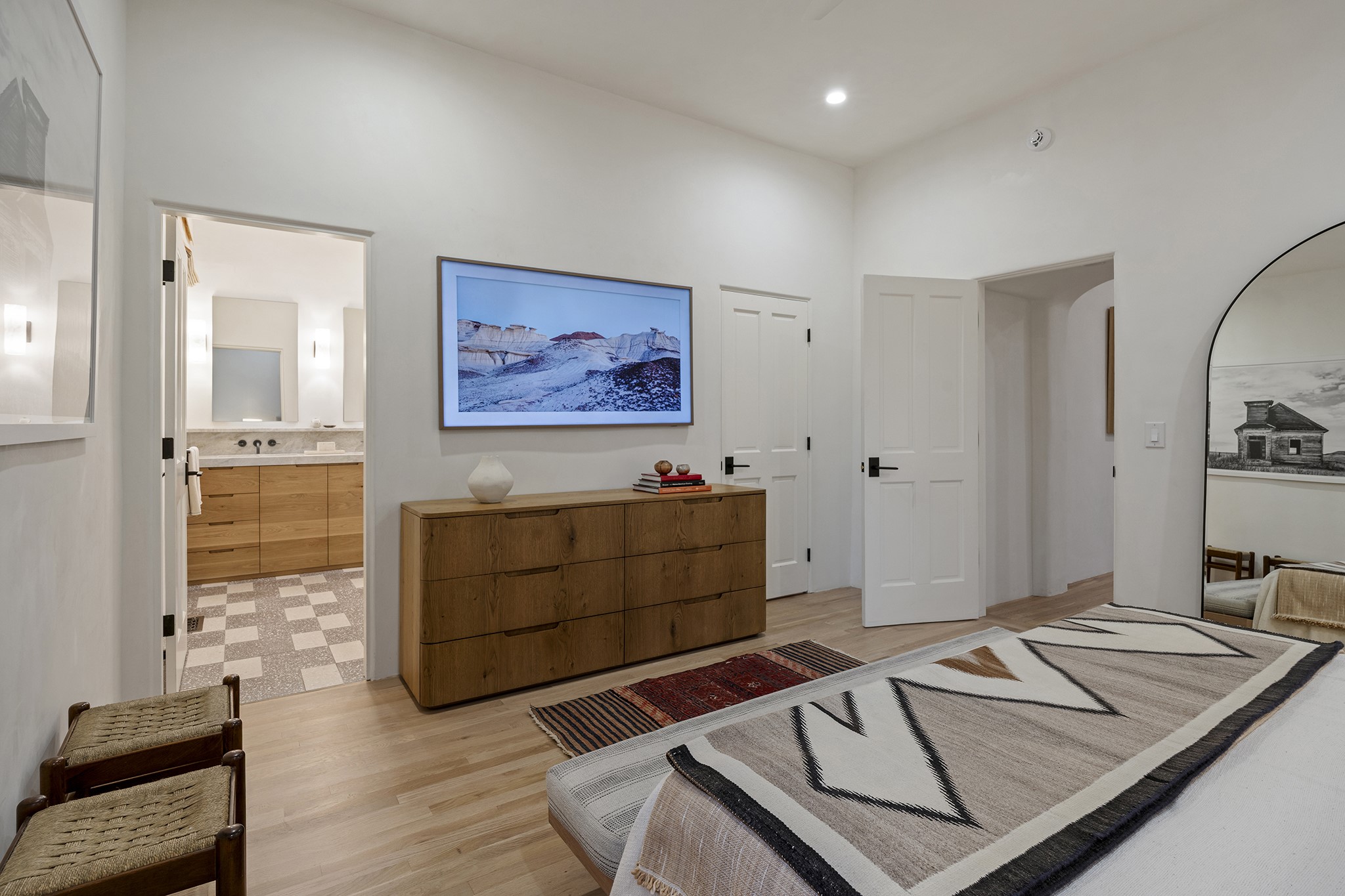 Just moments from Santa Fe's historic Plaza and Canyon Road, this 3 bedroom, 2 bath home embodies refined Southwestern elegance. Masterfully reimagined by Bergman Vass Interiors, it blends contemporary sophistication with the warmth of Santa Fe's timeless style. Every detail reflects exceptional craftsmanship with no surface left untouched! New energy-efficient windows and custom glass doors bathe rich hardwood floors in natural light. Recessed lighting highlights the home's architectural beauty, while landscaped gardens, an upstairs deck and flagstone patios create a serene outdoor retreat. A hand-forged gate, custom fireplace screen, and luxurious closets complete this remarkable residence.